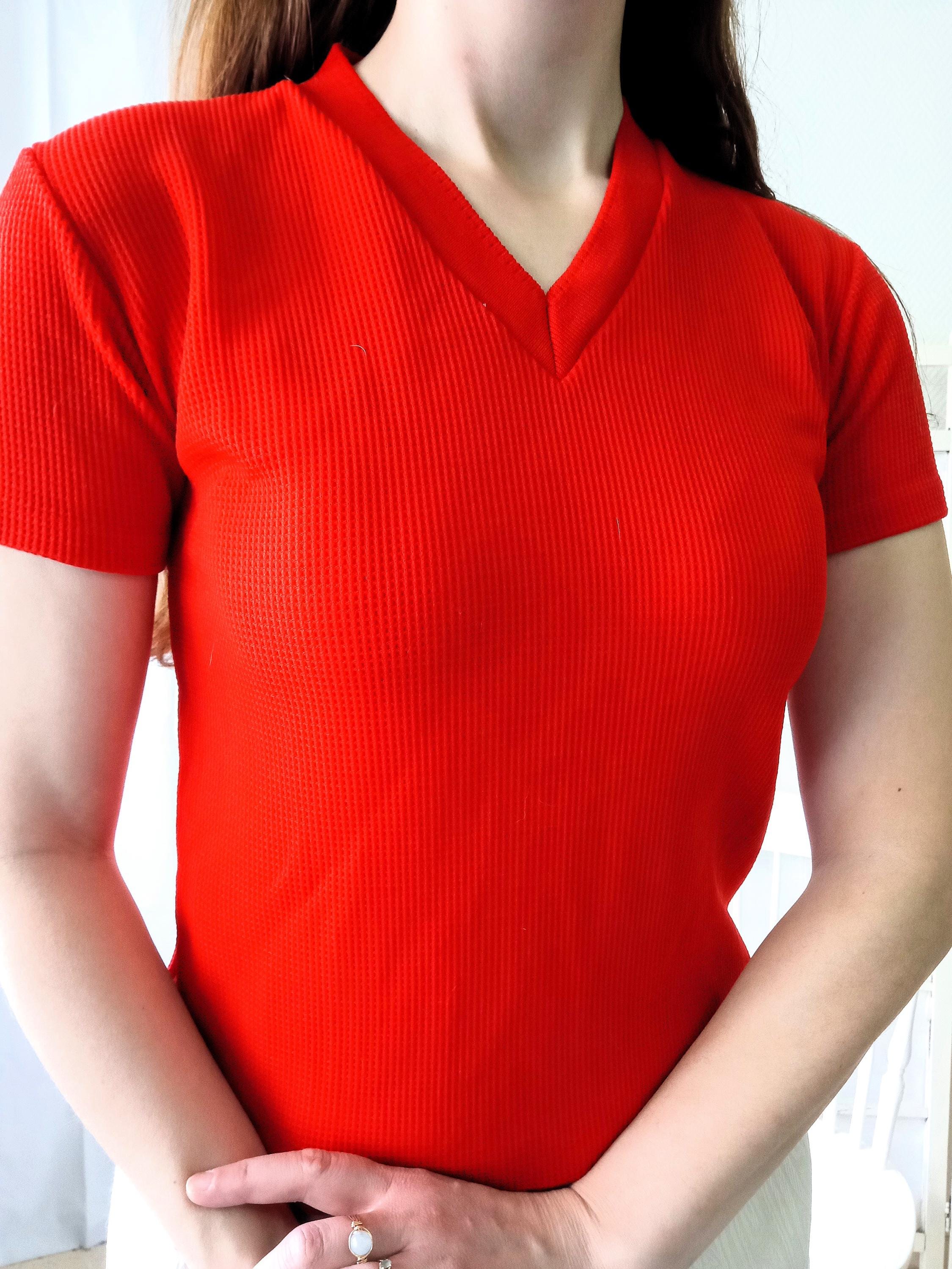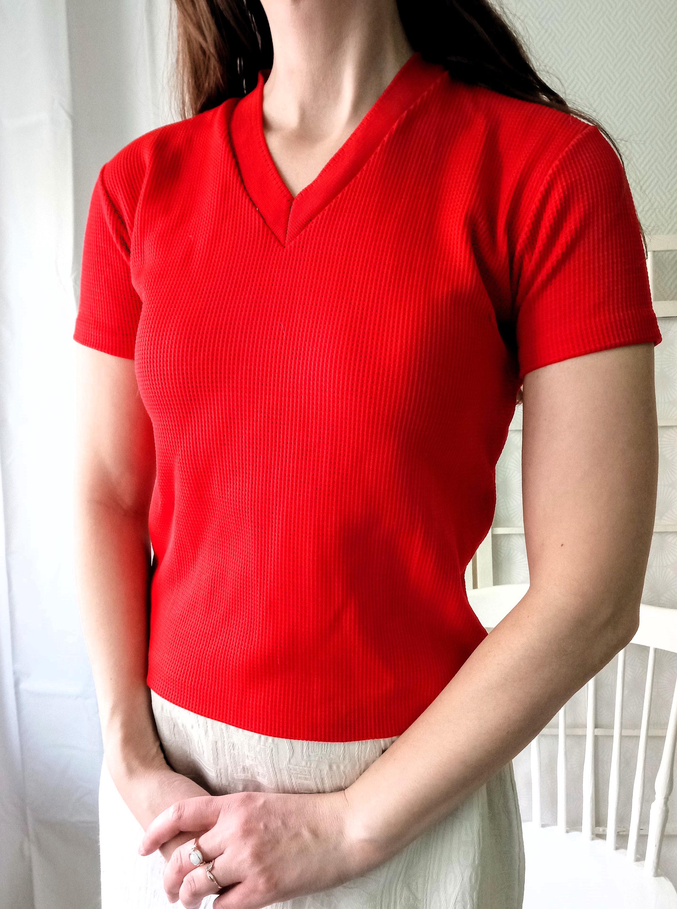 Joli tee-shirt vintage rouge gaufré , col V DEADSTOCK- NEUF; toujours étiqueté et dans son emballage d'origine (les étiquettes et emballage peuvent présenter des différences de design sur chaque exemplaires), fabriqué dans les années 60 en FRANCE par la marque BAN-LON (cette pièce vient d'un stock de vêtements invendu d'une boutique française du Creusot ayant fermé dans les années 70); couleur rouge ; matière Nylon; matière élastique; non doublé, pas de transparence.Cette pièce n'ayant jamais été lavée, elle peut porter une odeur de teinture ou odeur de vêtement neuf, qui partira dès le premier lavage. Il est conseillé de laver cette pièce à la main les 2 ou 3 premiers lavages pour laisser dégorger la couleur, puis ensuite en machine en synthétique à 30 degrés; état neuf.