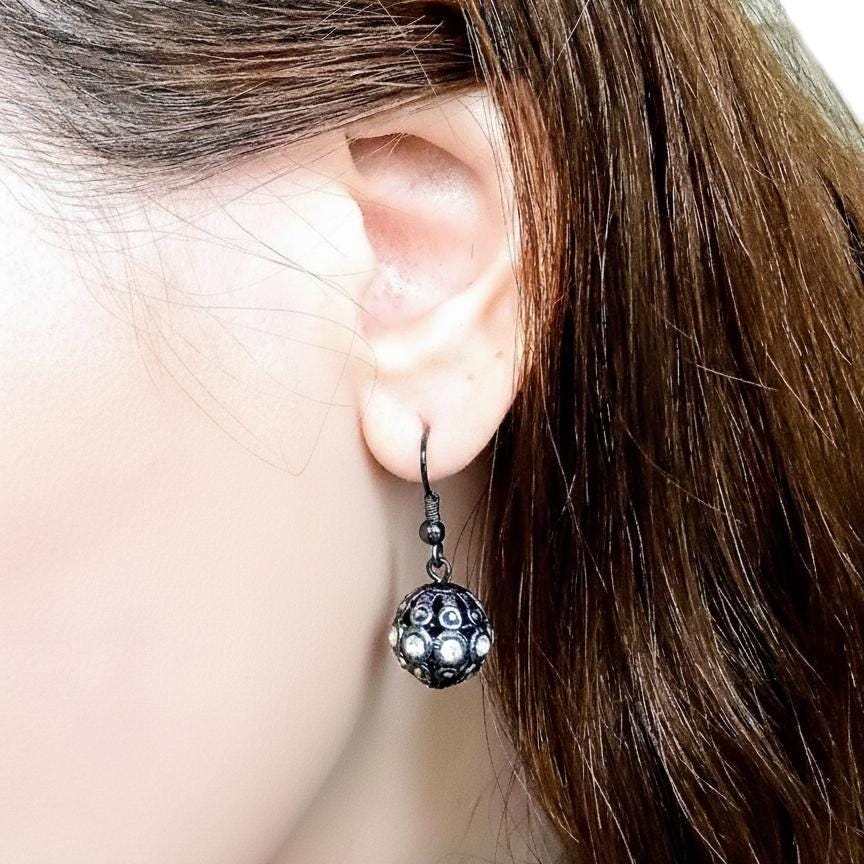 Elegant vintage pendant earrings, 90s; for pierced ears; filigree silver metal balls, faceted white and black rhinestones; no rhinestones are missing; very good condition.
