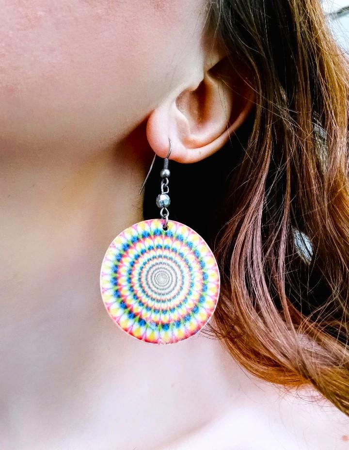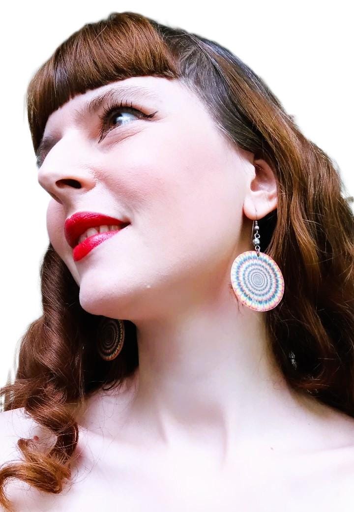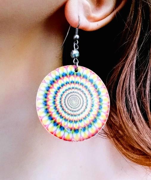 🇬🇧Beautiful pair of vintage pendant earrings from the 90s/ early 2000; seventies revival period; hippie or disco style; mother of pearl; with multicolored psychedelic pattern: very good quality; very good condition.