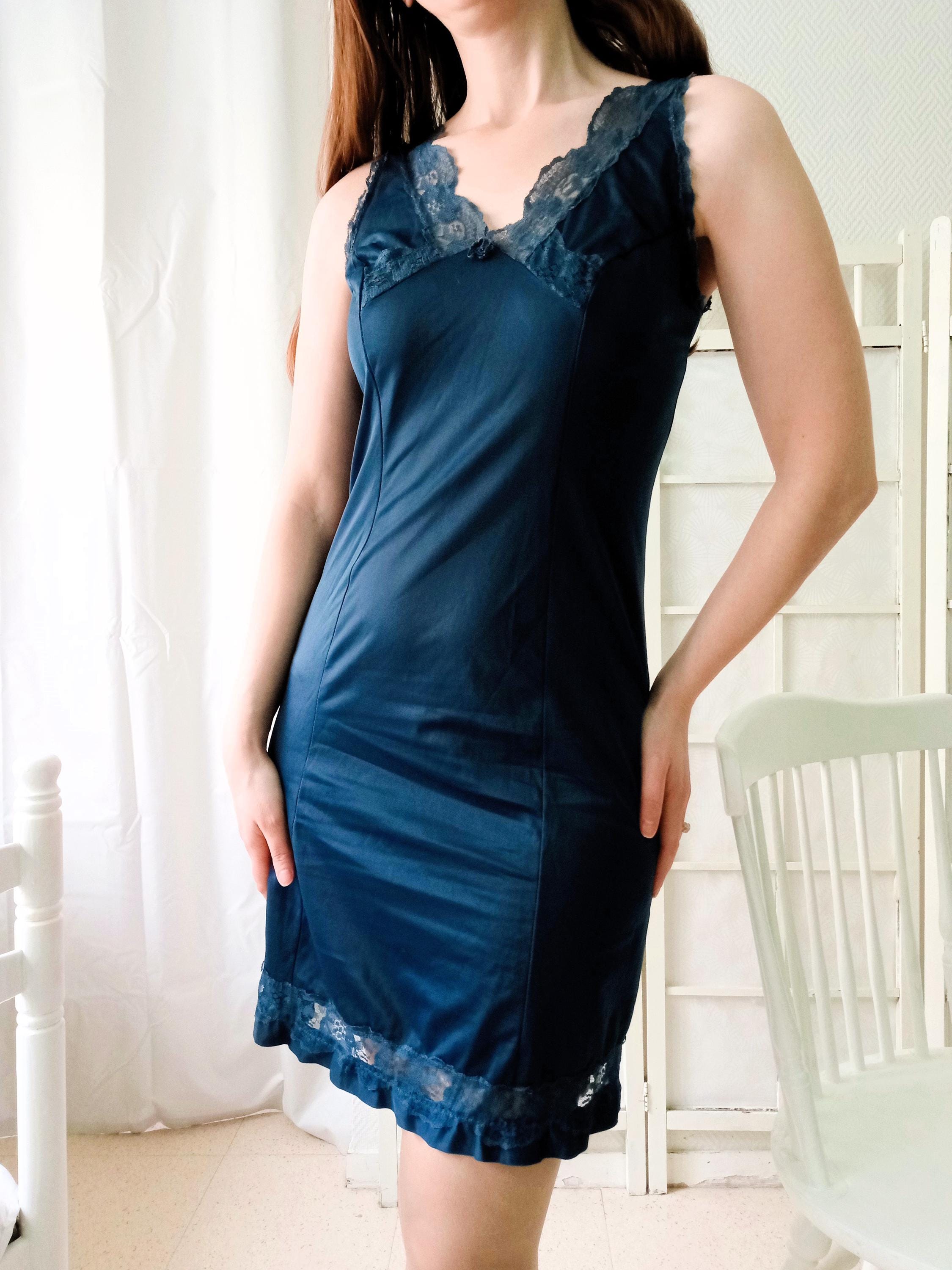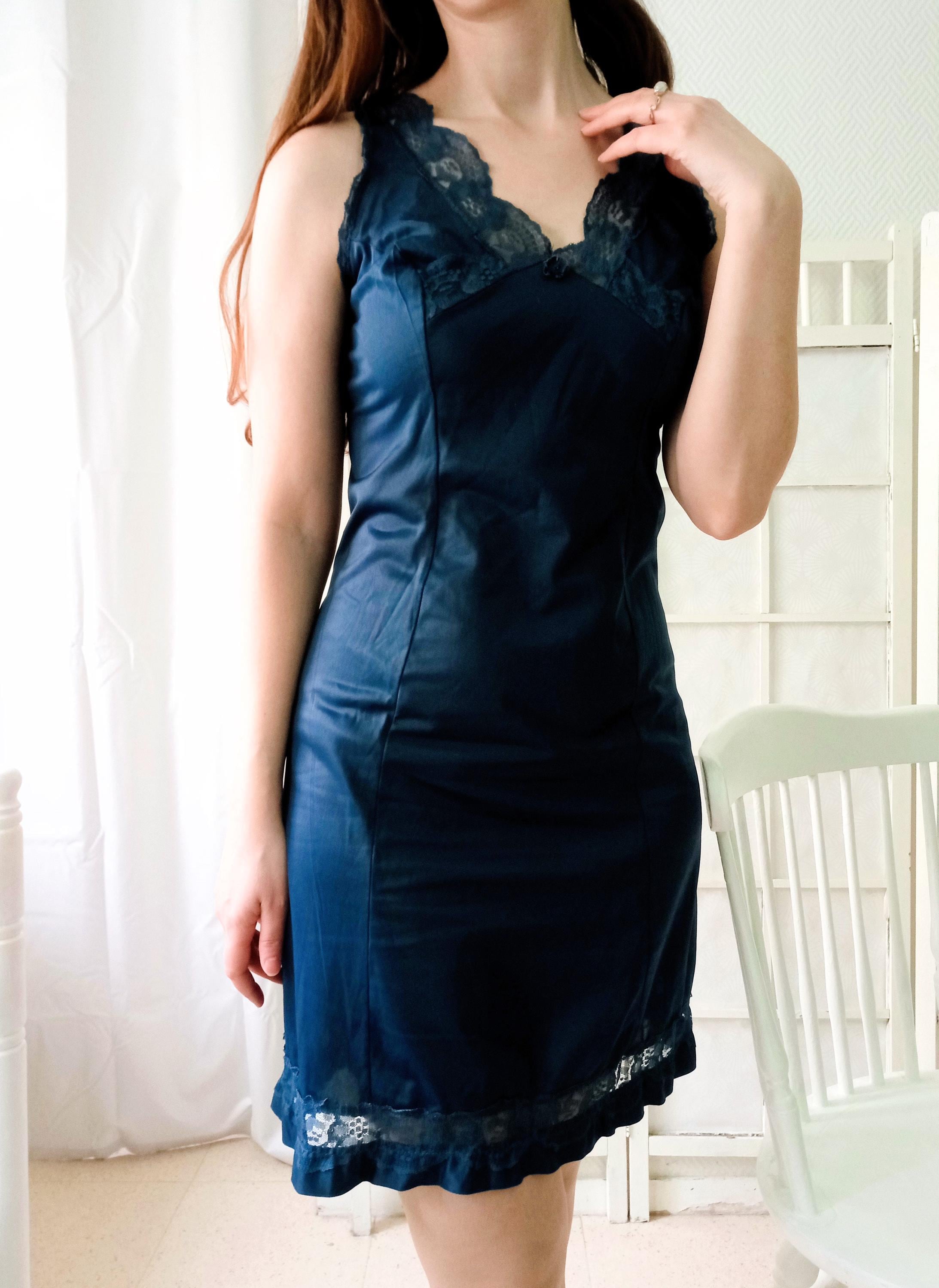 Magnifique nuisette ou fond de robe vintage (aussi appelé combinaison ou camisole), style année 40/50 ; couleur bleue nuit ; col et bas de la nuisette en dentelle ; fabriqué à la fin des années 70/début des années 80 par la marque POUR ELIANE ; 100 % polyamide ; matière antistatique ; tissu doux et fin avec une légère élasticité ; très bon état.