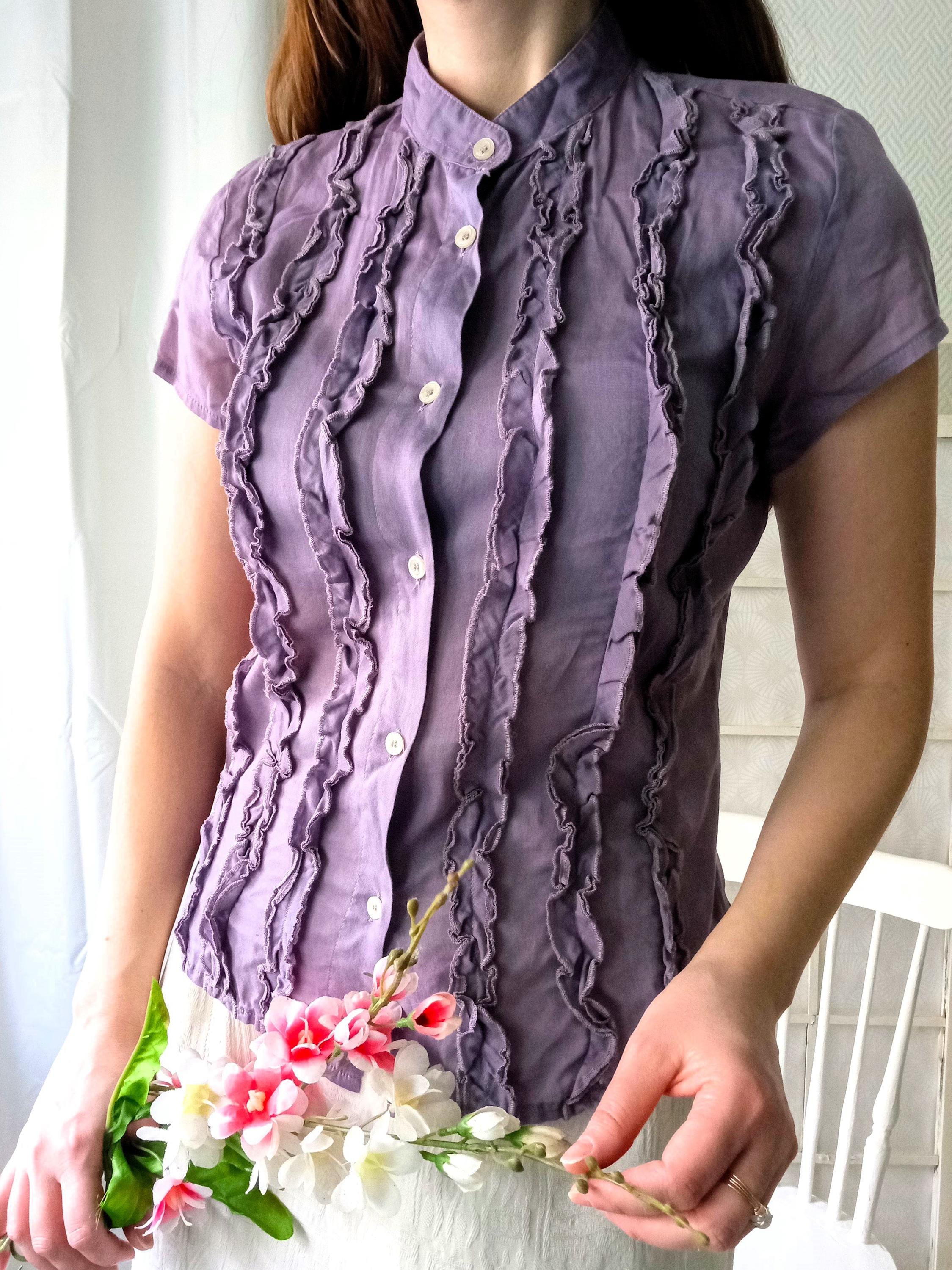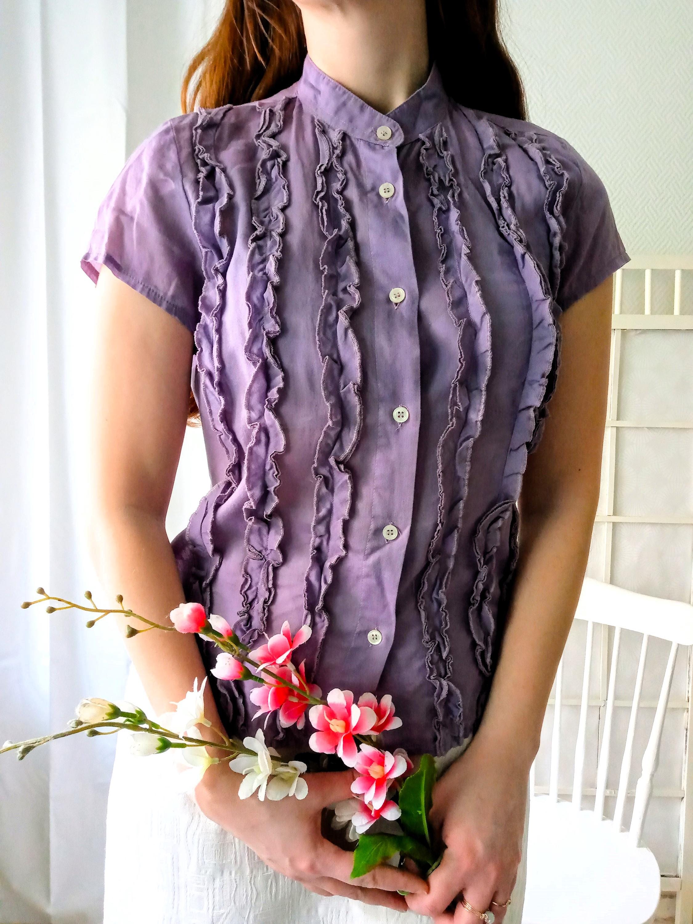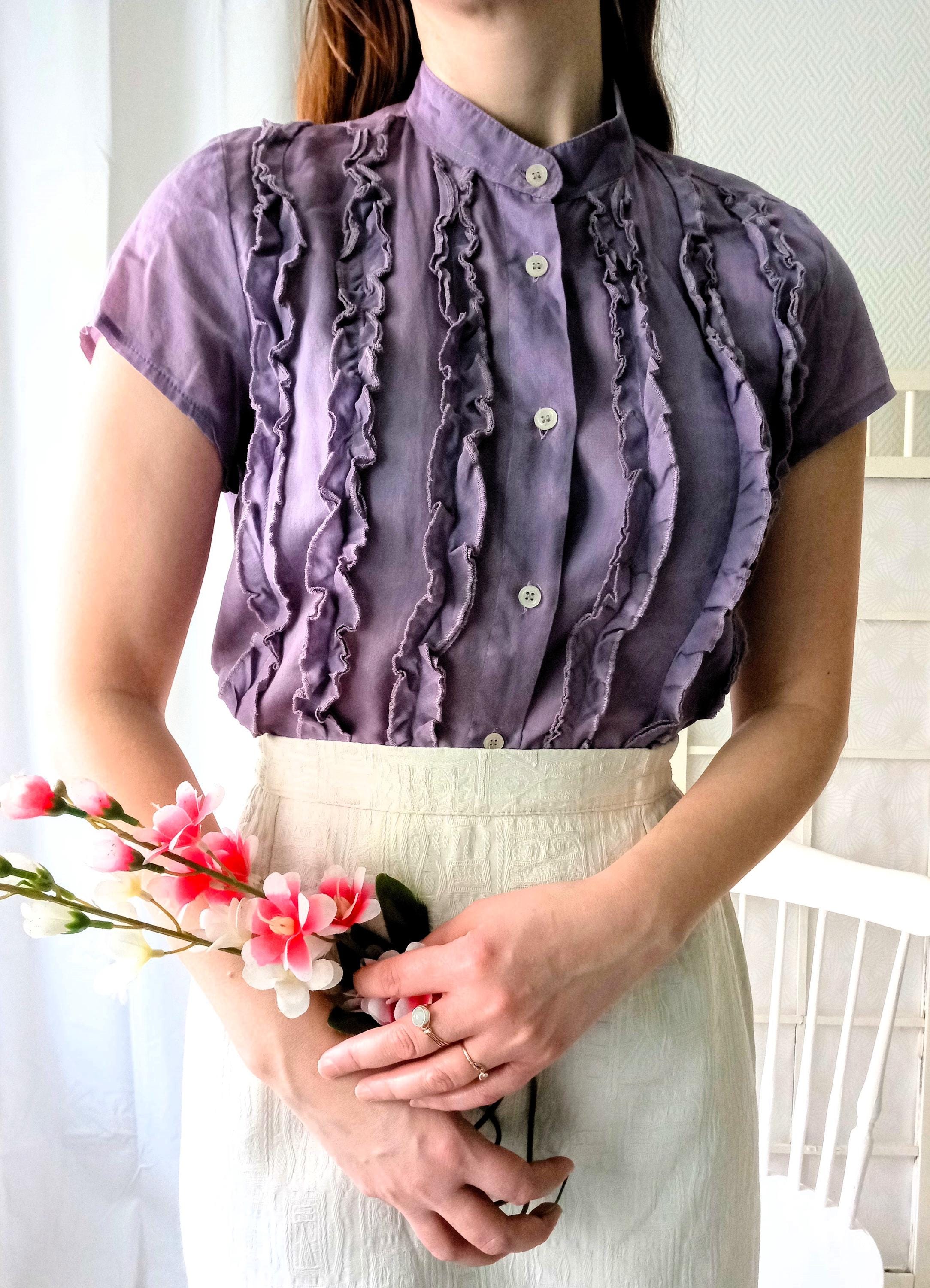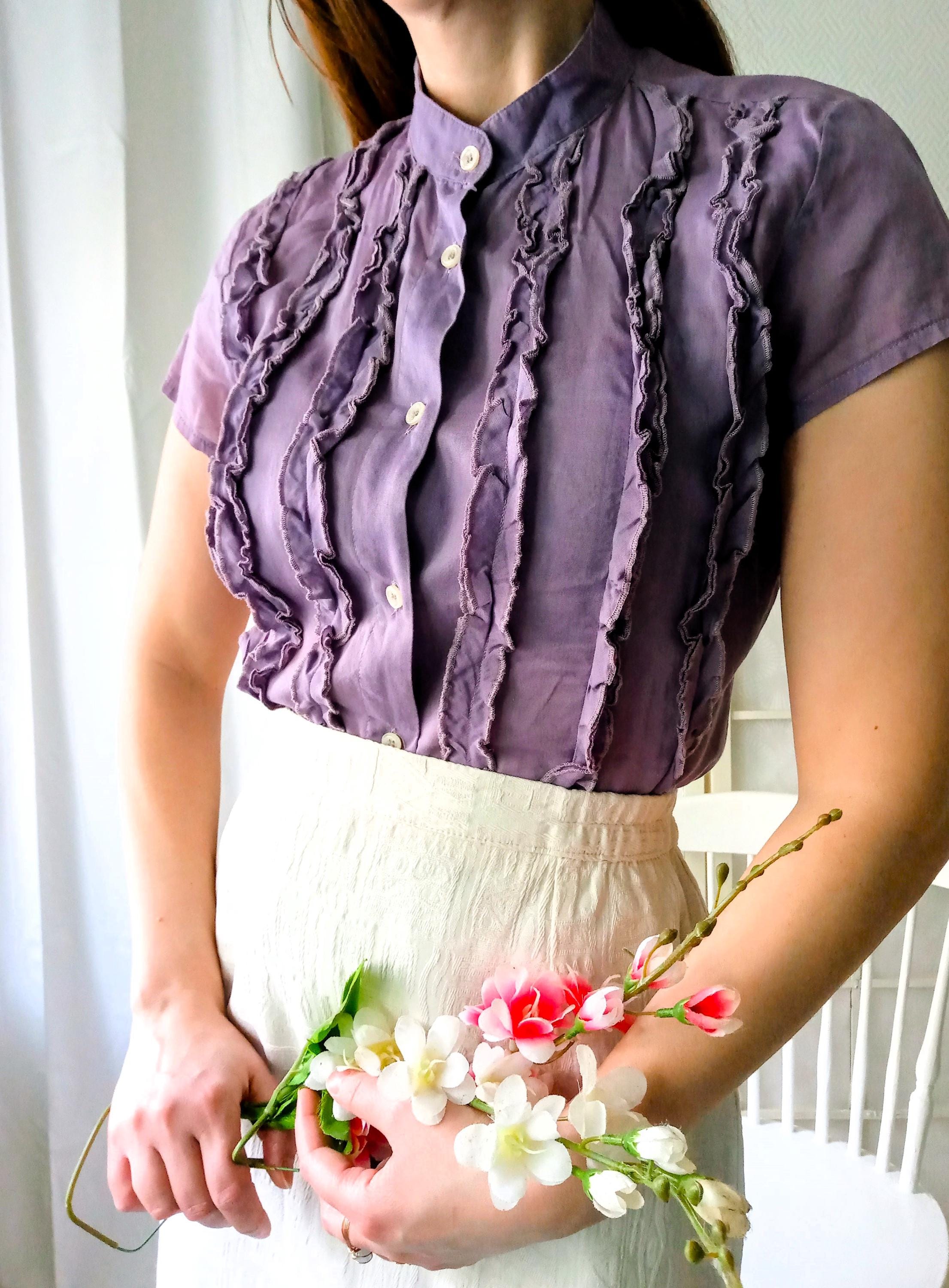 🇬🇧Lovely vintage blouse with frilly bodice; purple color; style 50s/ 60s; made in the 90s by the brand BENETTON; The material seems to be cotton; unlined; light transparency; very good condition. The last photo shows the color most faithful to reality.