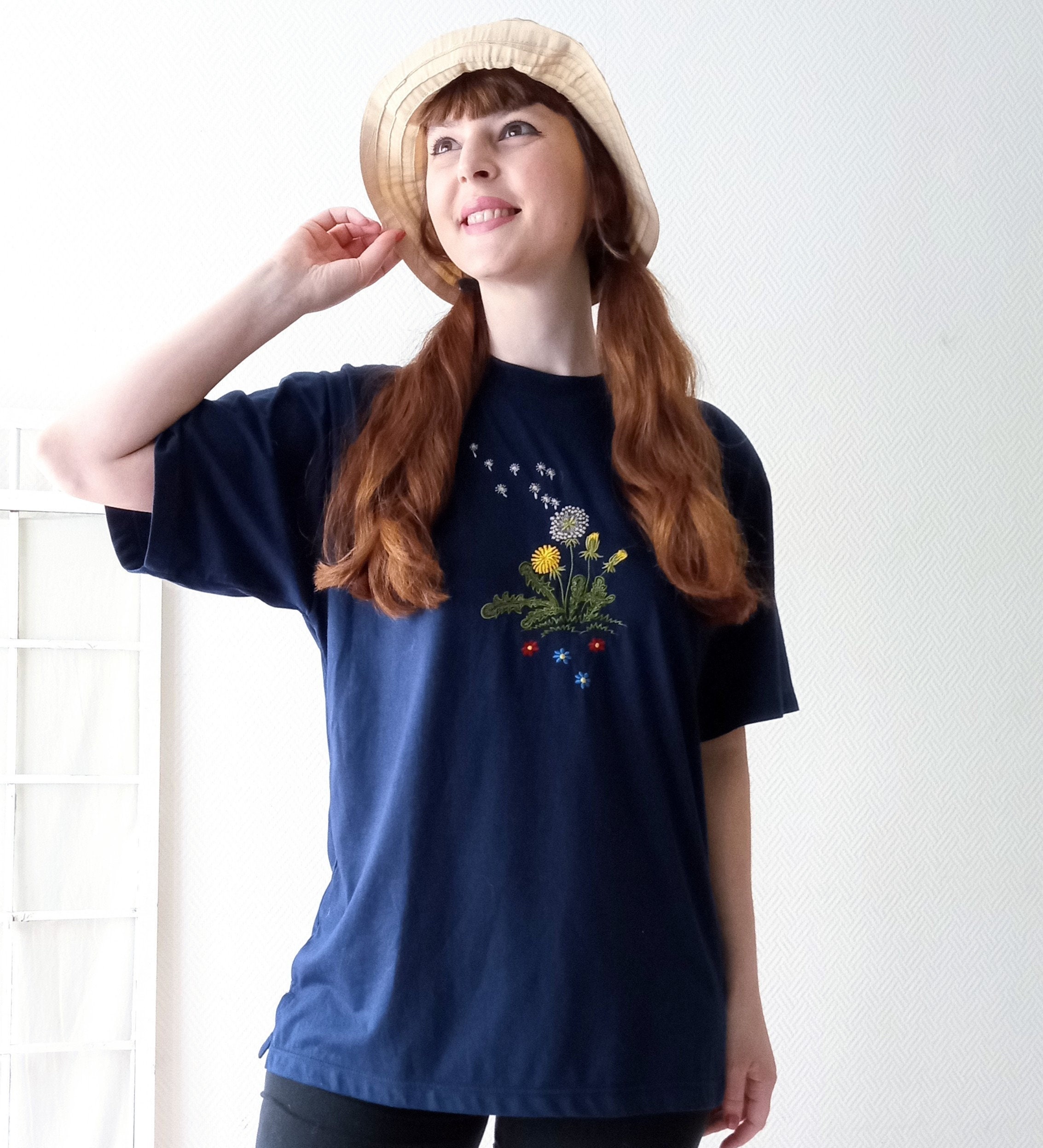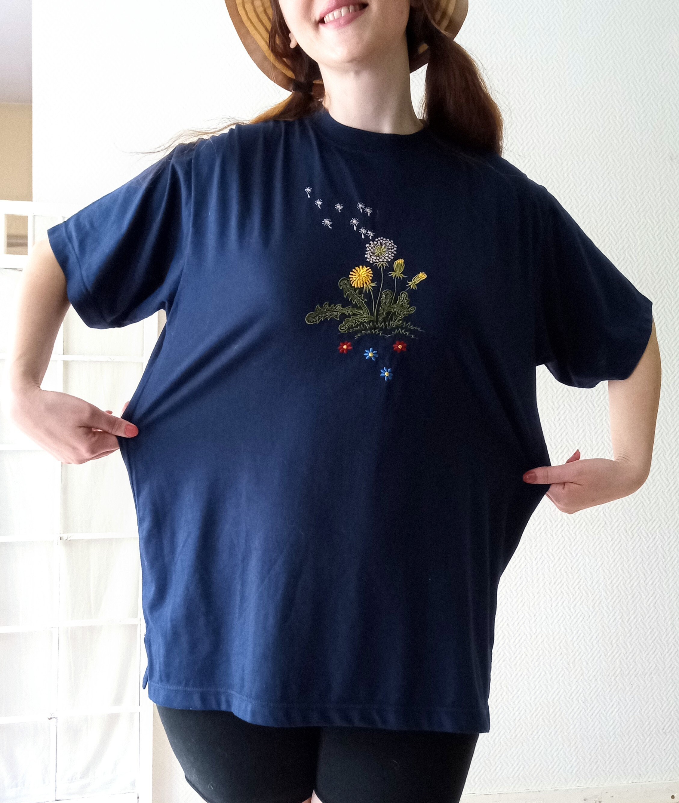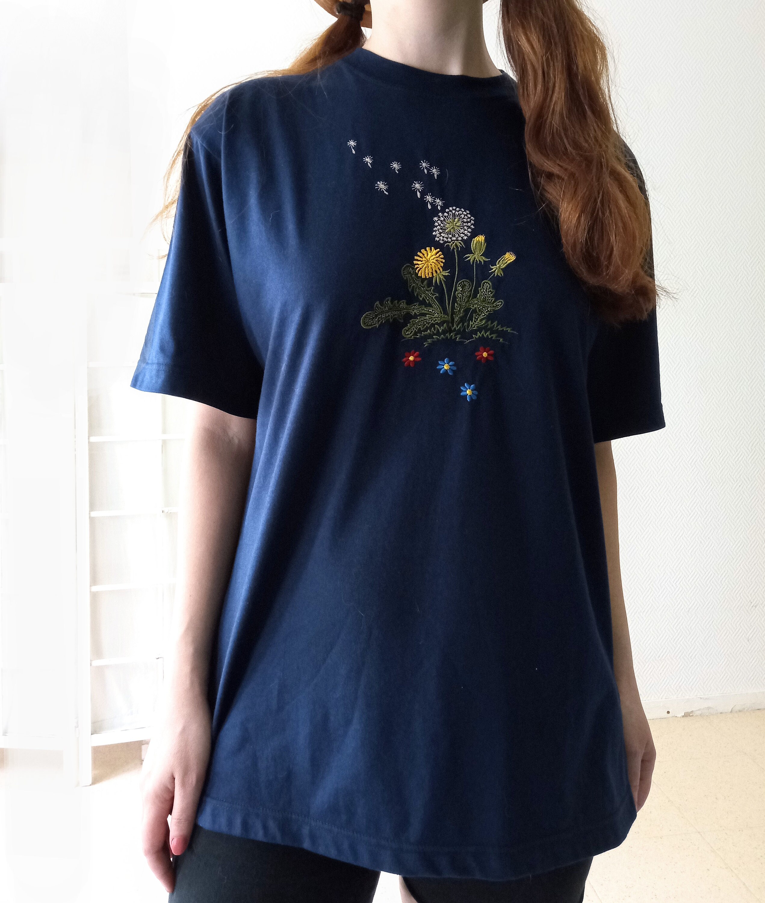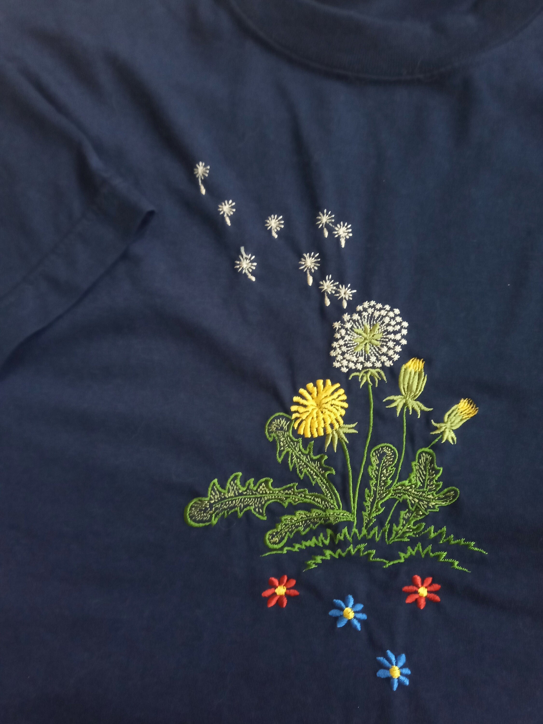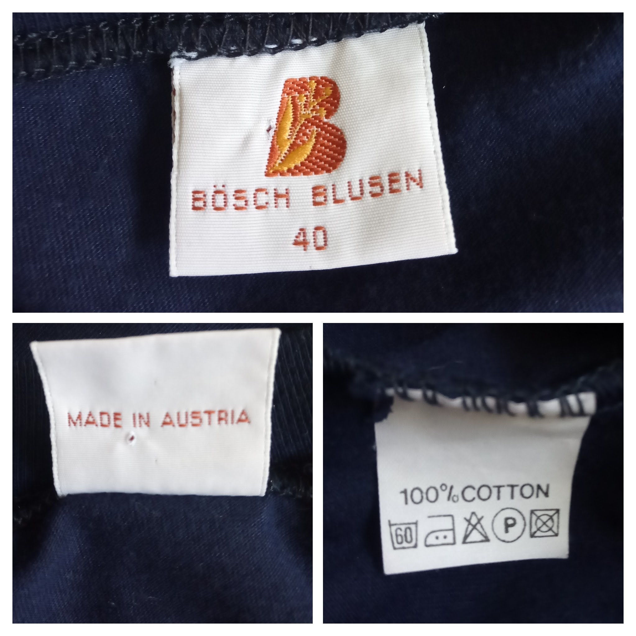 Adorable vintage t-shirt from the early 90s; navy blue color and multicolored embroidered floral patterns; BOSH BLUSEN brand, made in Austria; 100% cotton; the material is very soft, light, fluid and slightly elastic; wide oversized cut typical of the era; the t-shirt appears to have been little worn; excellent condition.