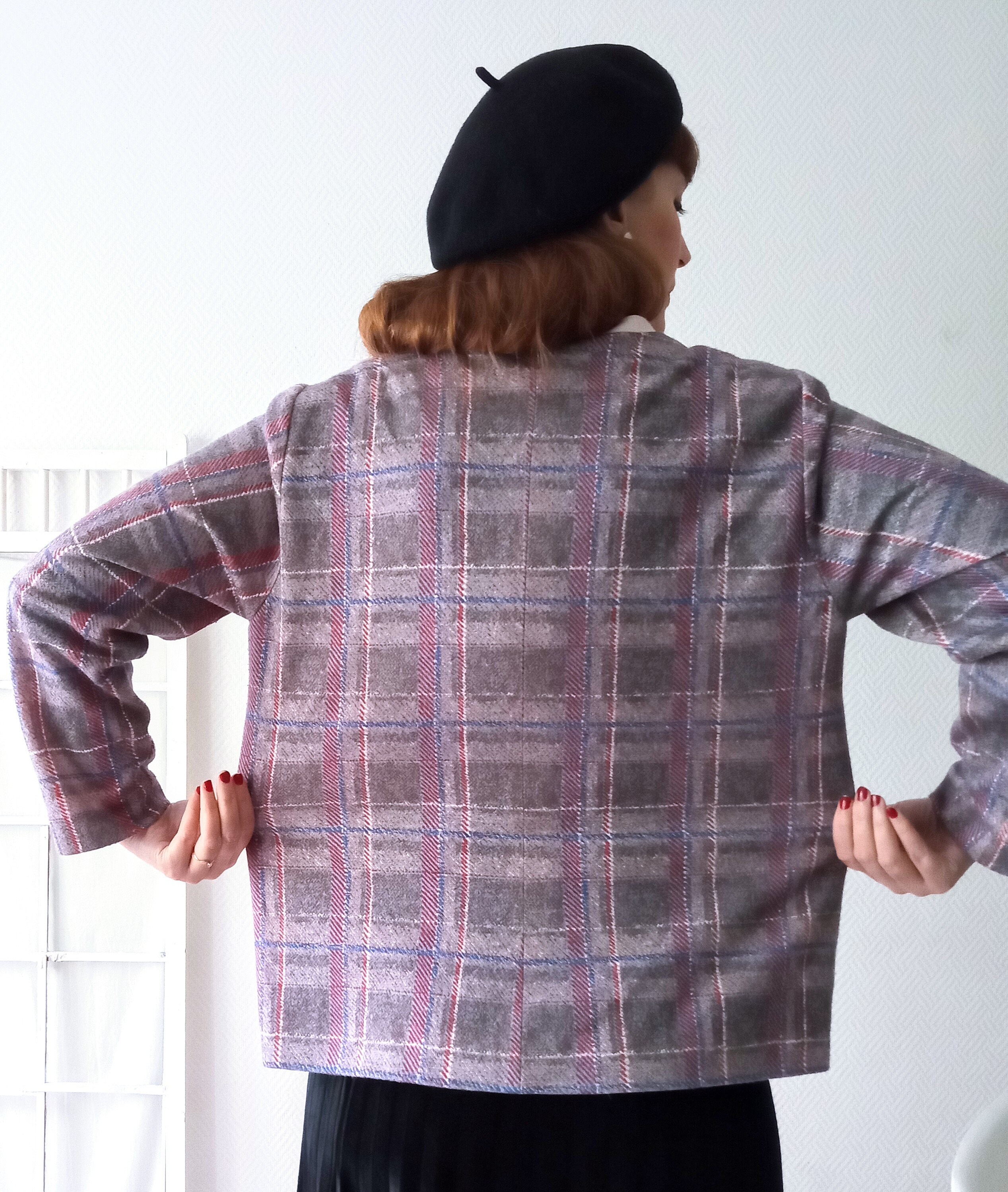 Jolie chemisier blazer à double boutonnage vintage ; motif écossais ; couleur marron, gris, beige foncé, rouge, blanc et bleu ; bordures rose pâle ; élégant et classique ; conçu dans les années 80; la matière n'est pas indiquée mais semble en polyester ; la matière est moyennement épaisse, légèrement extensible, tissu doux qui ne pique pas ; non doublé, pas de transparence ; très bon état.