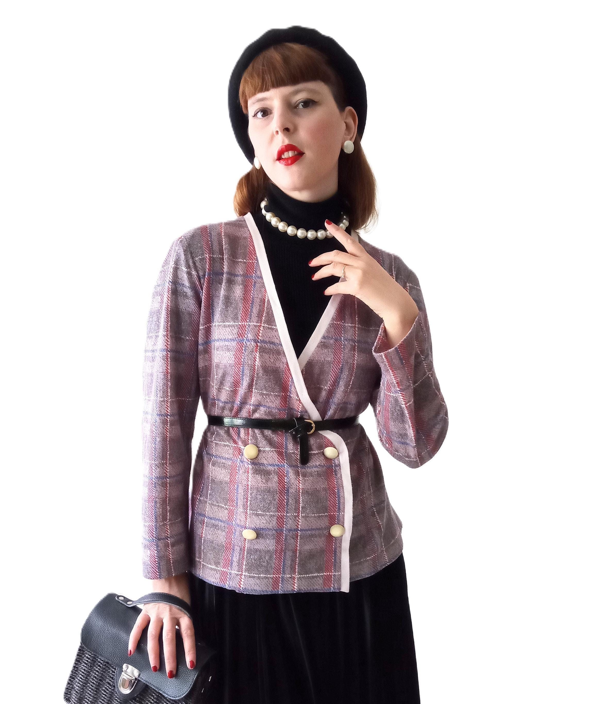 🇬🇧Pretty vintage double-breasted blazer; plaid pattern; brown, grey, dark beige, red, white and blue; pale pink trim; elegant and classic; designed in the 80s; material not indicated but looks like polyester; the material is medium thick, slightly stretchy, soft fabric that does not sting; not lined, no transparency; very good condition.