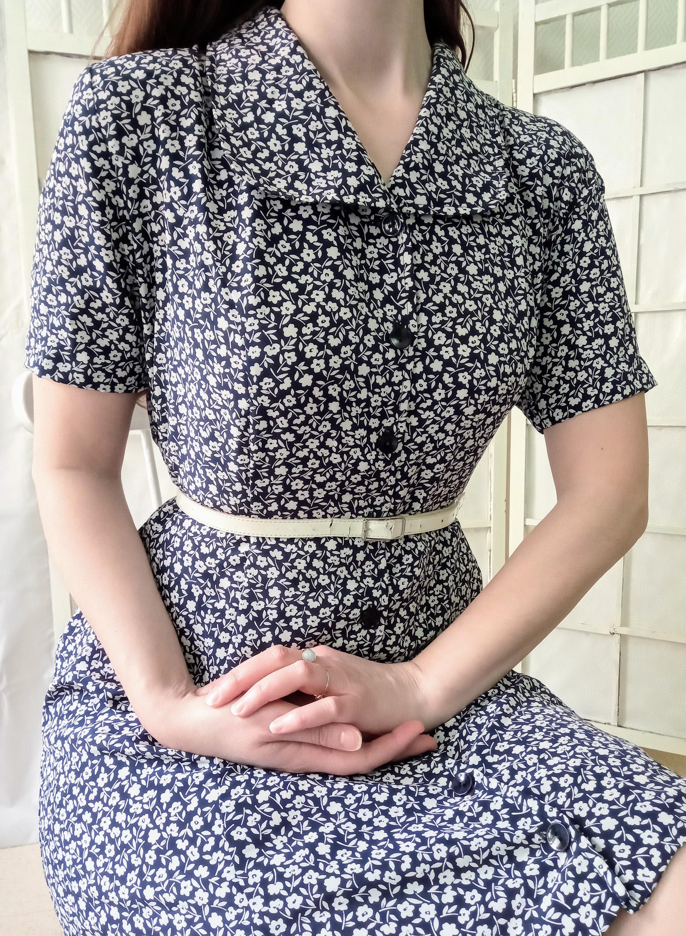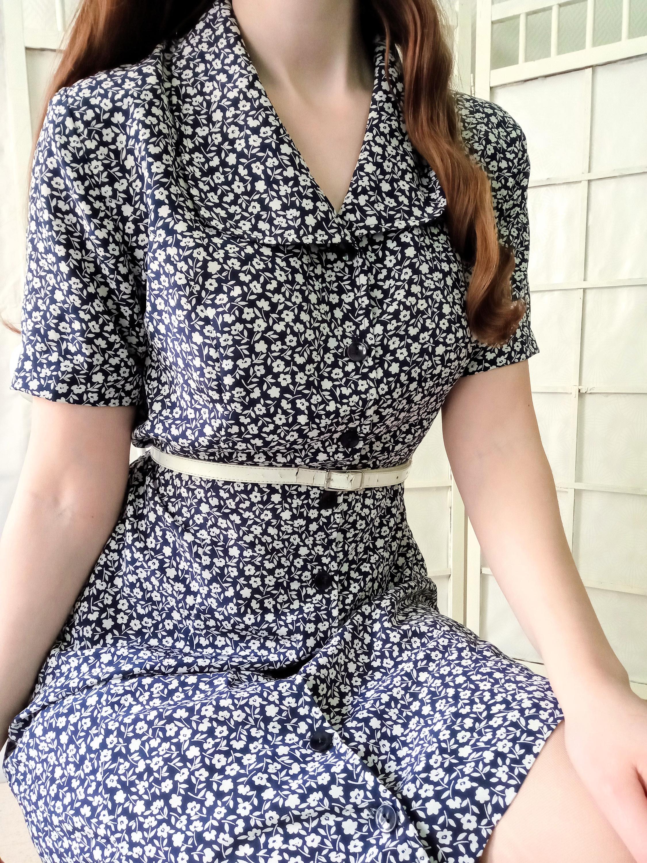 Magnifique robe chemise à motif petites fleurs vintage ; couleur blanc sur fond bleu marine ; à porter en style rétro années 40 ou en style badydoll des années 70/80; fabriquée dans les années 80 ; la composition n'est pas indiquée mais semble être synthétique, probablement de la viscose ; belle qualité synthétique, la robe est boutonnée intégralement sur le devant ; coupe ajustée puis évasée ; non doublée, mais pas de transparence ; très bon état.