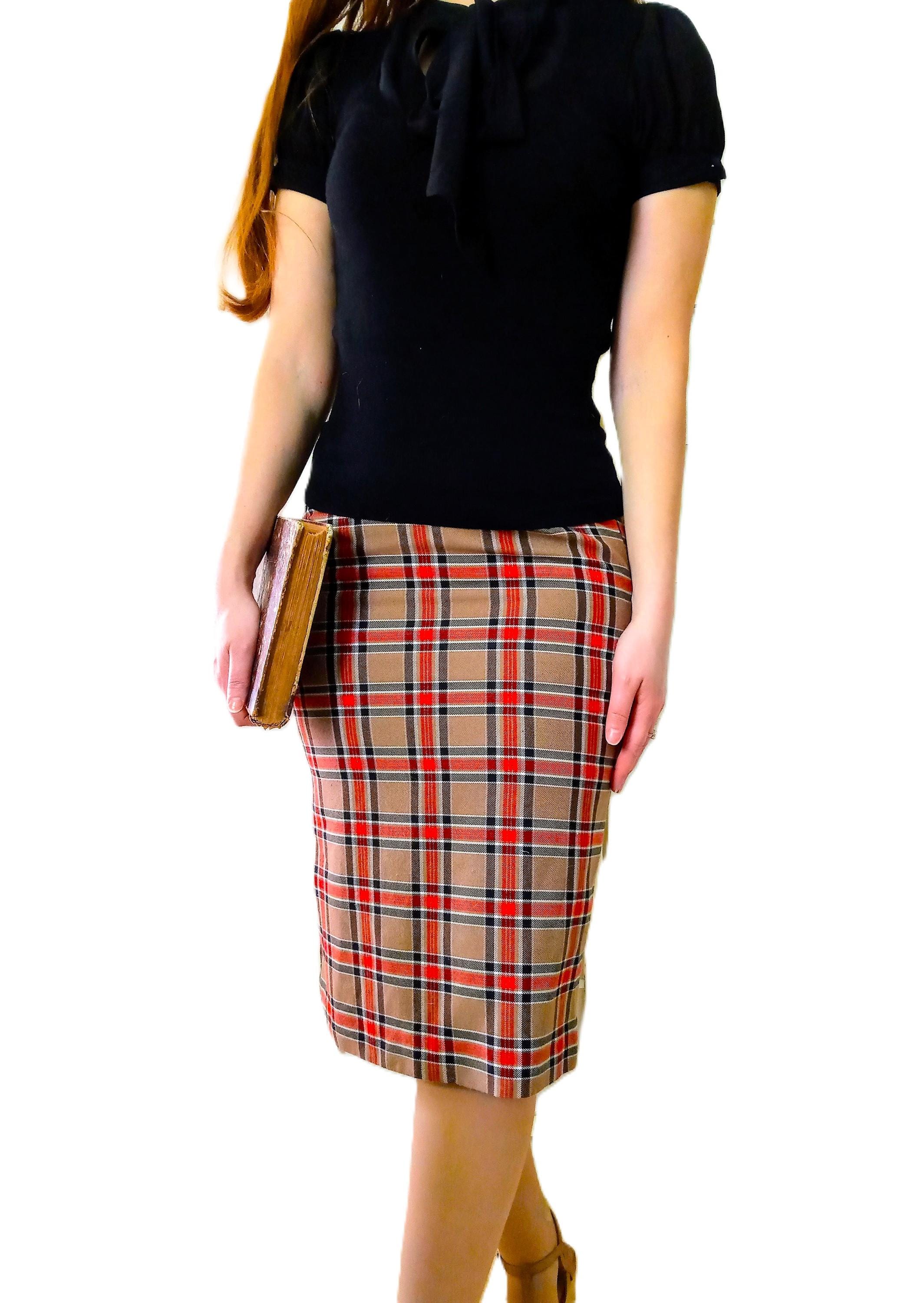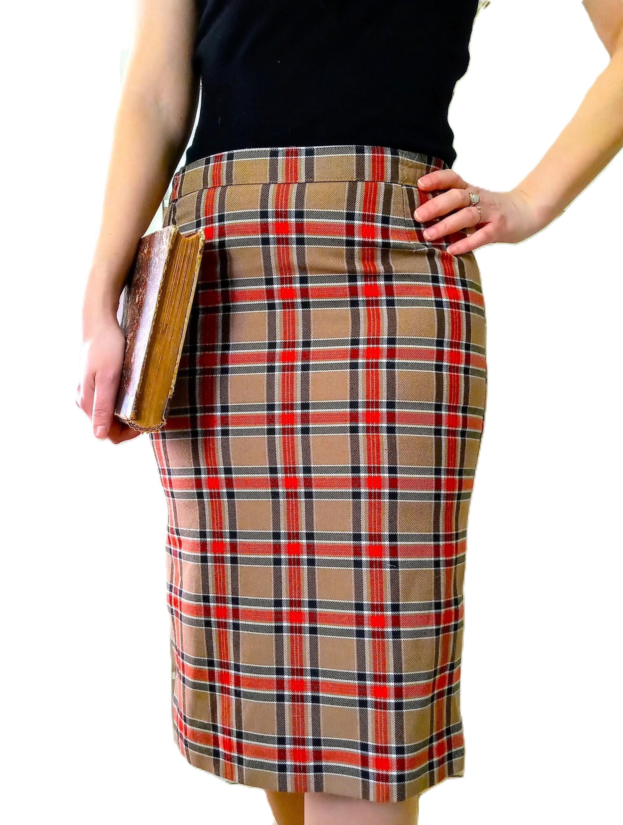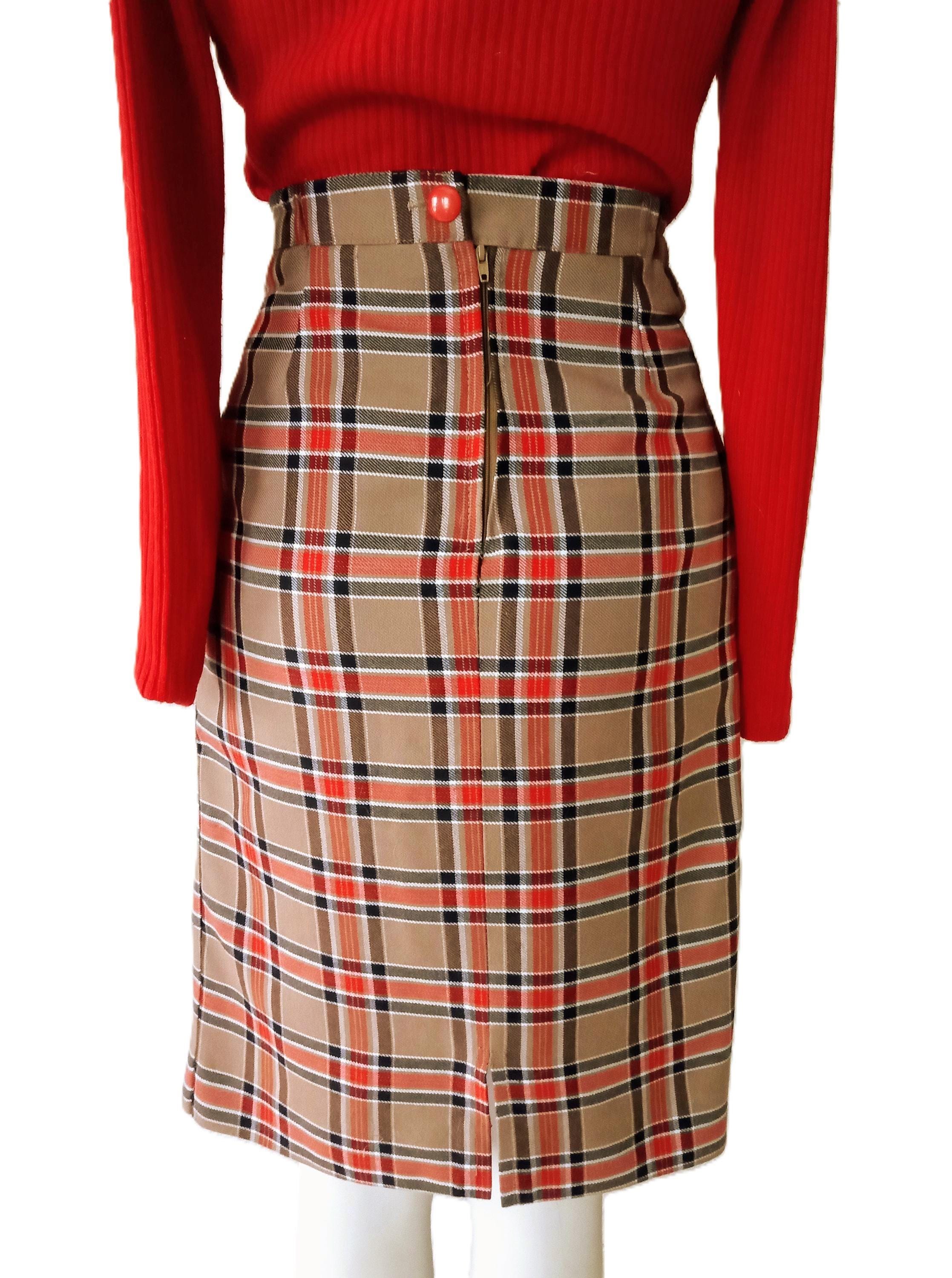 🇬🇧Lovely camel brown, red, black and white Scottish pencil skirt; 50s/60s style; made in France in the late 70s or early 80s; 50% polyester, 50% viscose; material is thick enough, warm, does not pique; high elastic waist, zipper and buttonhole at the back; small slit of 11 cm at the back; fully lined, no transparency; very good condition.