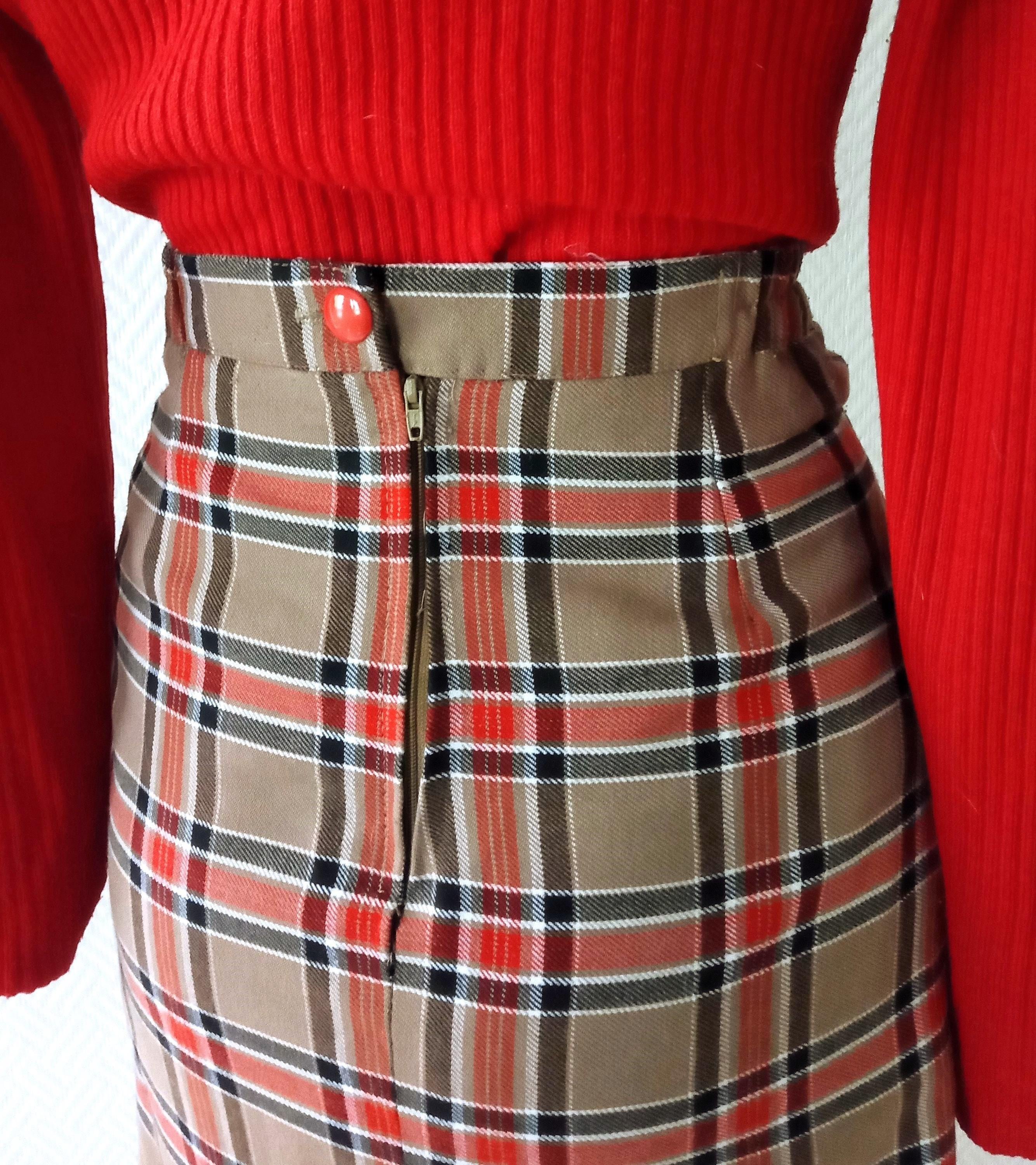 Ravissante jupe crayon écossaise marron camel, rouge, noir et blanc ; style années 50/60 , parfaite pour reproduire un look rétro ou époque yéyé; fabriquée en France à la fin des années 70 ou au début des années 80; 50% polyester, 50% viscose ; la matière est assez épaisse, chaude, ne pique pas ; taille haute élastique, fermeture éclair et boutonnière au dos ; petite fente de 11 cm au dos ; entièrement doublée, pas de transparence ; très bon état.