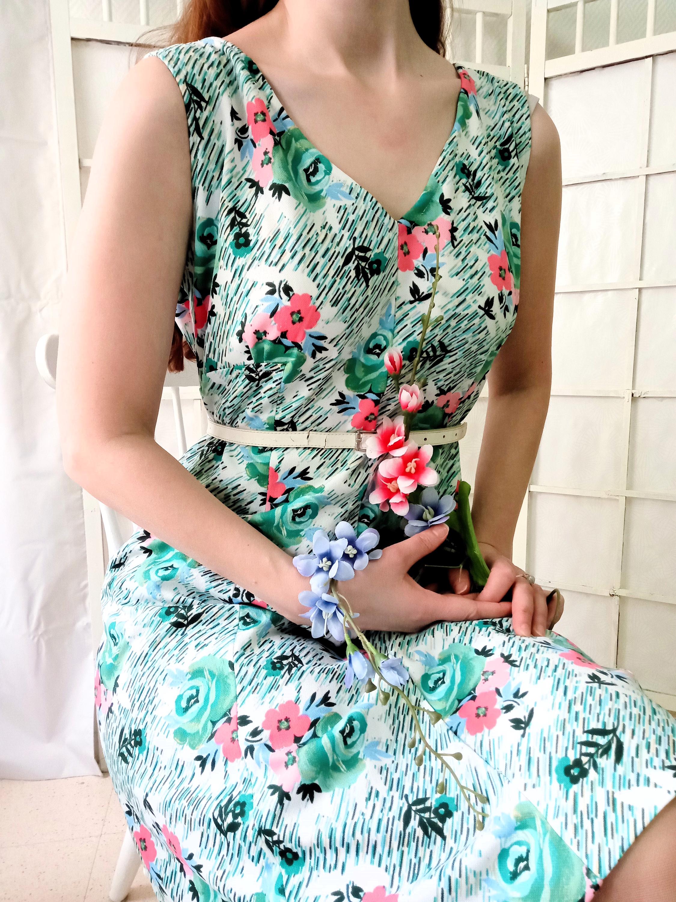 Magnifique robe chasuble vintage à motif floral et petites rayures.