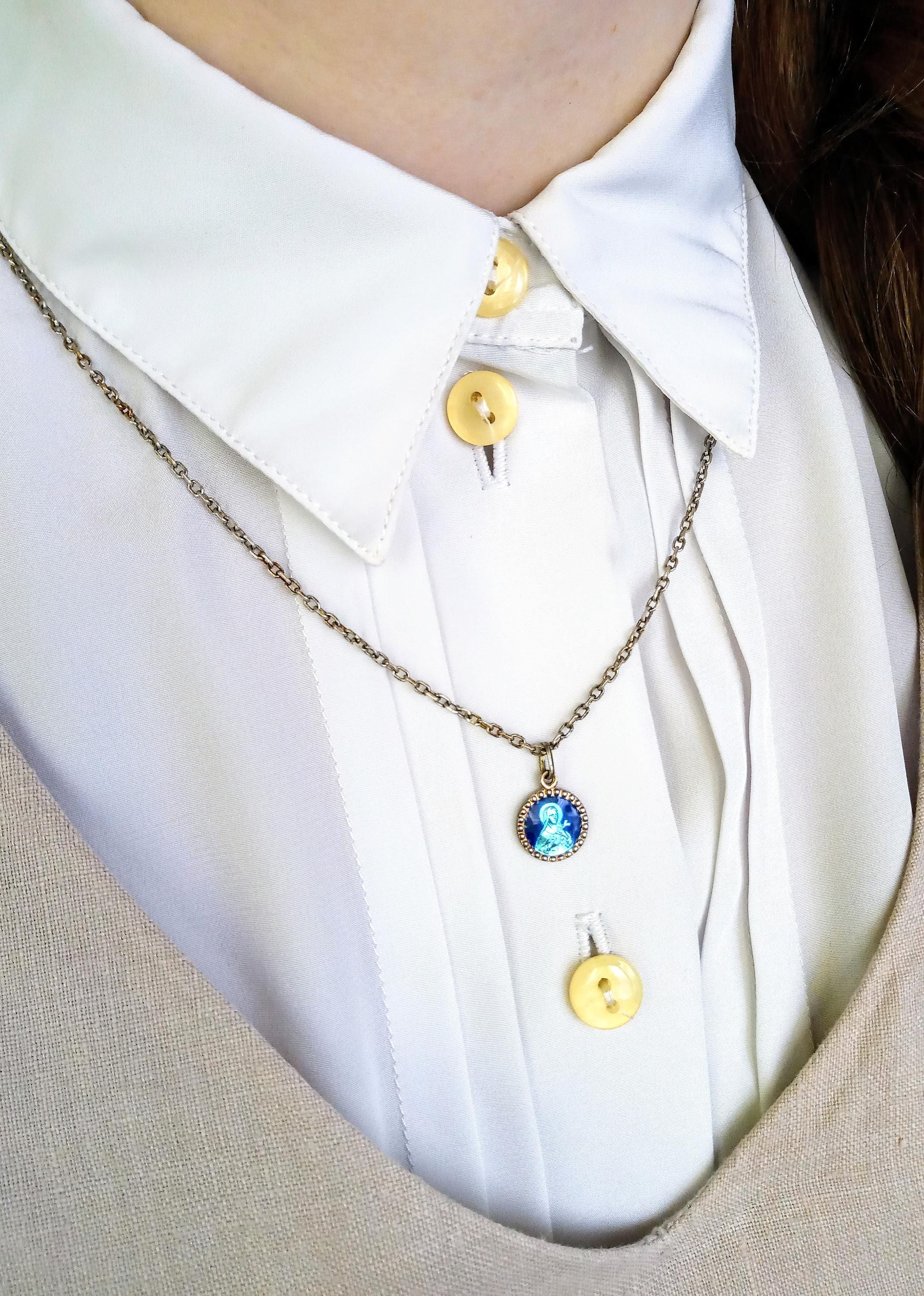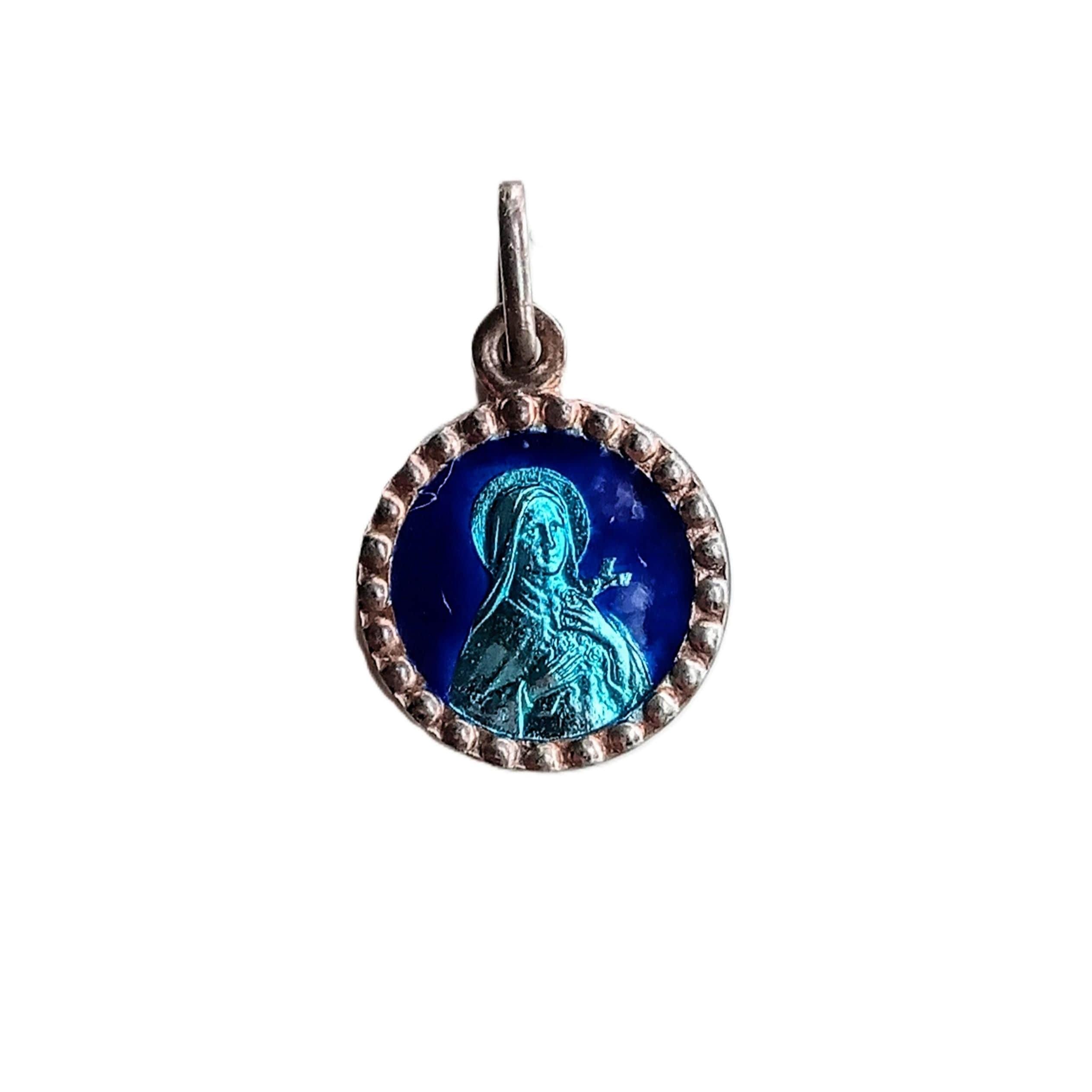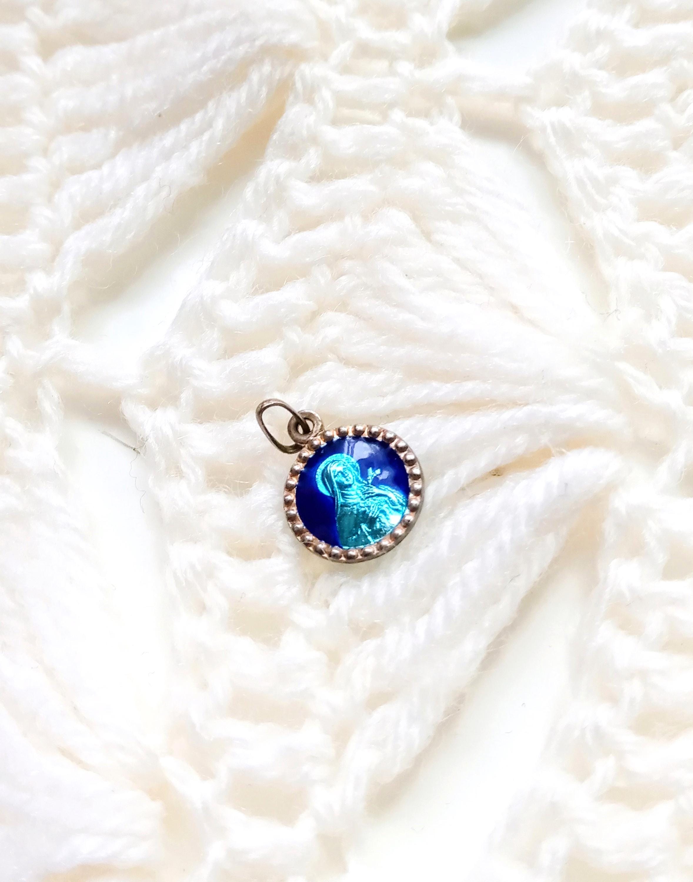 Une collection de médailles et pendentifs religieux vintage datant des années 50, en émail bleu.