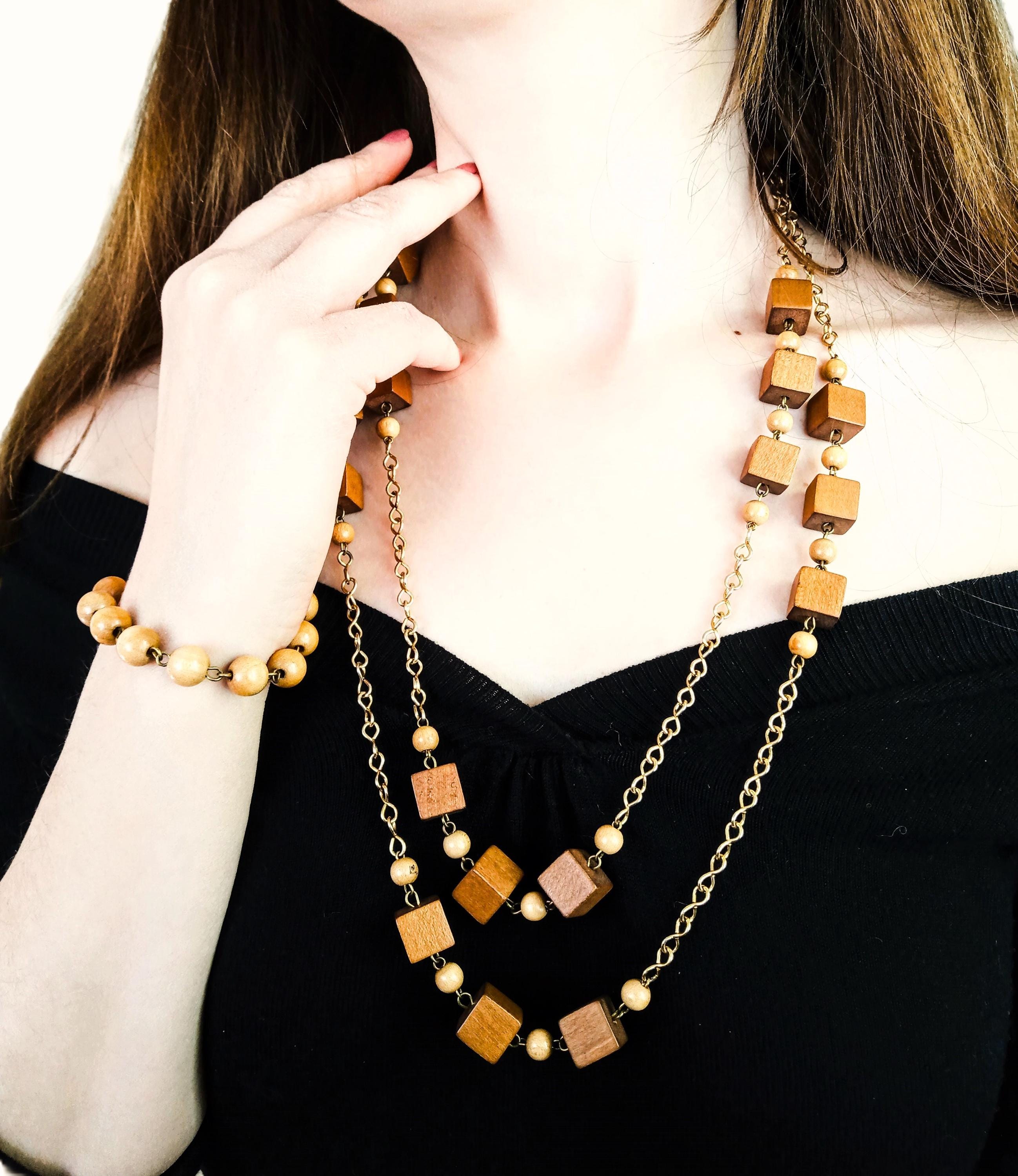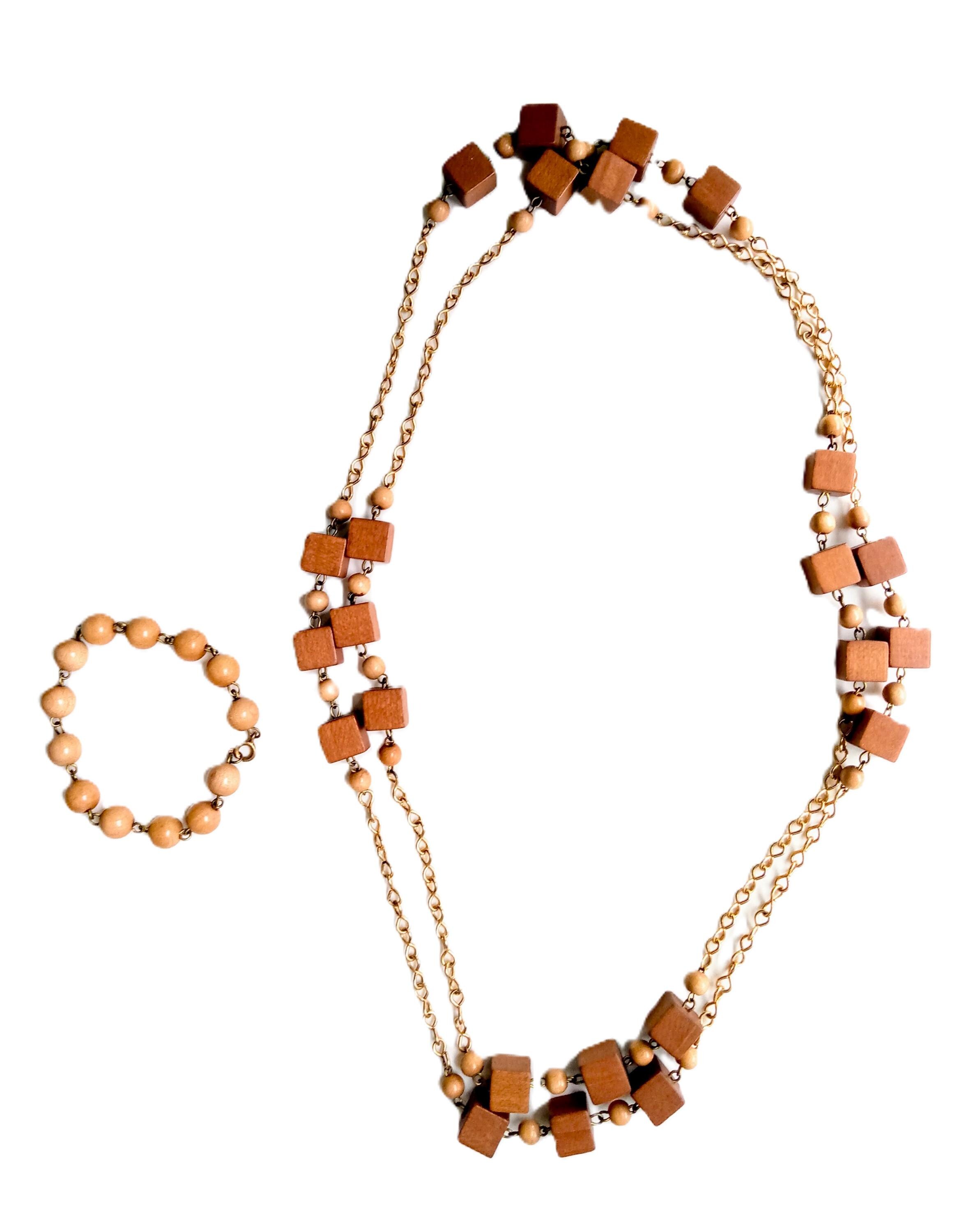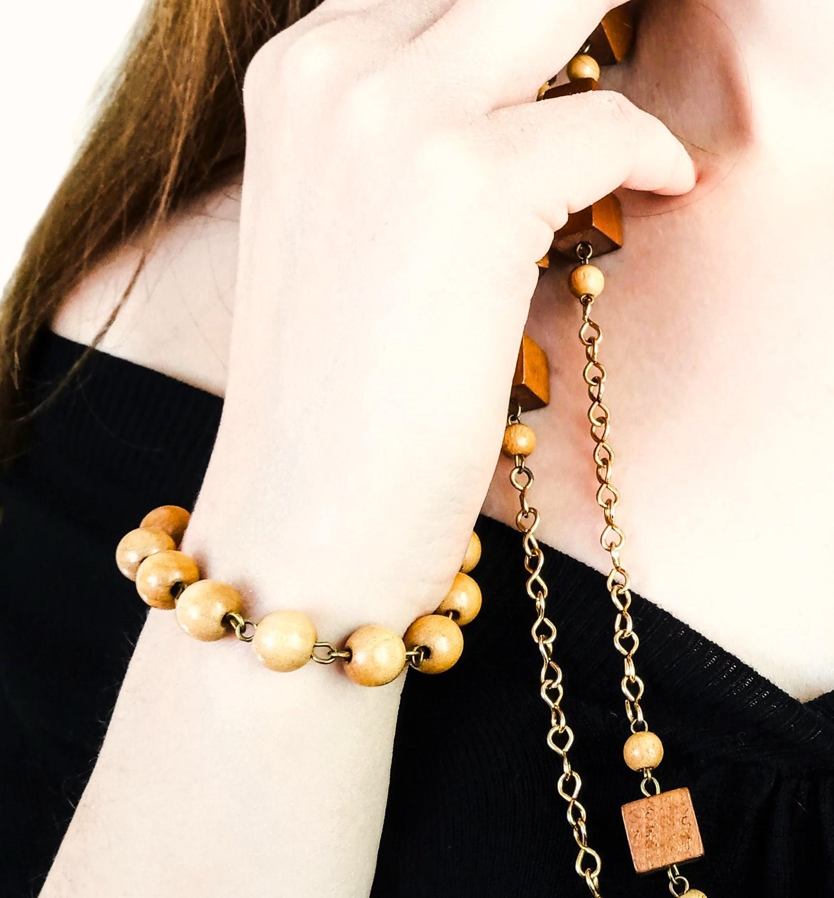 🇬🇧 Discover this magnificent set of vintage jewelry from the 70s: a necklace and a bracelet in wood beads, perfect for a bohemian chic and timeless style.