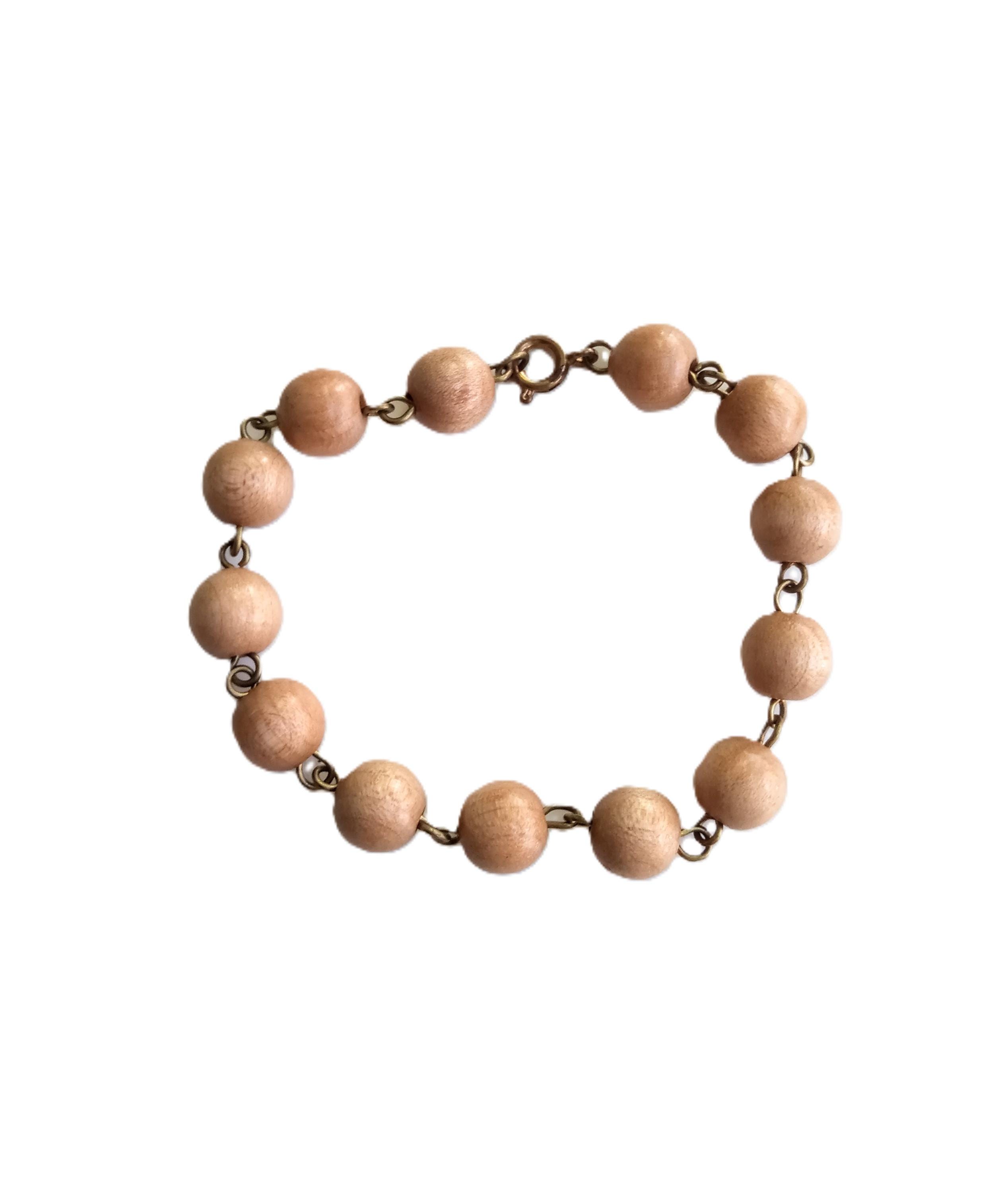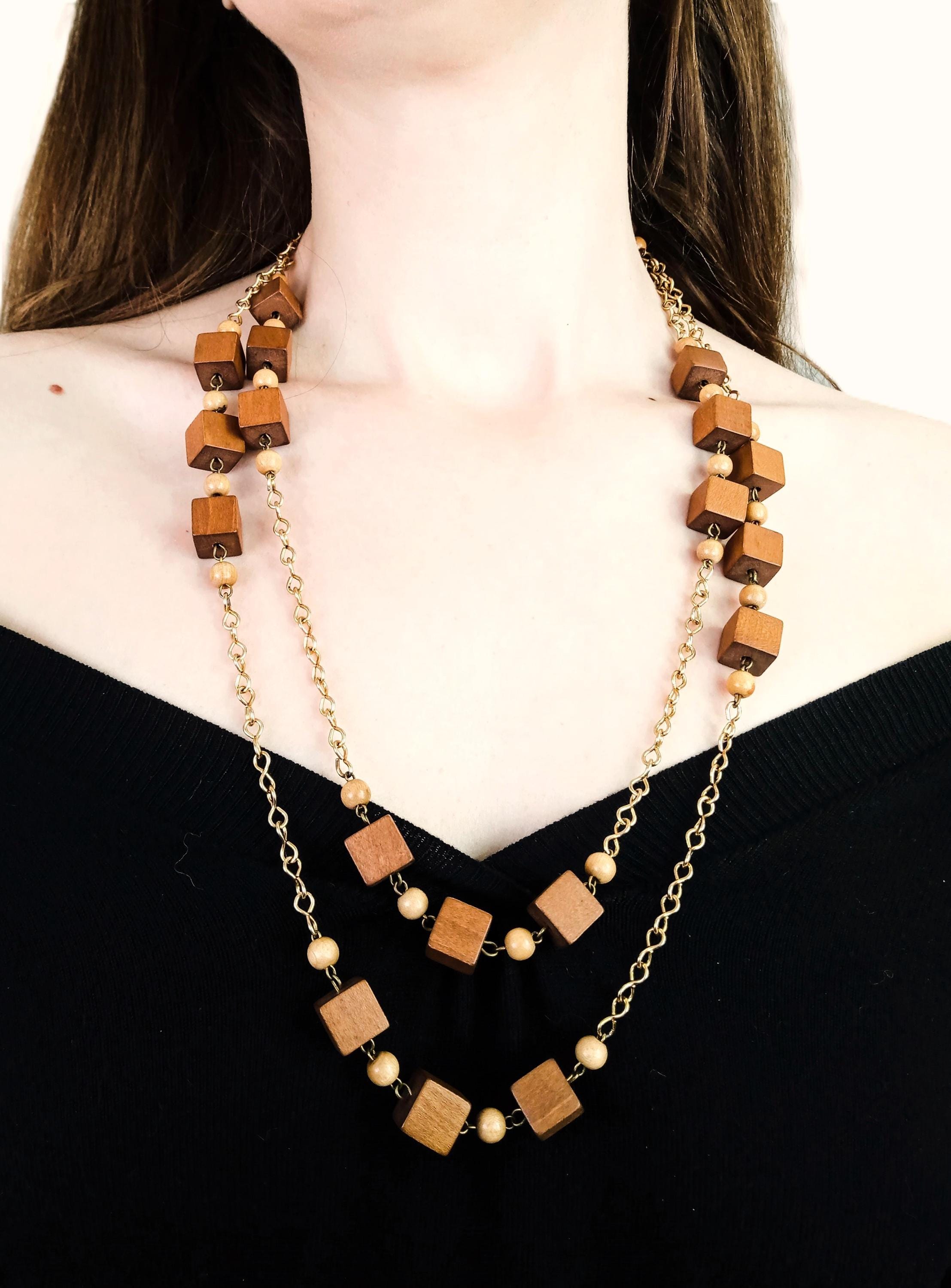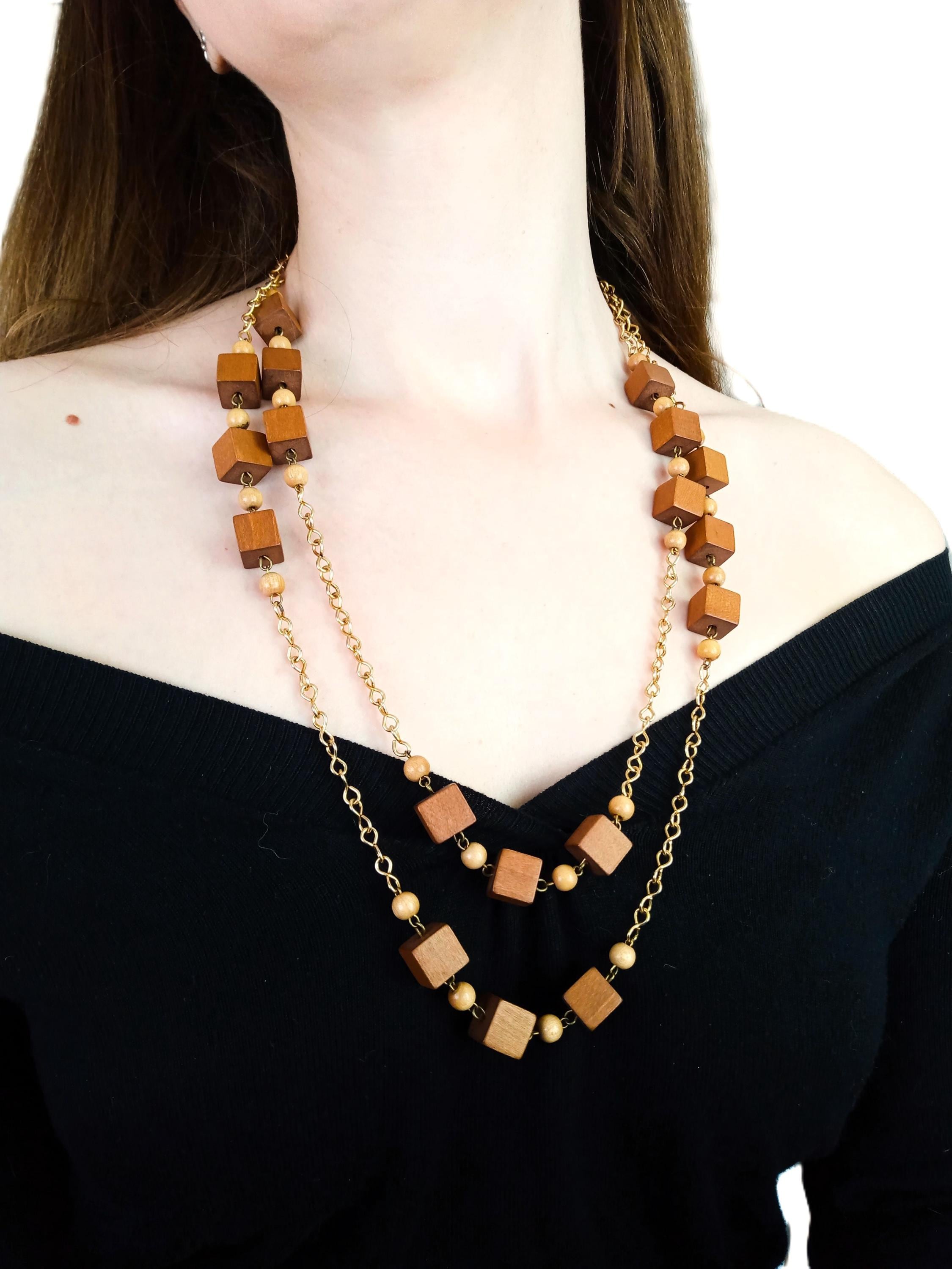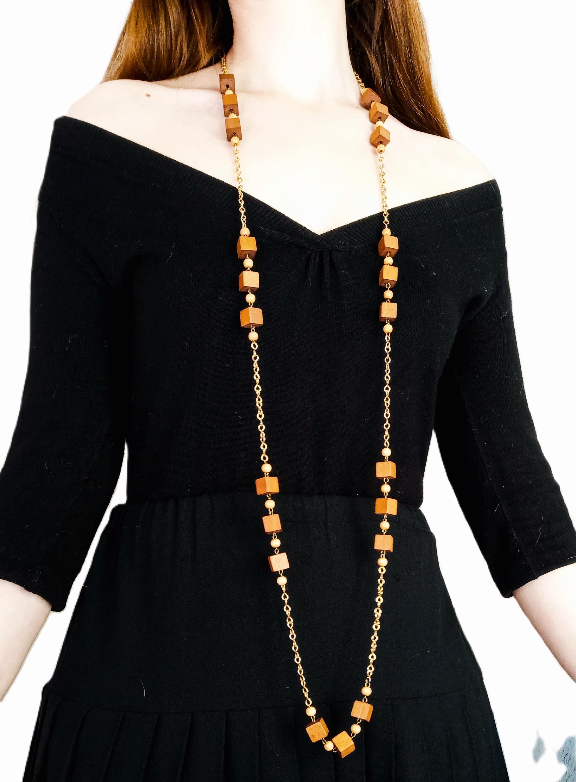 Découvrez ce magnifique ensemble de bijoux vintage des années 70 : un collier sautoir et un bracelet en perles de bois, parfaits pour un style bohème chic et intemporel.