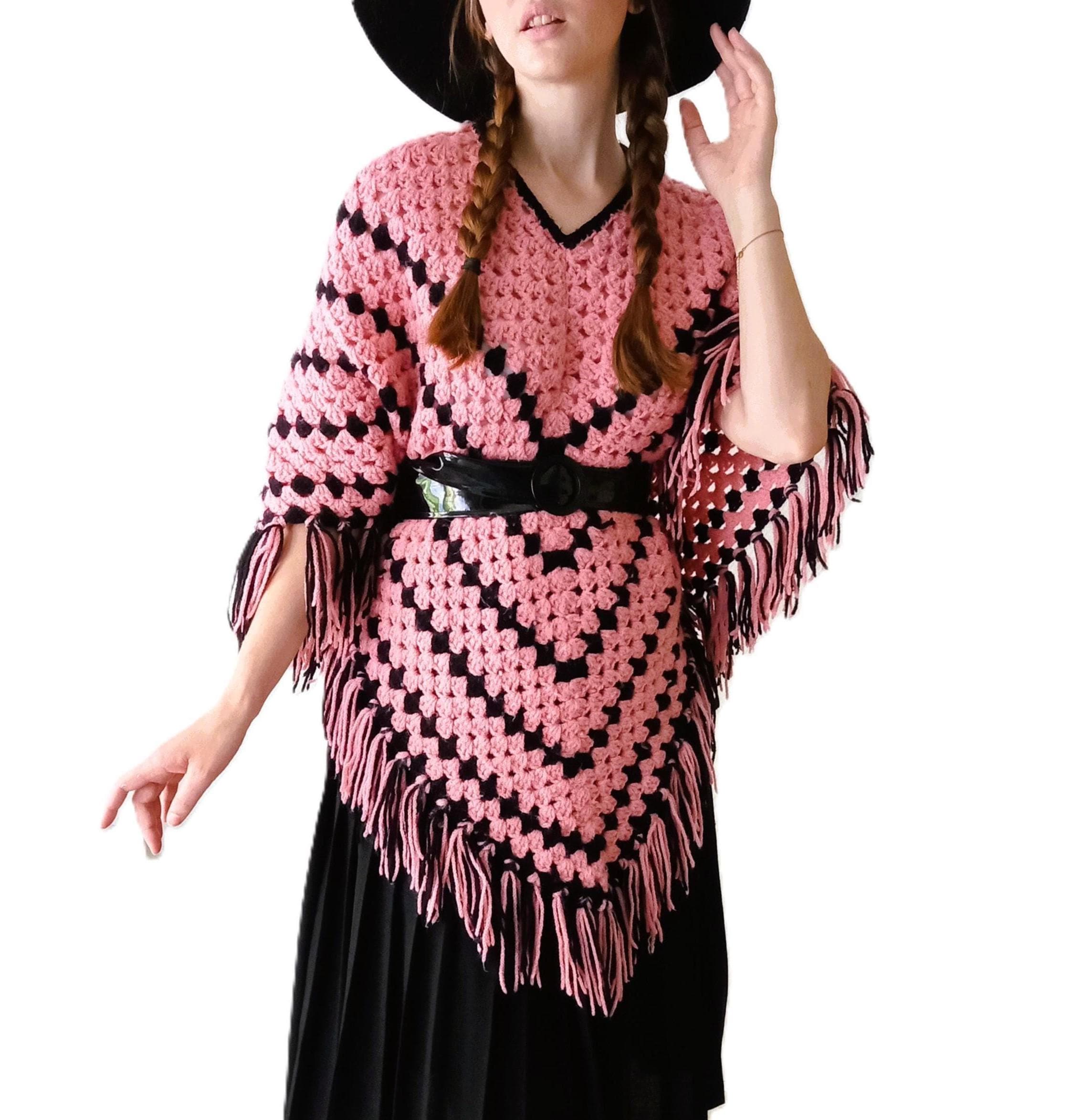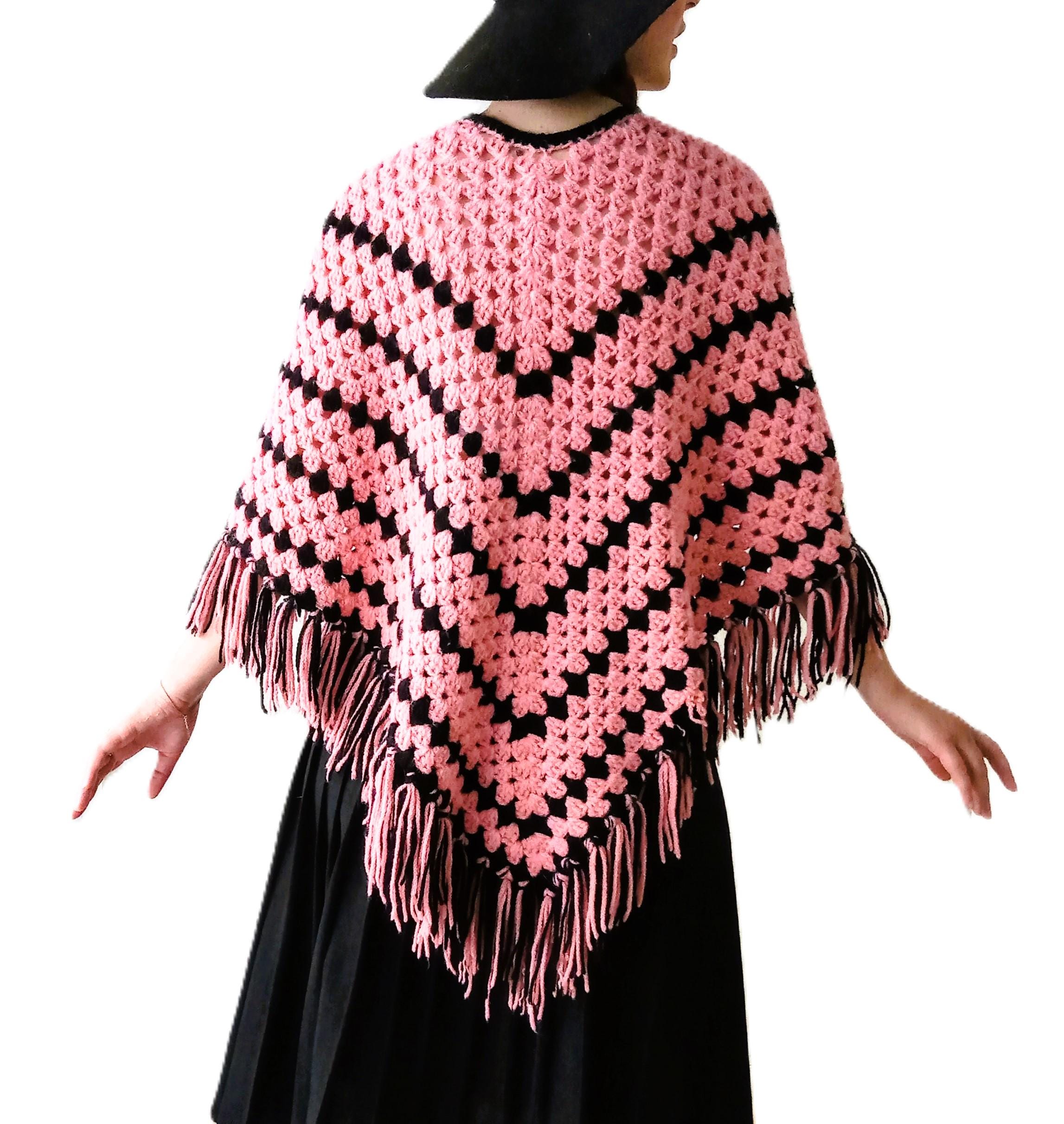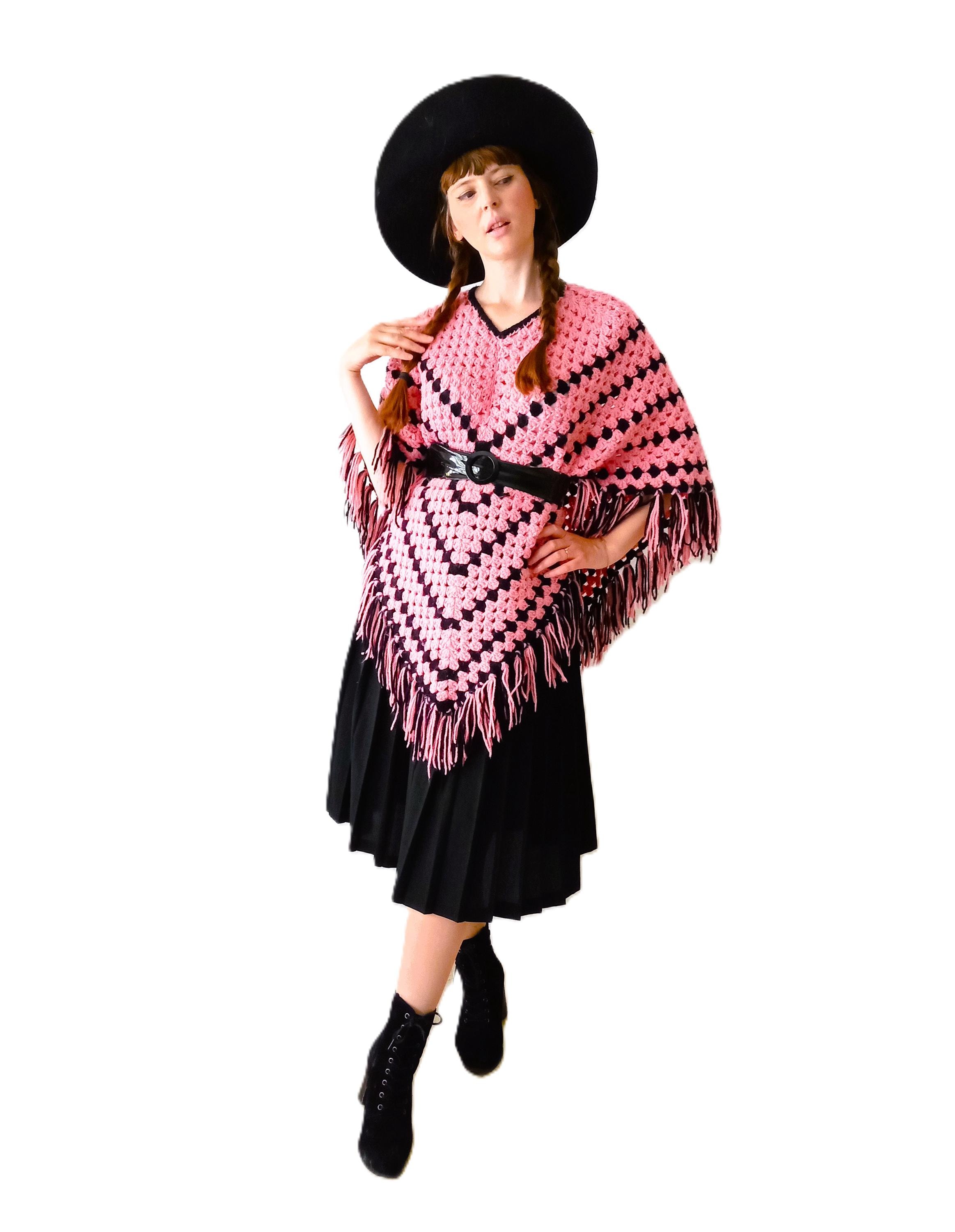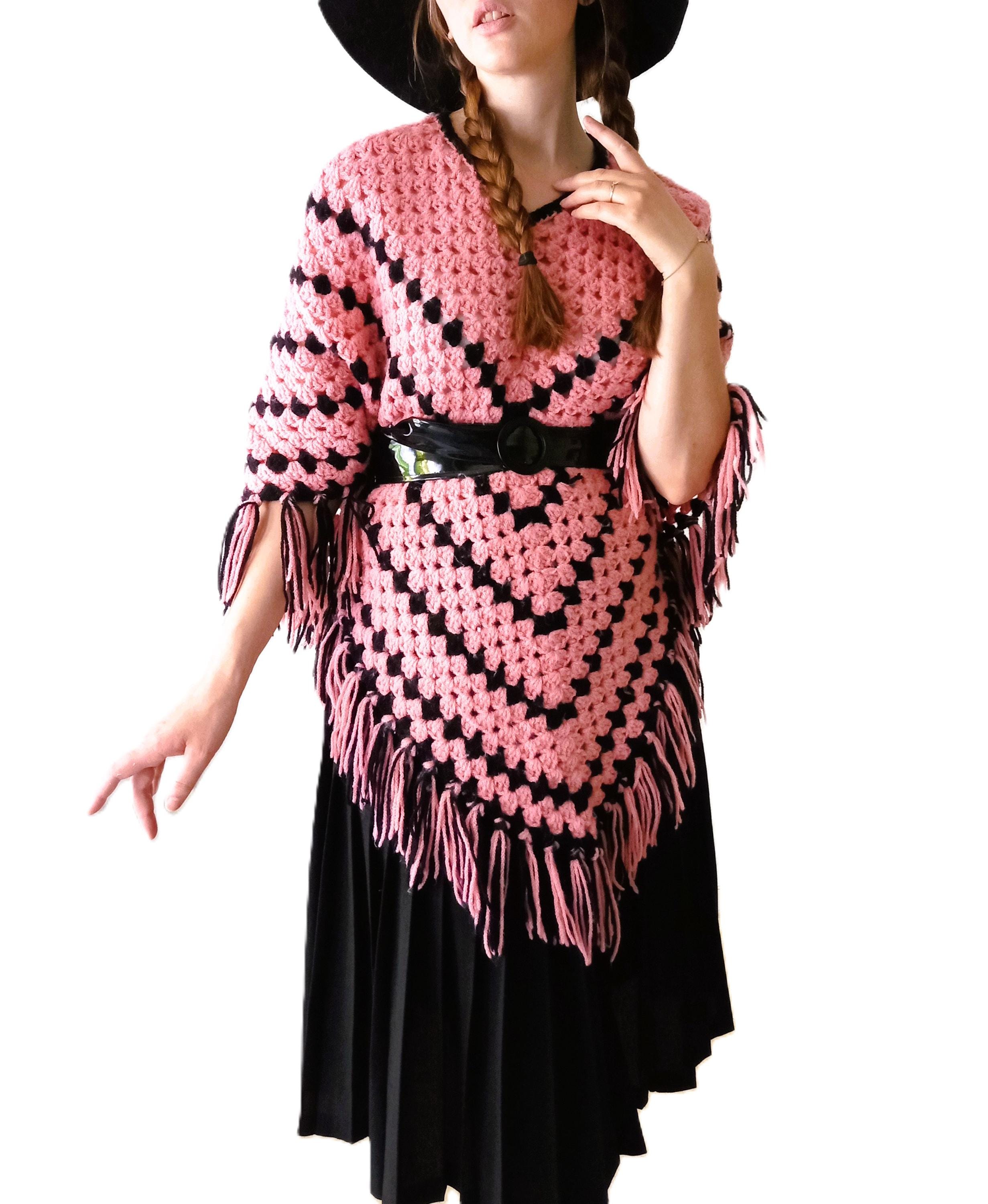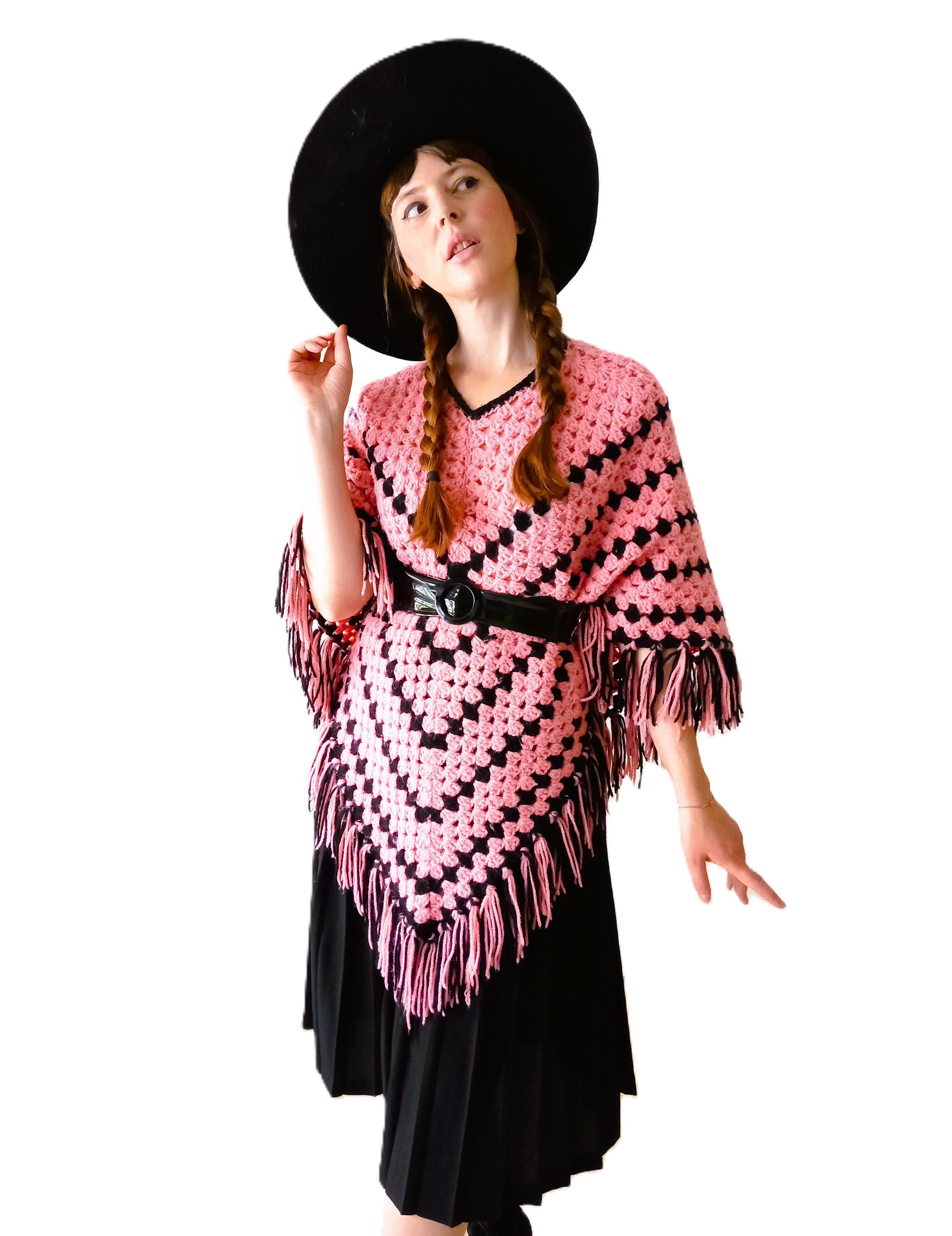 🇬🇧Discover this magnificent Pink and Black Crochet Poncho from the 70s – a real journey in the bohemian and vintage spirit of the seventies!