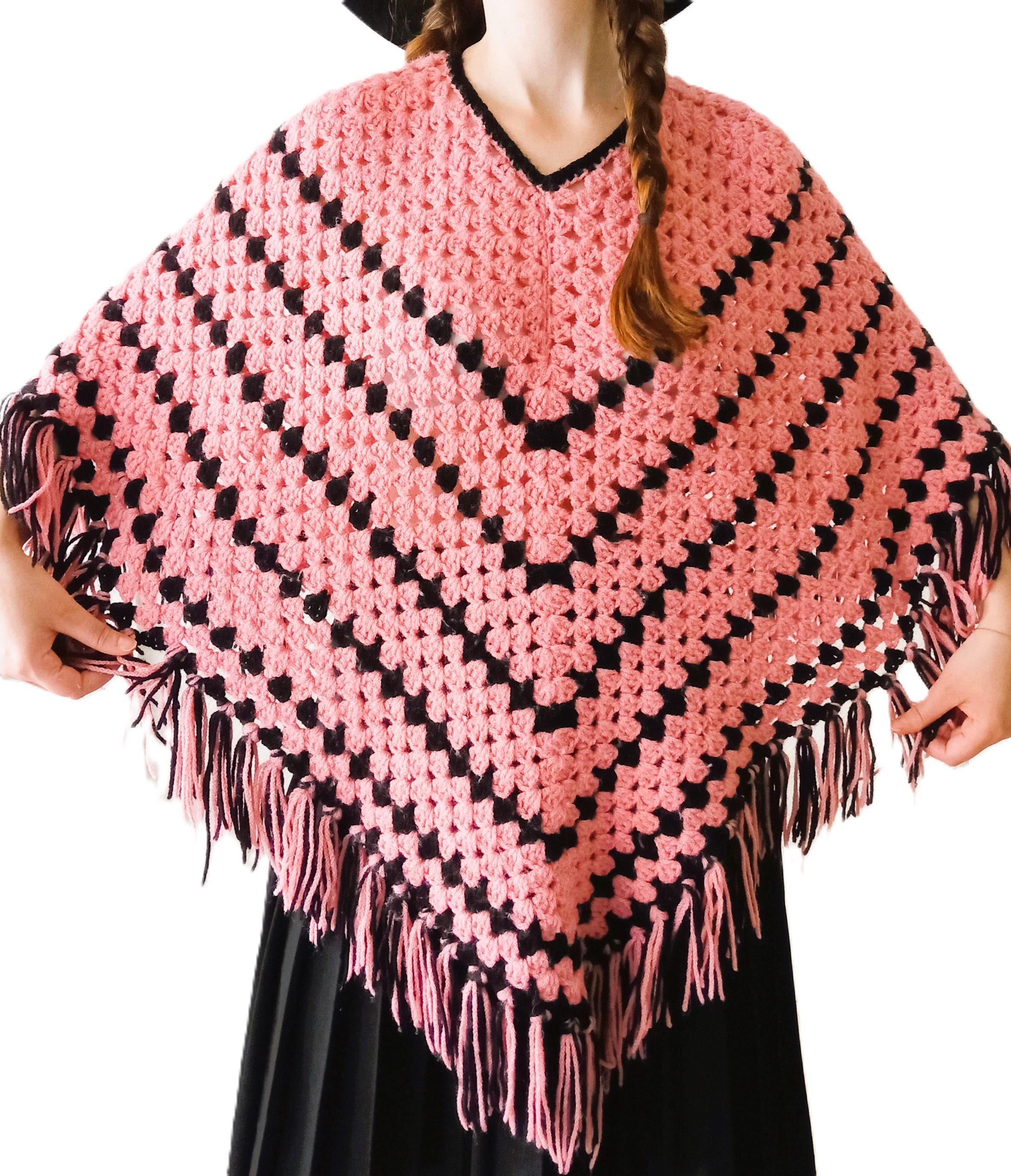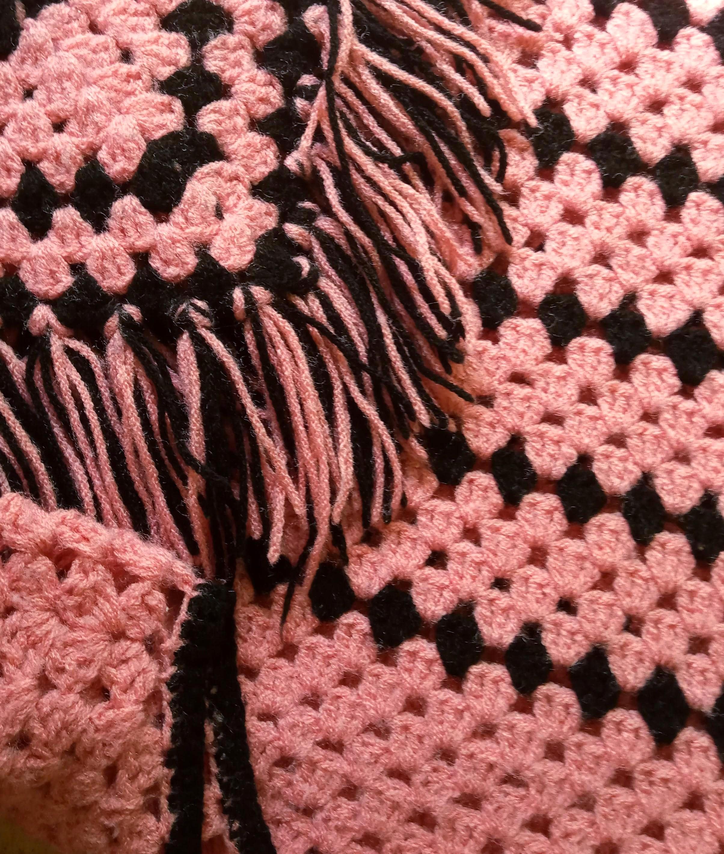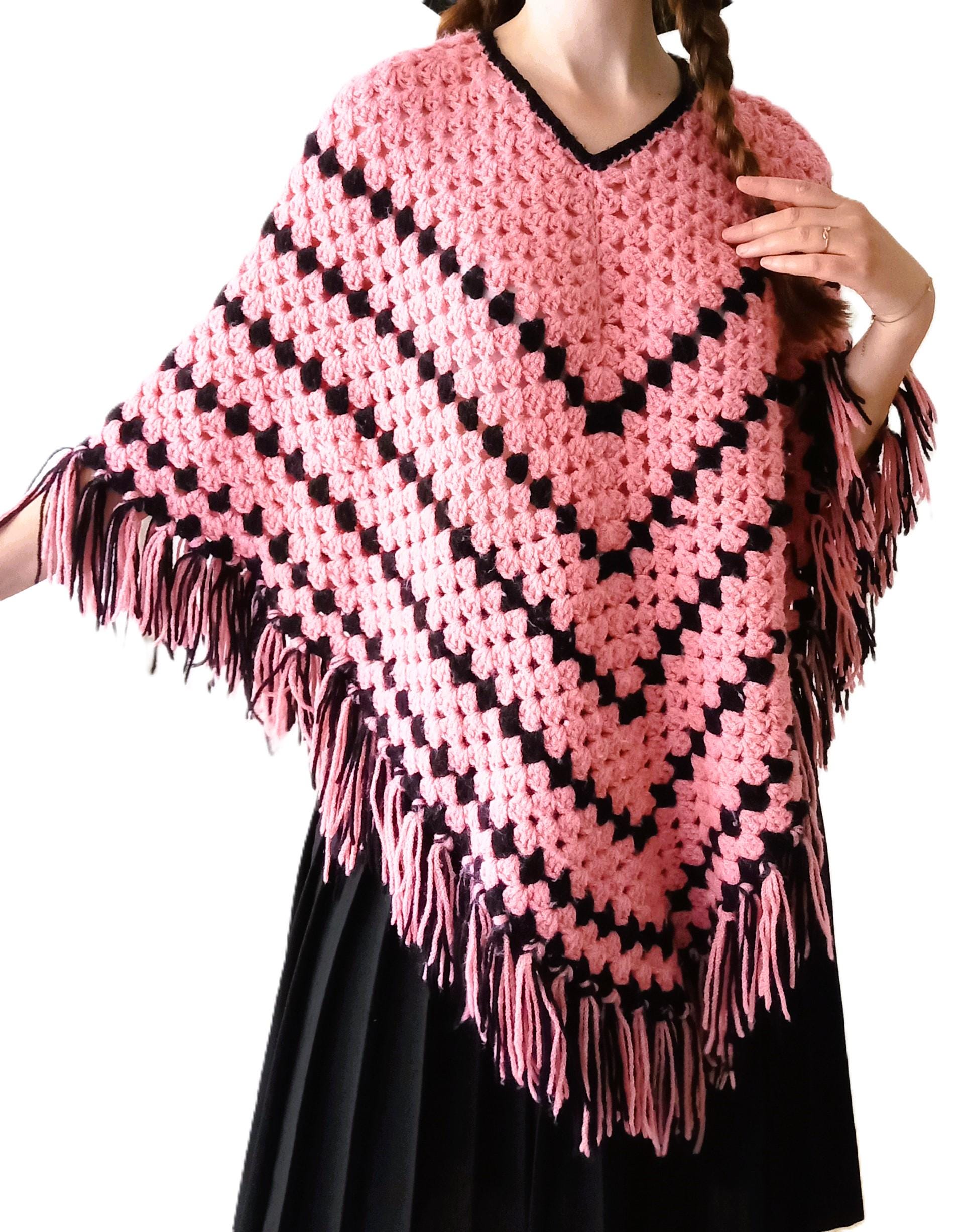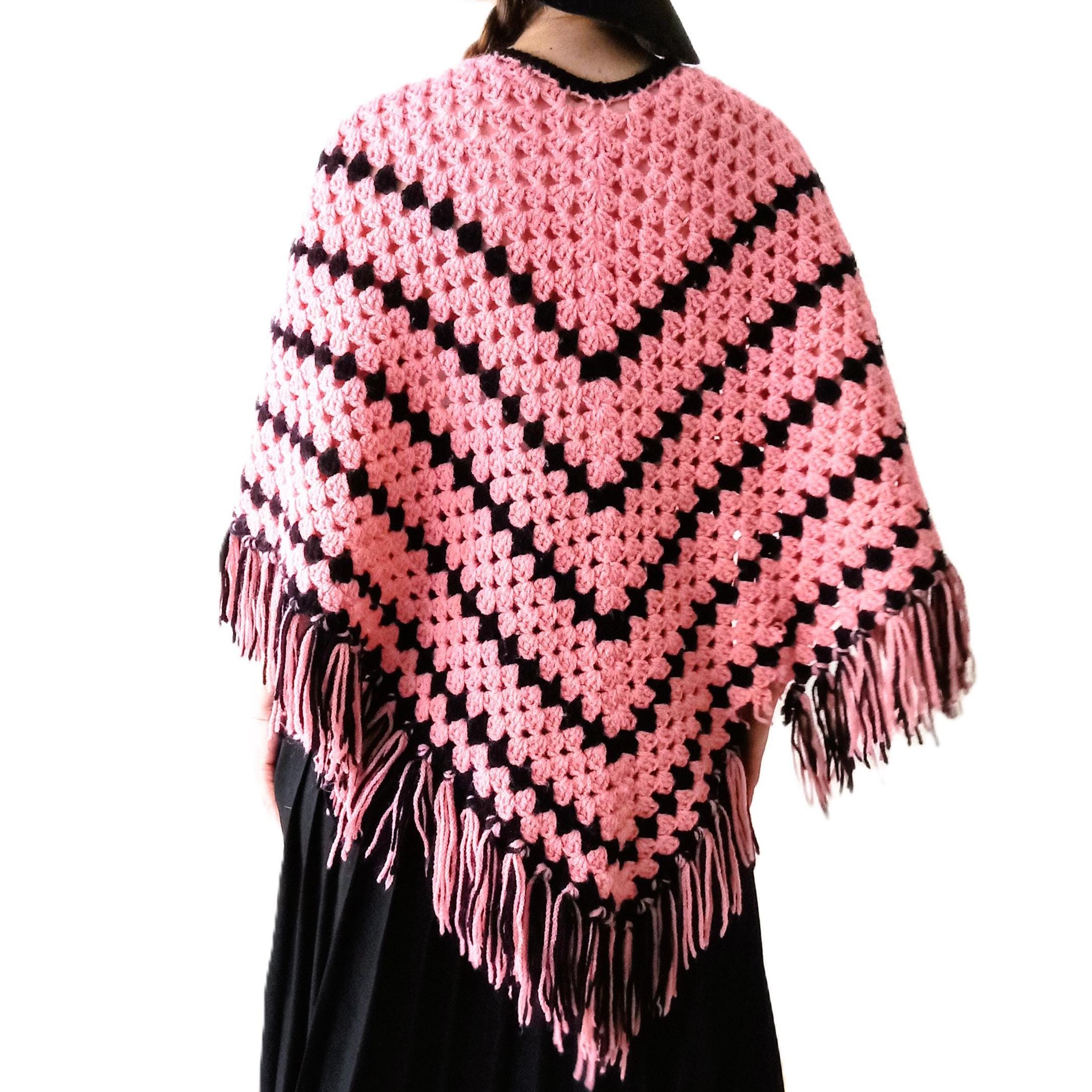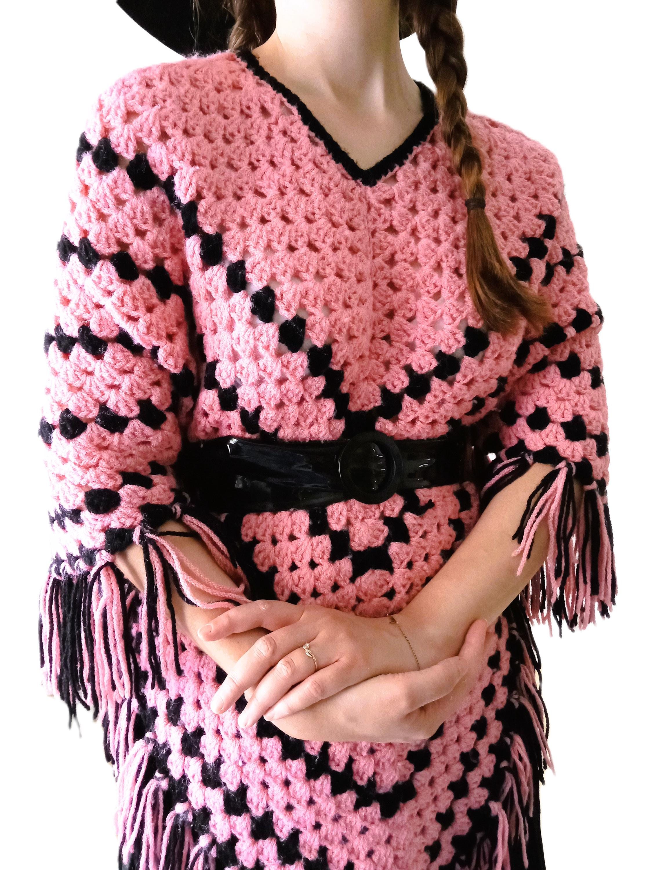 🇬🇧Discover this magnificent Pink and Black Crochet Poncho from the 70s – a real journey in the bohemian and vintage spirit of the seventies!