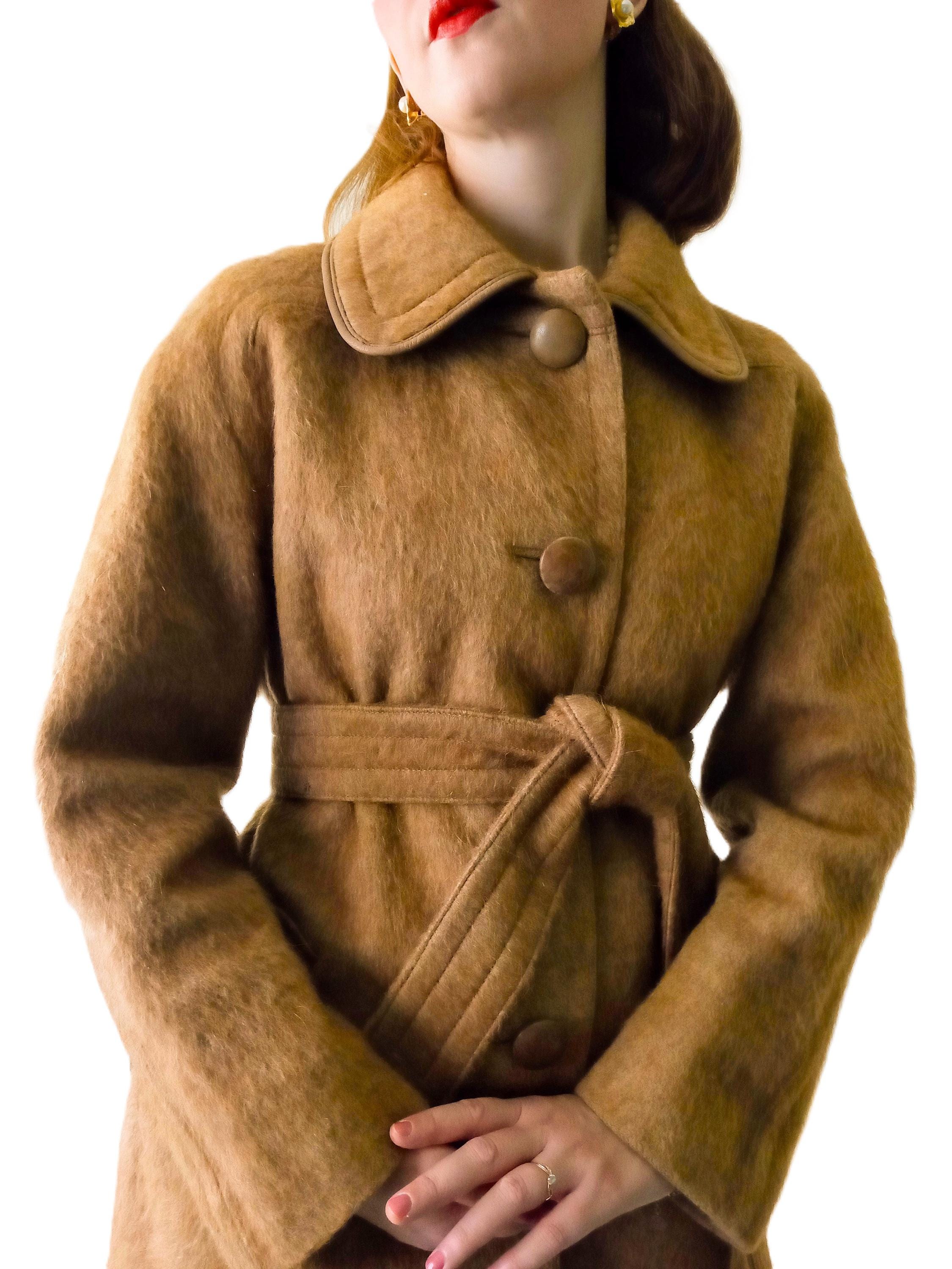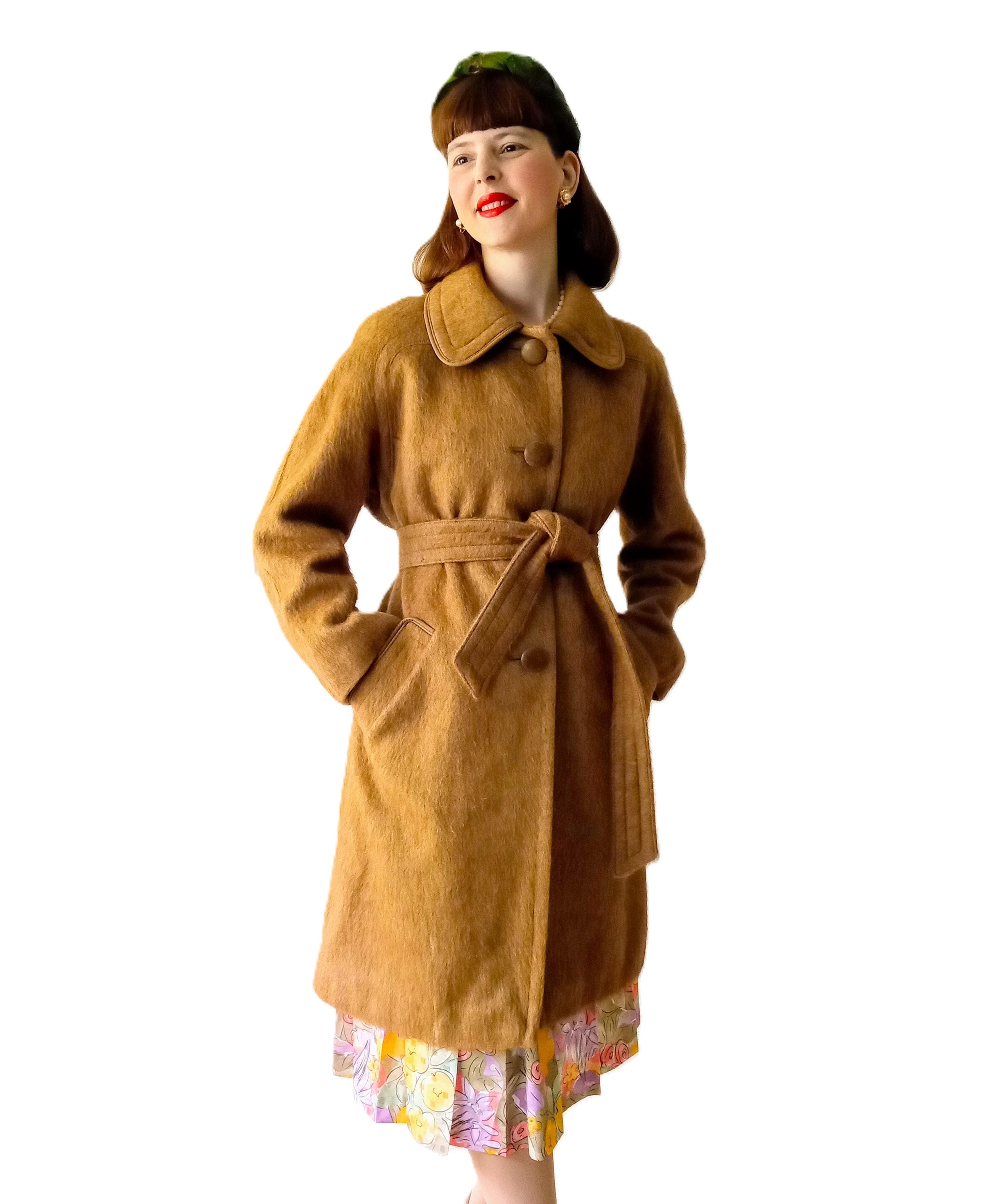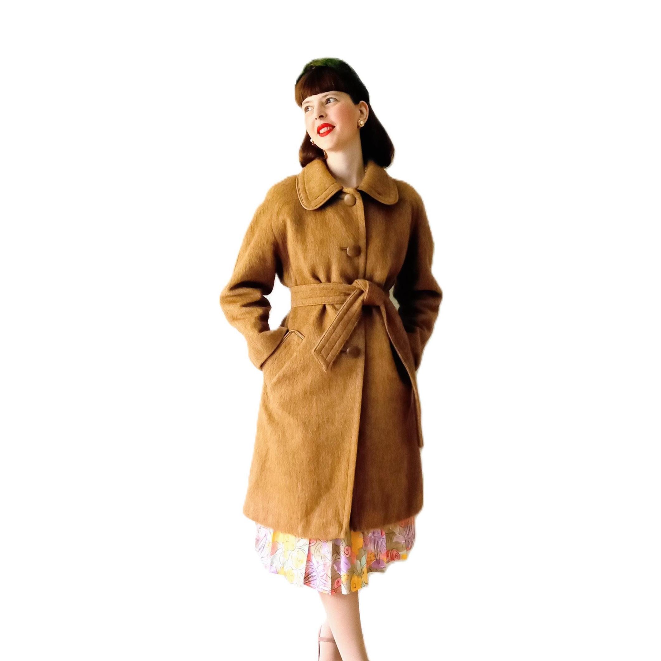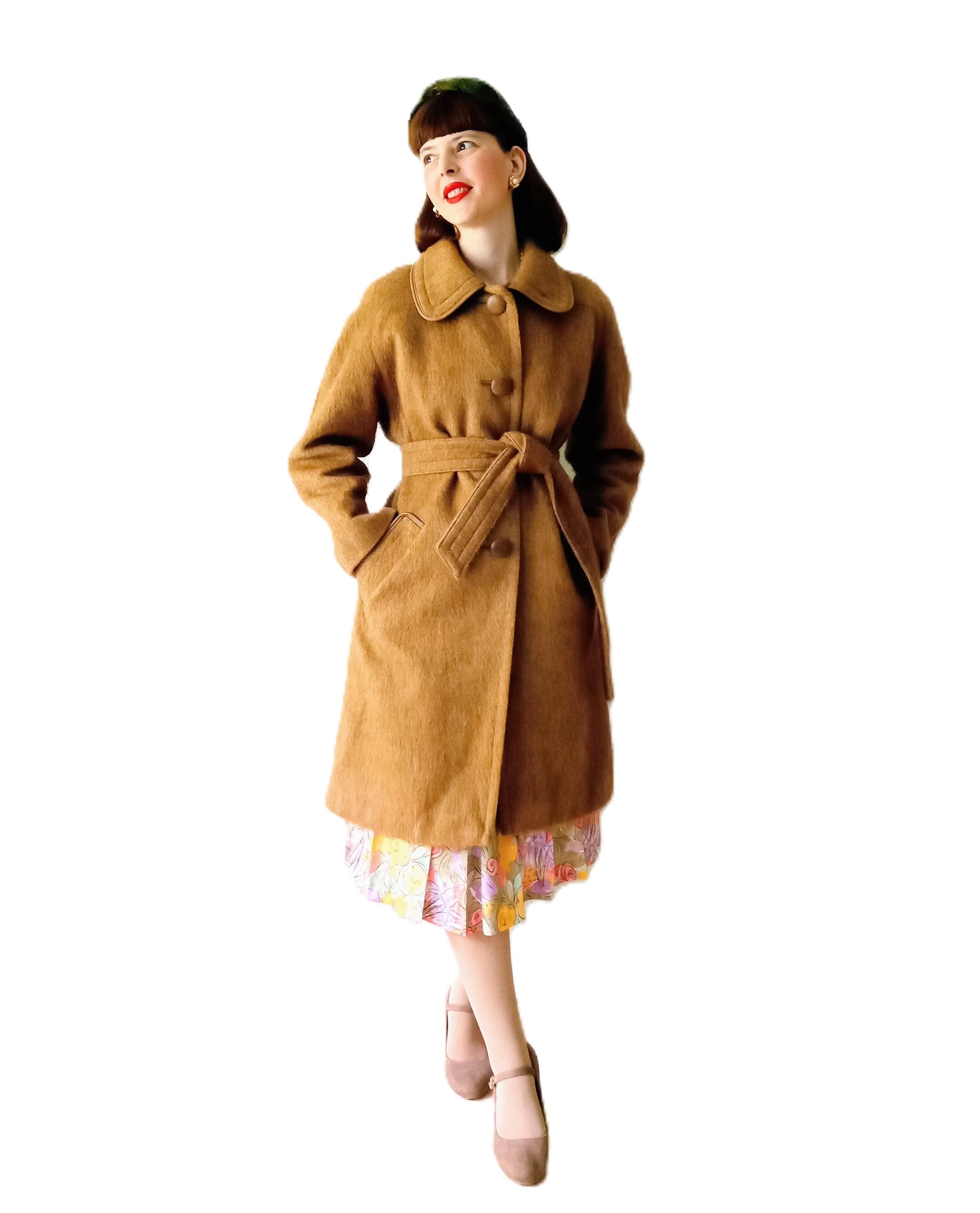 Manteau Femme Camel Beige Vintage en Laine - Années 60/70 - Long & Ceinturée - Esprit Rétro