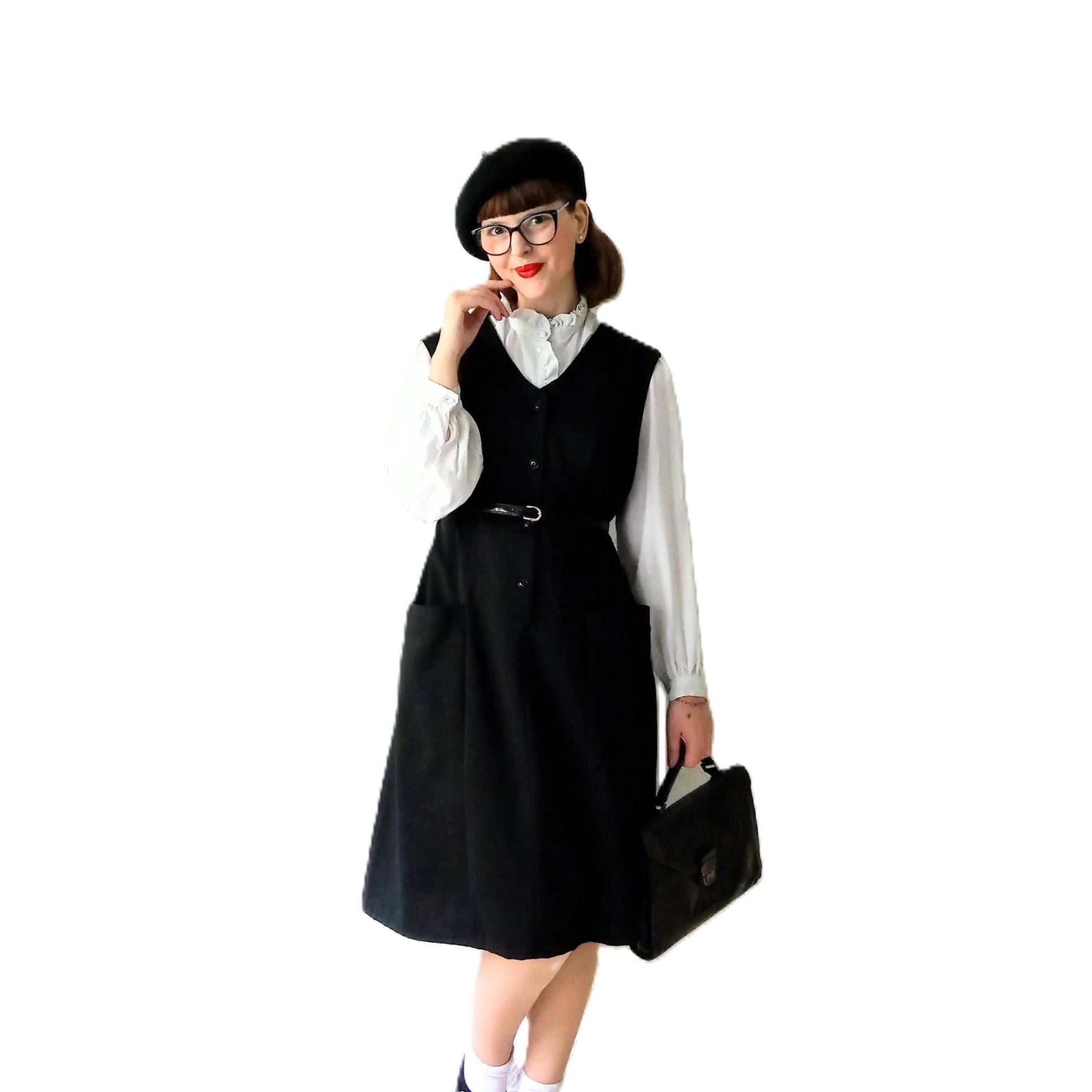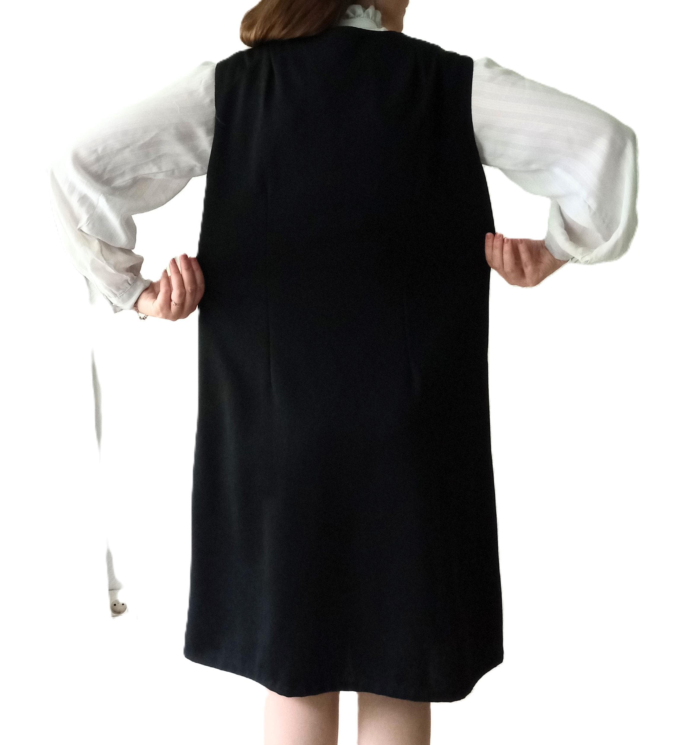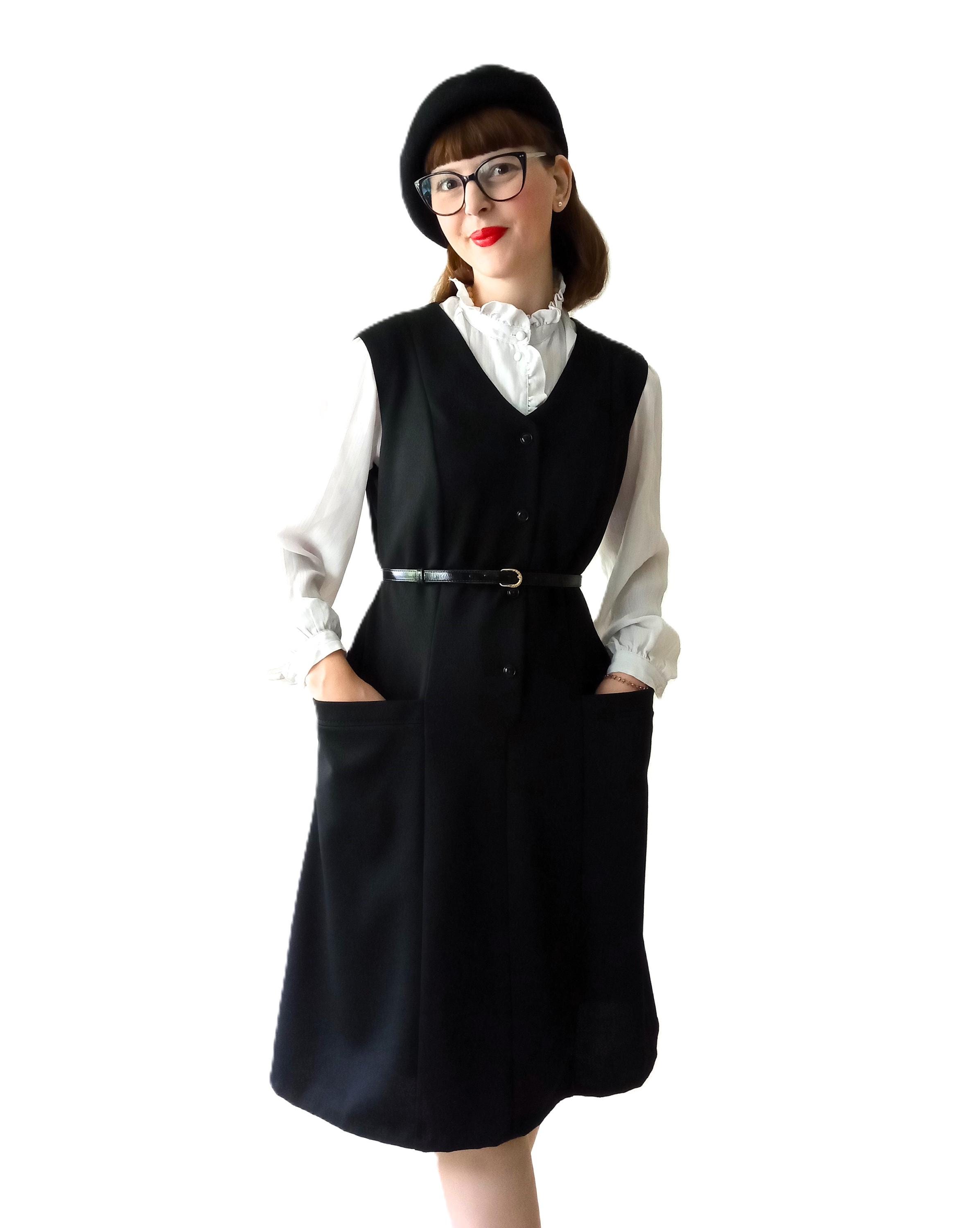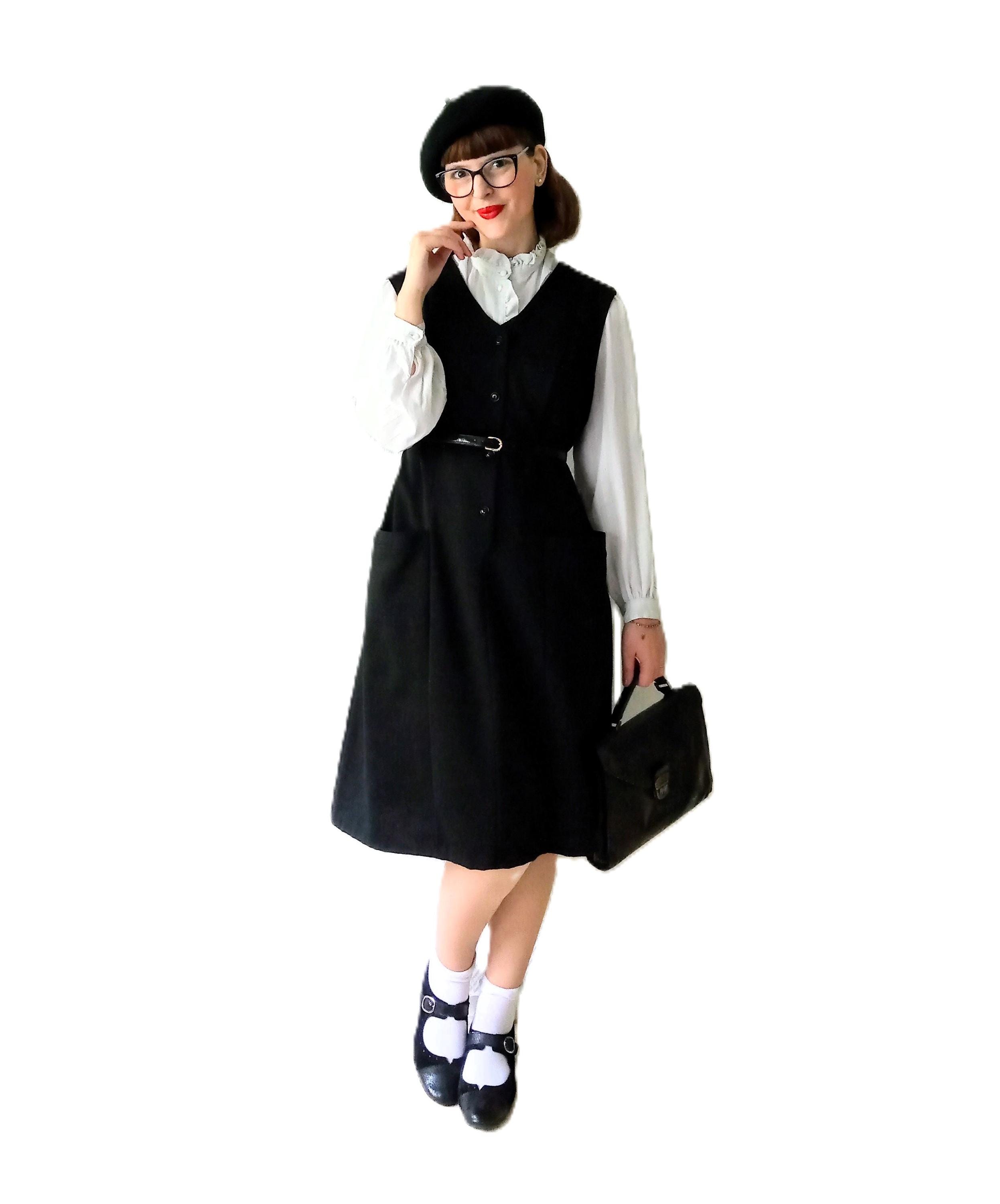 Découvrez cette magnifique robe noire chasuble automne/hiver vintage des années 70, parfaite pour un look rétro rétro.
