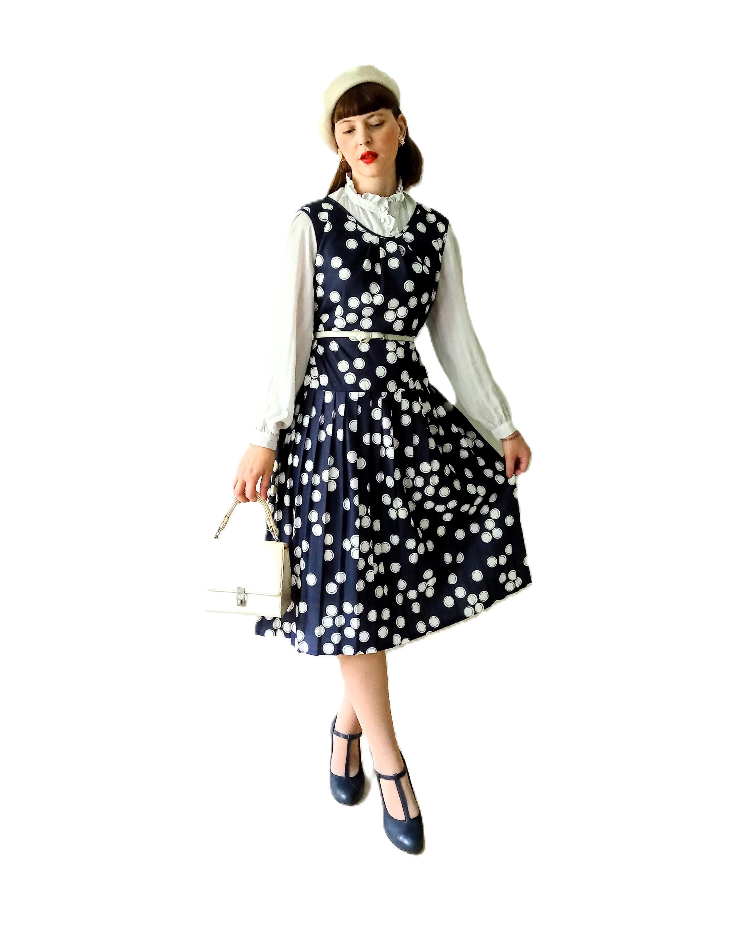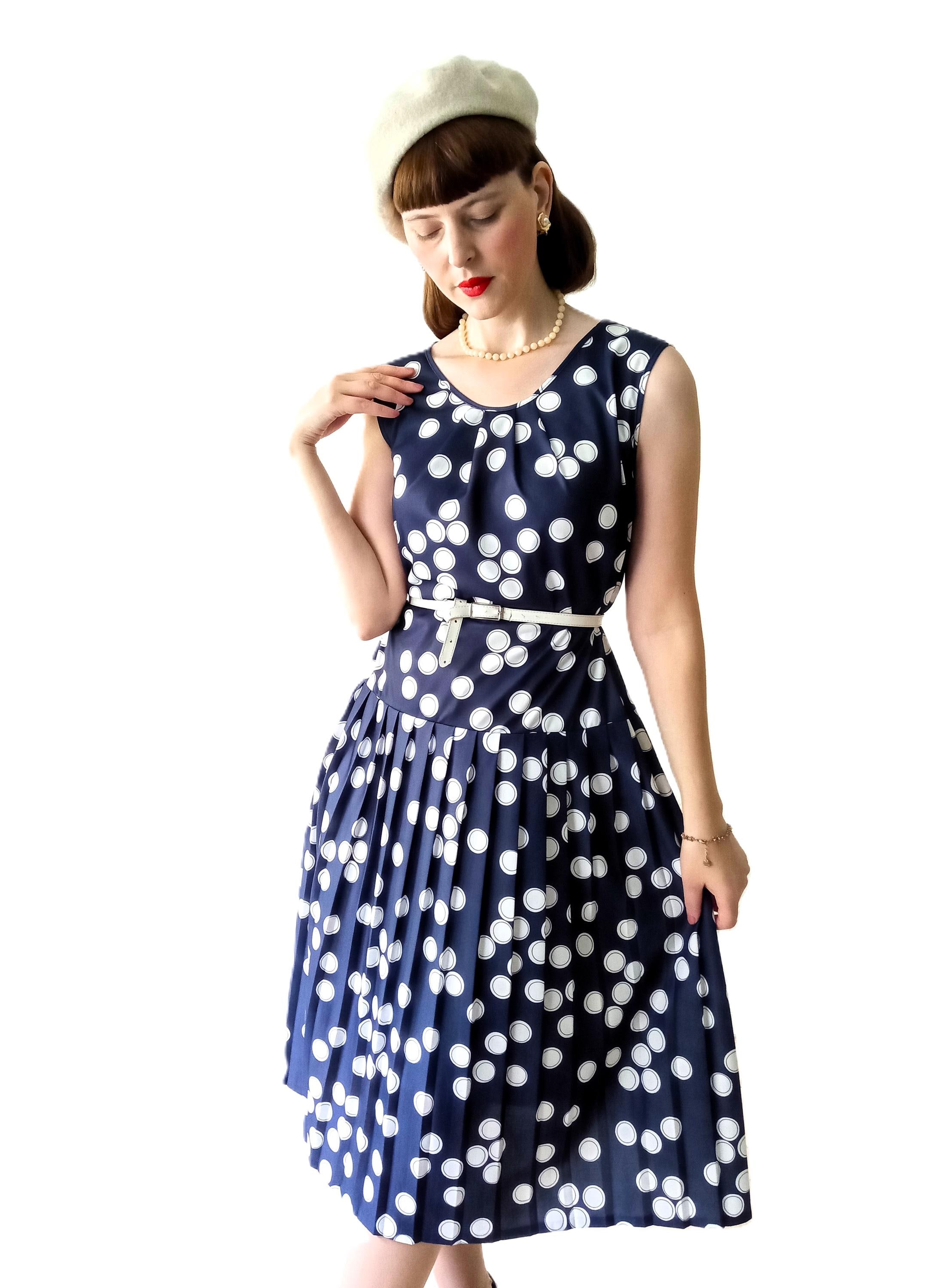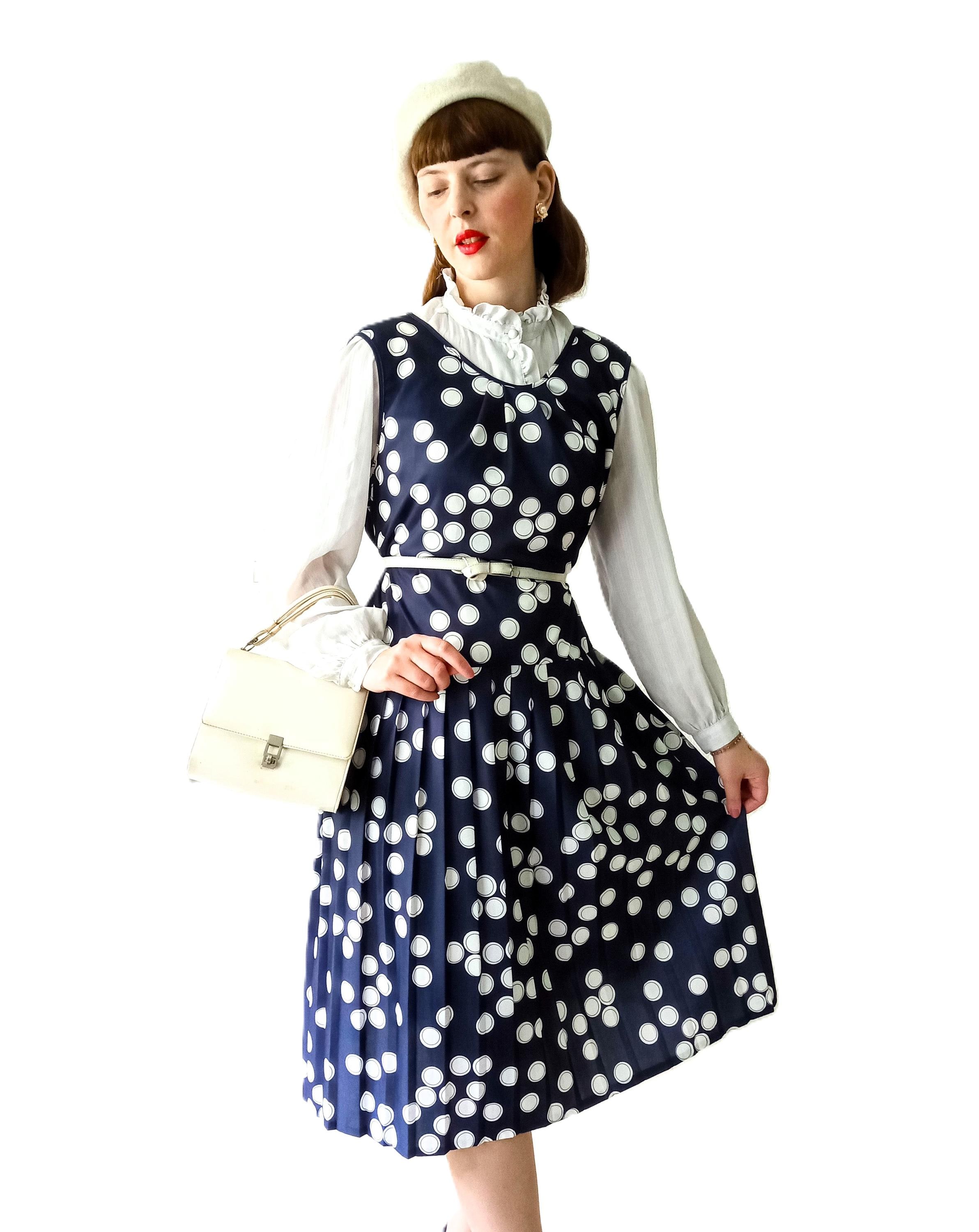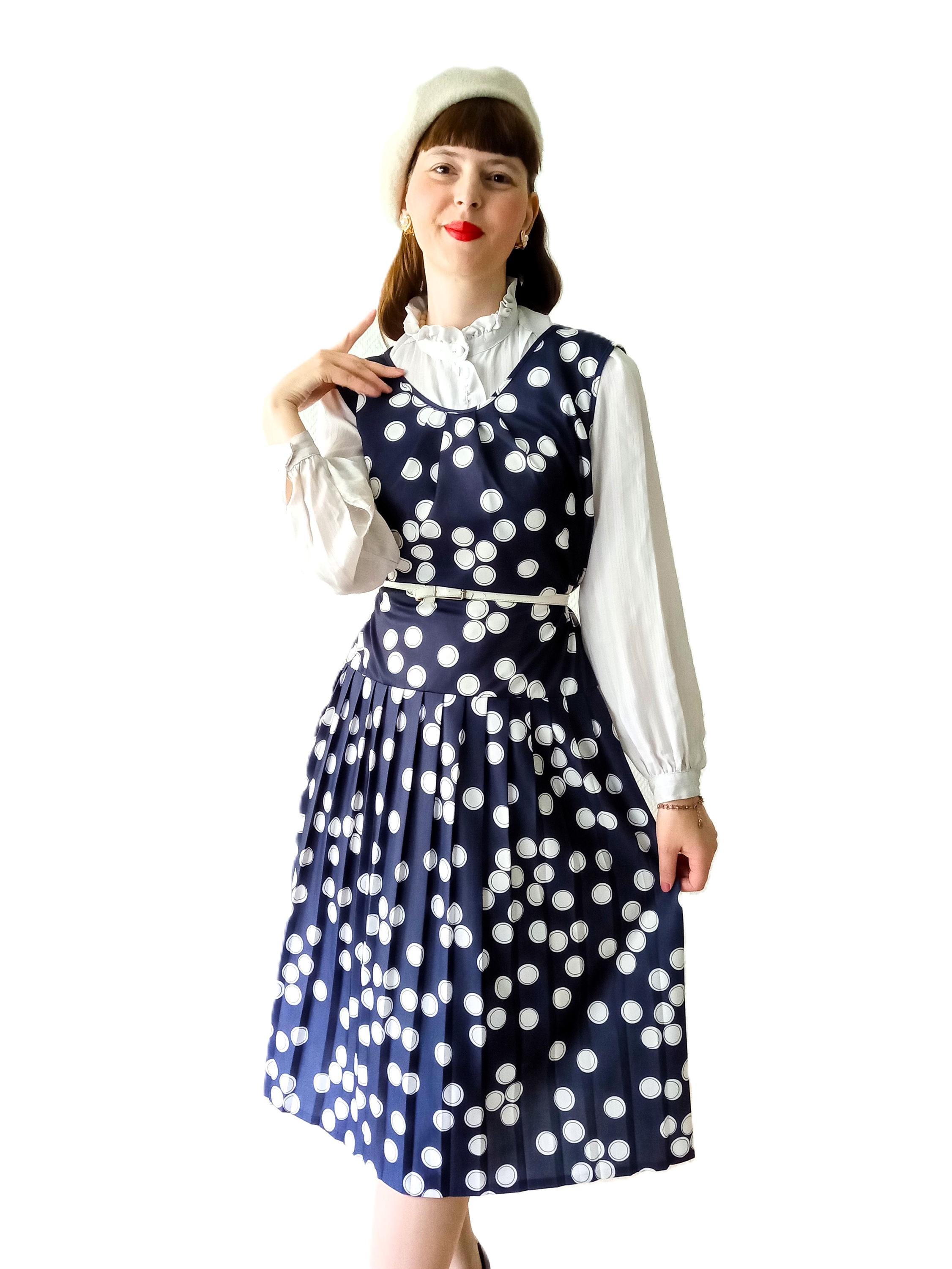 Discover this magnificent vintage polka-dotted dress from the 80s, perfect for a retro and elegant look.