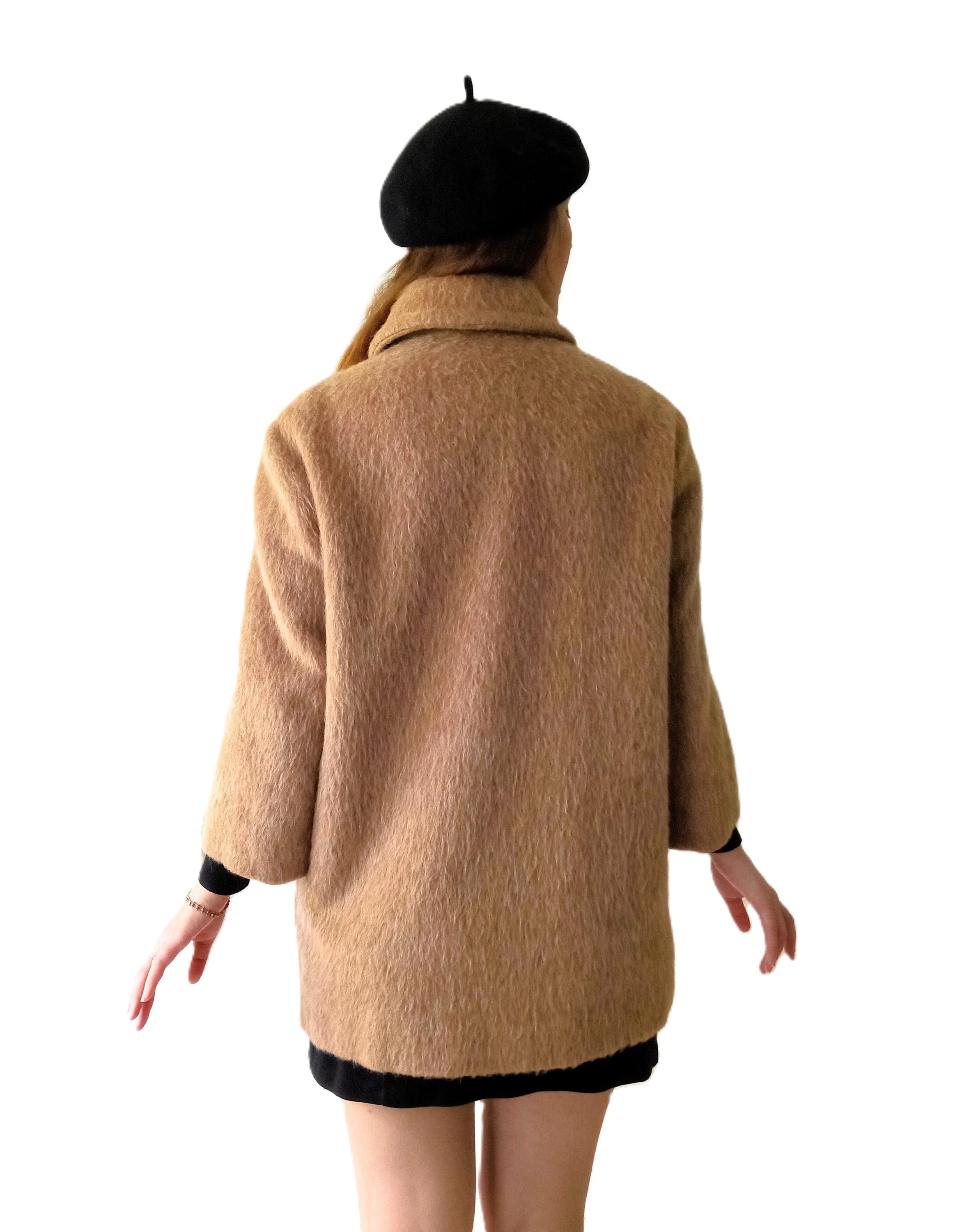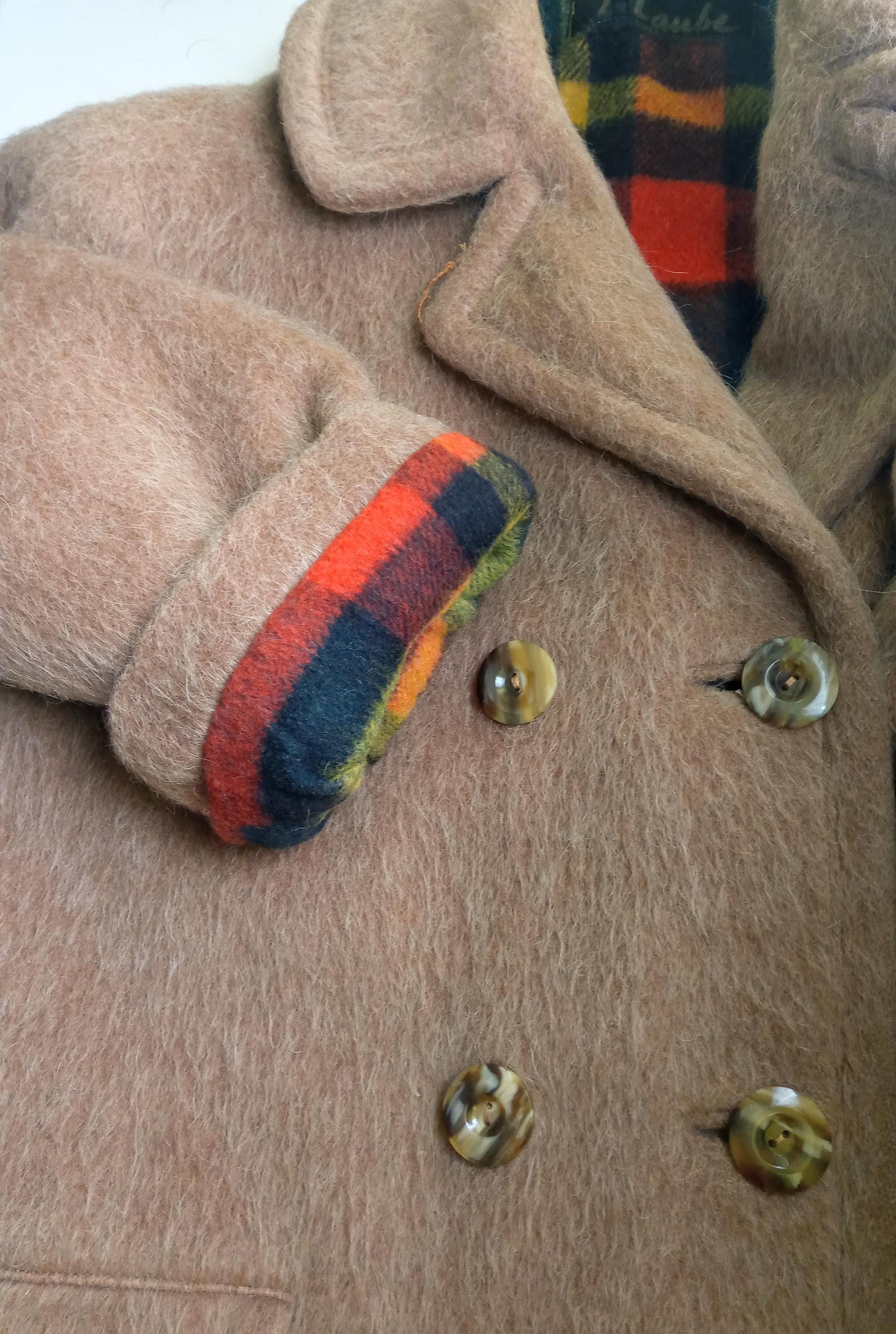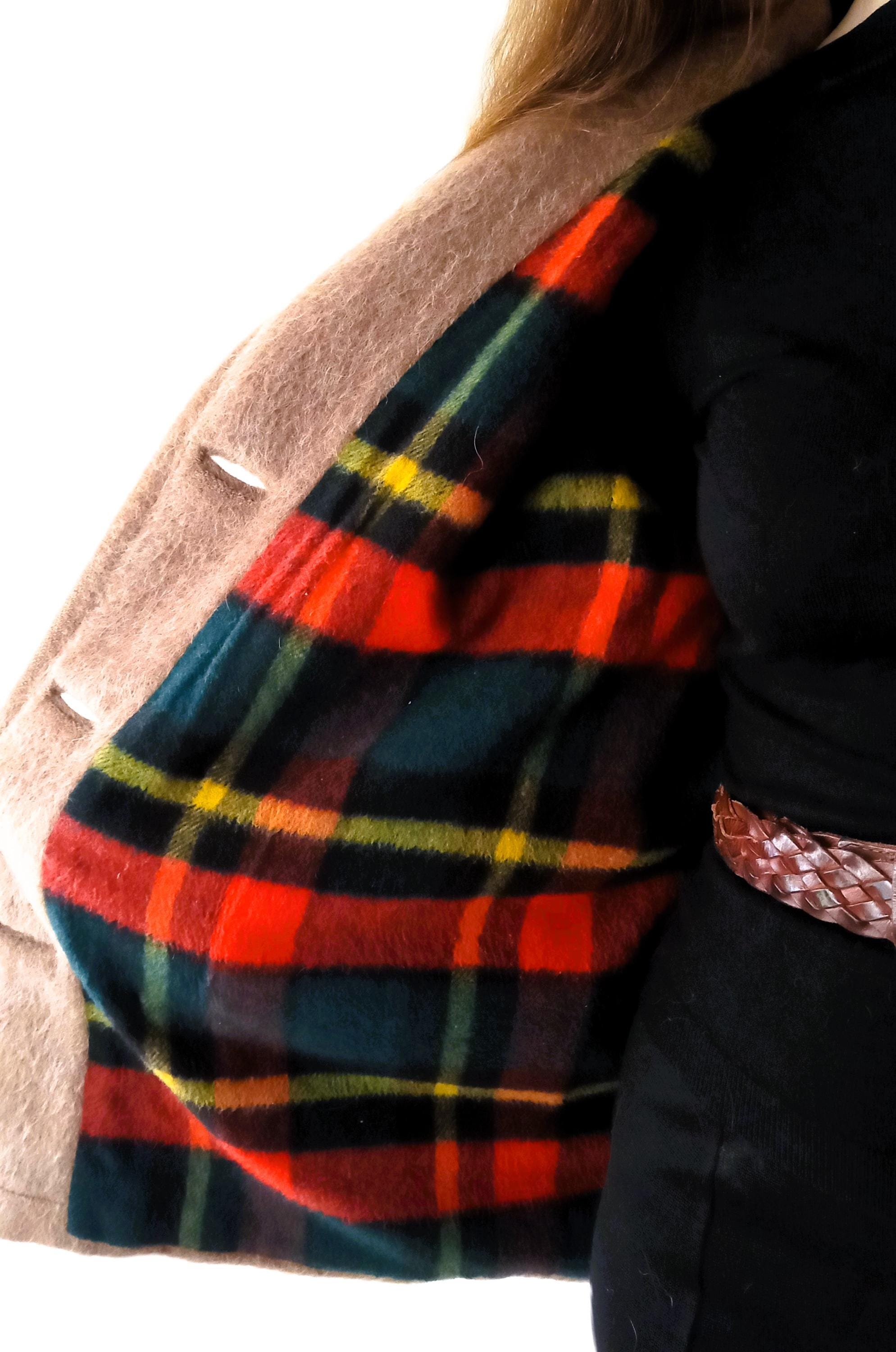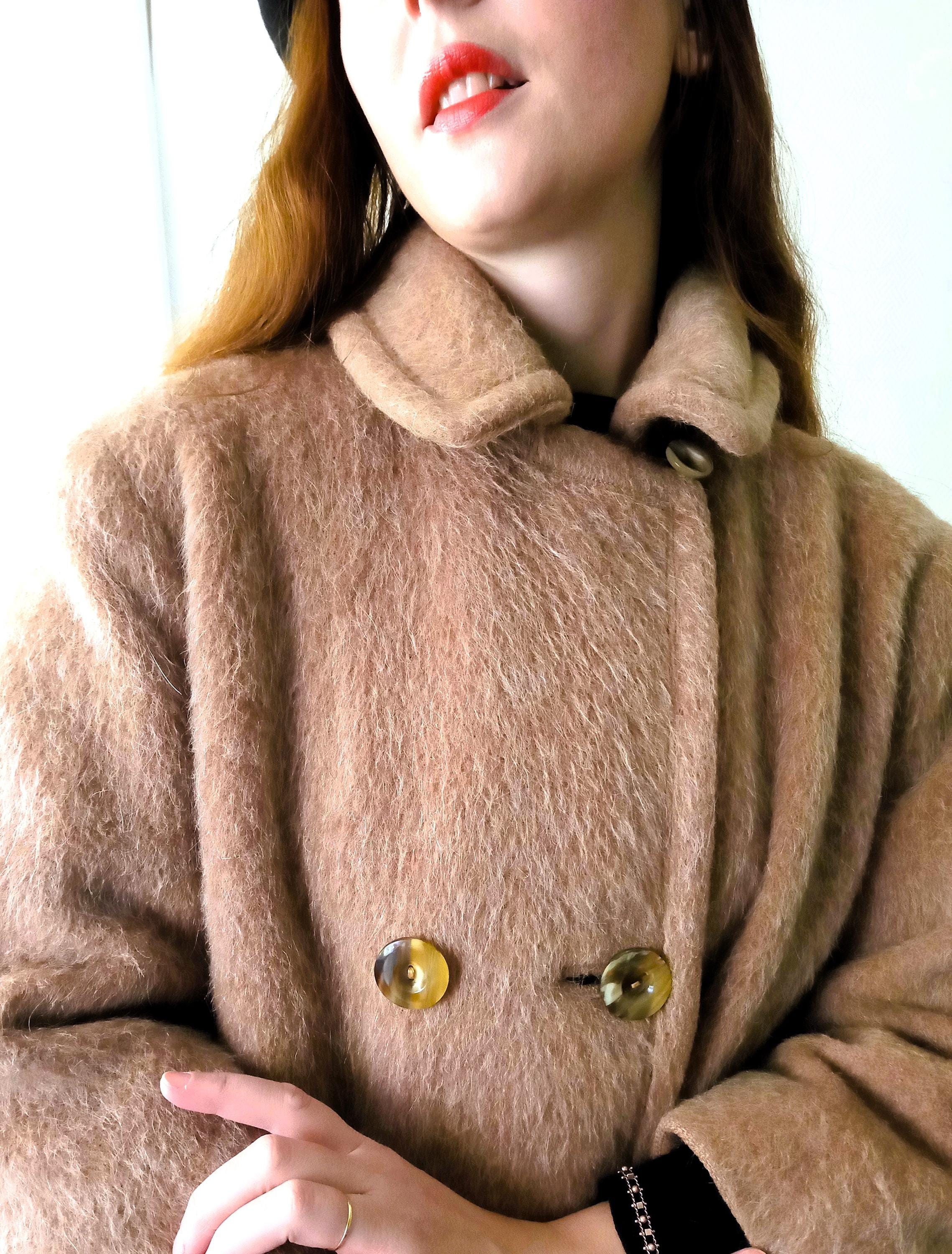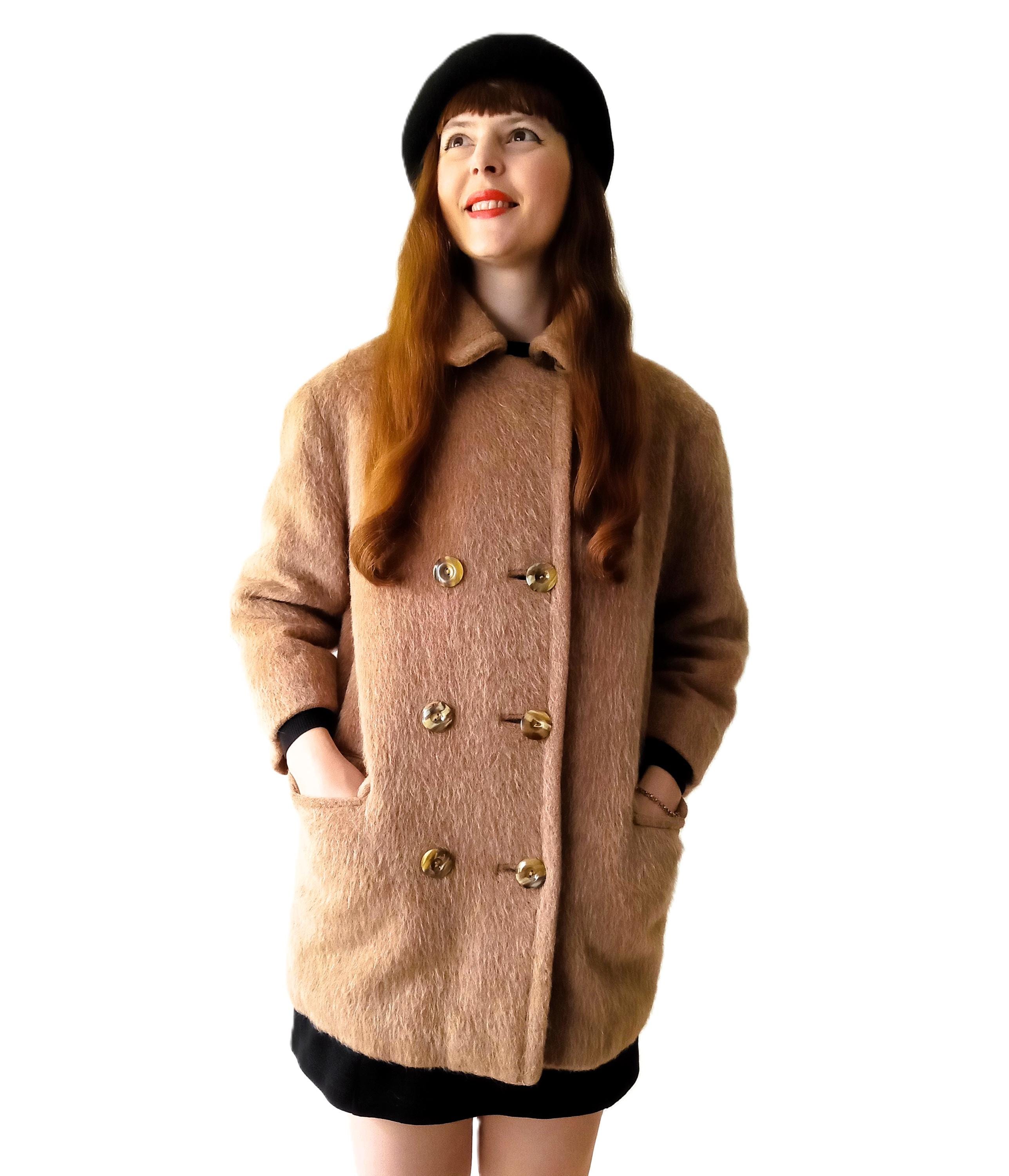 Découvrez ce magnifique manteau coupe caban vintage des années 70 , couleur camel - beige foncé .