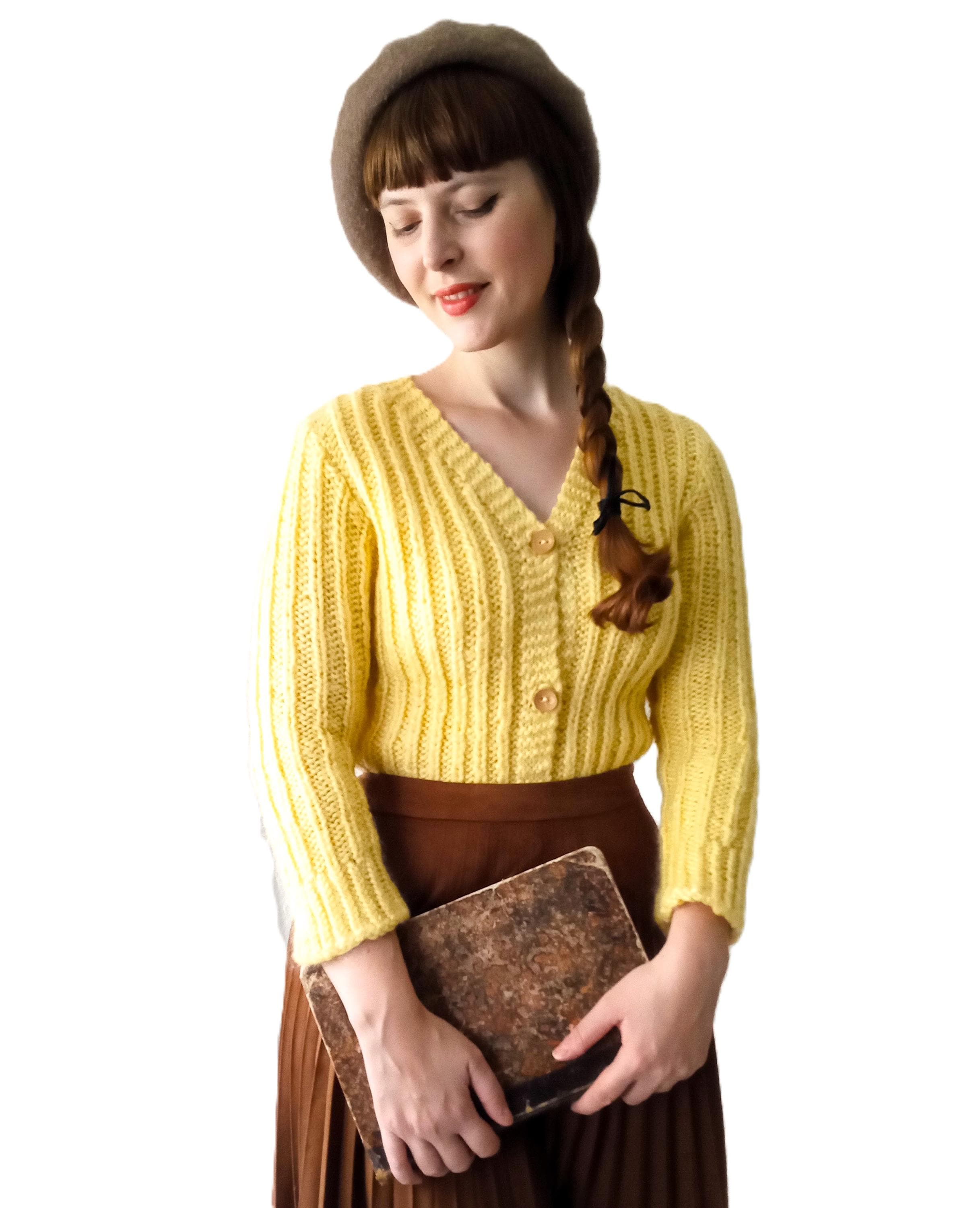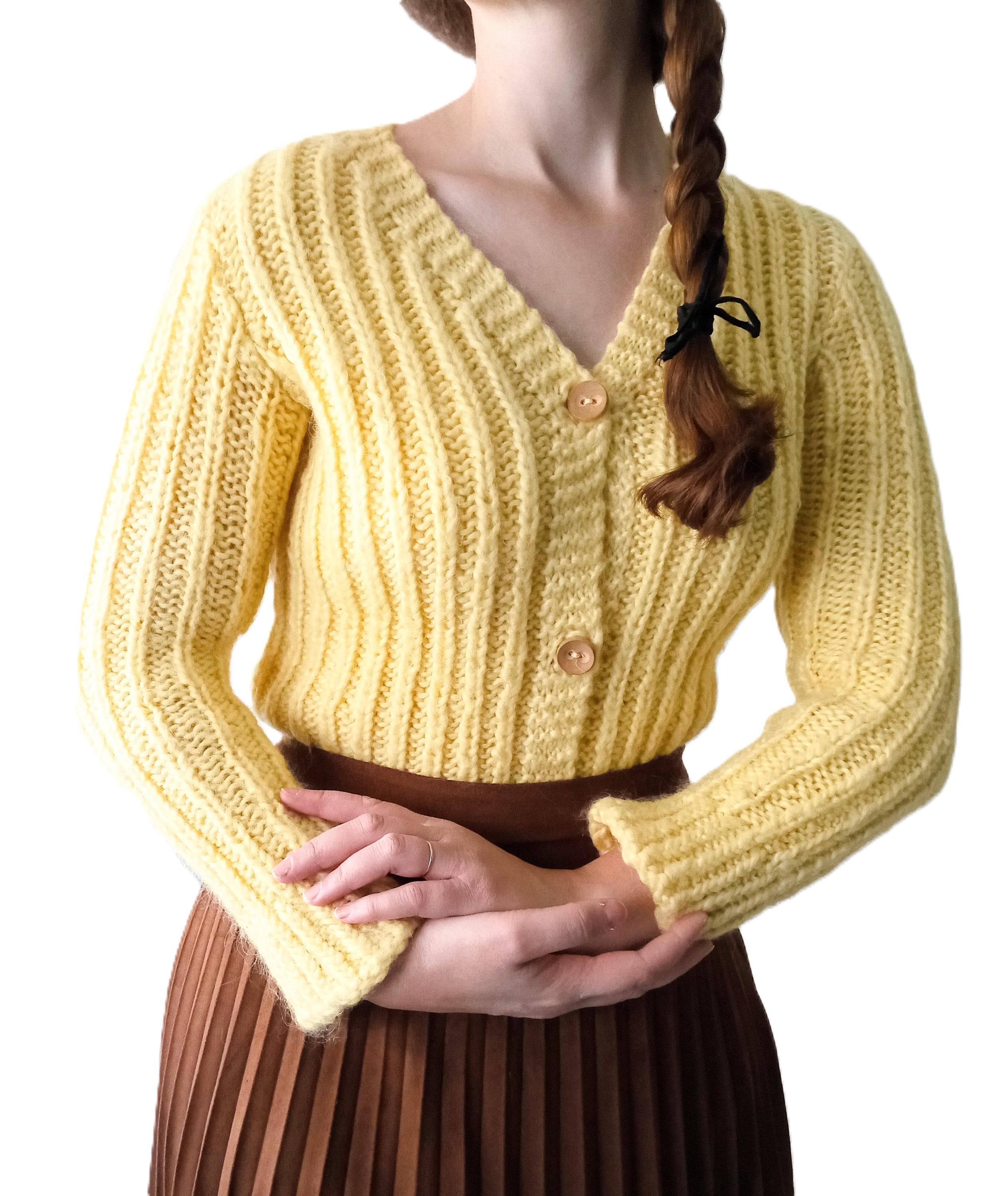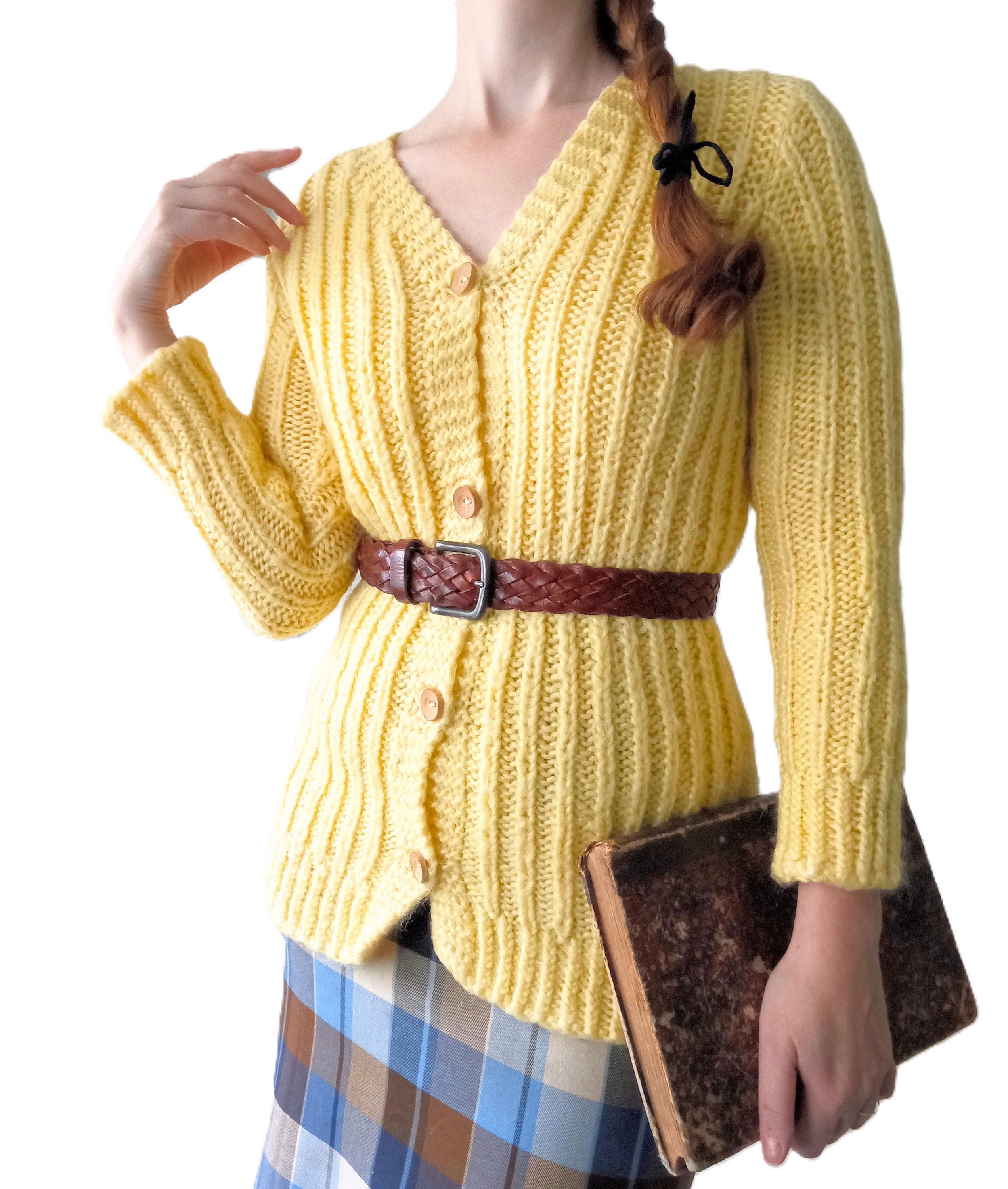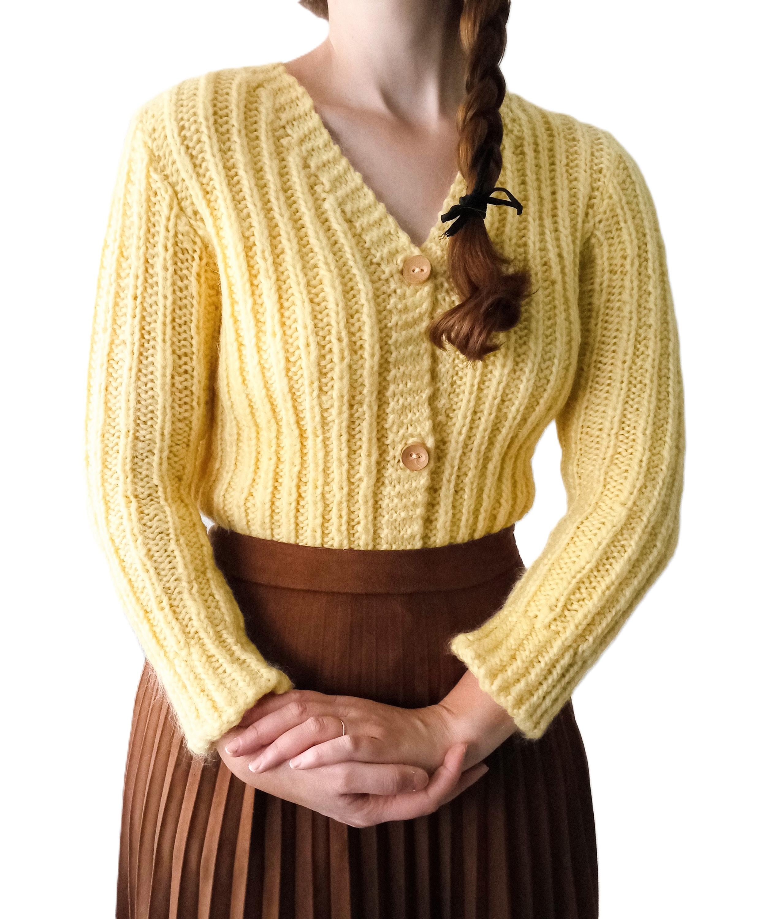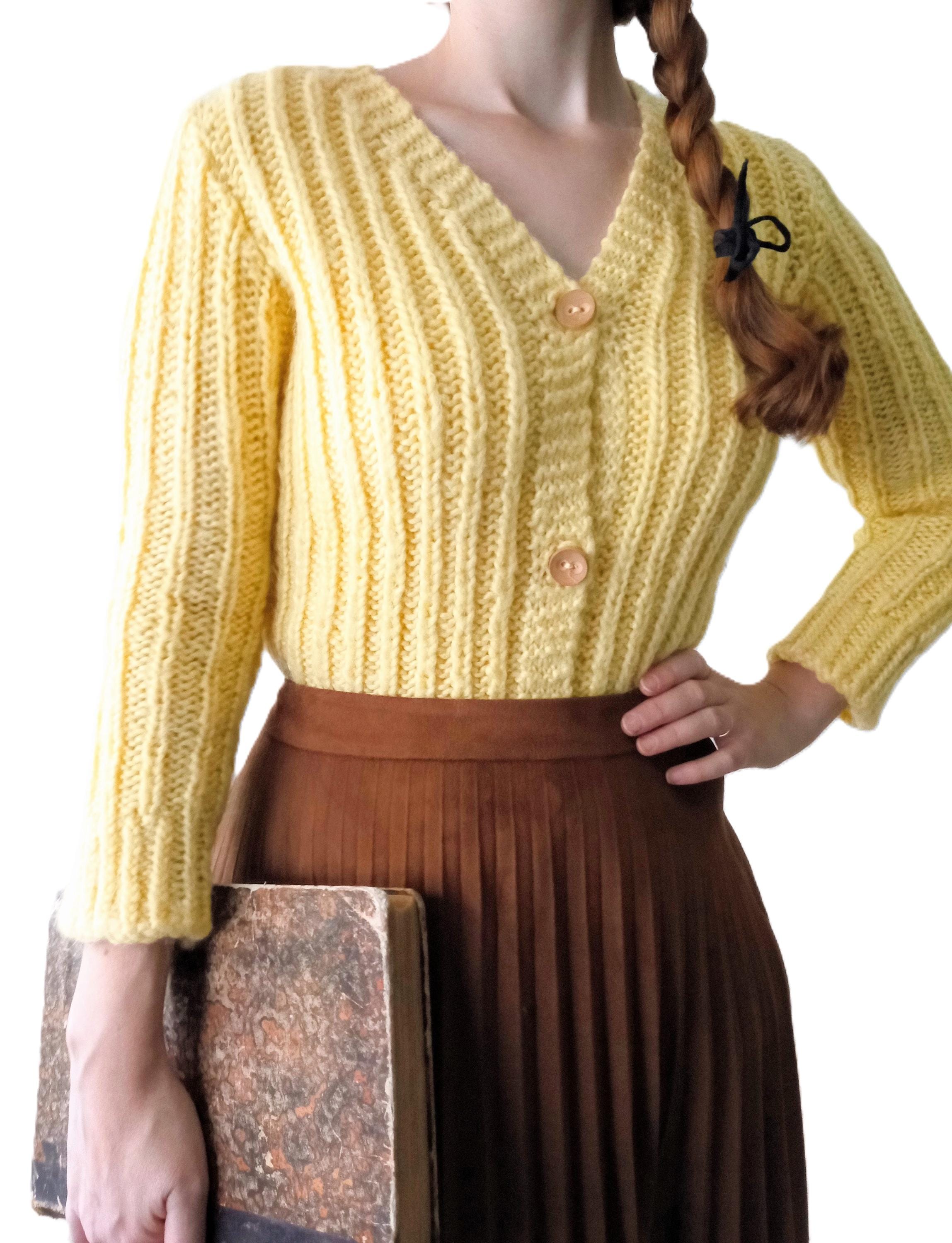 Gilet Jaune Tricoté Main Vintage Années 60/70 - Esprit rétro - Pure Laine - L/XL (40/42)