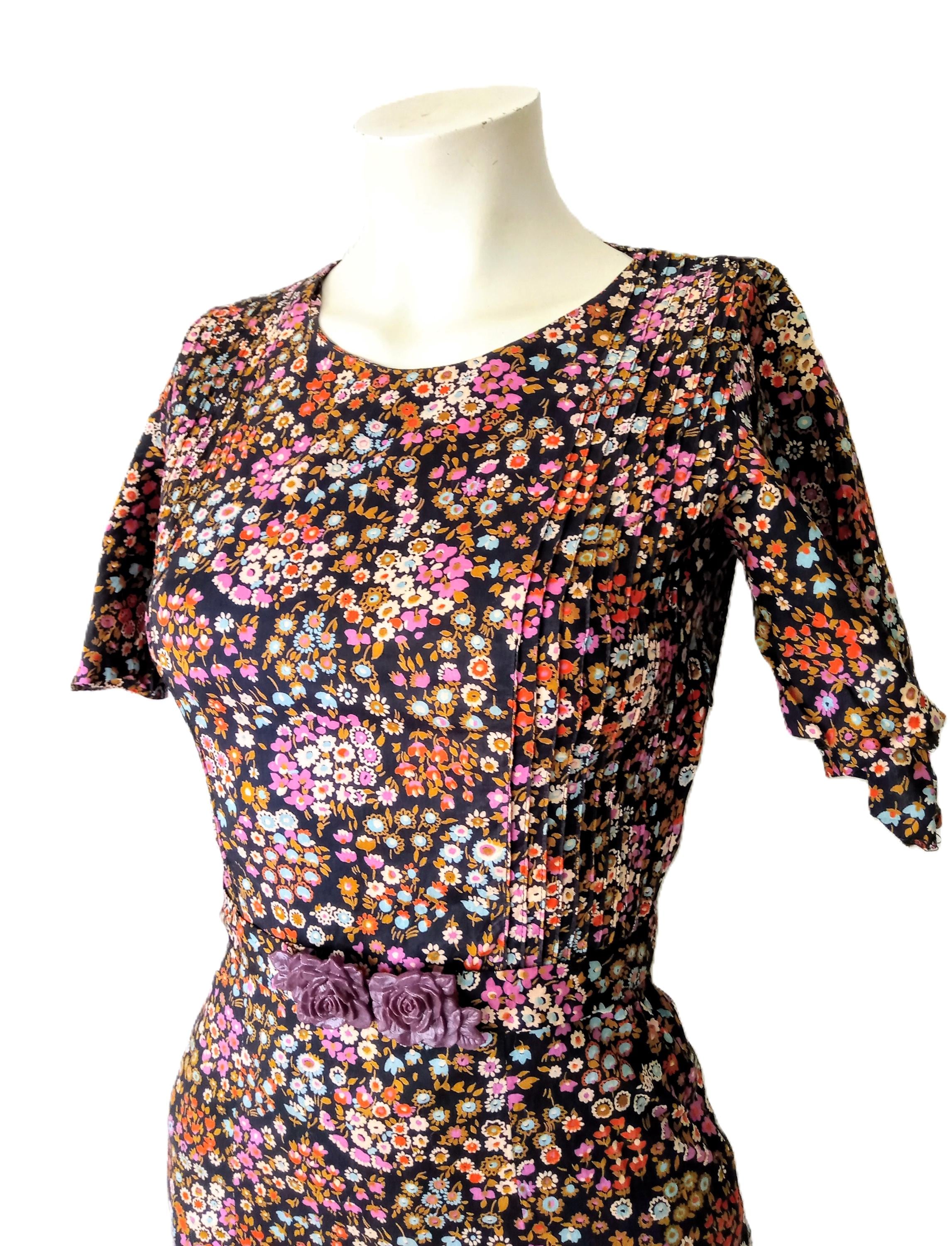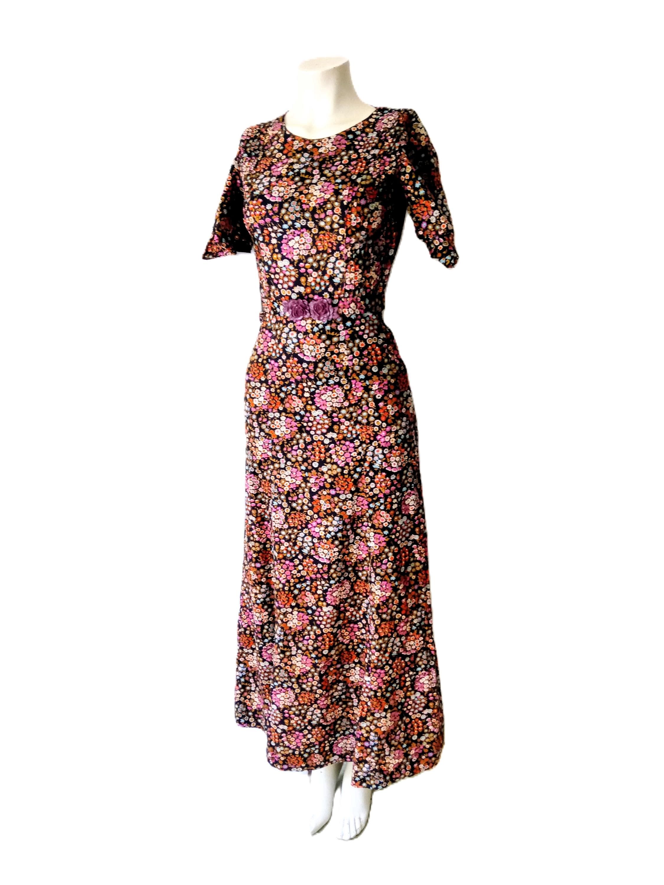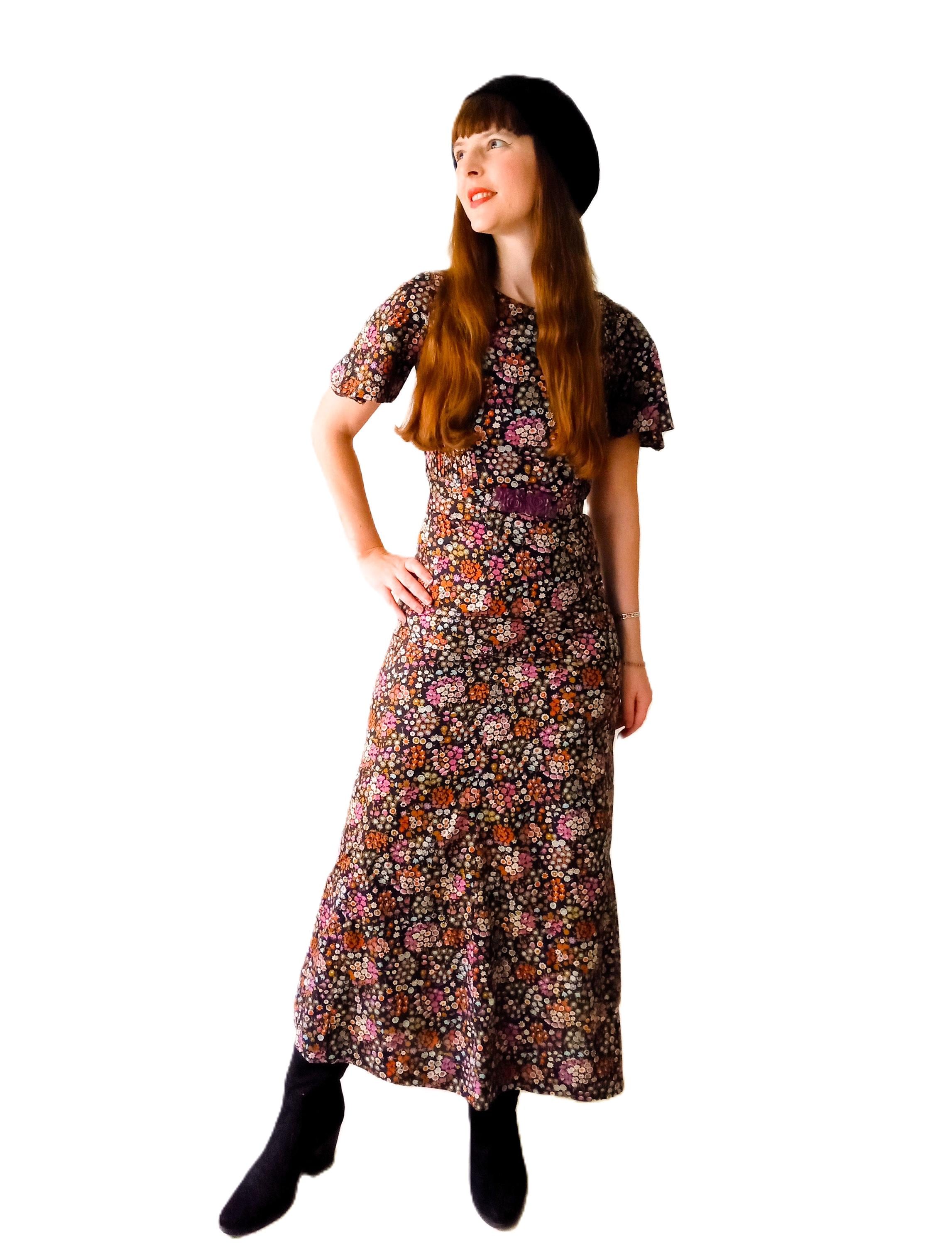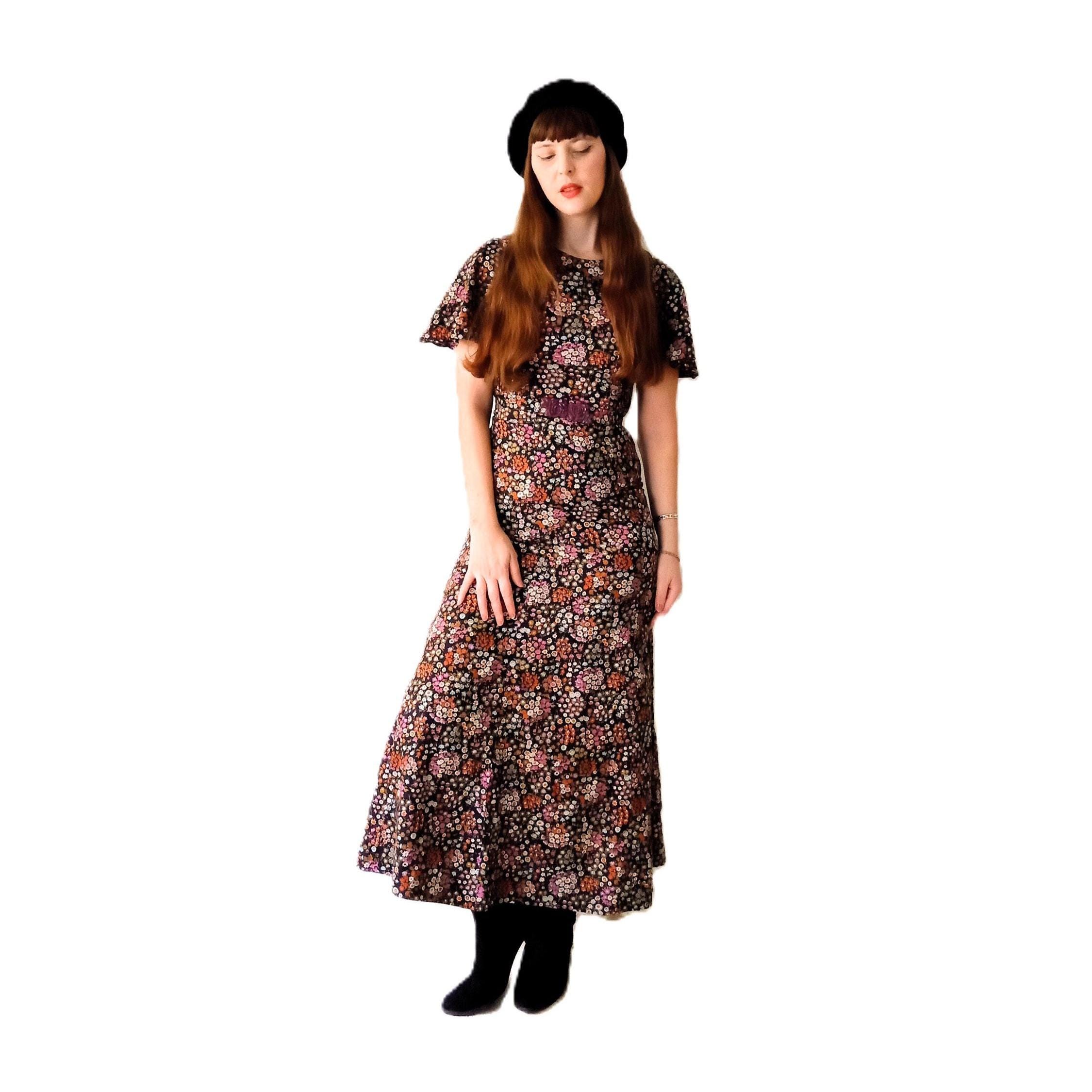 Robe Longue Florale Vintage Années 70 - Violet & Noir - Style Bohème Hippie - XS/S (34/36)
