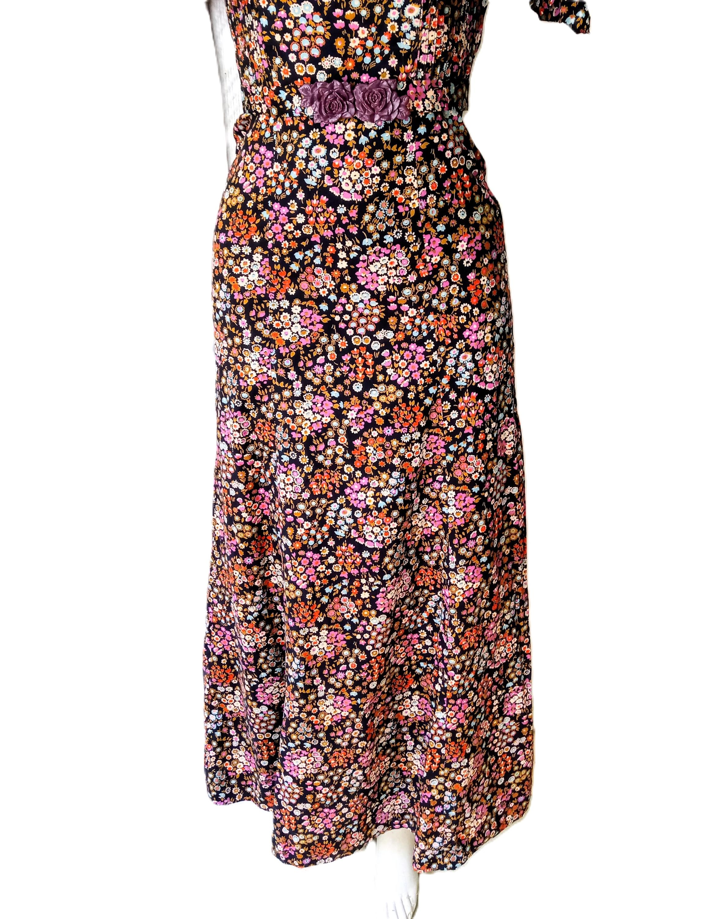 Discover this magnificent long dress from the 70s, perfect for a bohemian retro and hippie chic look. Designed with floral patterns in multicolored on a black background.