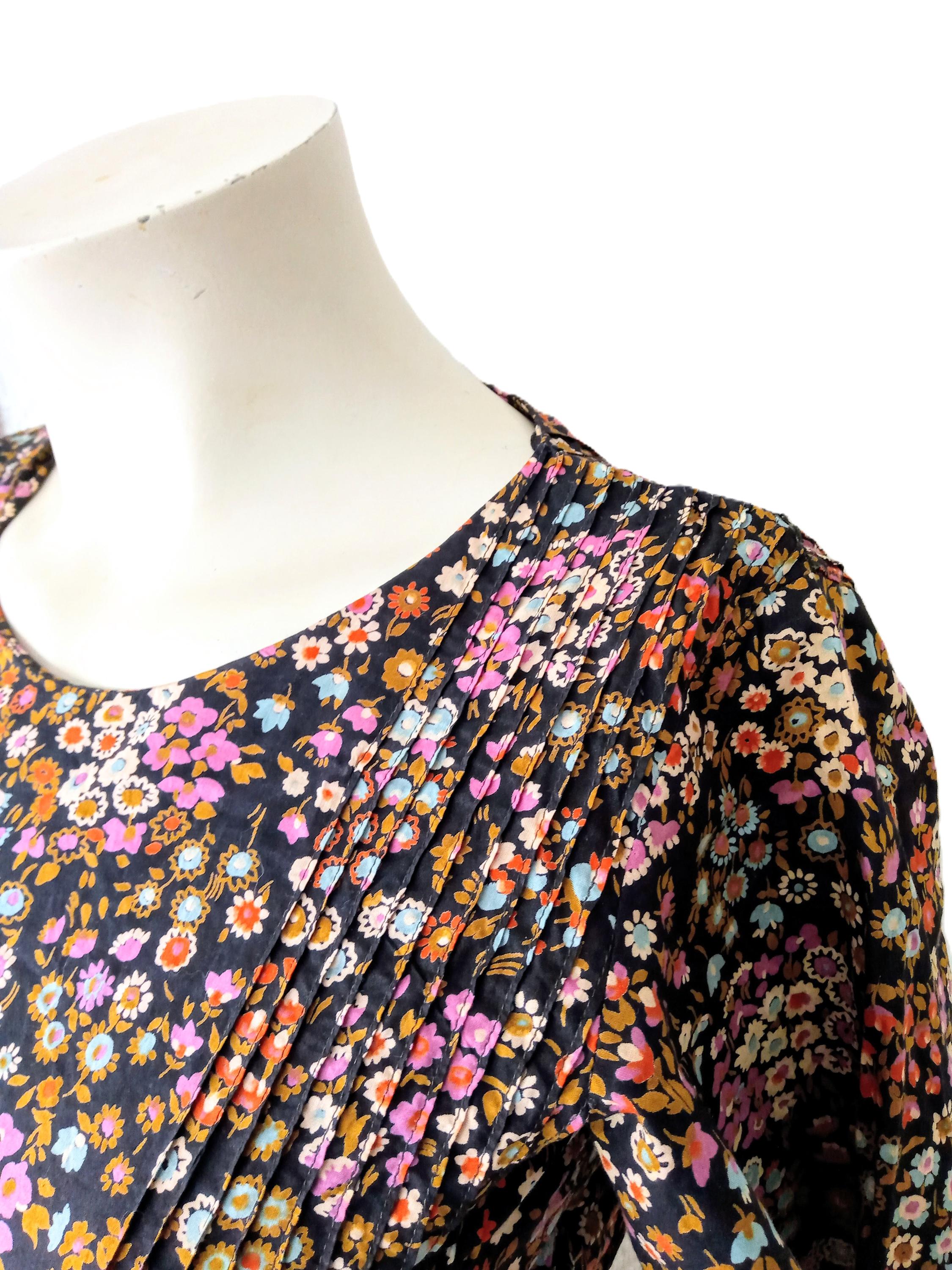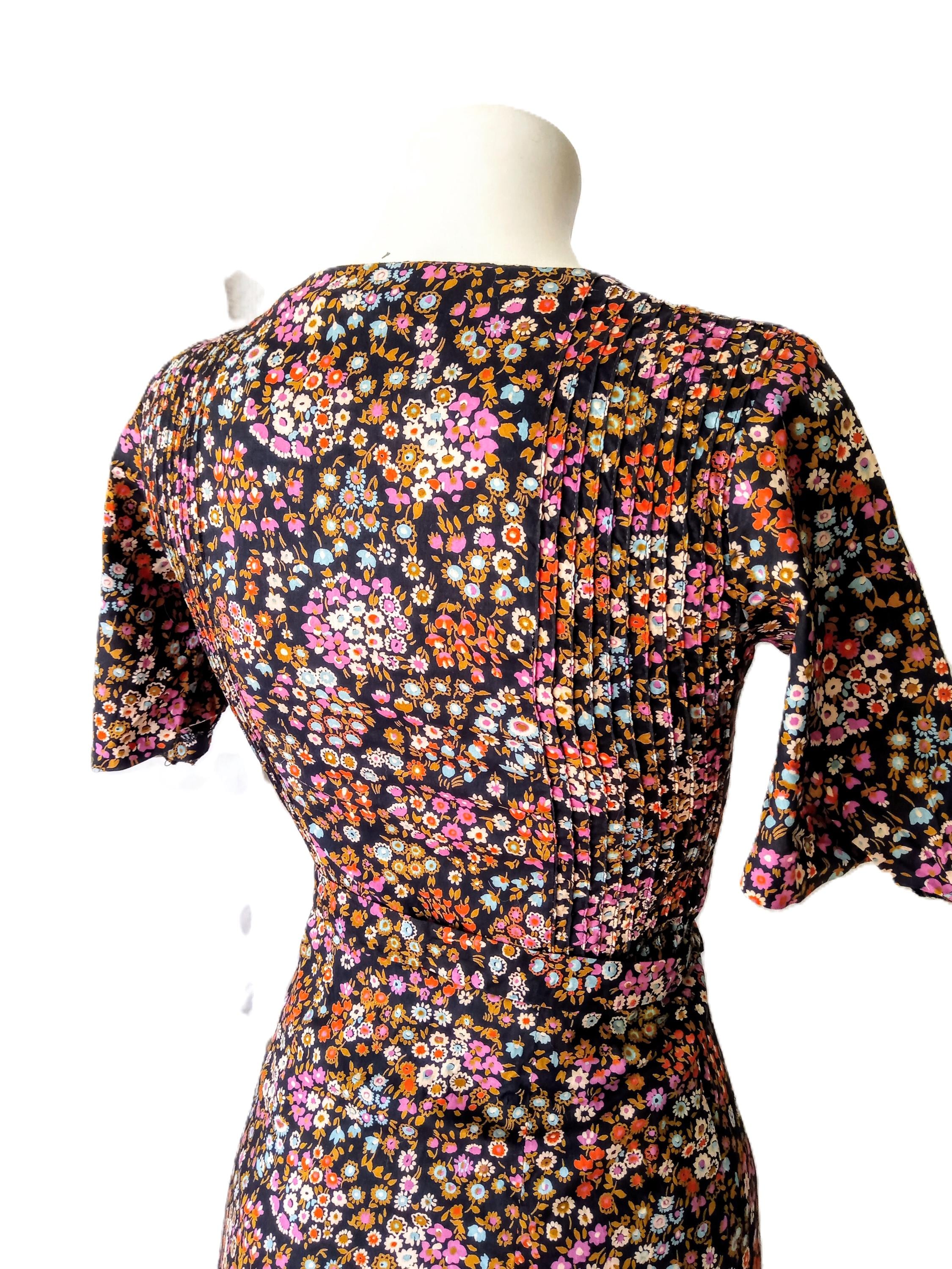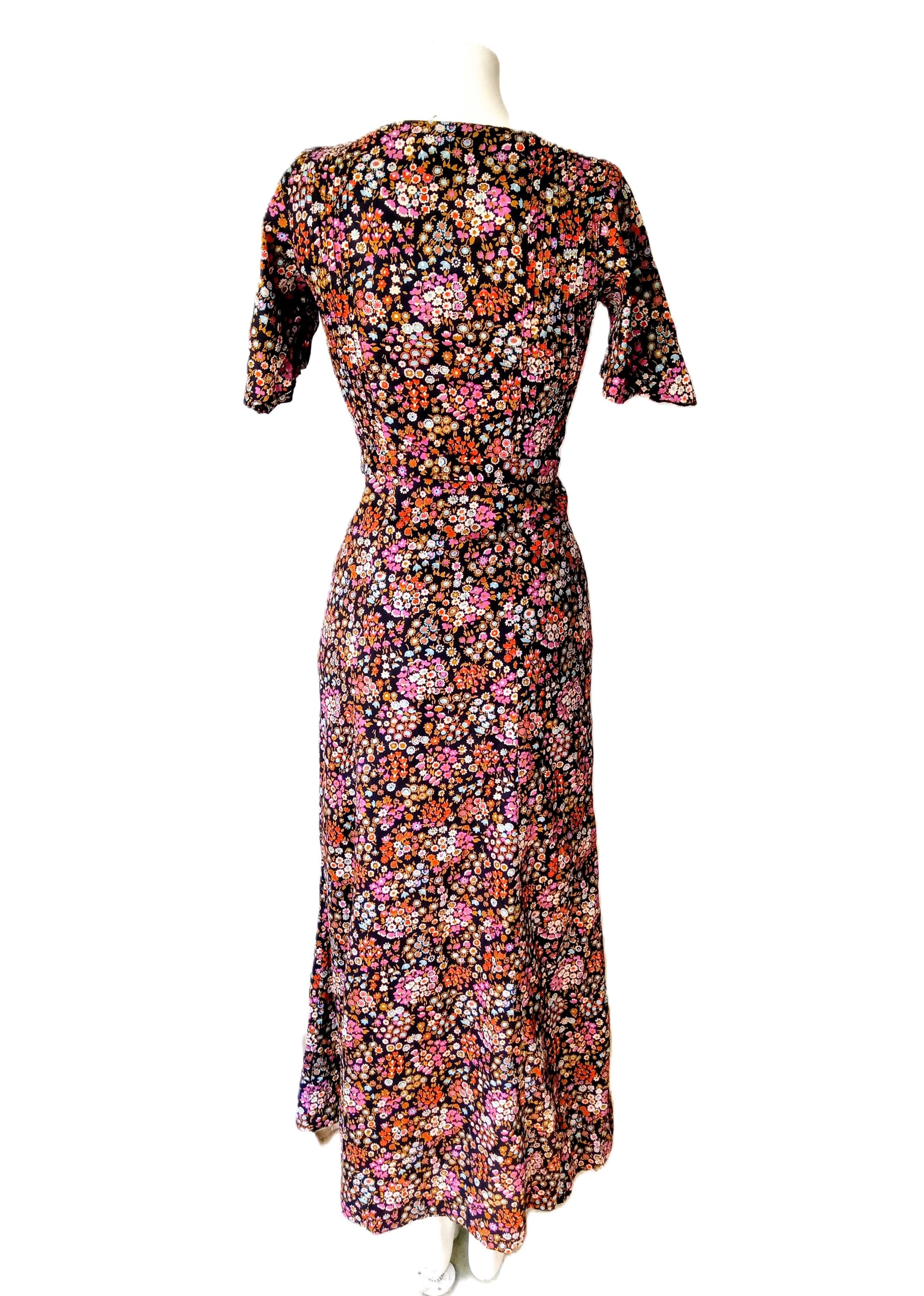 Découvrez cette magnifique robe longue des années 70, parfaite pour un look rétro bohème et hippy chic. Conçue avec des motifs floraux dans multicolores sur fond noir.