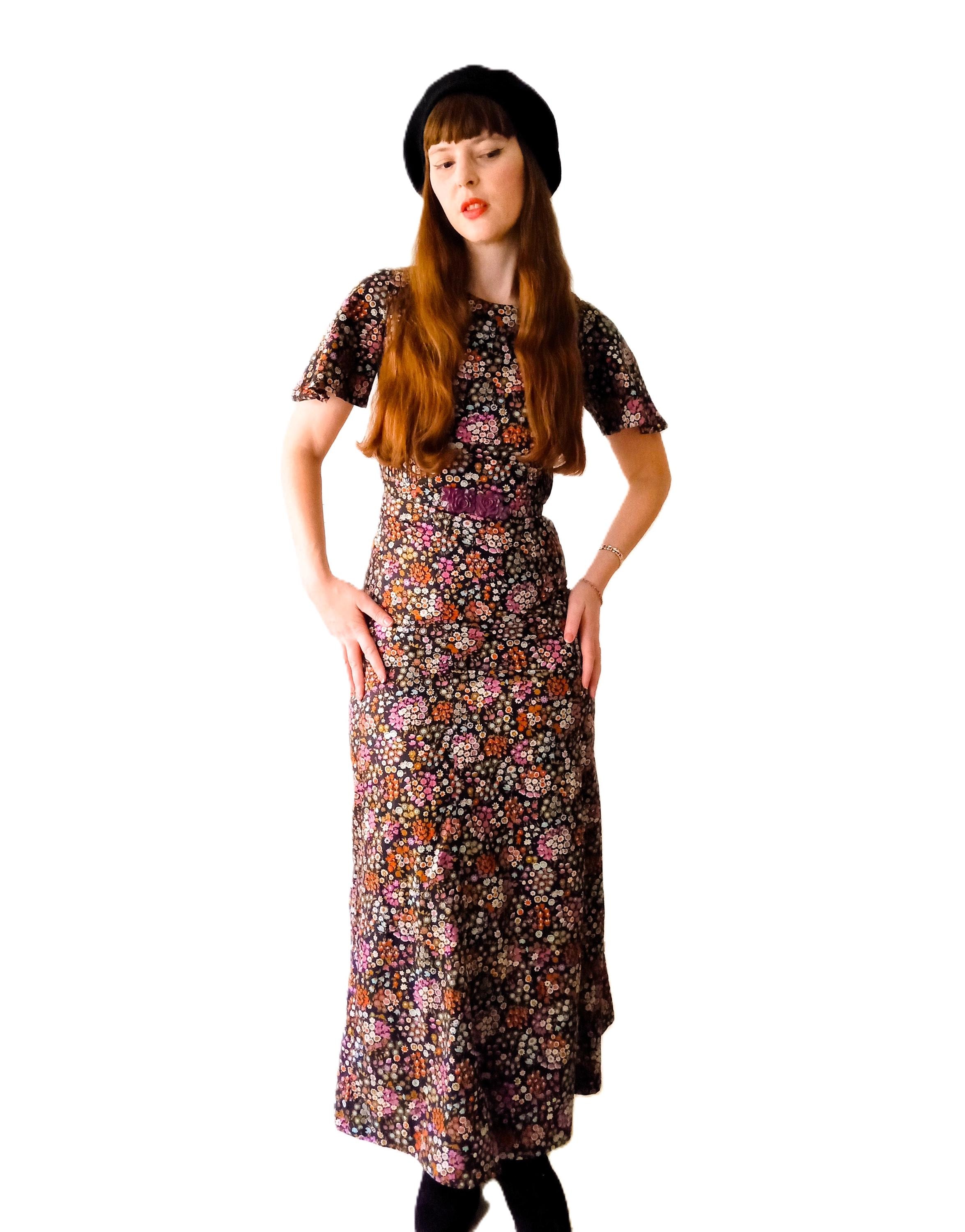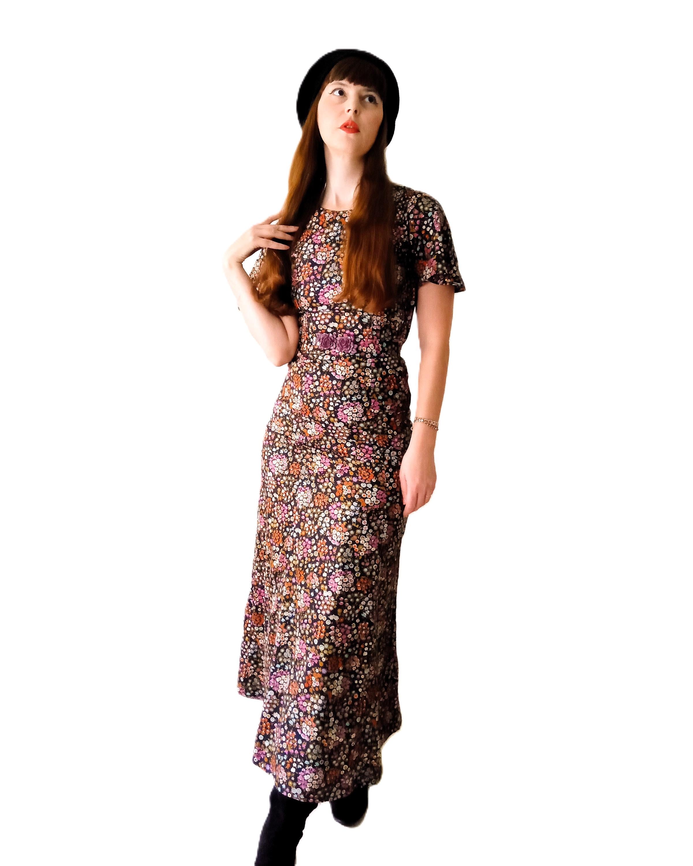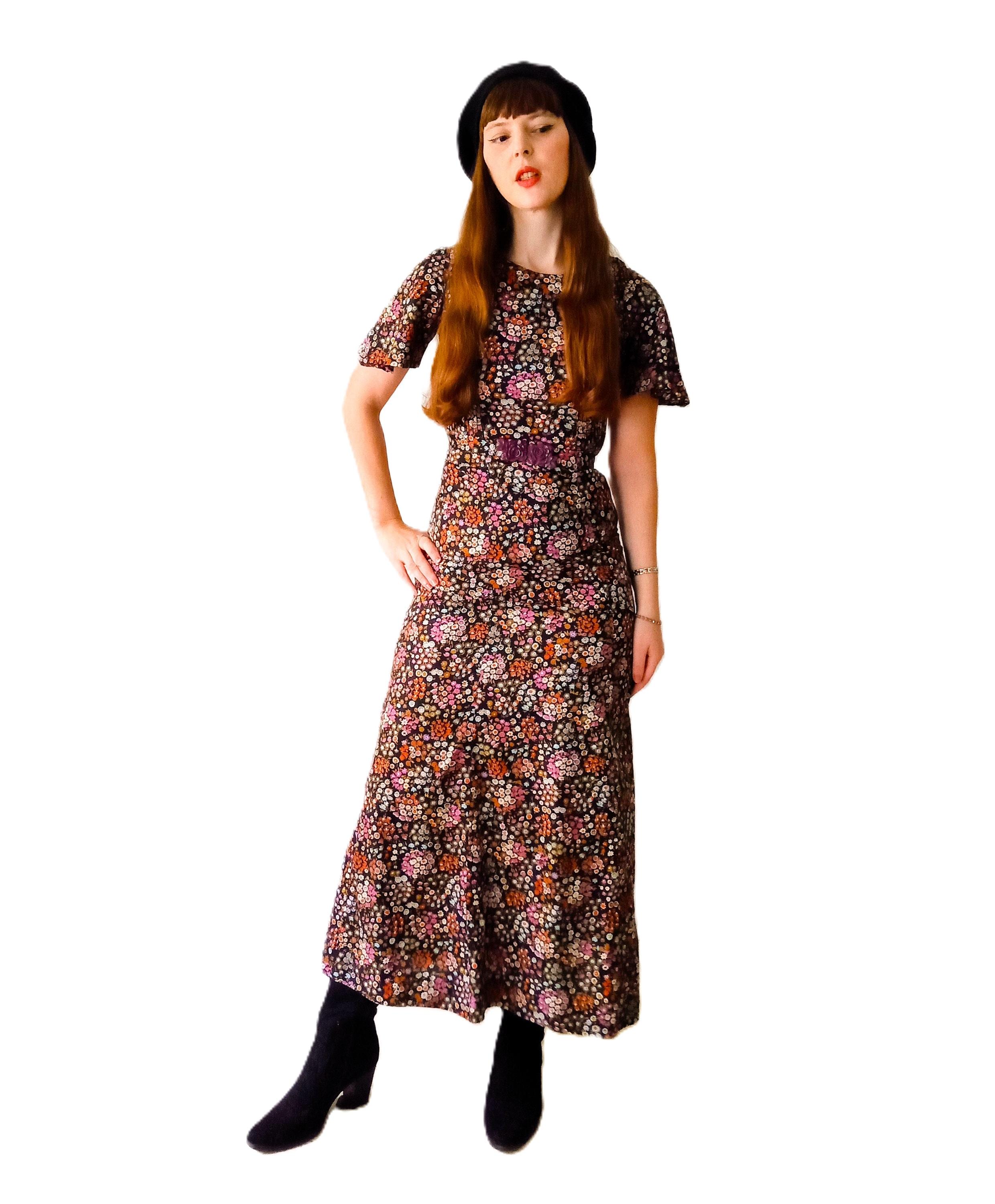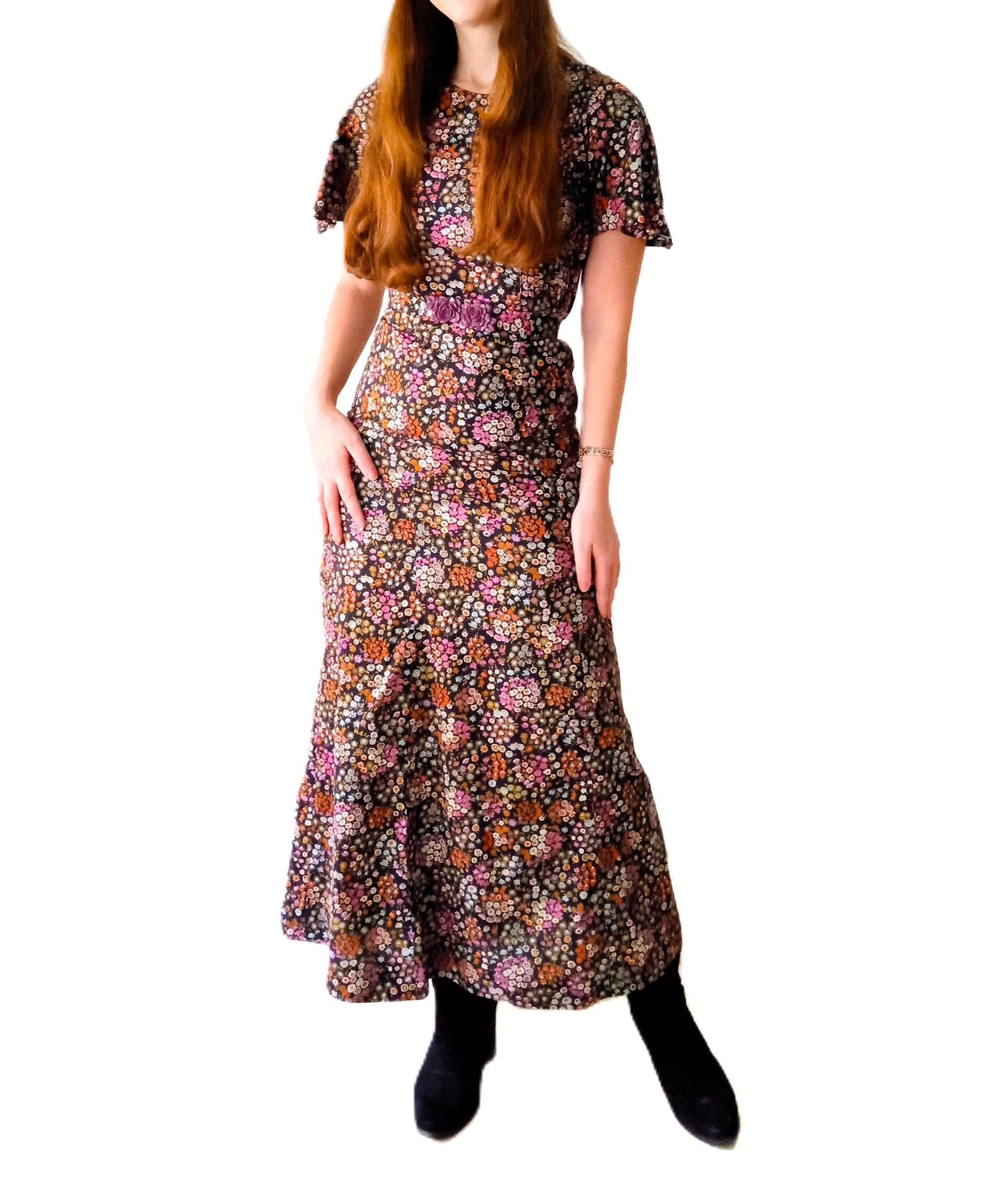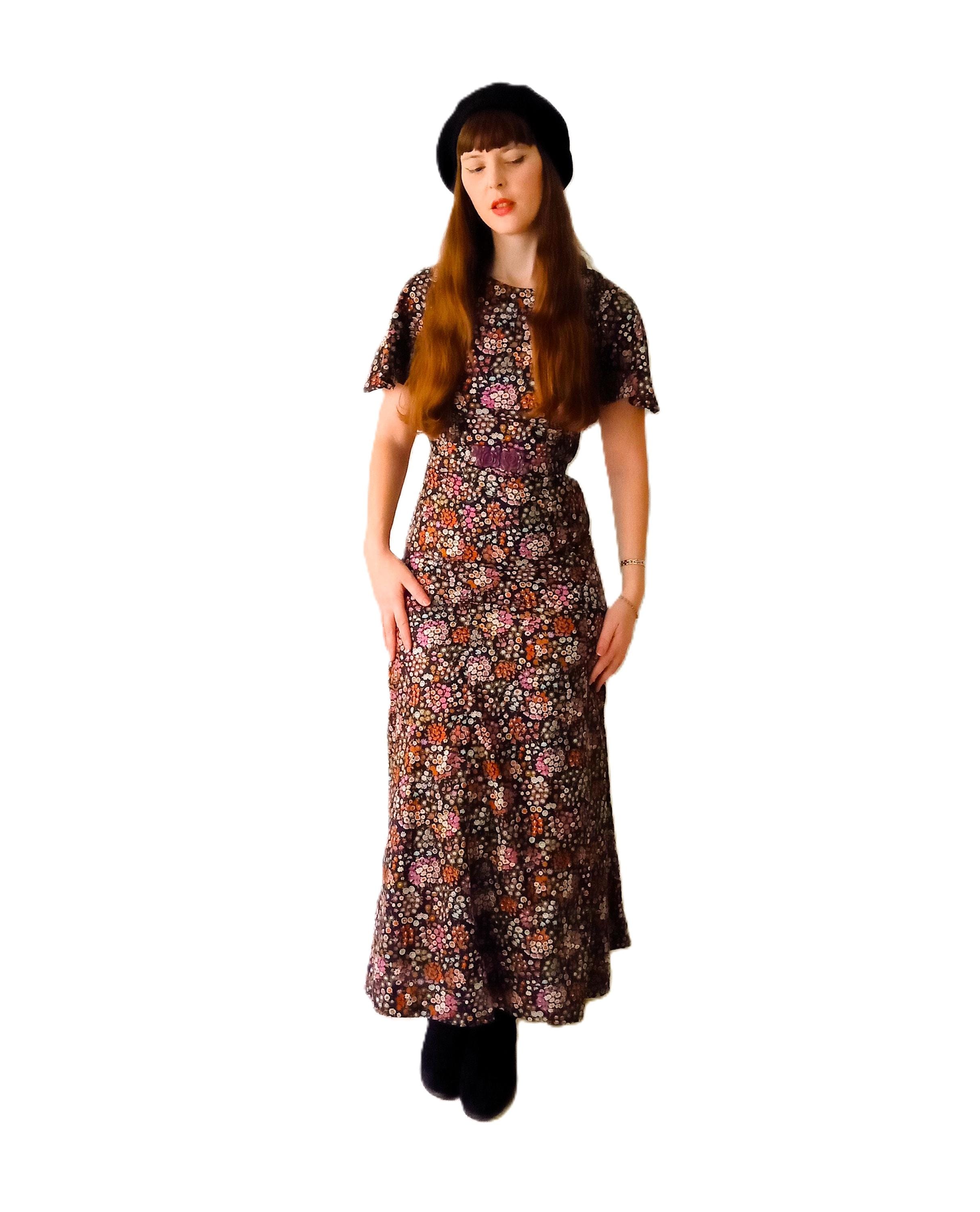 🇬🇧Vintage Floral Long Dress 70s - Purple & Black - Bohemian Hippie Style - XS/S (34/36)