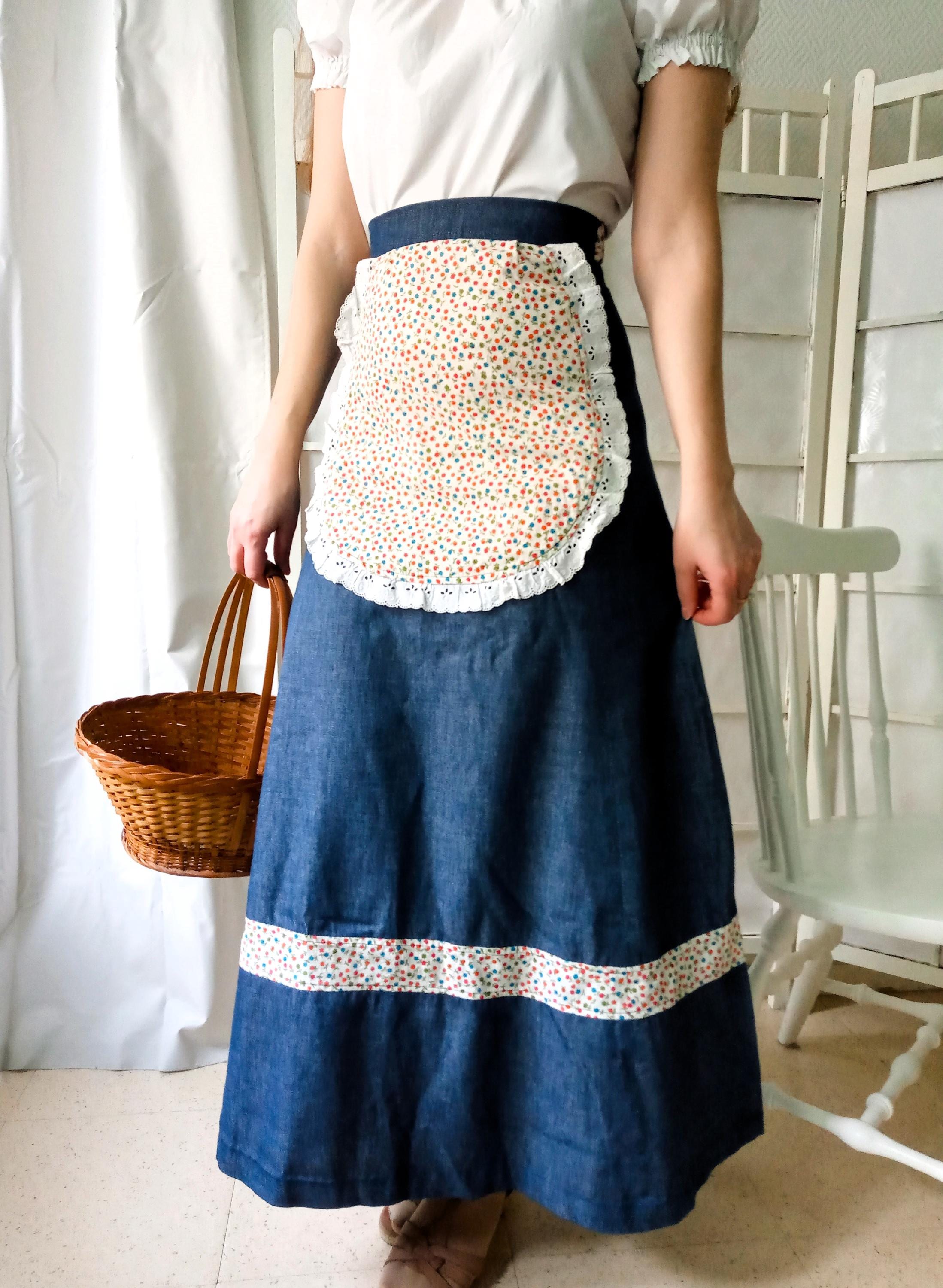 Découvrez cette magnifique jupe longue en jean vintage des années 70, parfaite pour un look bohème esprit cottage.