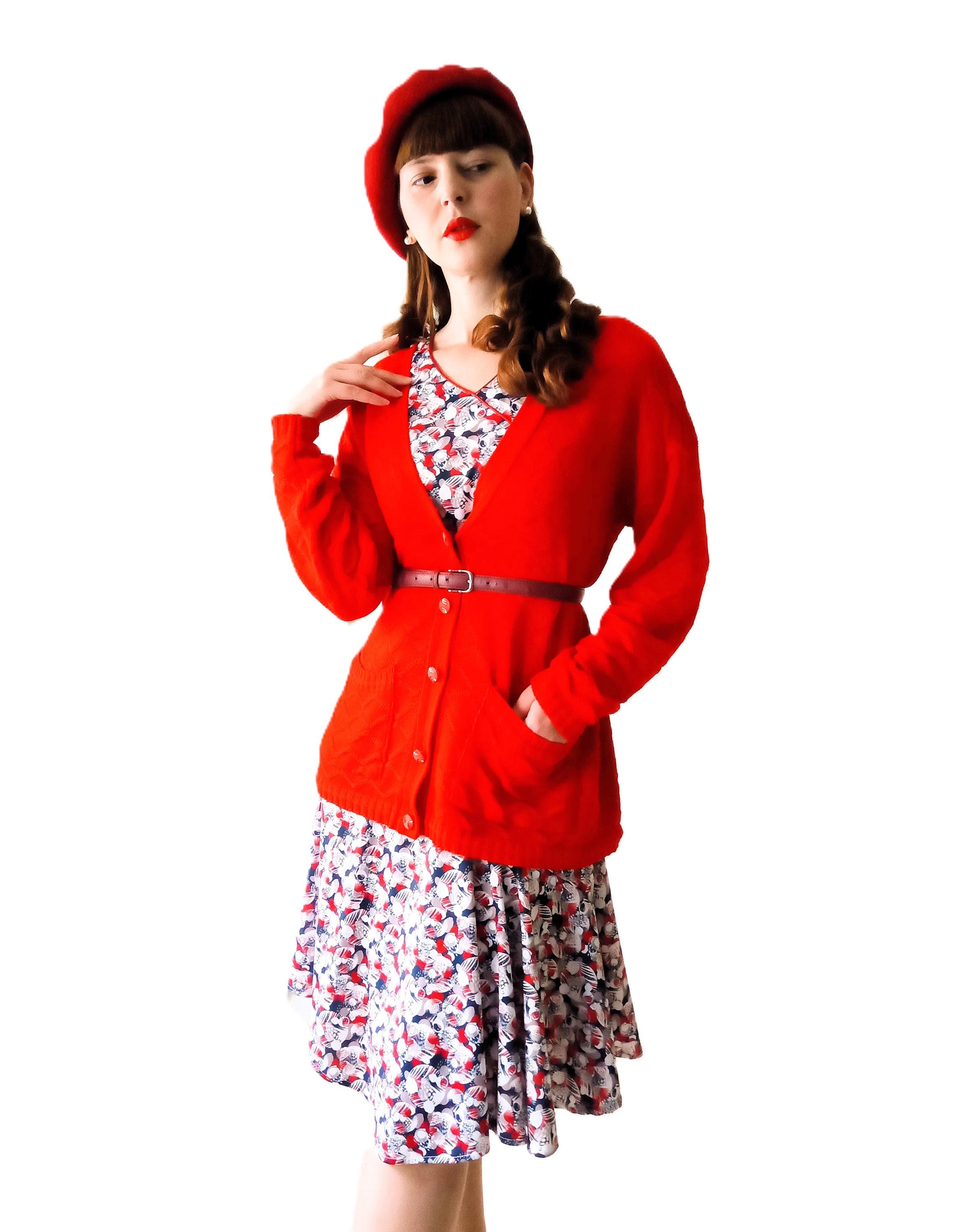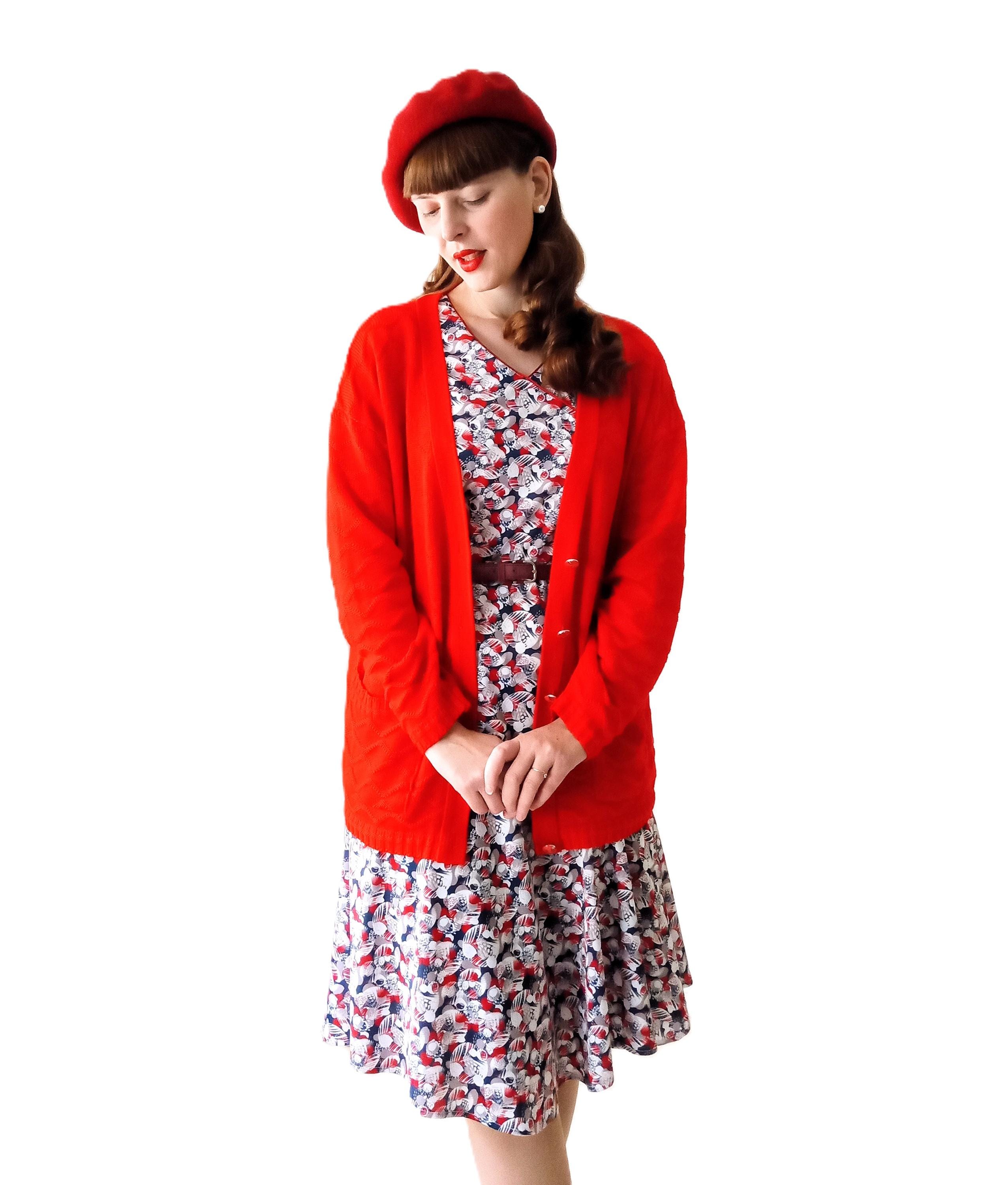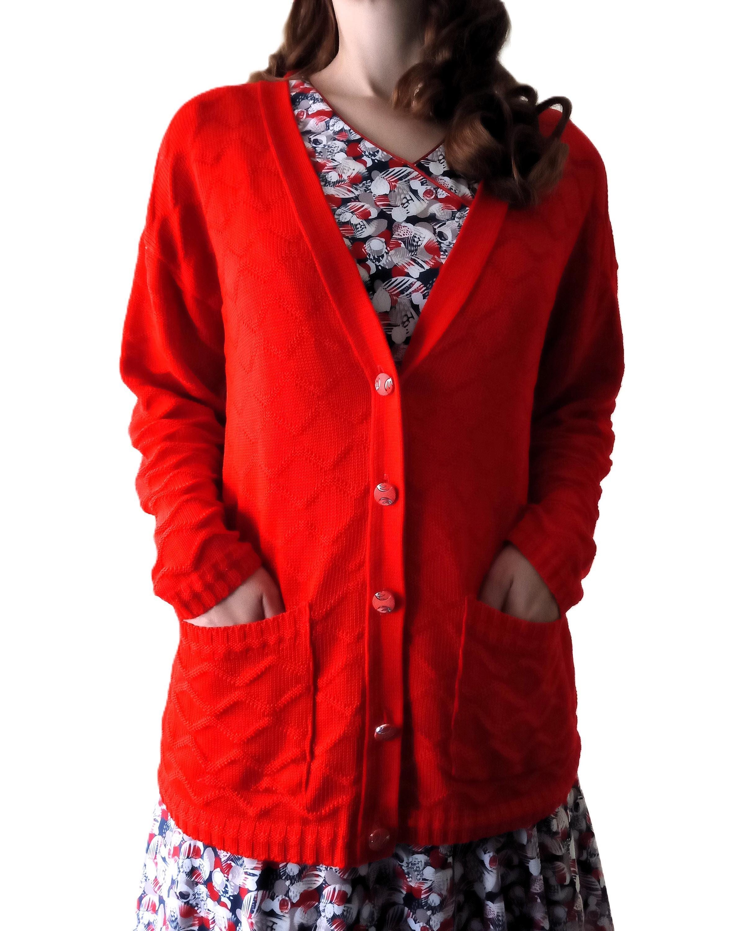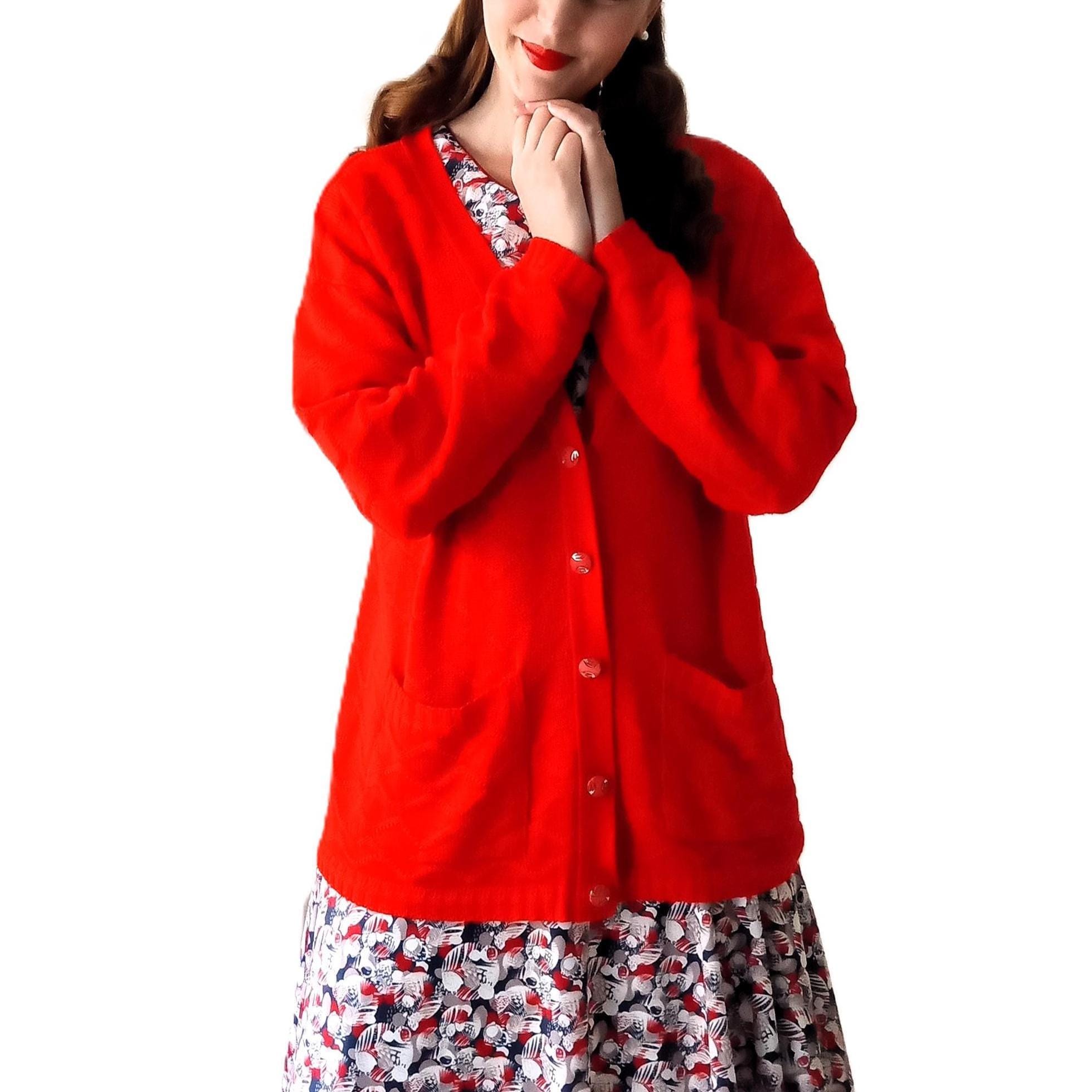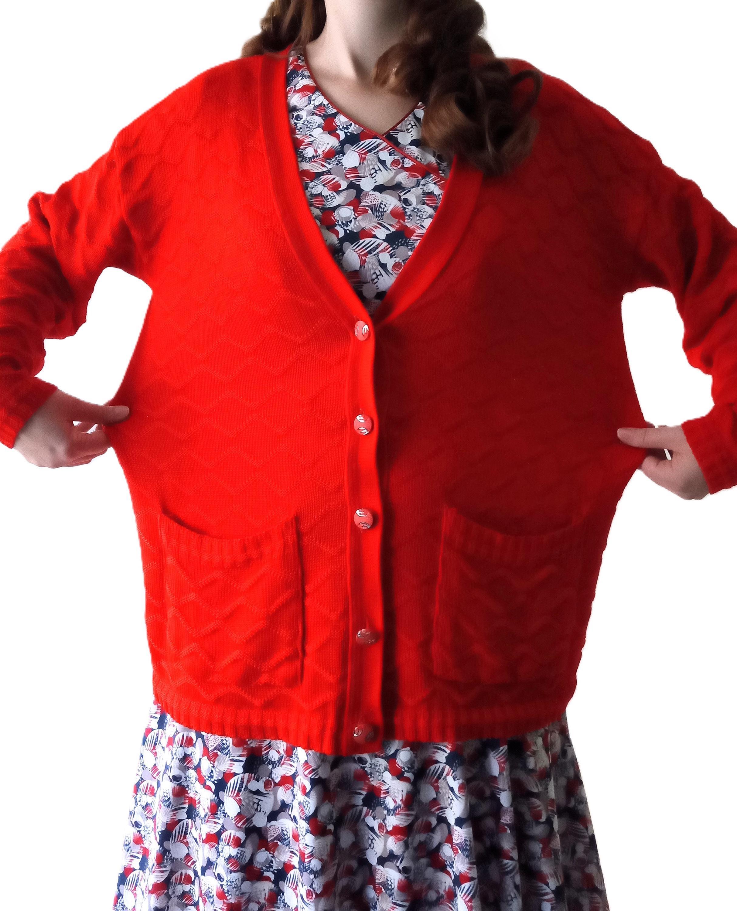 🇬🇧Vintage Large size Red Cardigan - Made in France - 80s - Jewelry Buttons - Classic & Timeless