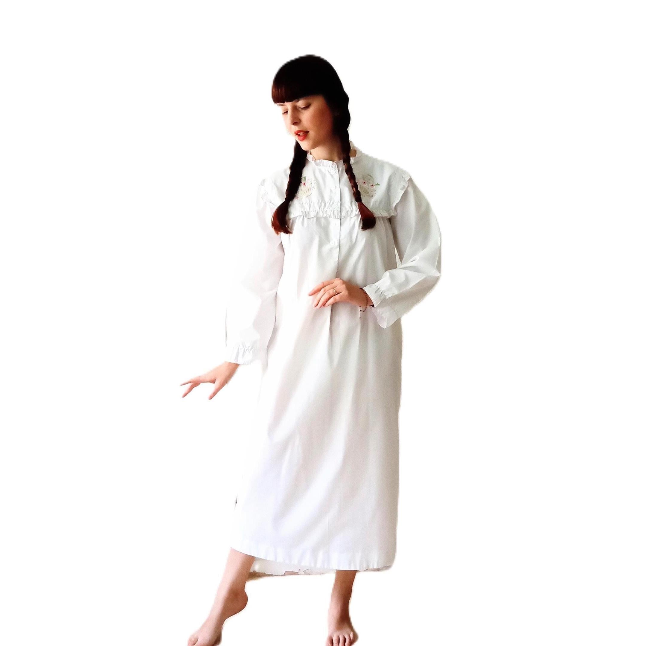 Longue Chemise de Nuit Brodée Vintage - Années 70 - Esprit Rétro Cottage et Victorien - M/L (38/40)