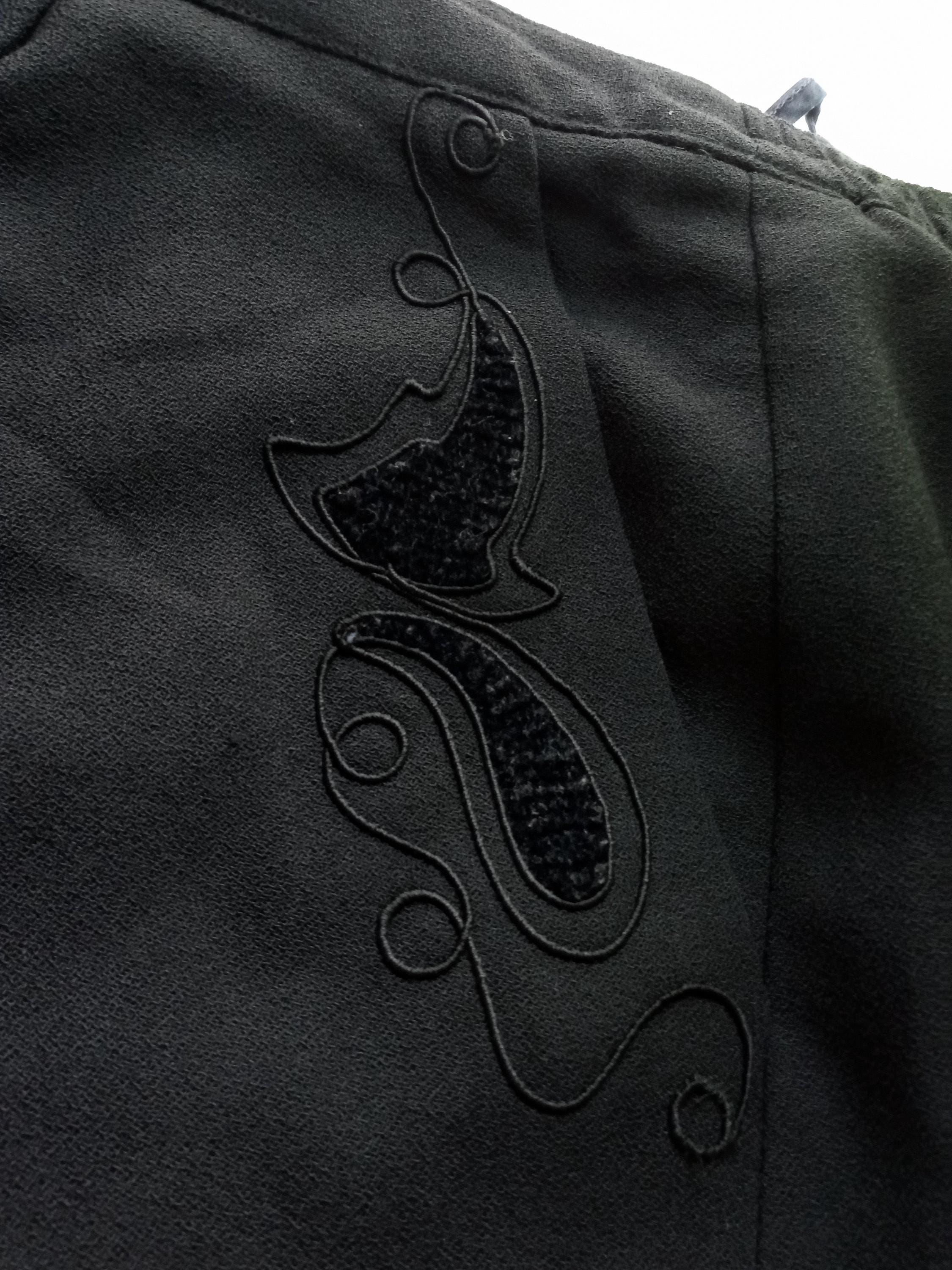 Side pockets with floral and paisley embroidery embellished with black velvet reminiscent of the 1940s style
