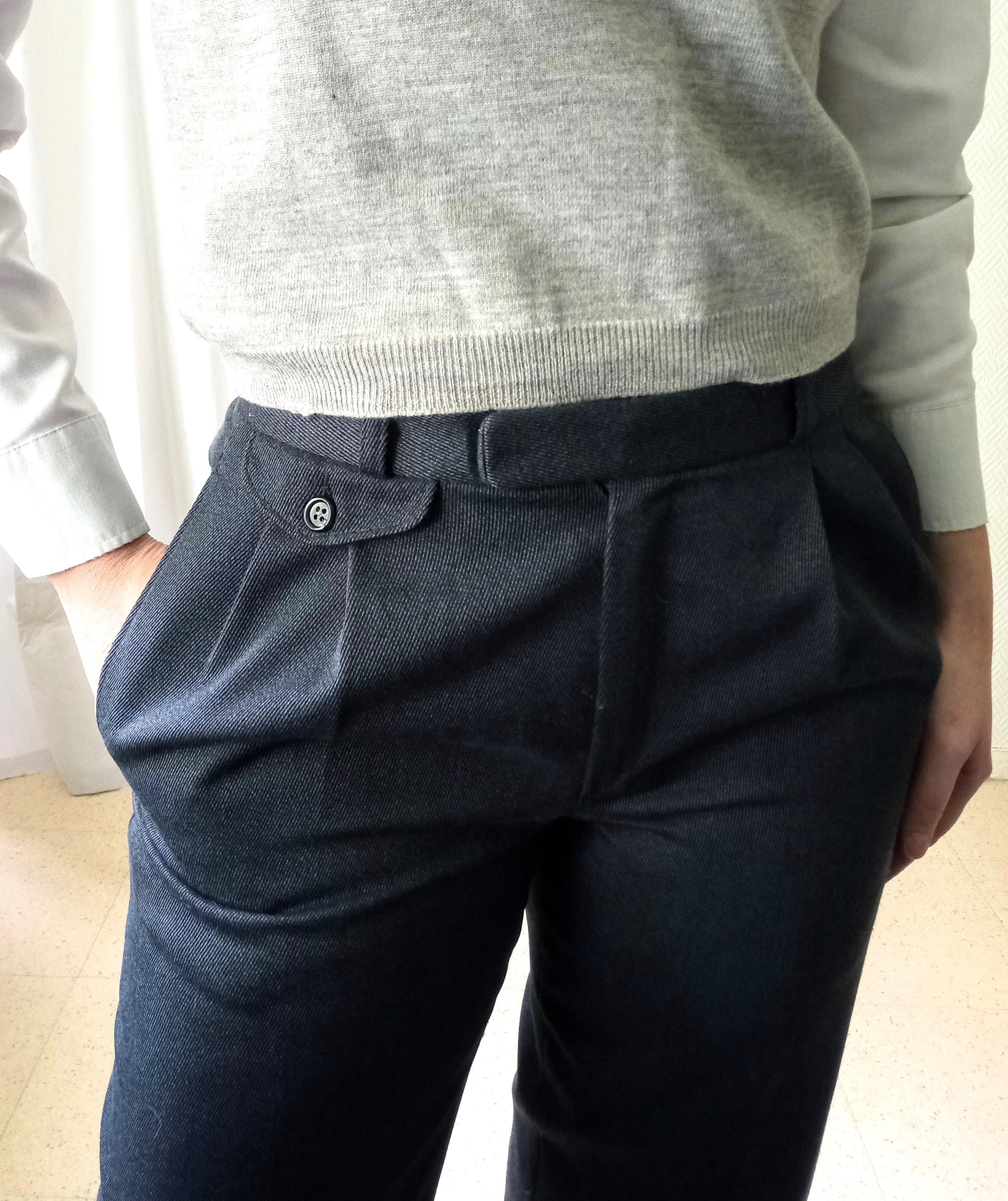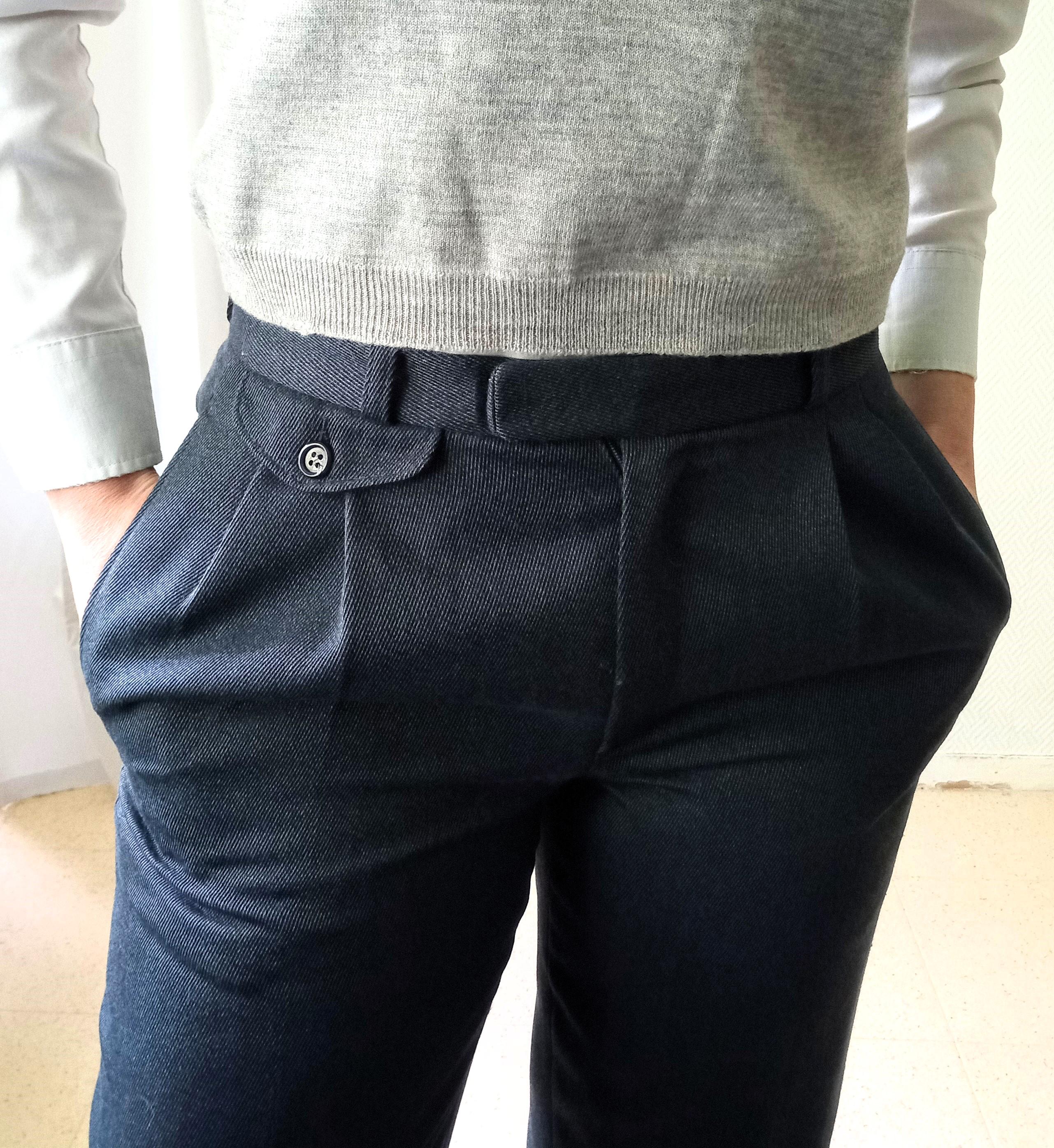 2 poches latérales, 1 poche au dos, 1 fausse poche à la taille à droite