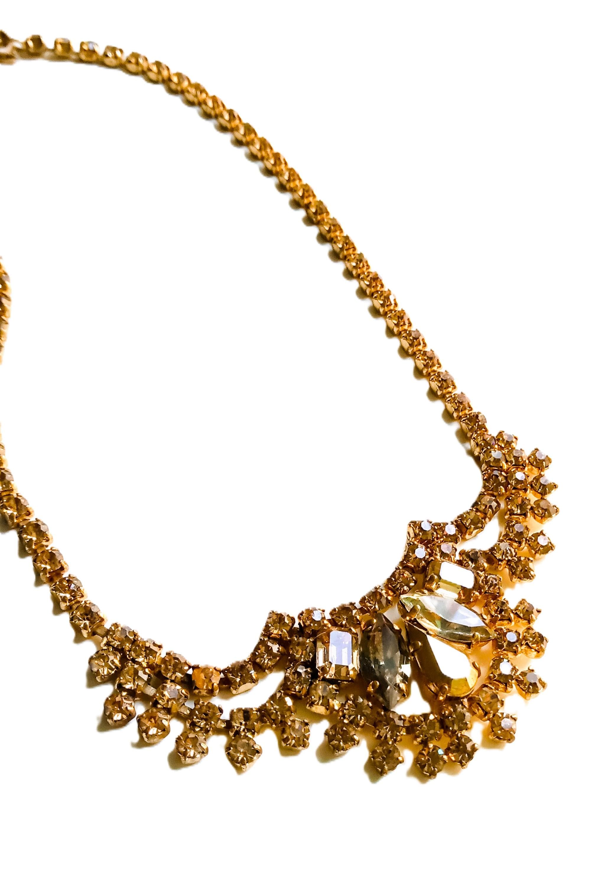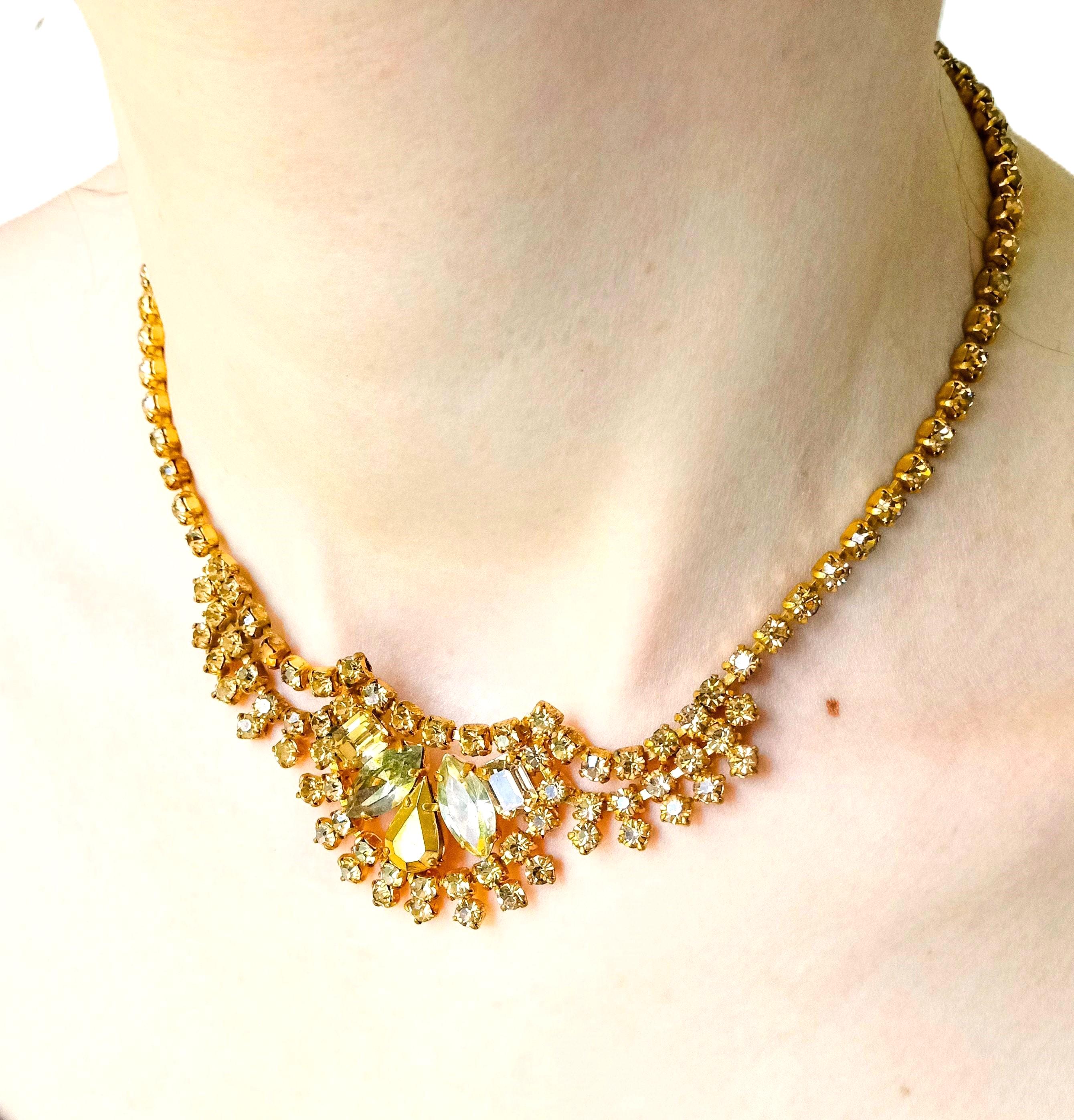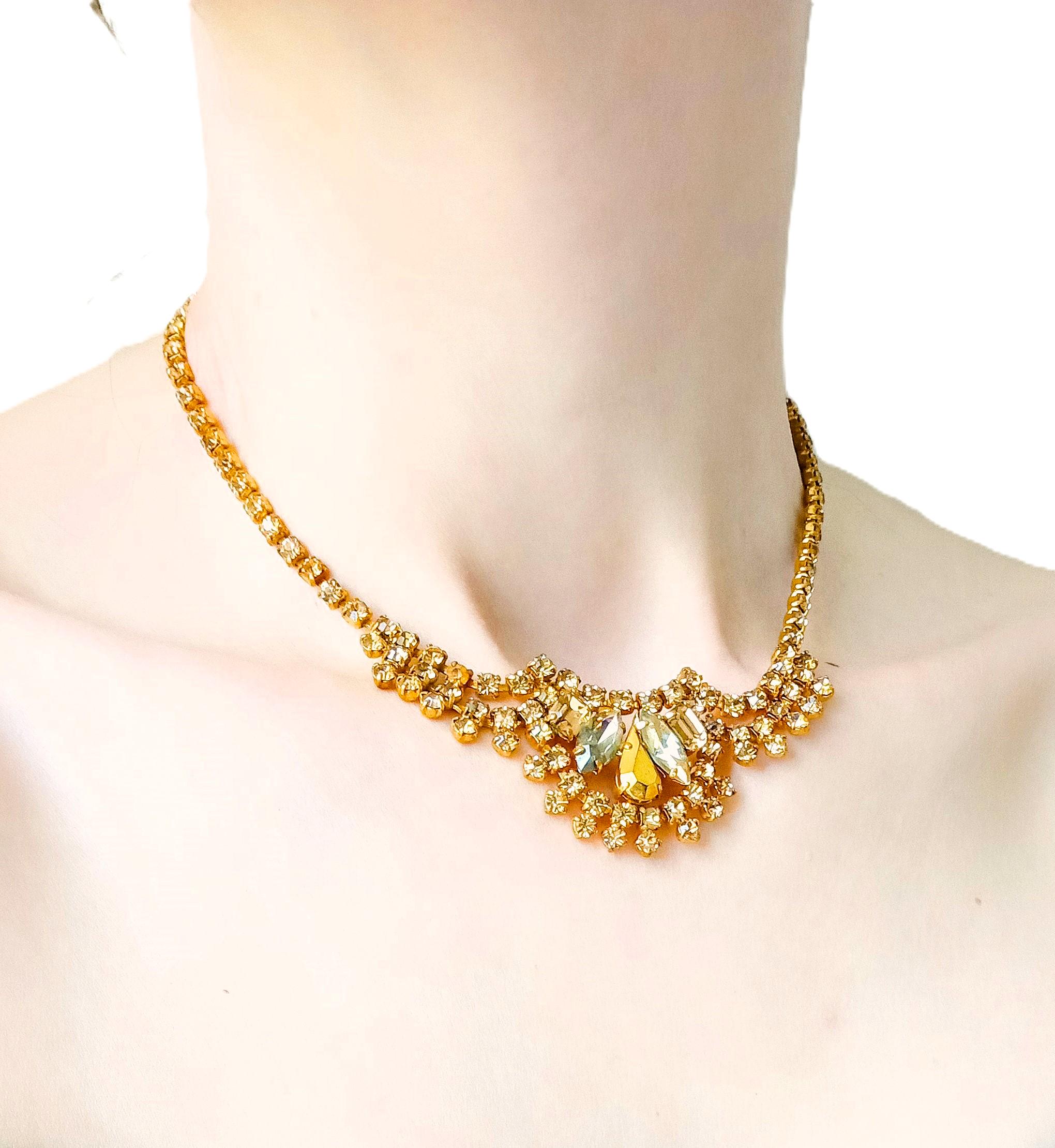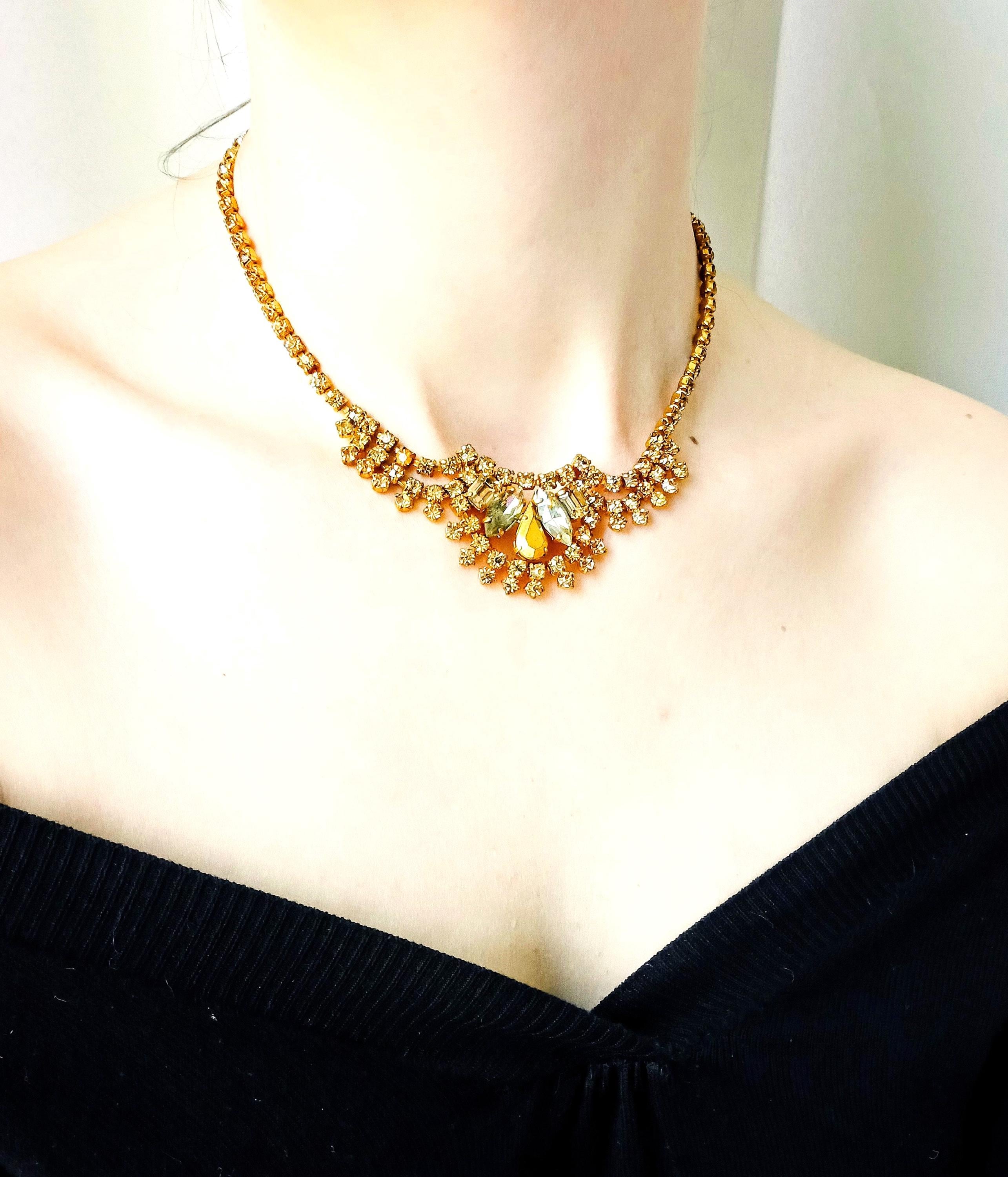 🇬🇧Vintage 50s Rhinestone Plastron Necklace - Golden Stones - Antique Jewelry - Wedding Ceremony Celebration - Women’s Christmas Gift