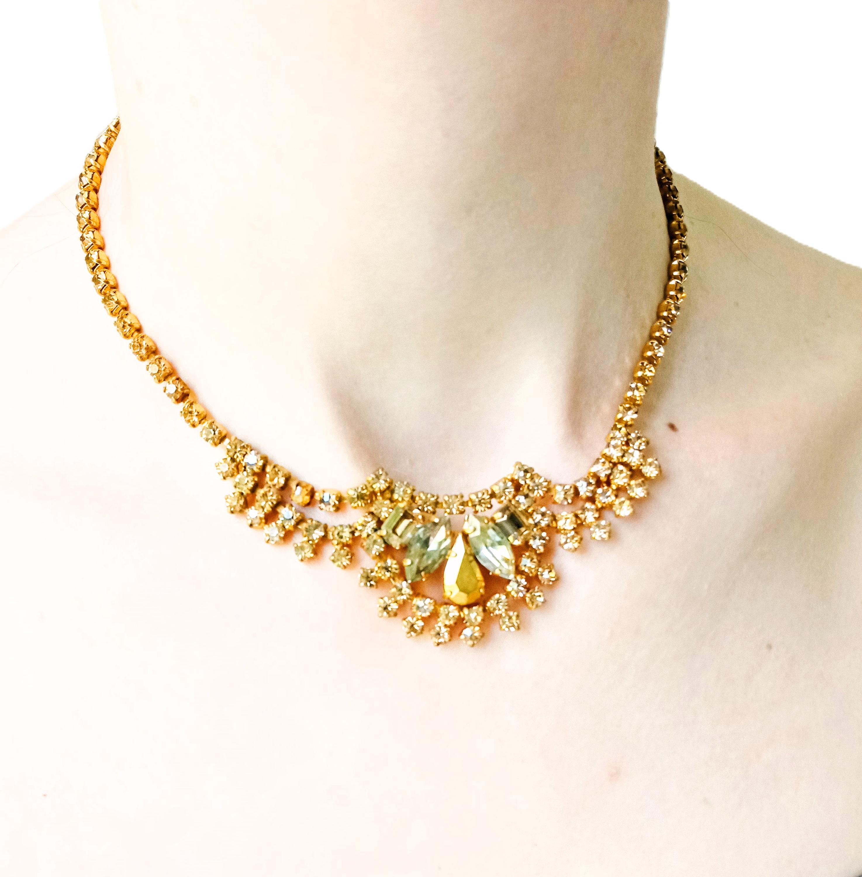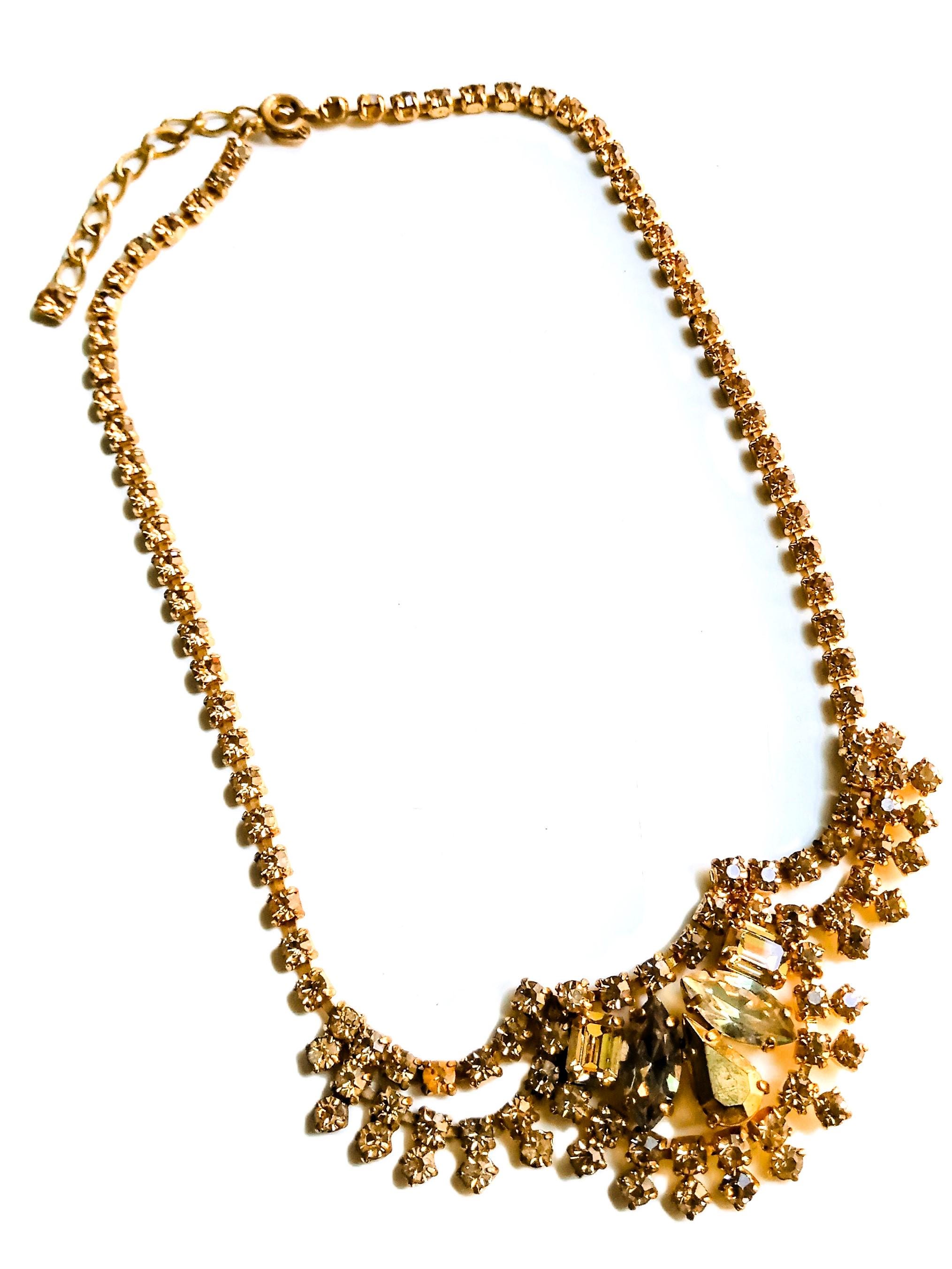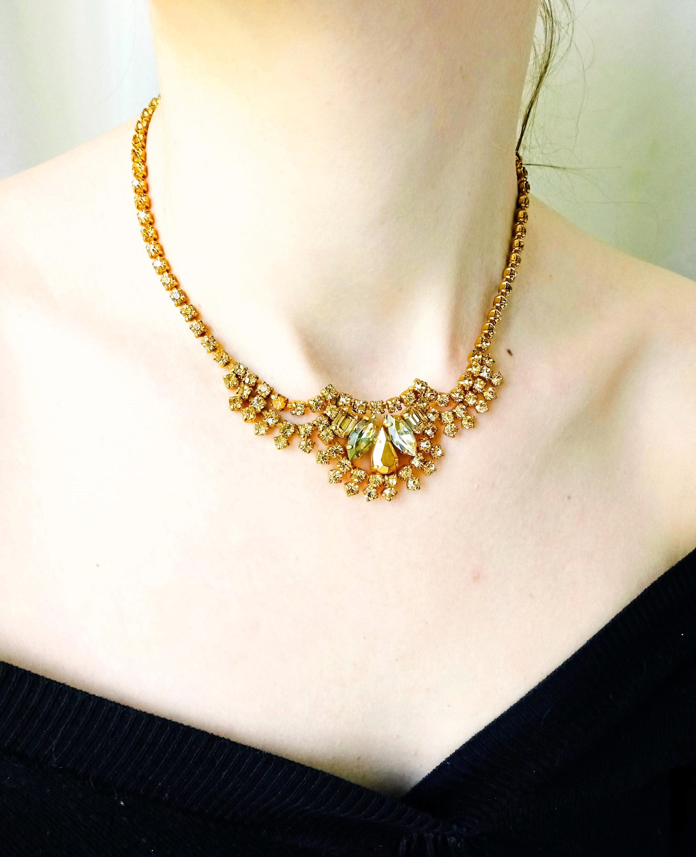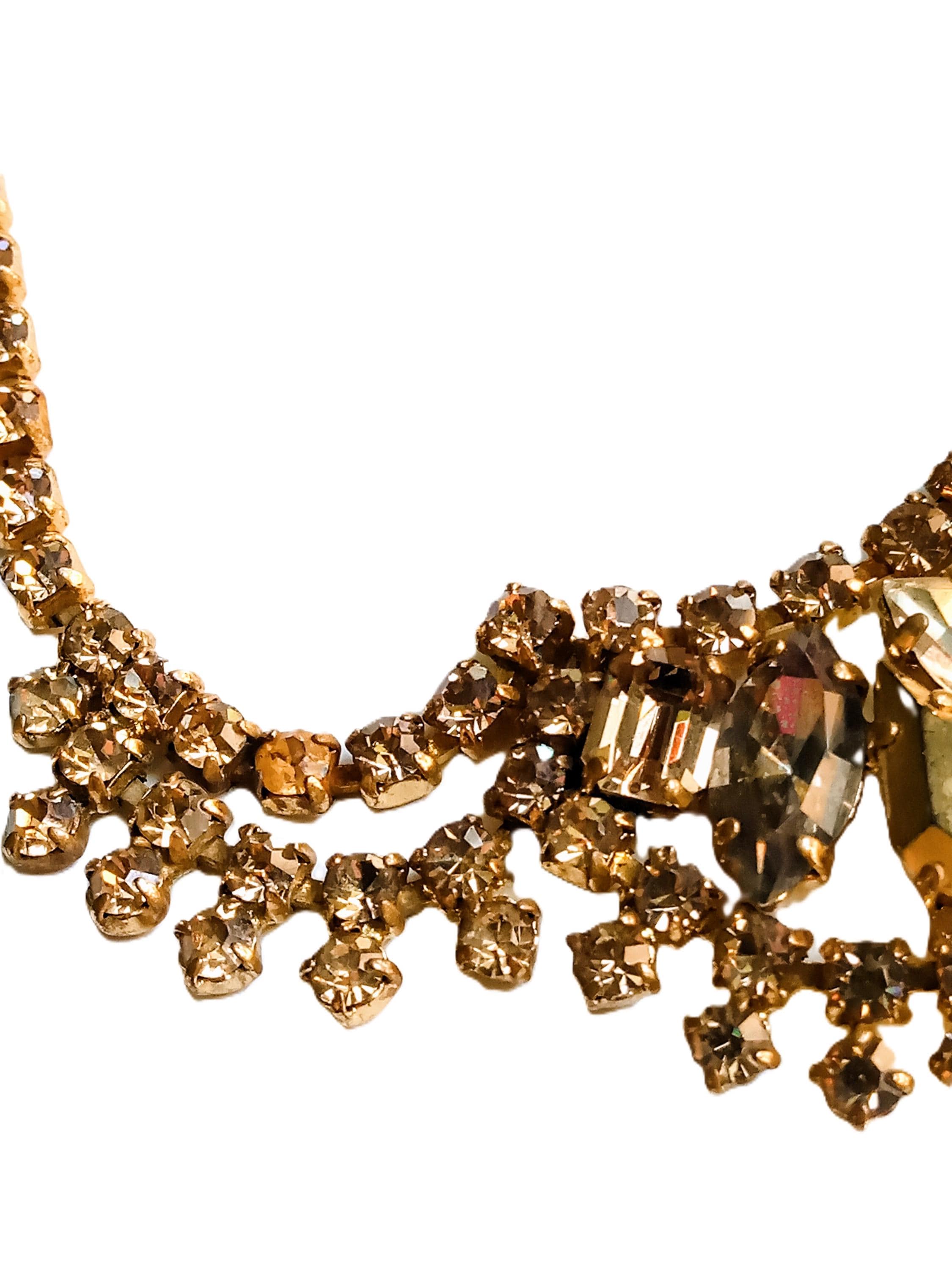 🇬🇧Vintage 50s Rhinestone Plastron Necklace - Golden Stones - Antique Jewelry - Wedding Ceremony Celebration - Women’s Christmas Gift
