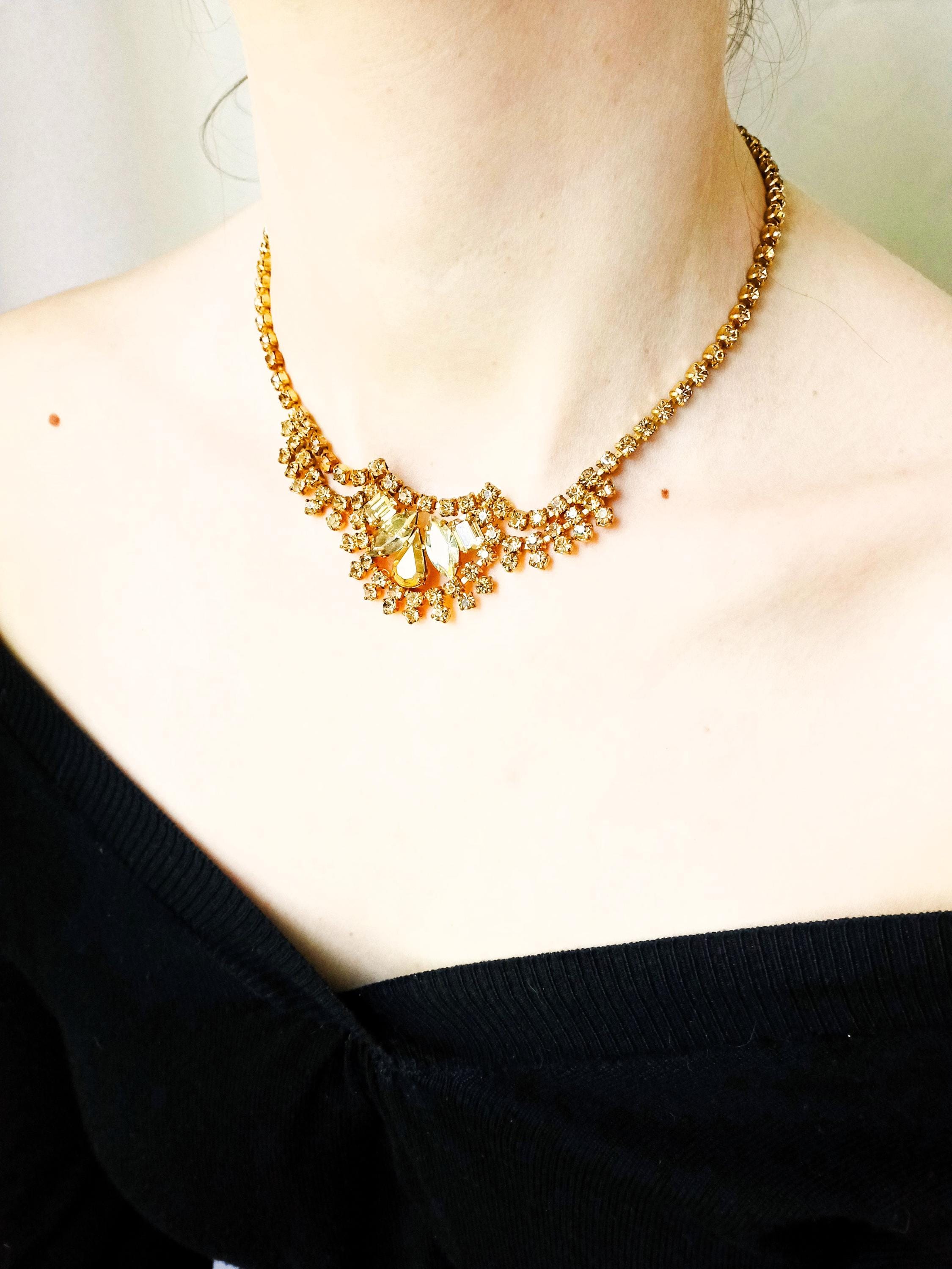 Collier Plastron Strass Années 50 Vintage - Pierres Dorés - Bijoux ancien - Fête Cérémonie Mariage - Cadeau Femme Noël