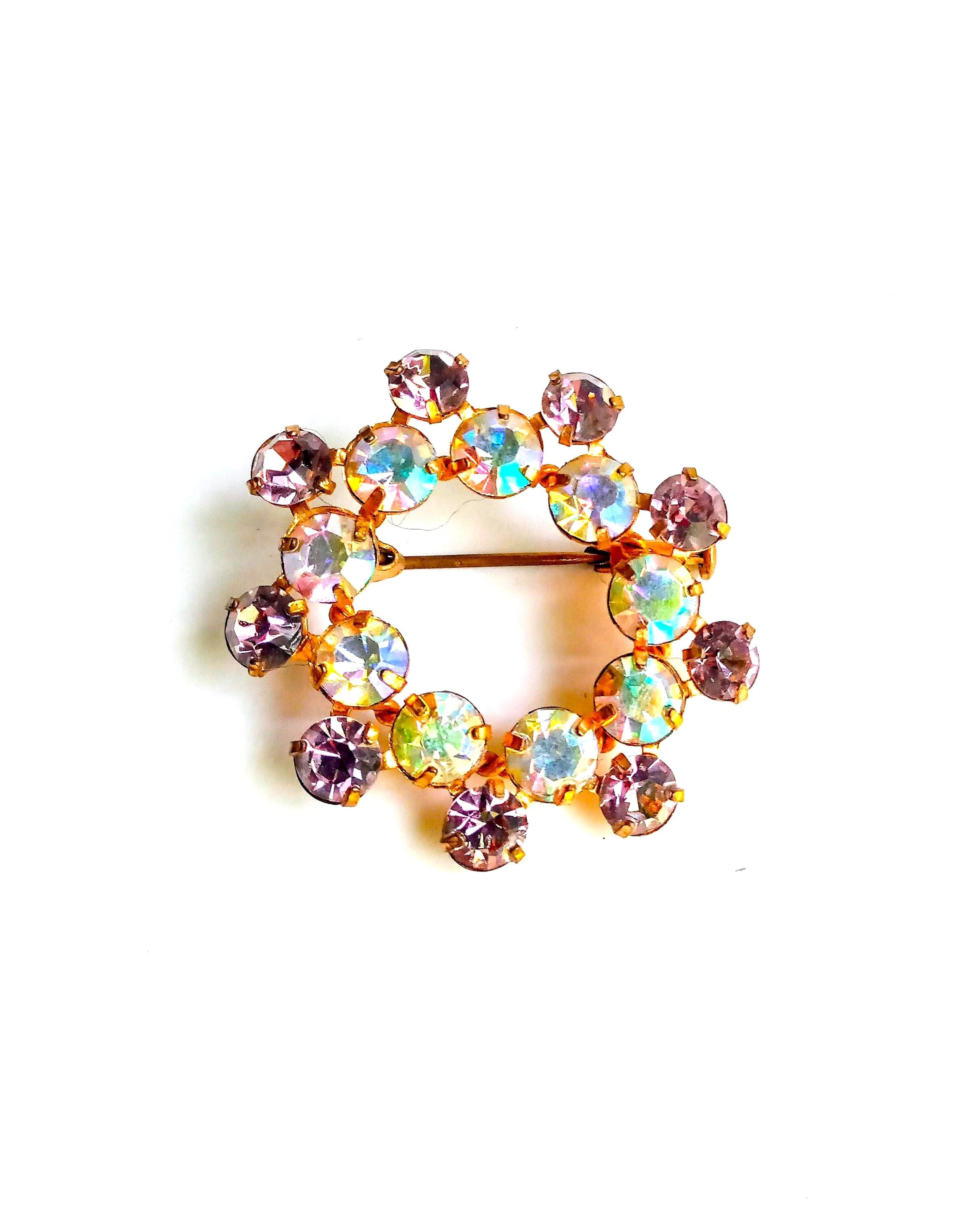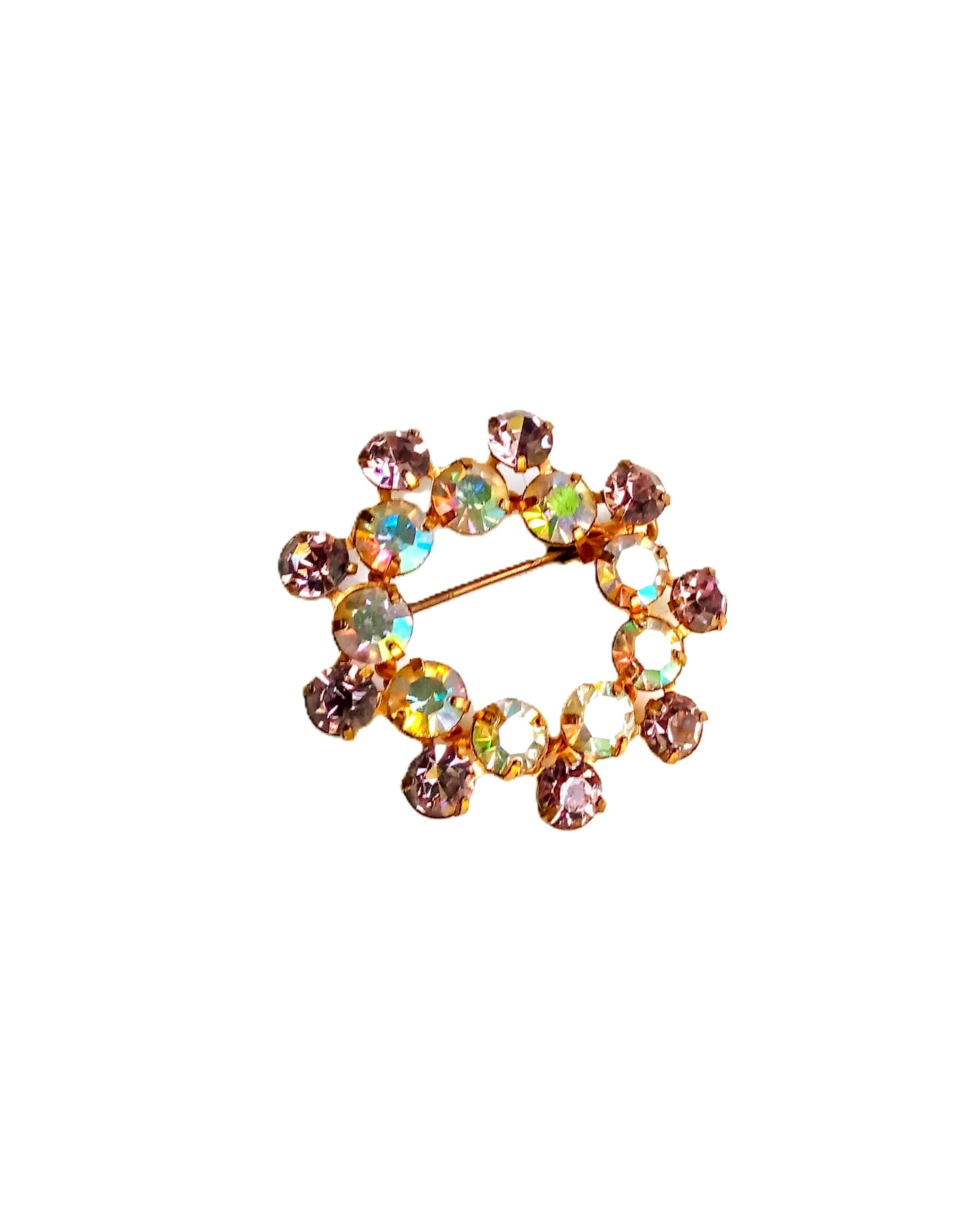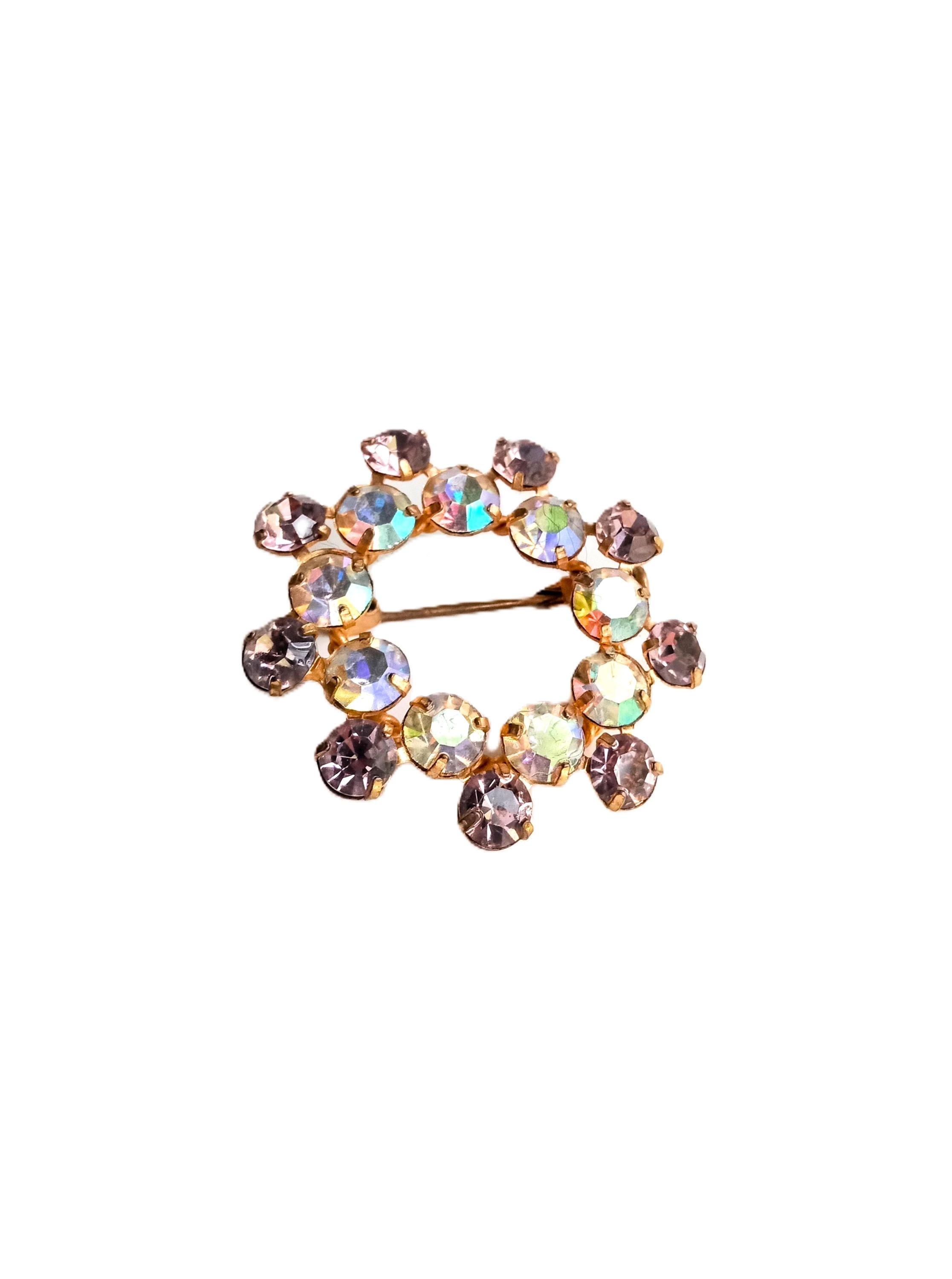 Vintage brooch from the 1950s, of French origin, composed of magnificent strass with pastel and aurora borealis reflections. This jewel forms a circle delicately worked on a golden brass, typical of the post-war glamour style and mid-century fashion.
