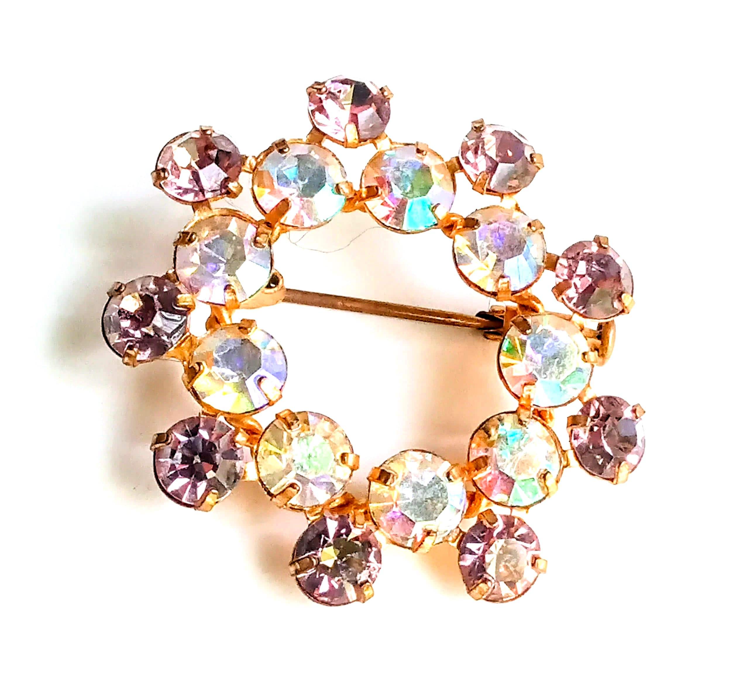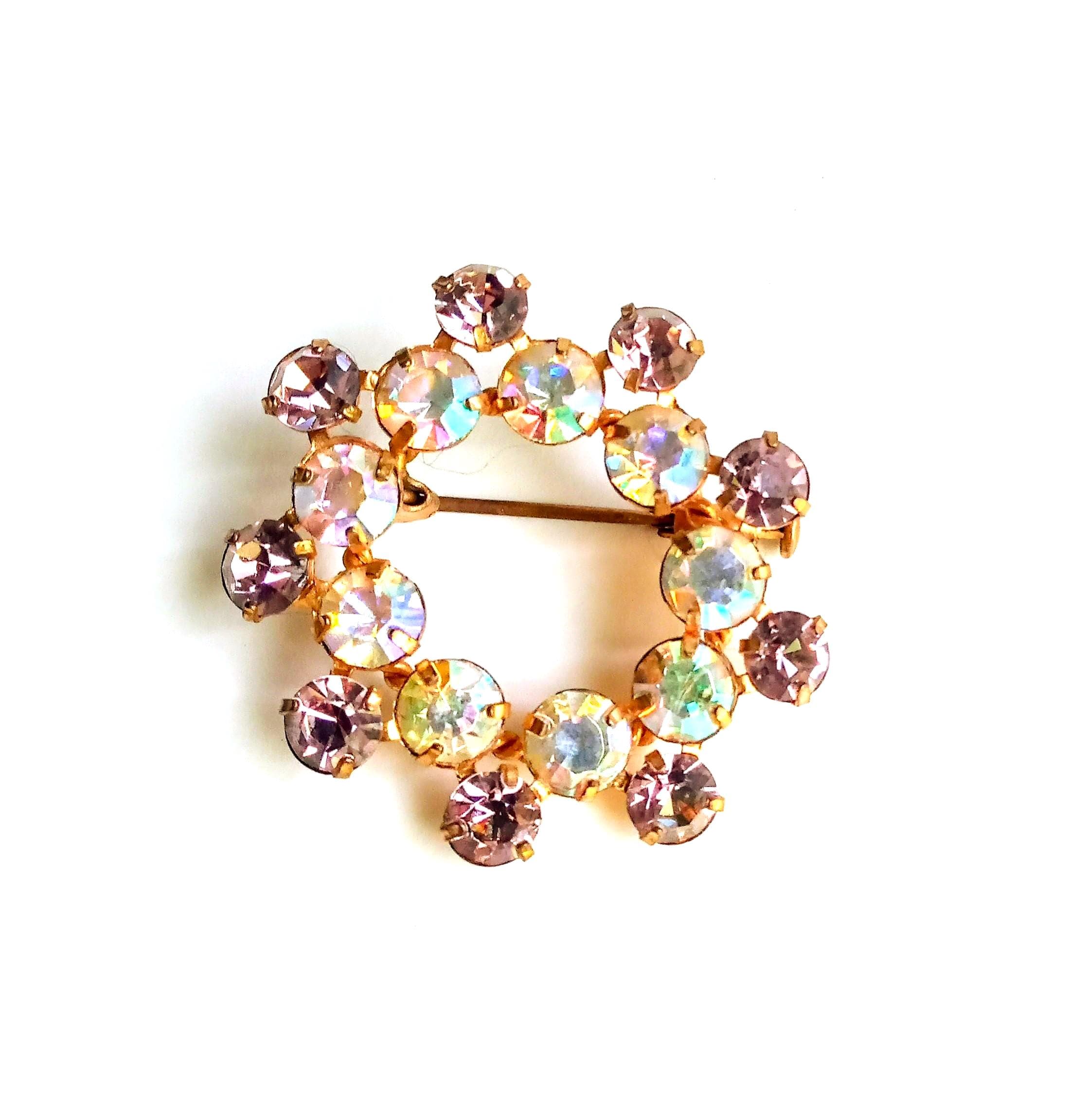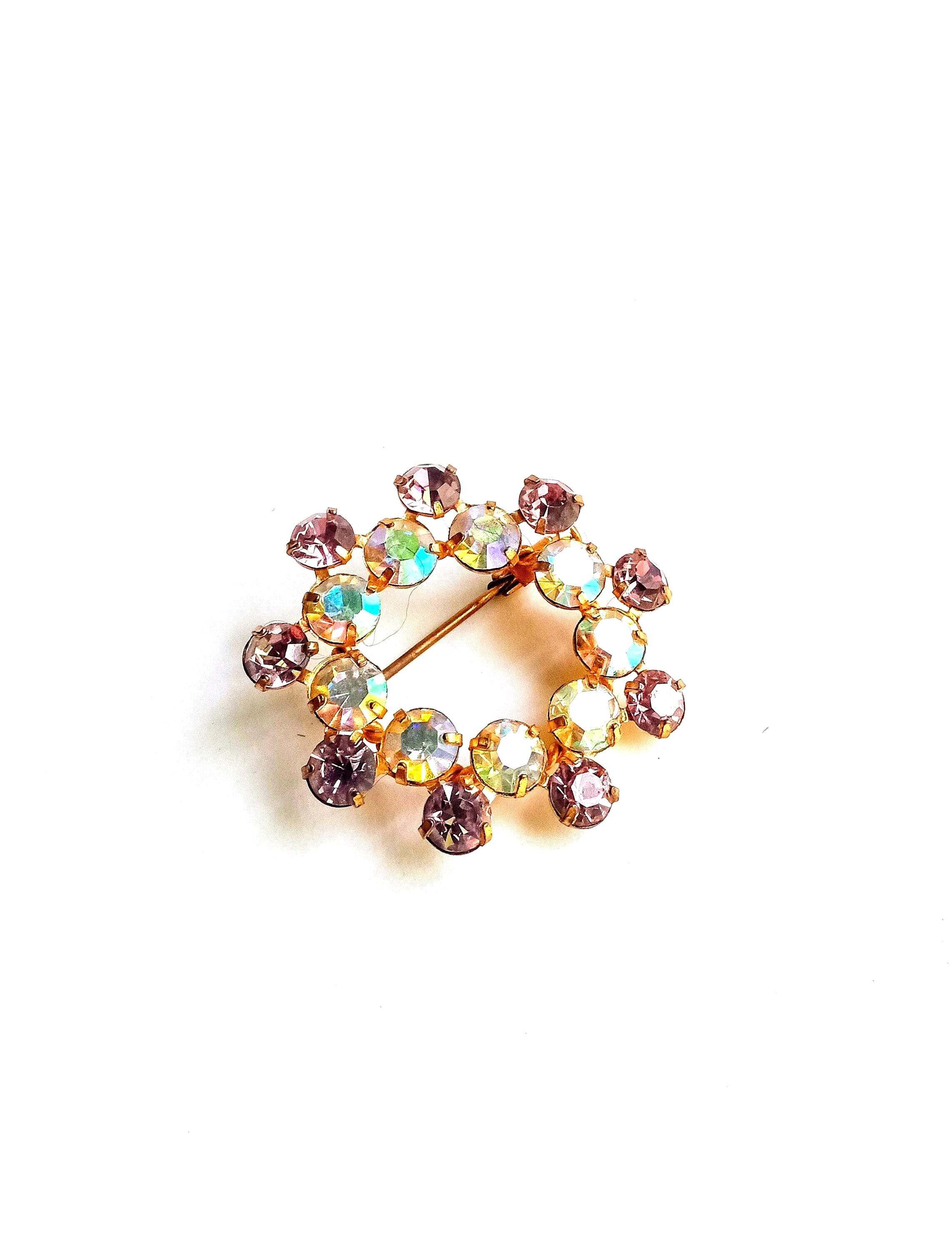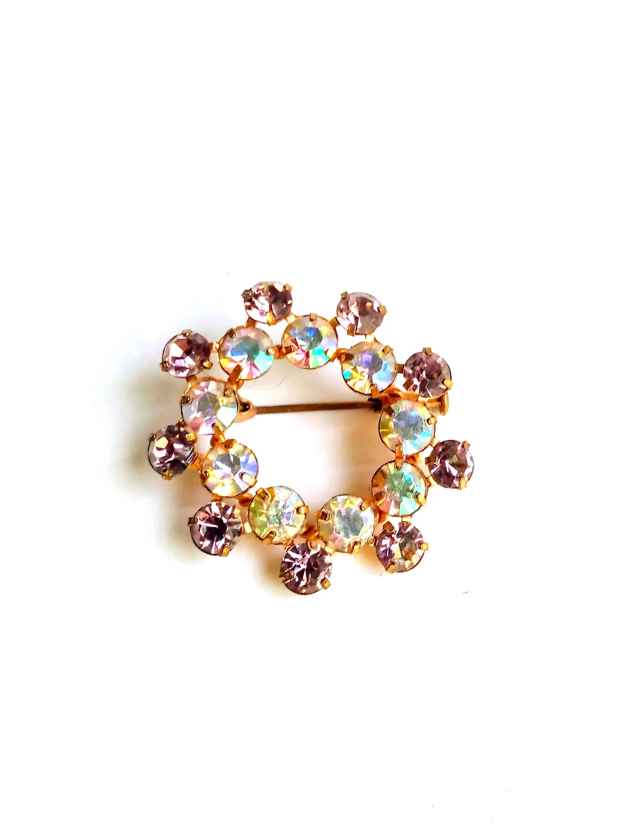 Vintage brooch from the 1950s, of French origin, composed of magnificent strass with pastel and aurora borealis reflections. This jewel forms a circle delicately worked on a golden brass, typical of the post-war glamour style and mid-century fashion.