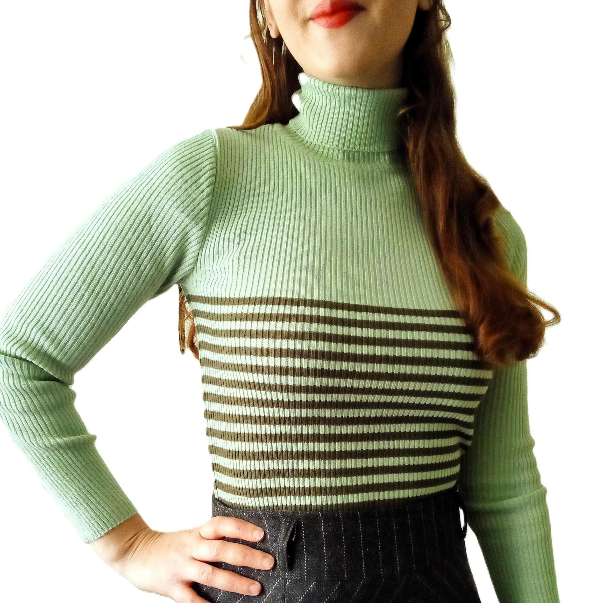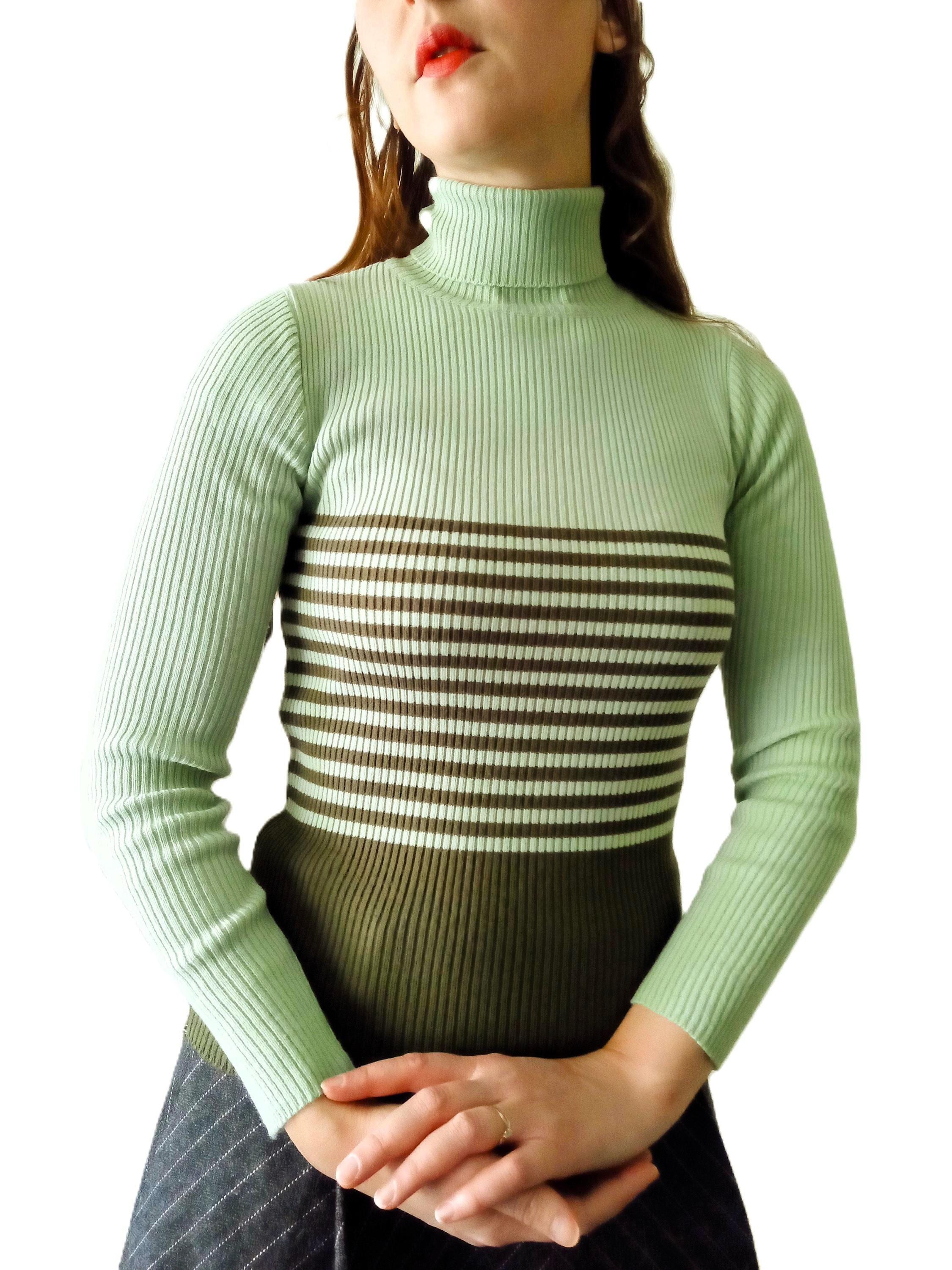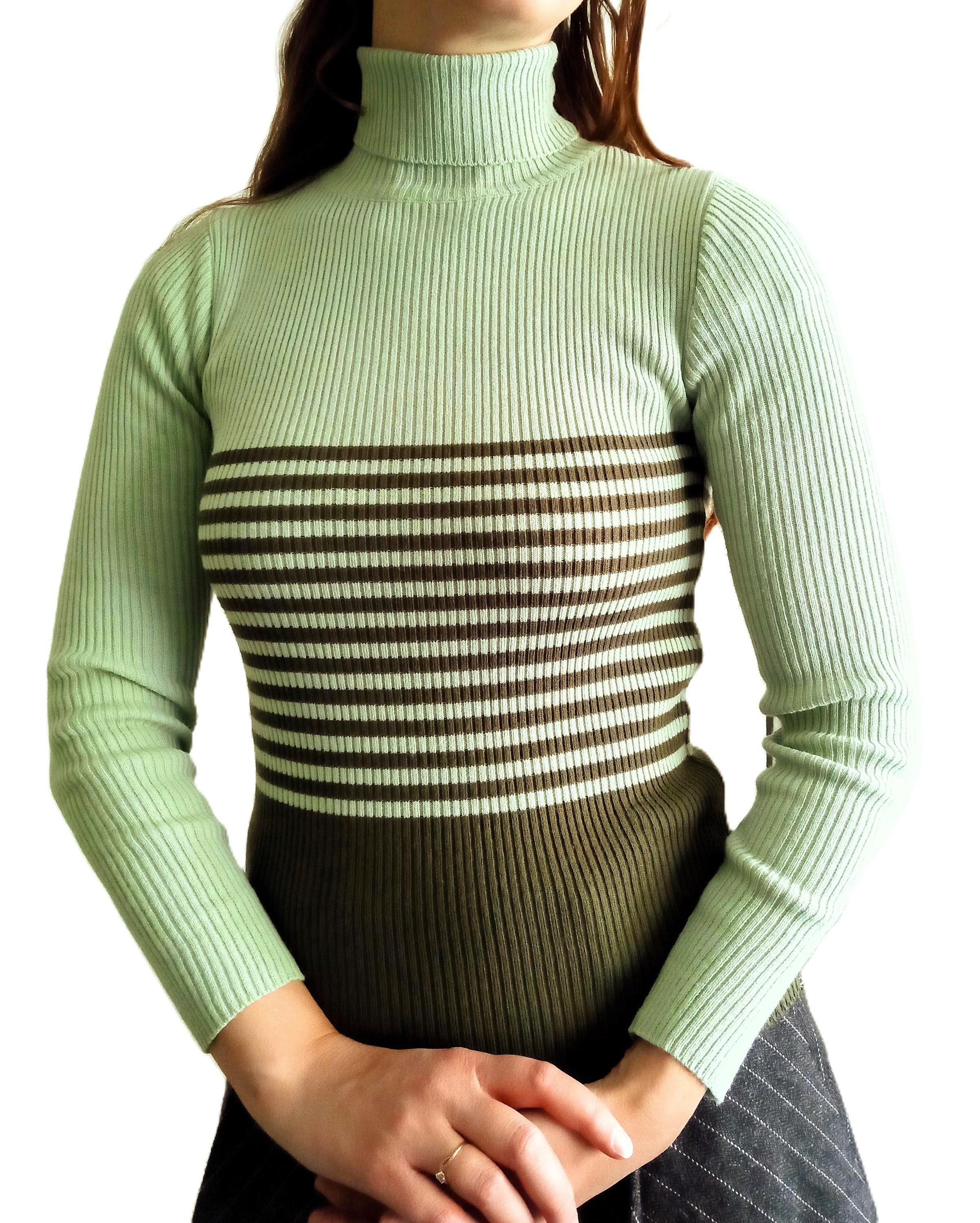 This soft and stretchy ribbed knit sweater highlights the bust line thanks to its set of sage green and khaki horizontal stripes, typical of the 90s style. Its turtleneck brings warmth and style, perfect for autumn-winter or to compose a minimalist retro look.