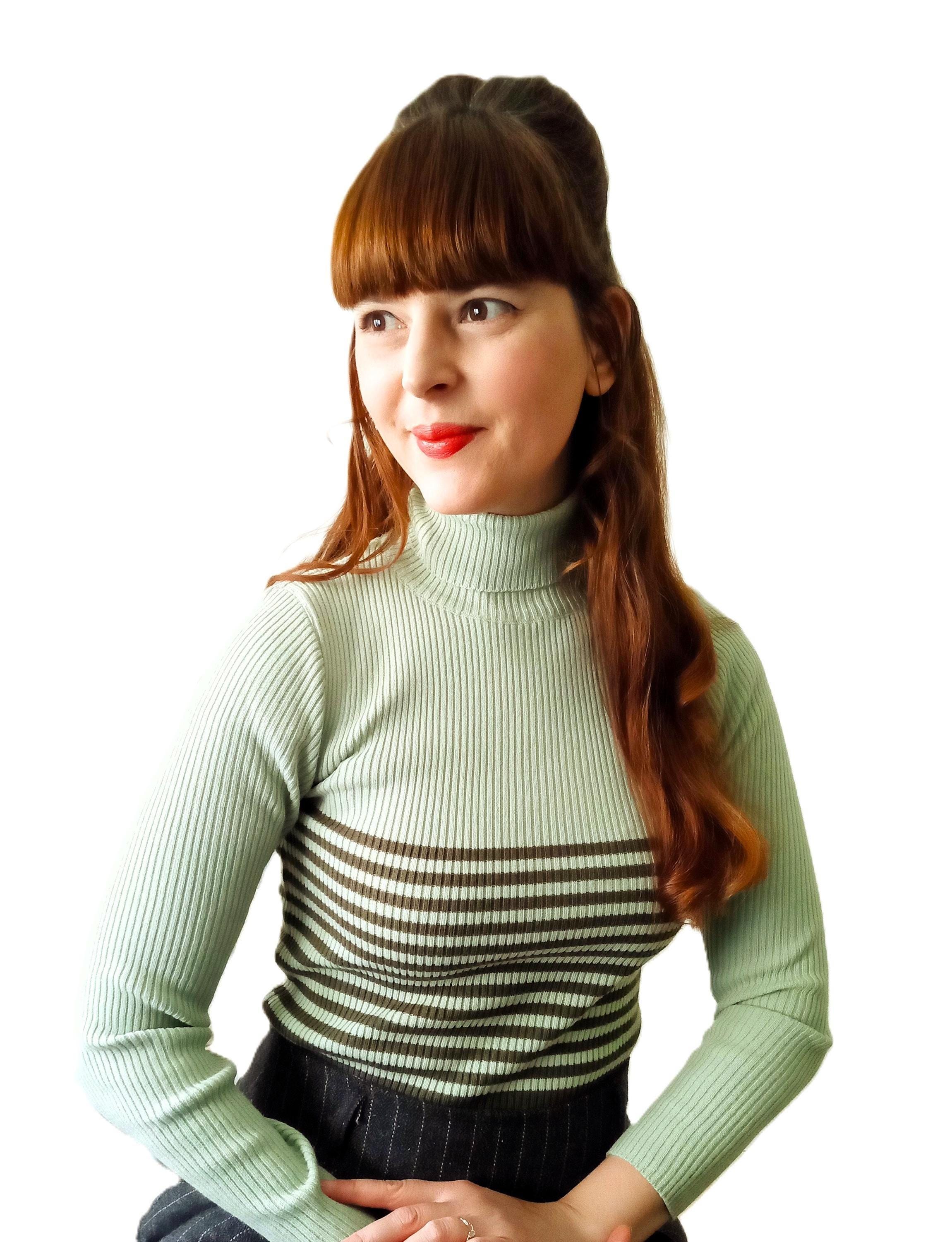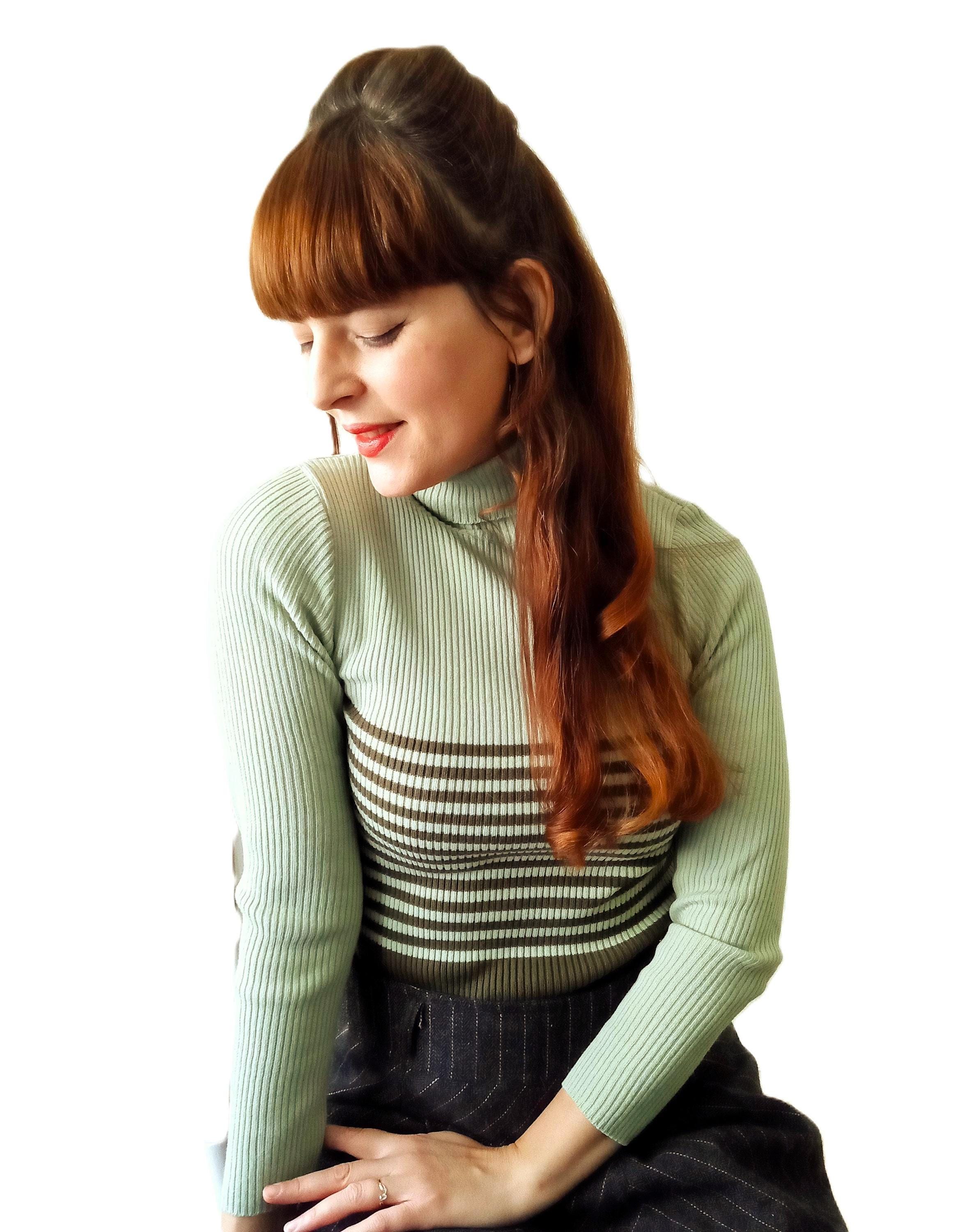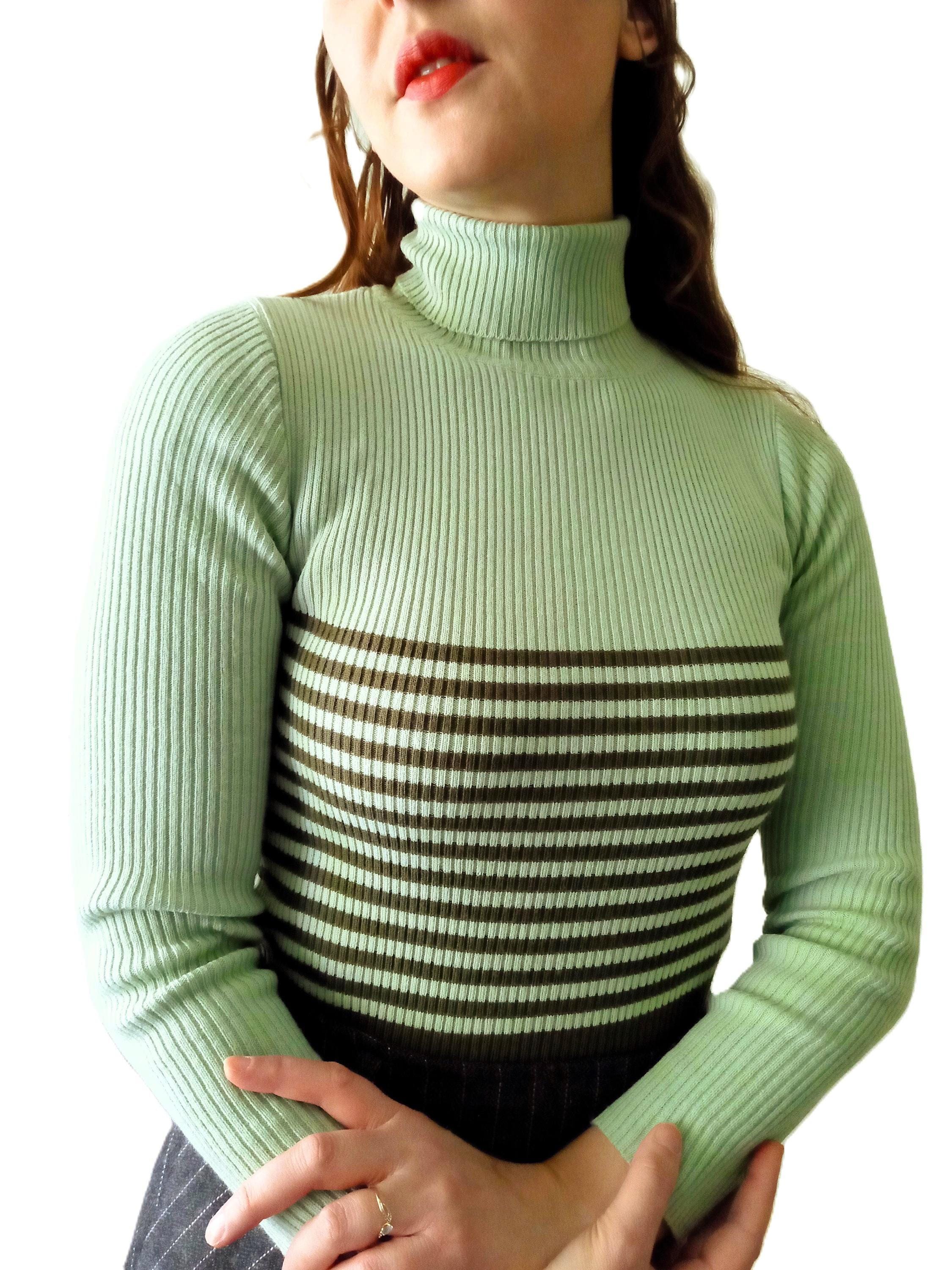 This soft and stretchy ribbed knit sweater highlights the bust line thanks to its set of sage green and khaki horizontal stripes, typical of the 90s style. Its turtleneck brings warmth and style, perfect for autumn-winter or to compose a minimalist retro look.
