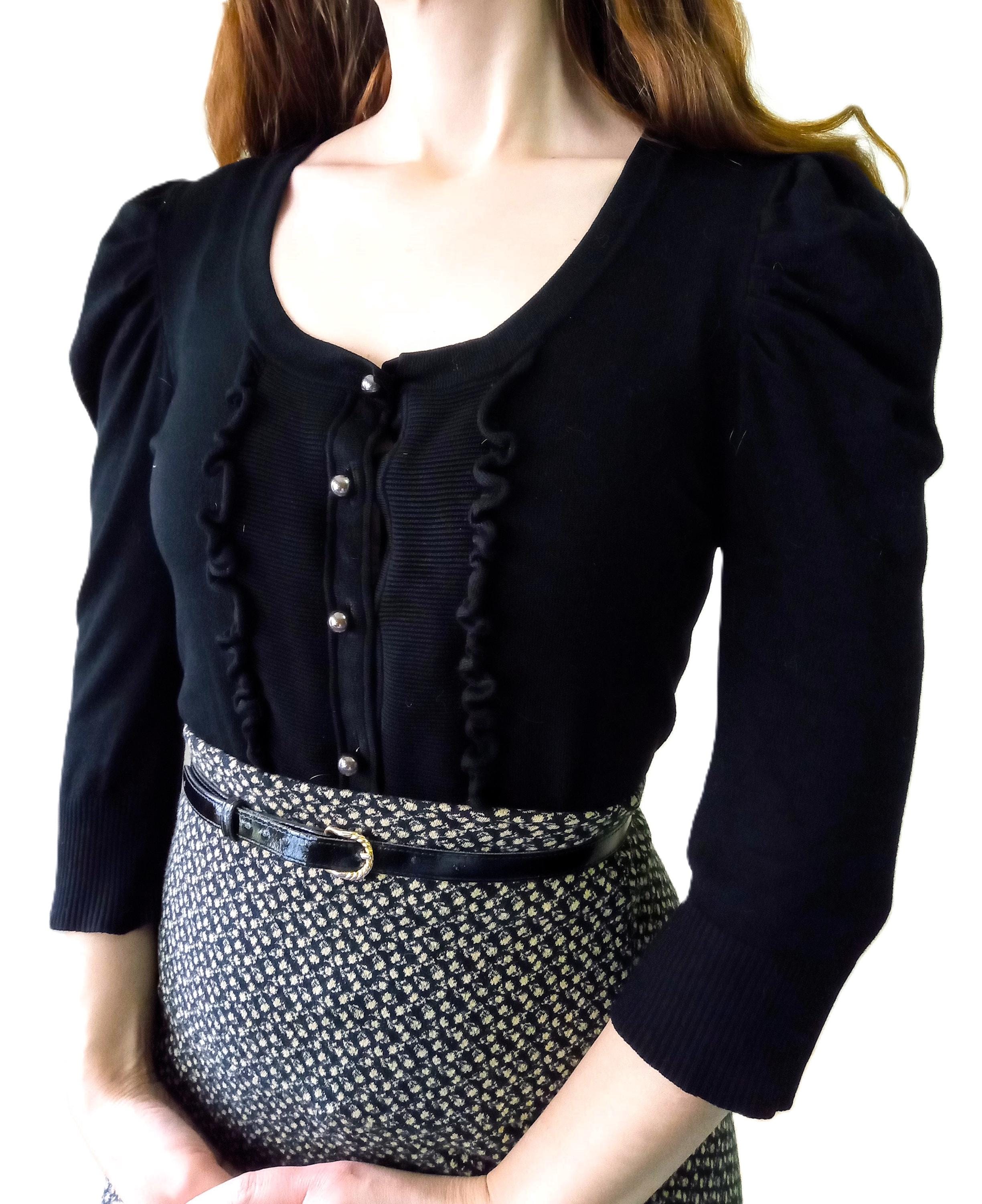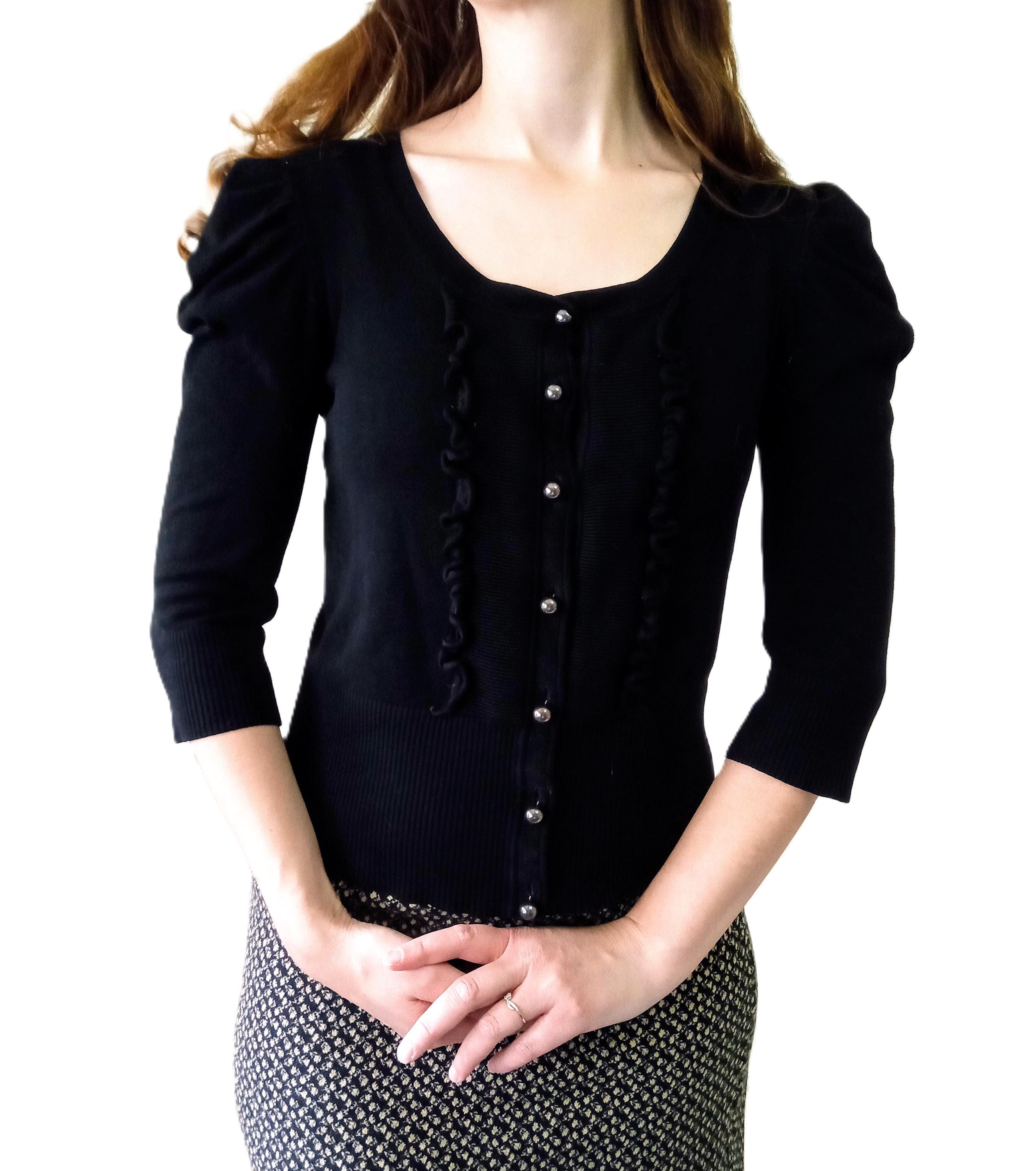 Apportez une touche de glamour rétro à votre tenue avec ce magnifique gilet noir vintage orné de froufrous élégants, de manches bouffantes et de splendides boutons bijoux en perles argentées .Parfaite pour celles qui aiment les silhouettes féminines, romantiques et audacieusement rétro.