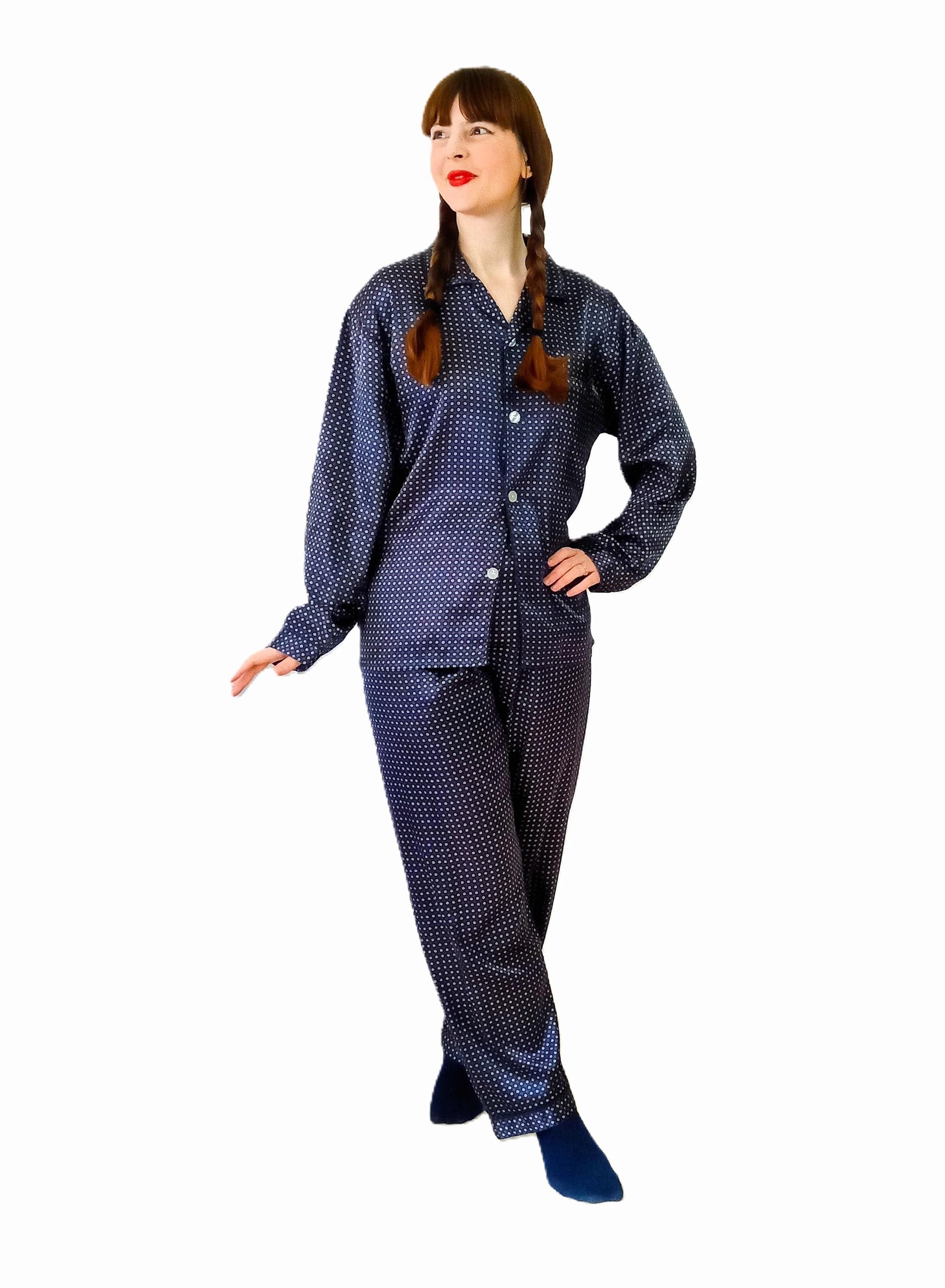 Its deep navy blue satin, subtly shiny, is enhanced with a delicate yellow and white graphic pattern, reminiscent of the typical designs of the 50s. Thanks to its straight and comfortable cut, these pajamas present a unisex style, ideal for both women and men.