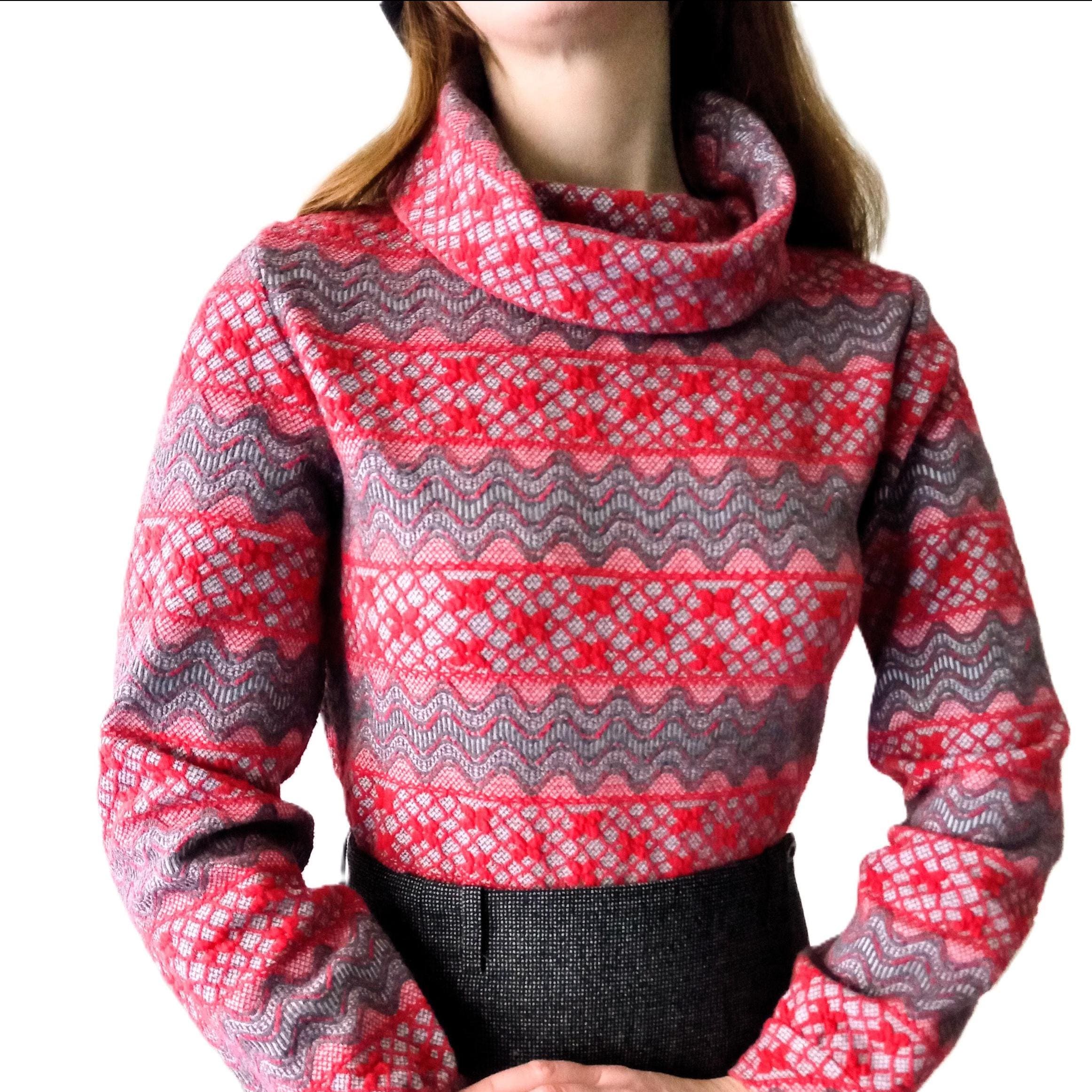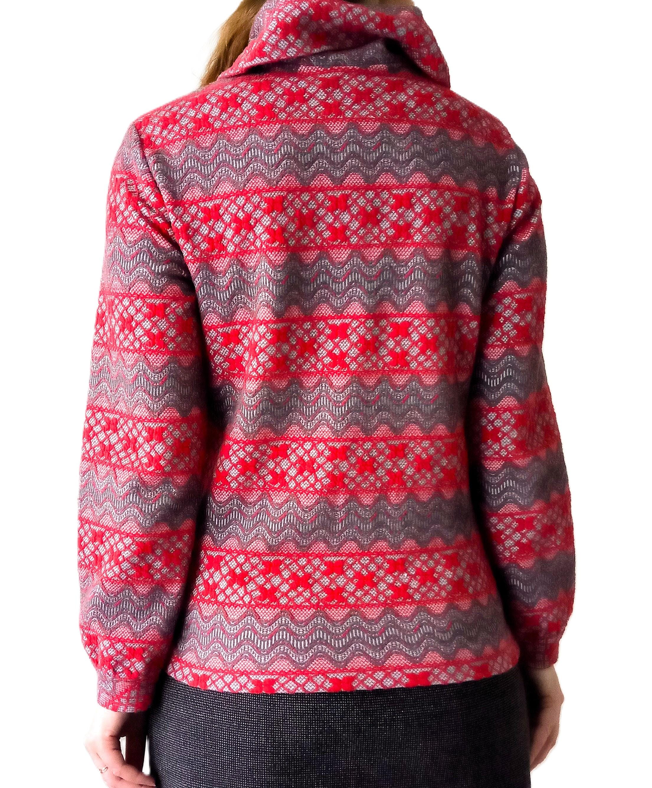 Apportez du caractère à votre dressing avec ce pull vintage authentique des années 70, remarquable par son motif floral et graphique en relief. Sa maille texturée, aux teintes rouge profond et gris, incarne parfaitement l’esthétique forte et créative de la mode seventies.
