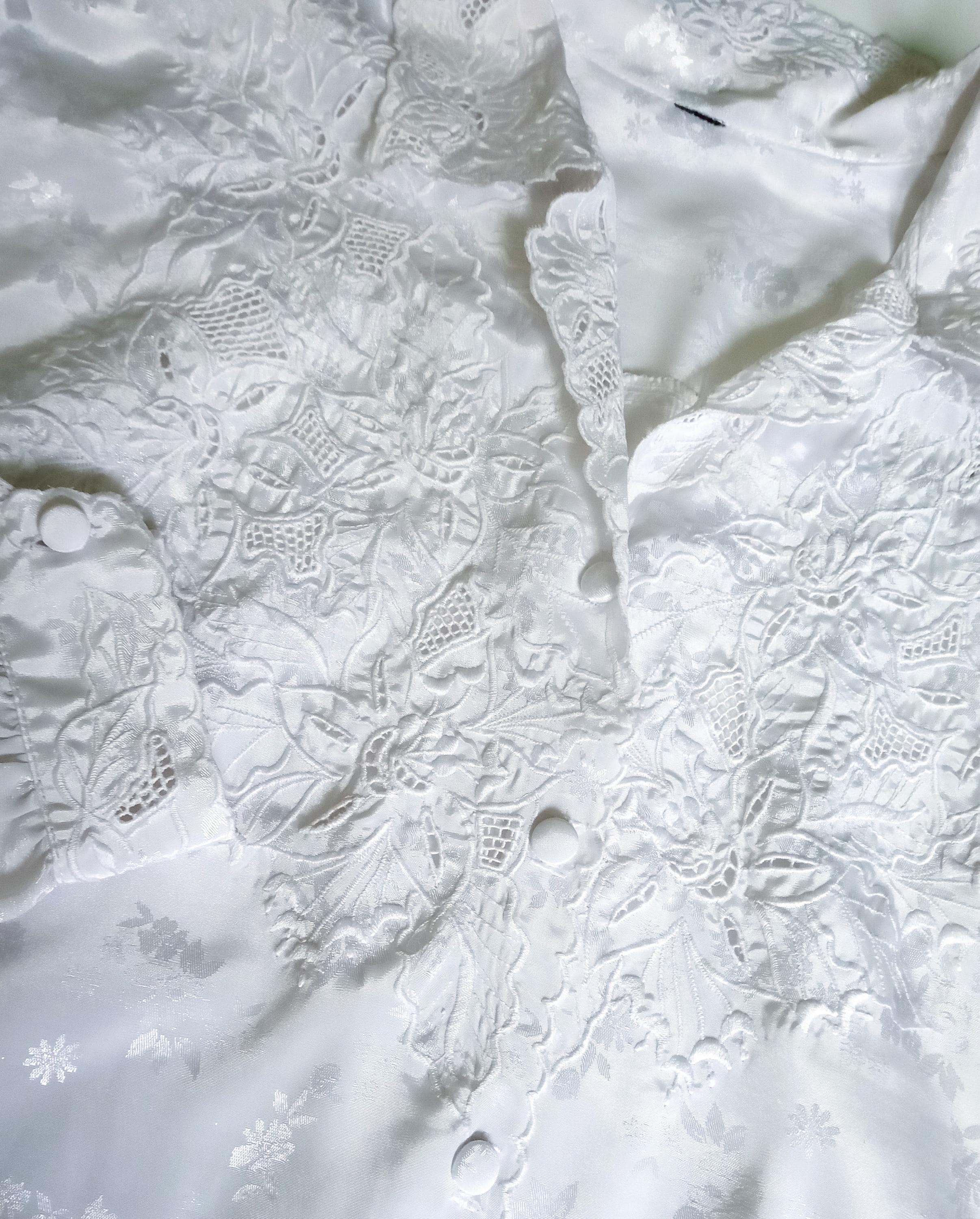 Confectionné dans un tissu satiné léger et fluide, il séduit par son col délicatement orné de dentelle, apportant une touche raffinée et romantique à la silhouette.