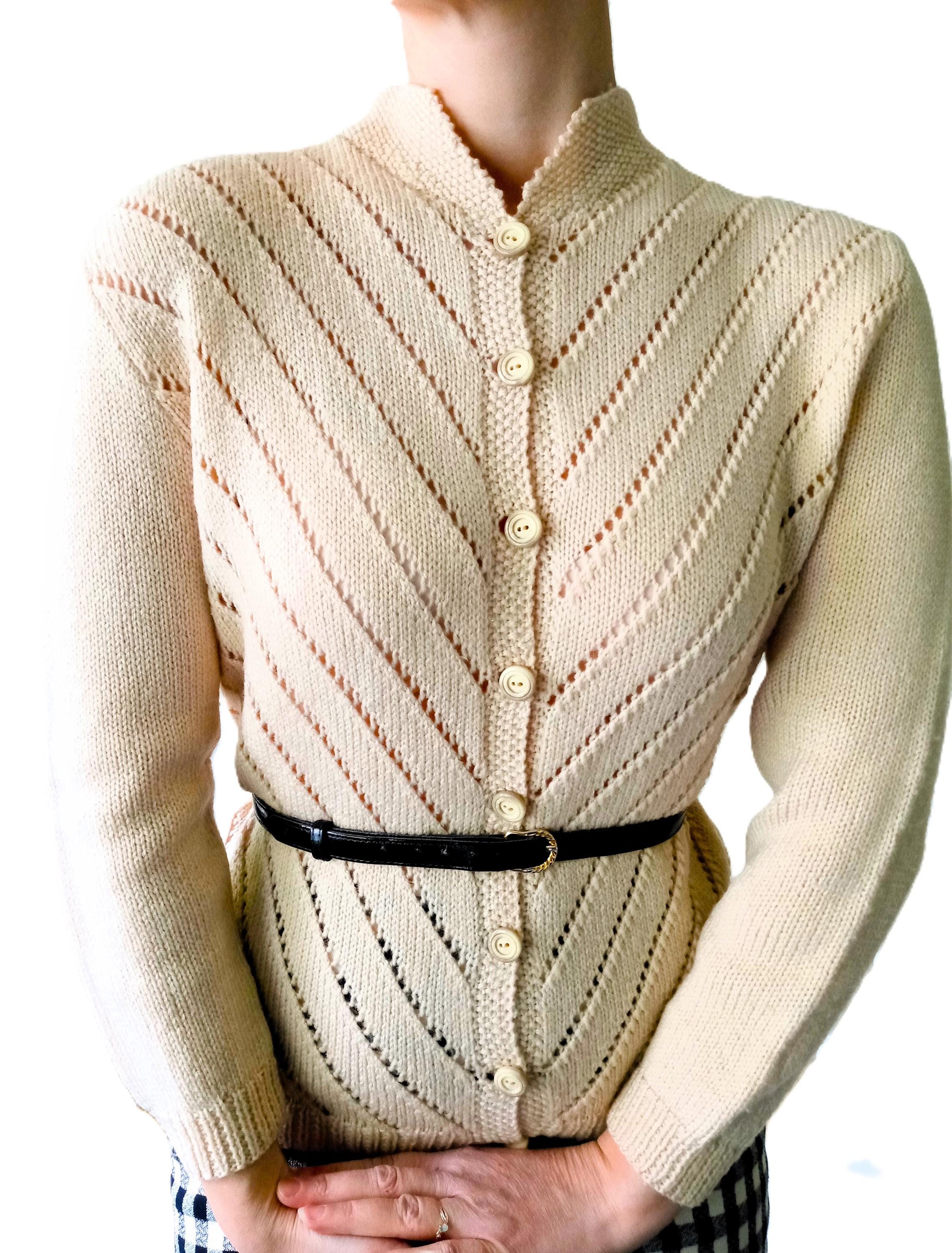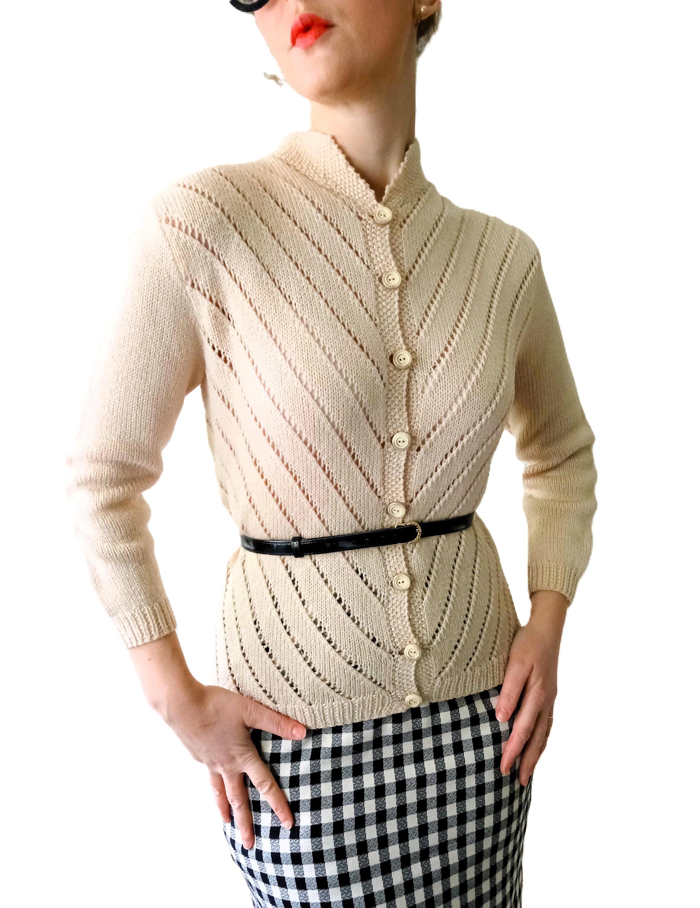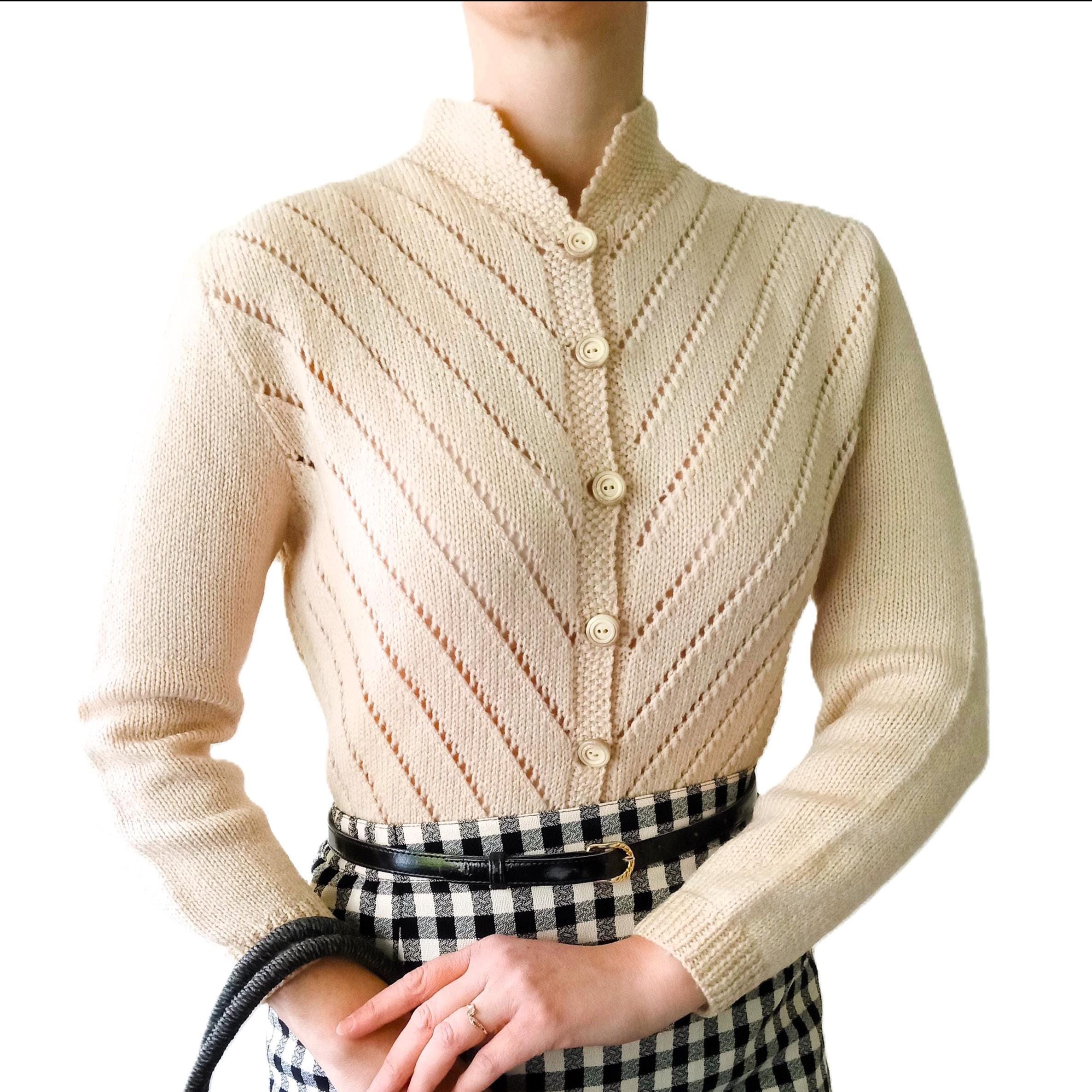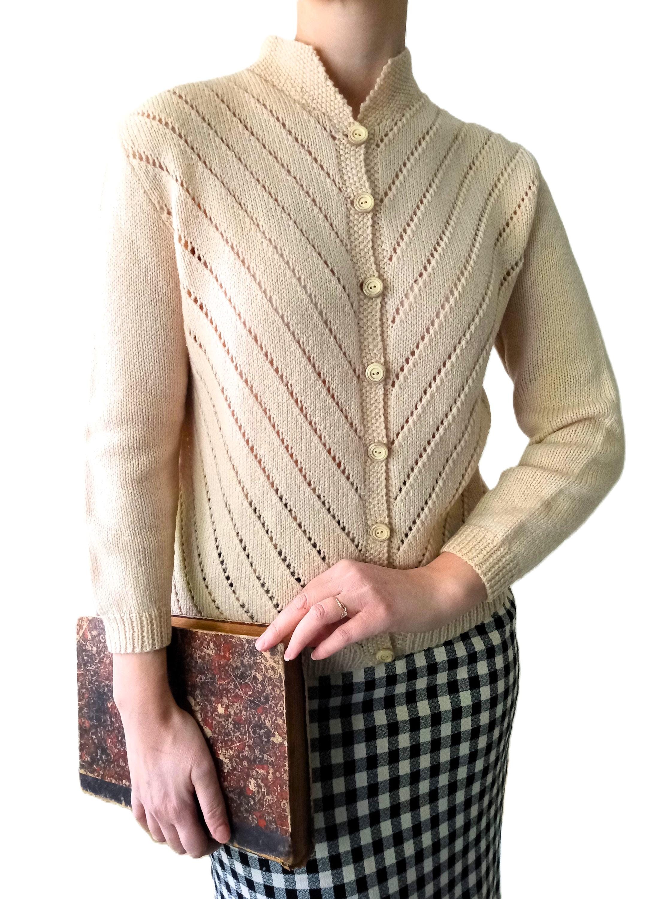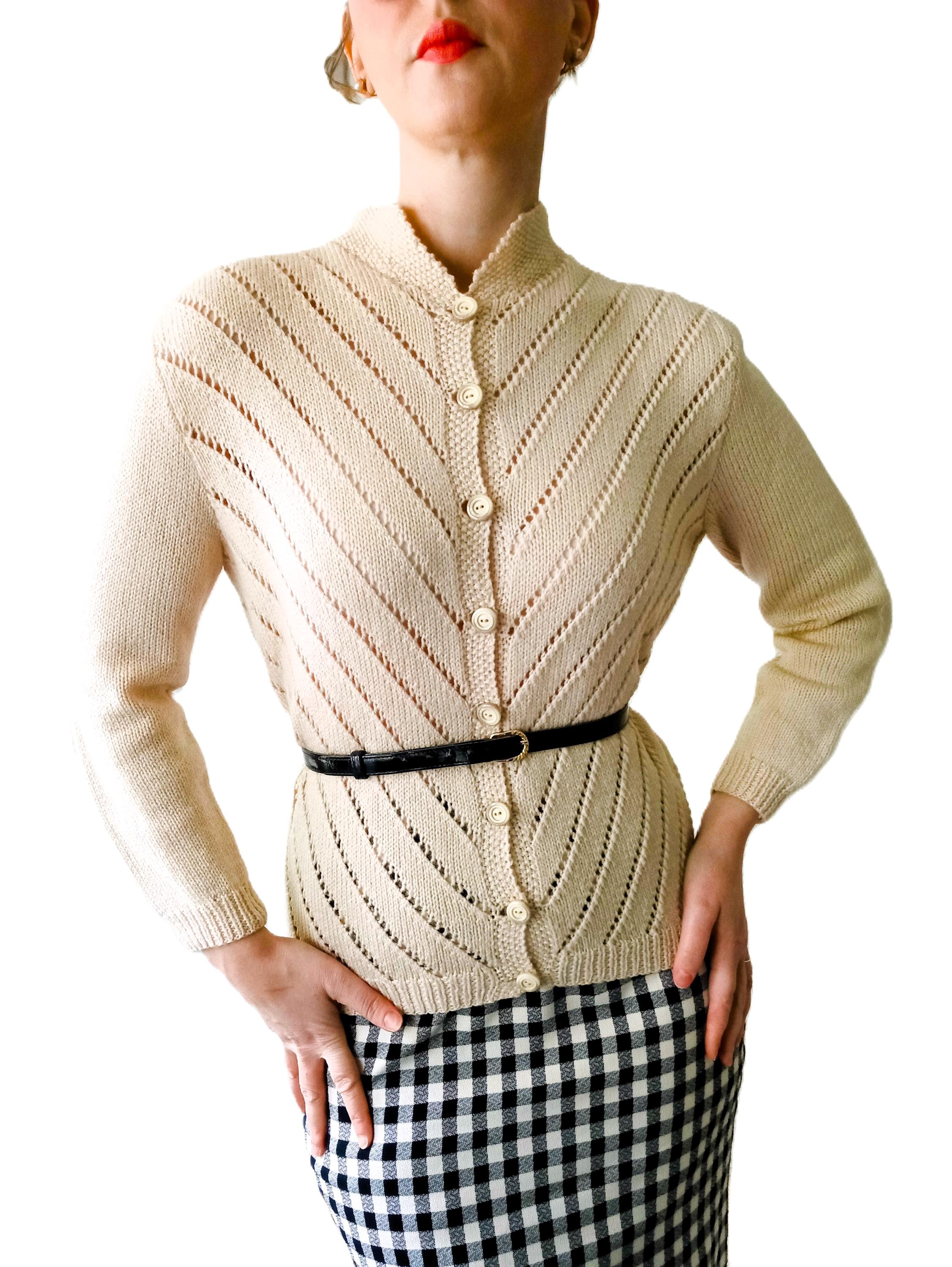 This cardigan is distinguished by refined knit work, typical of handmade knitwear from the 50s–60s.
