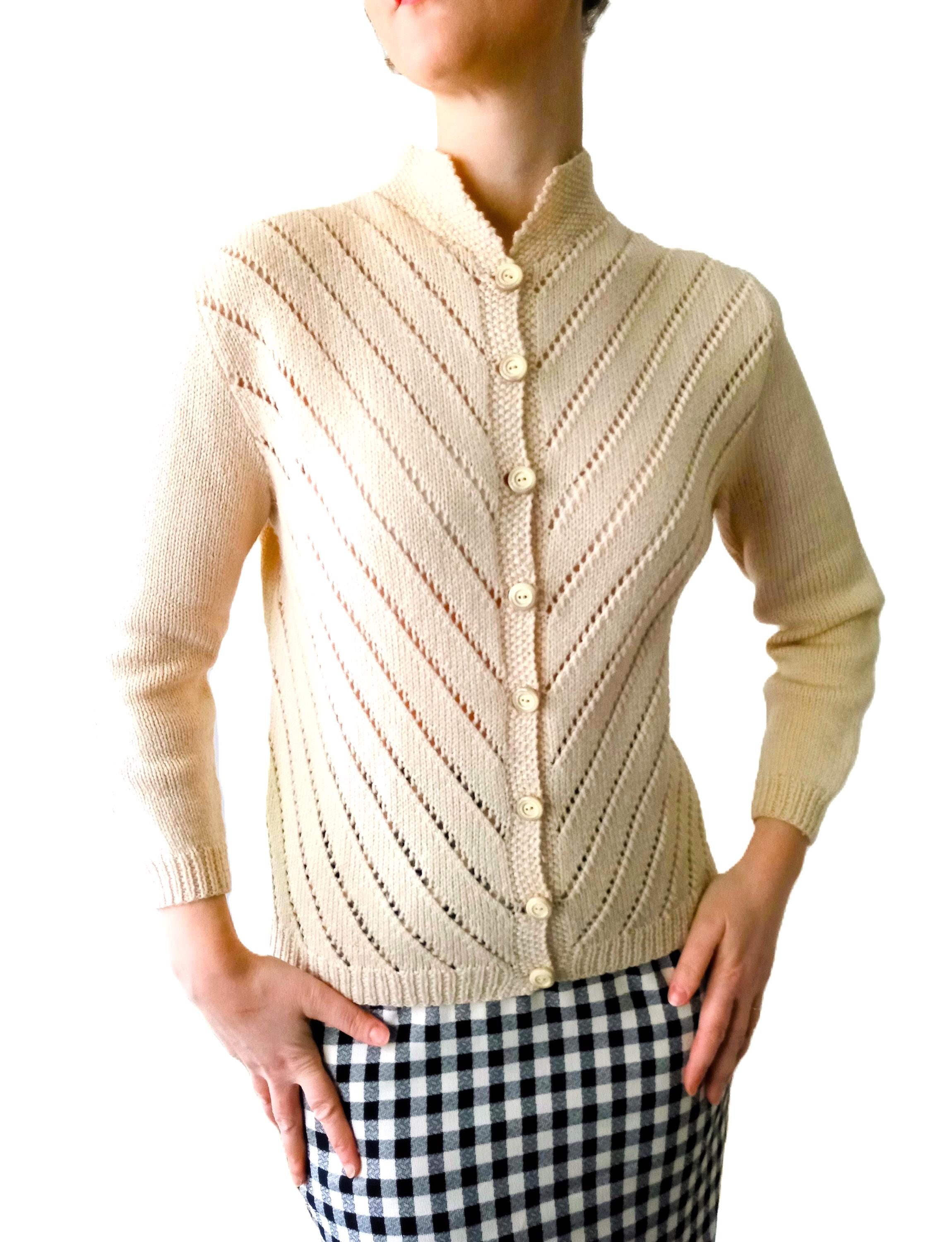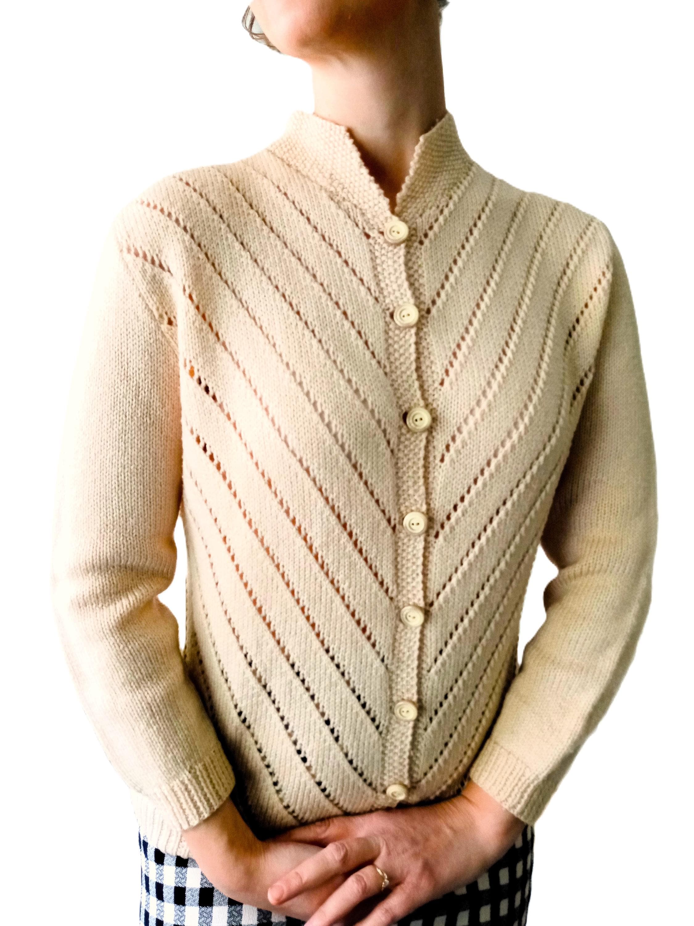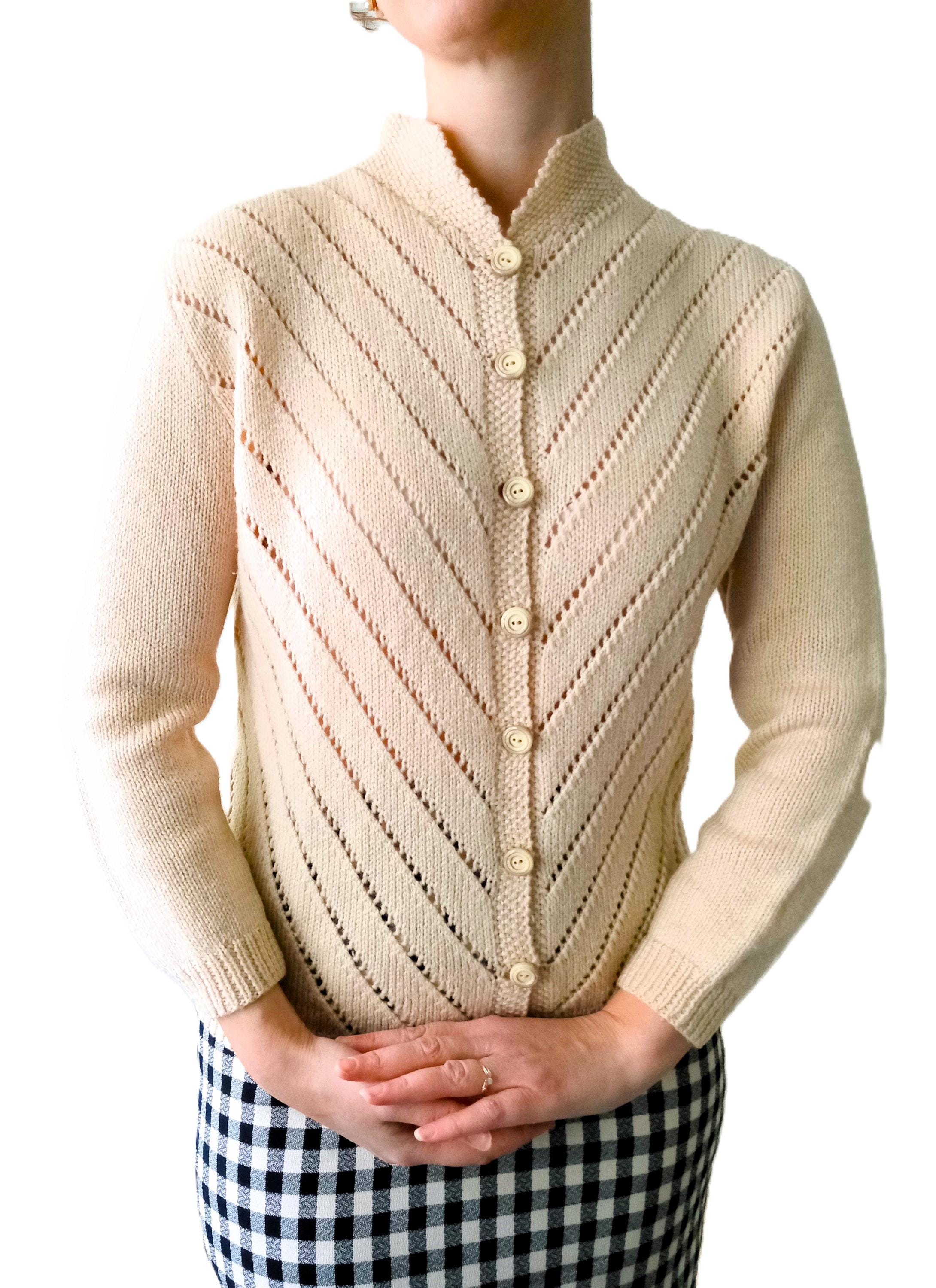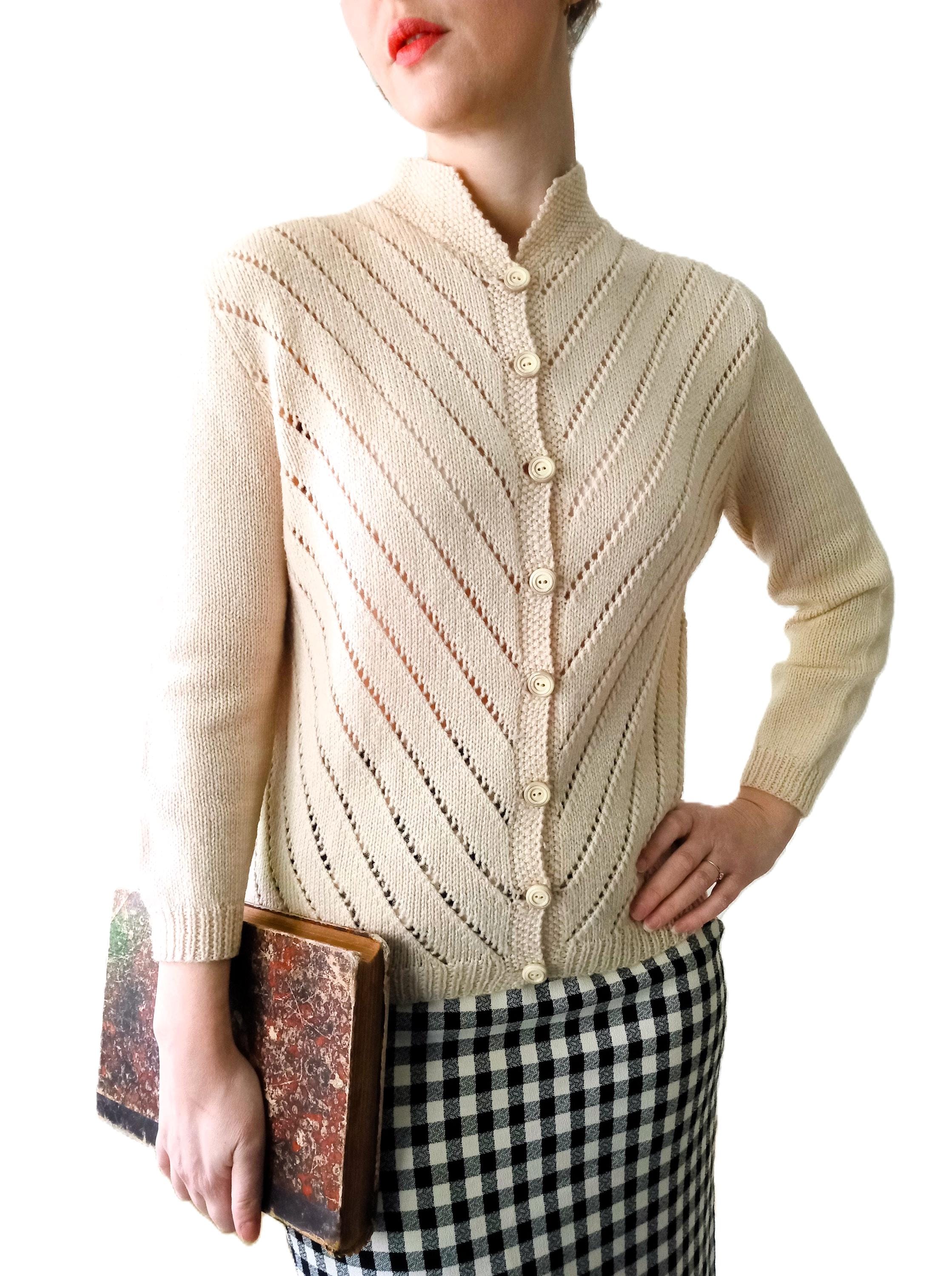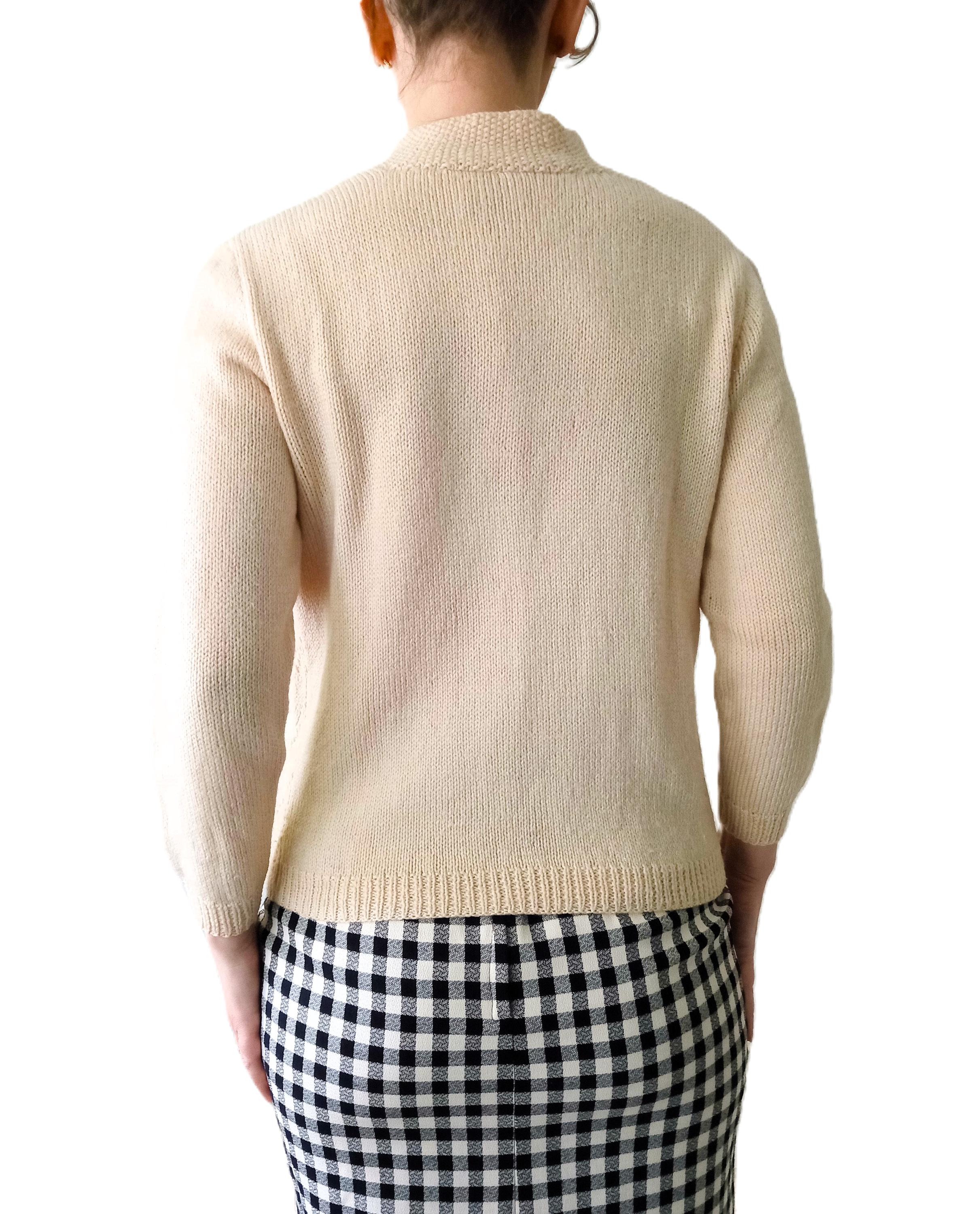 This cardigan is distinguished by refined knit work, typical of handmade knitwear from the 50s–60s.