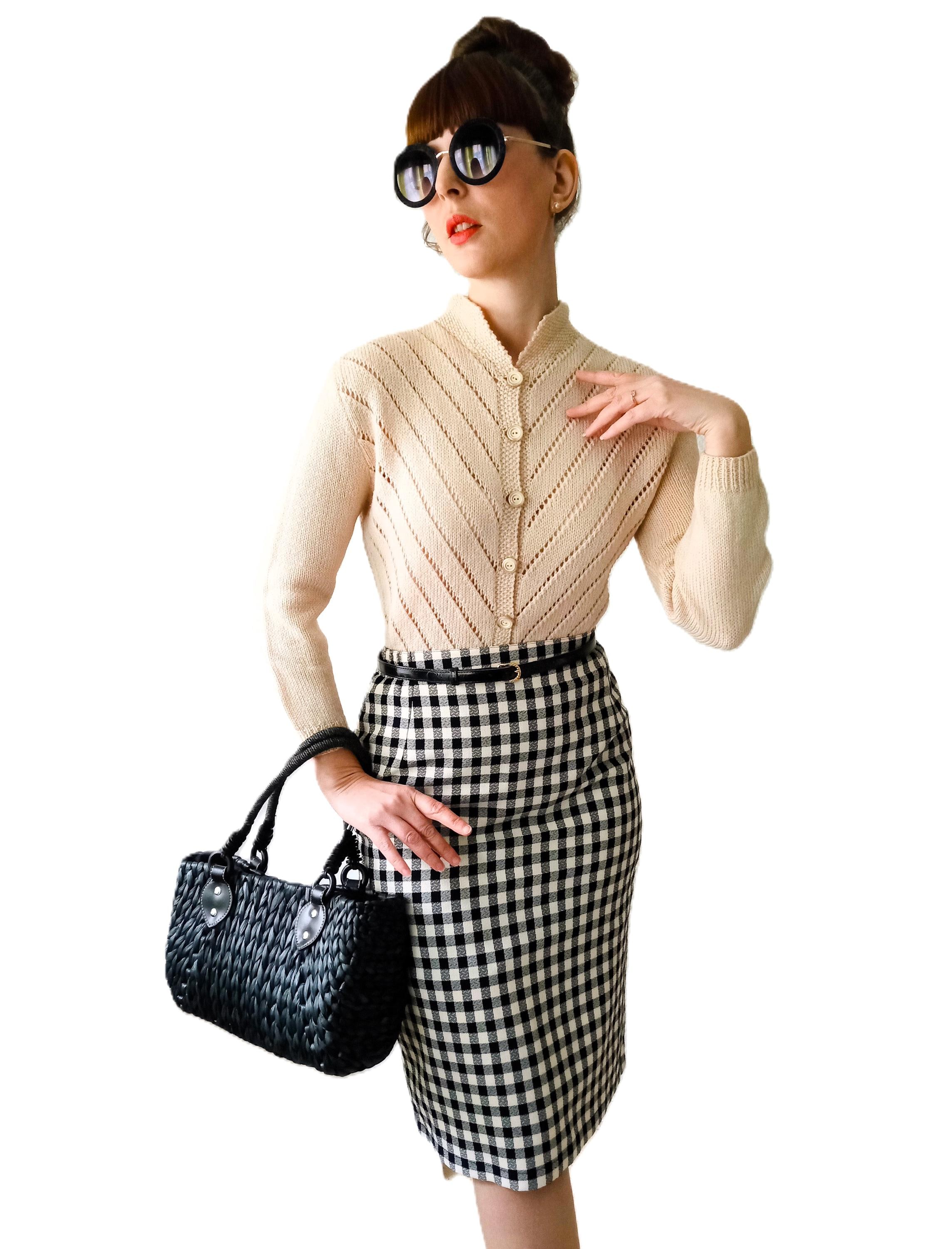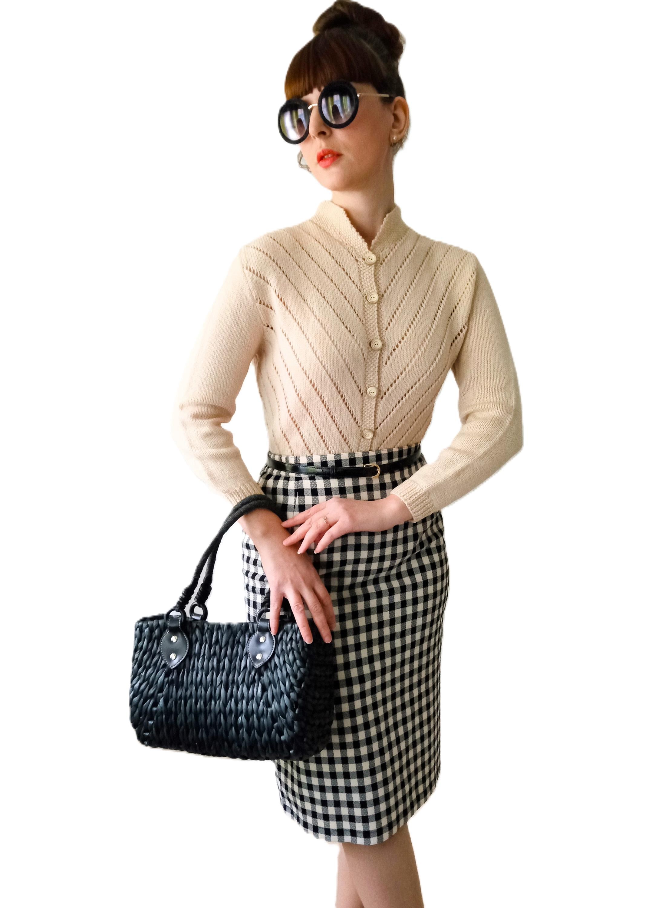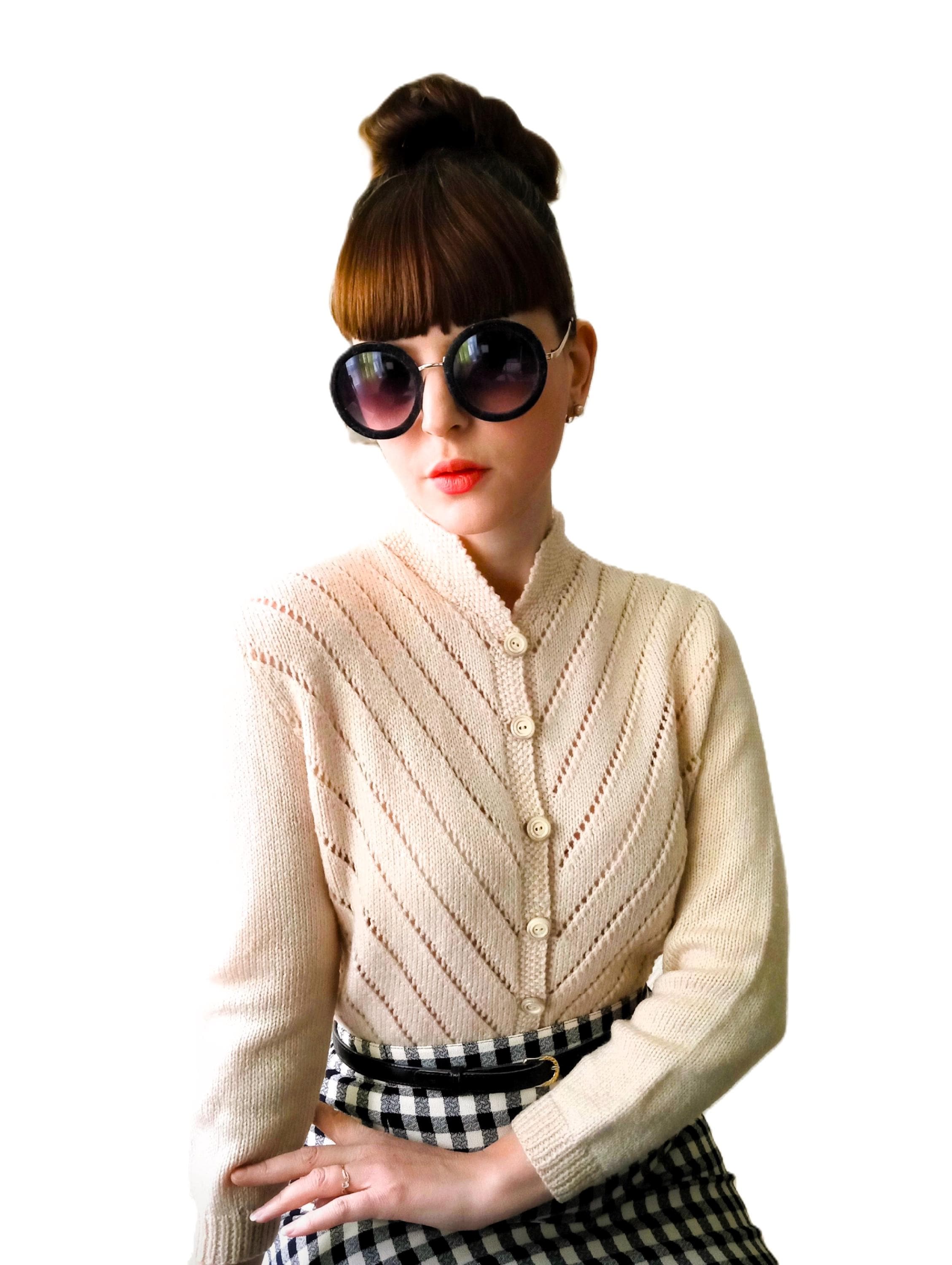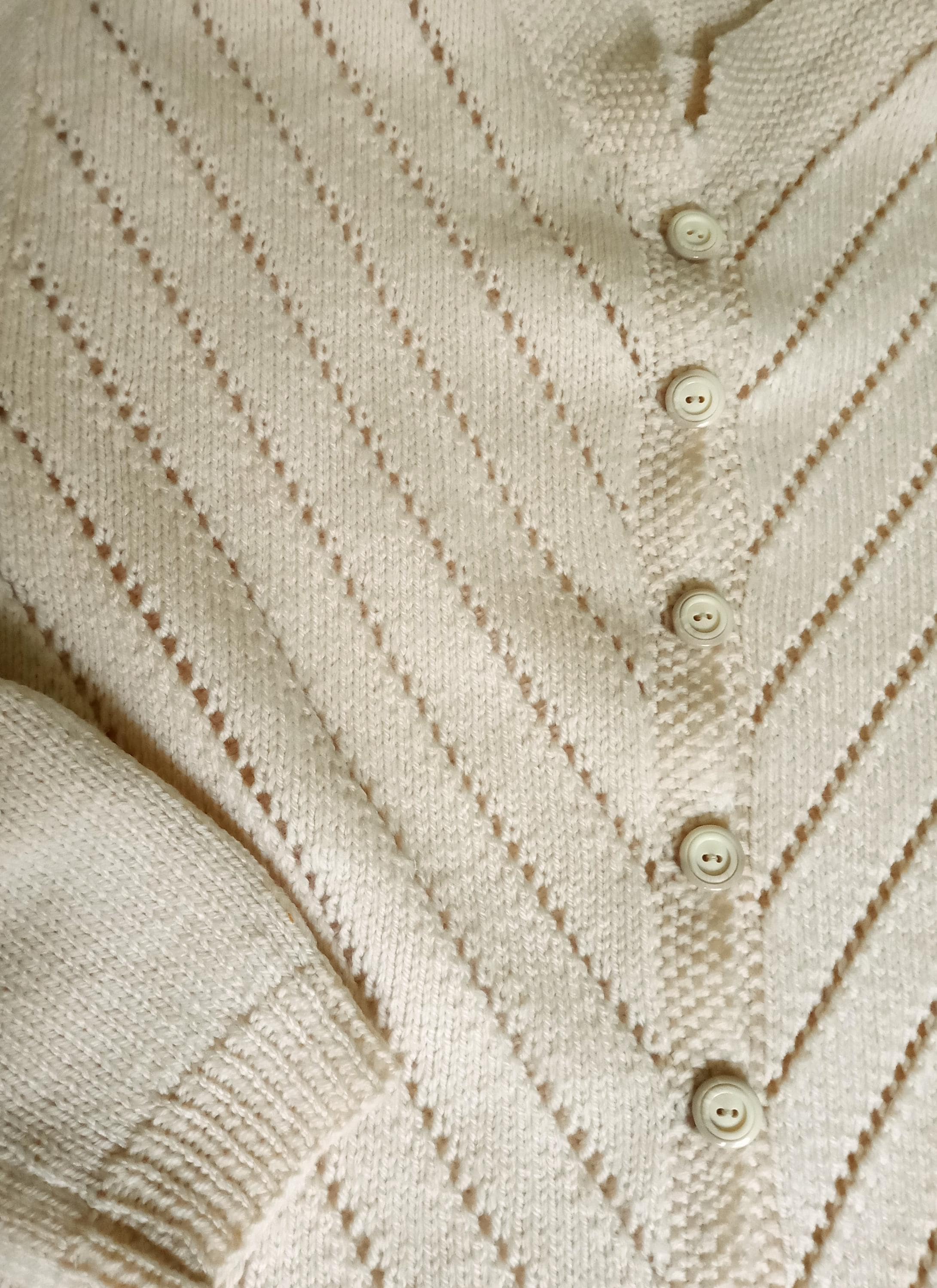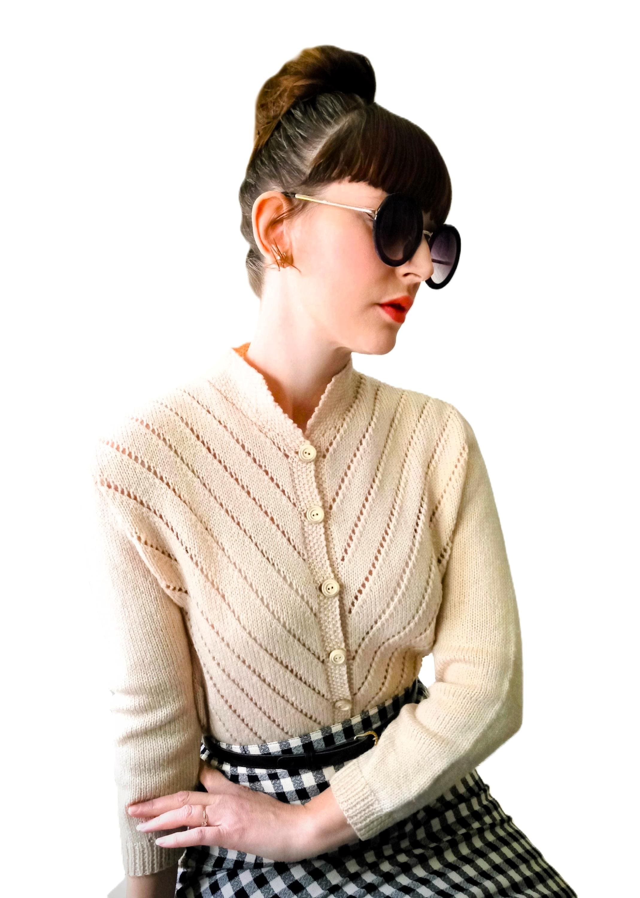 This cardigan is distinguished by refined knit work, typical of handmade knitwear from the 50s–60s.