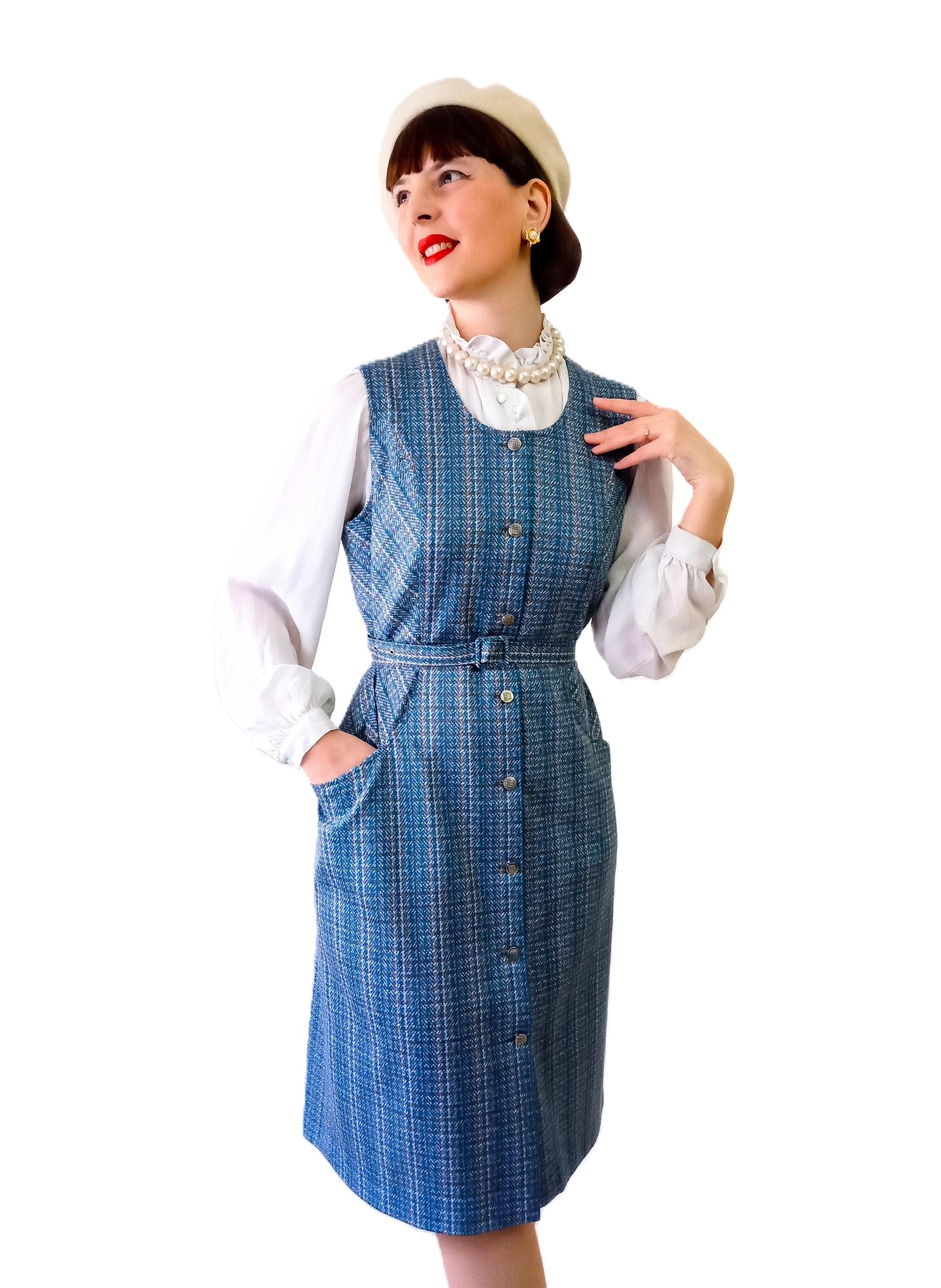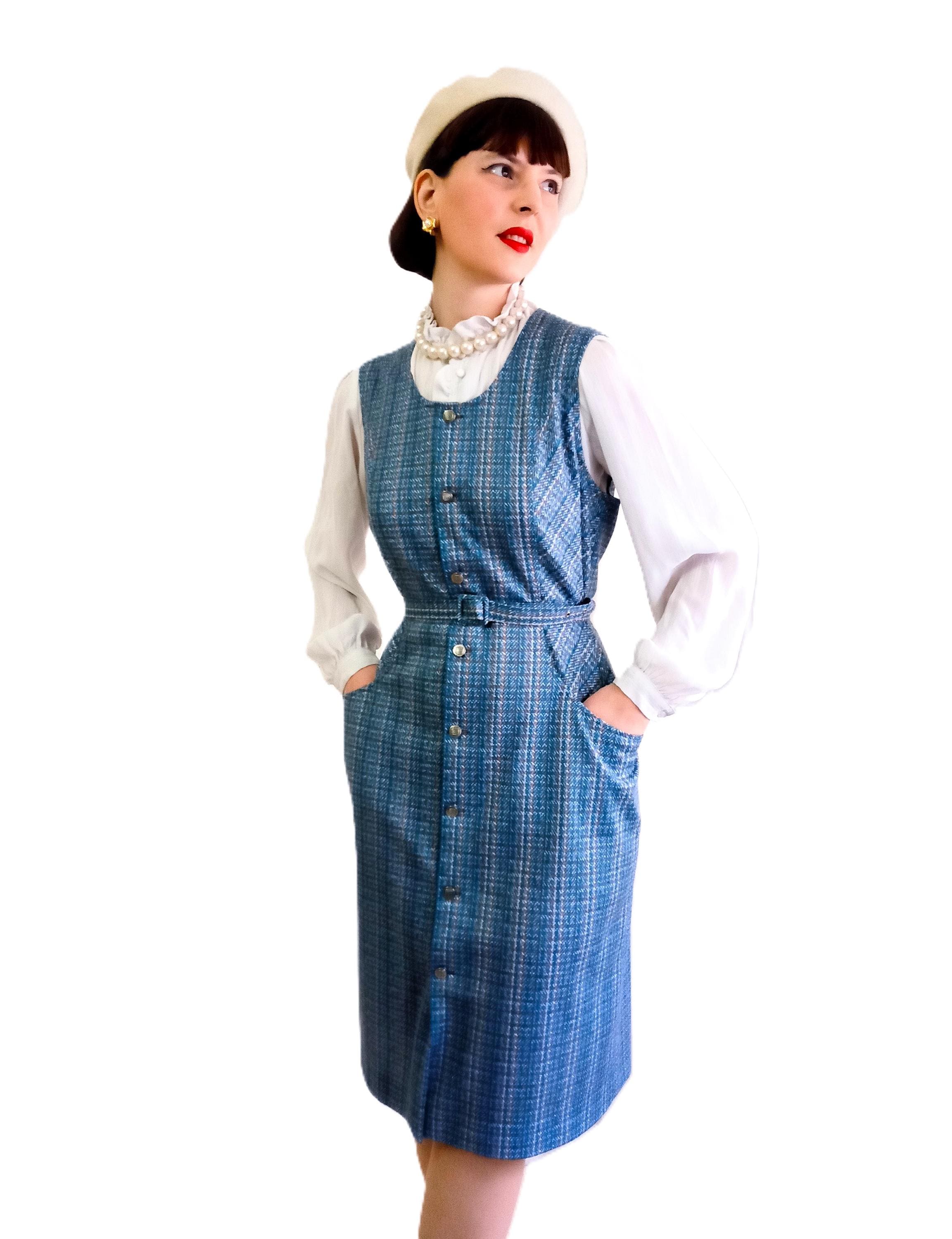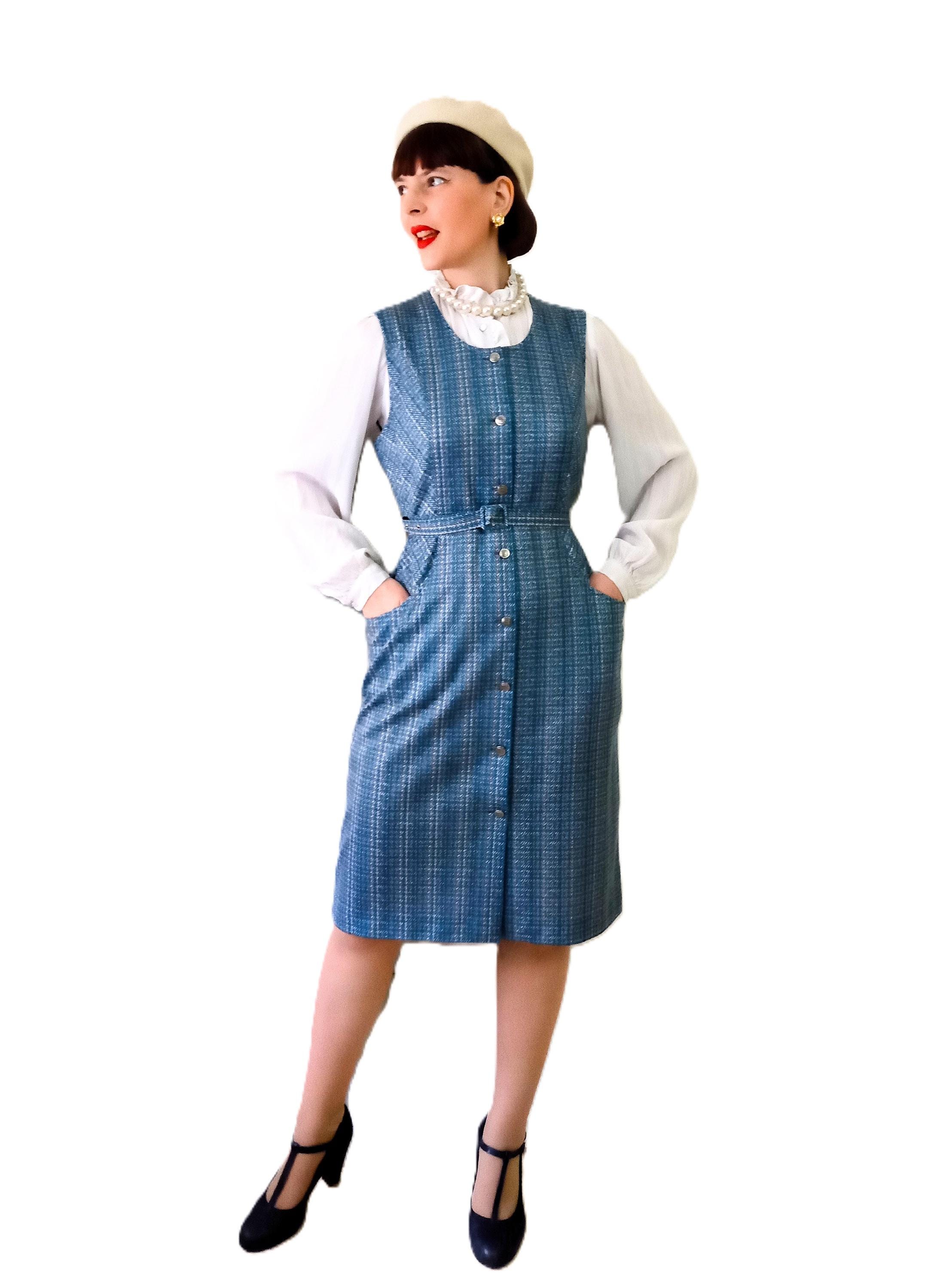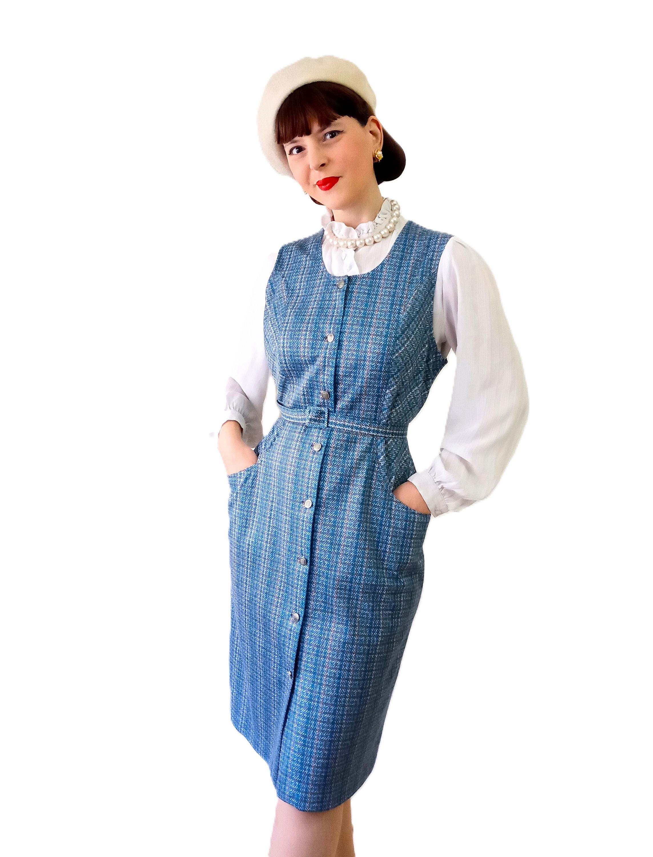 🇬🇧 Bring a retro and elegant touch to your wardrobe with this blue checked sleeveless vintage dress. Inspired by the 50s and revisited in the 80s style, it is perfect for lovers of retro fashion, pin-up and rockabilly.