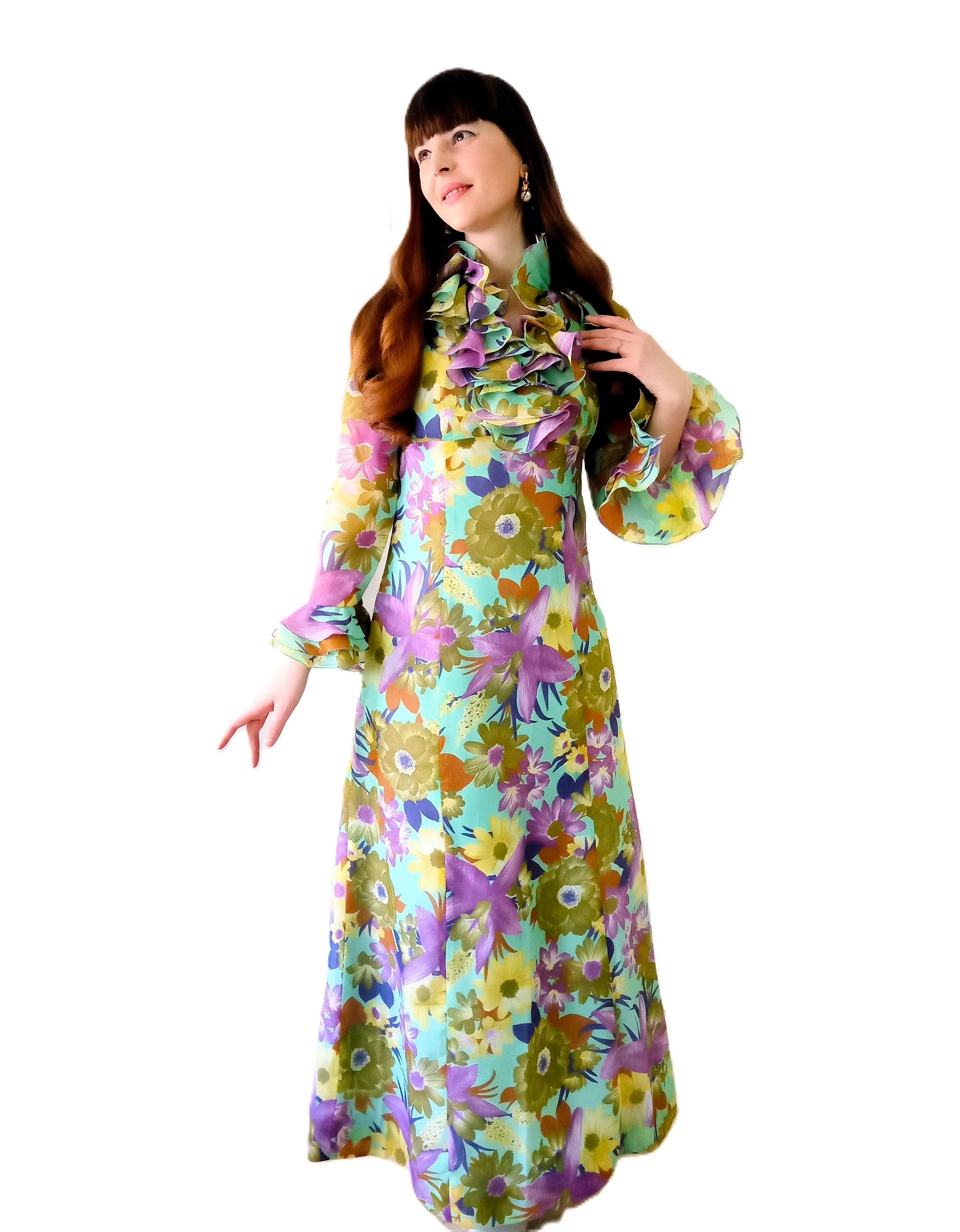 Typical of the era, it stands out with its ruffled frill neckline, long slightly flared sleeves, and a stunning multicolor floral print with soft psychedelic accents.