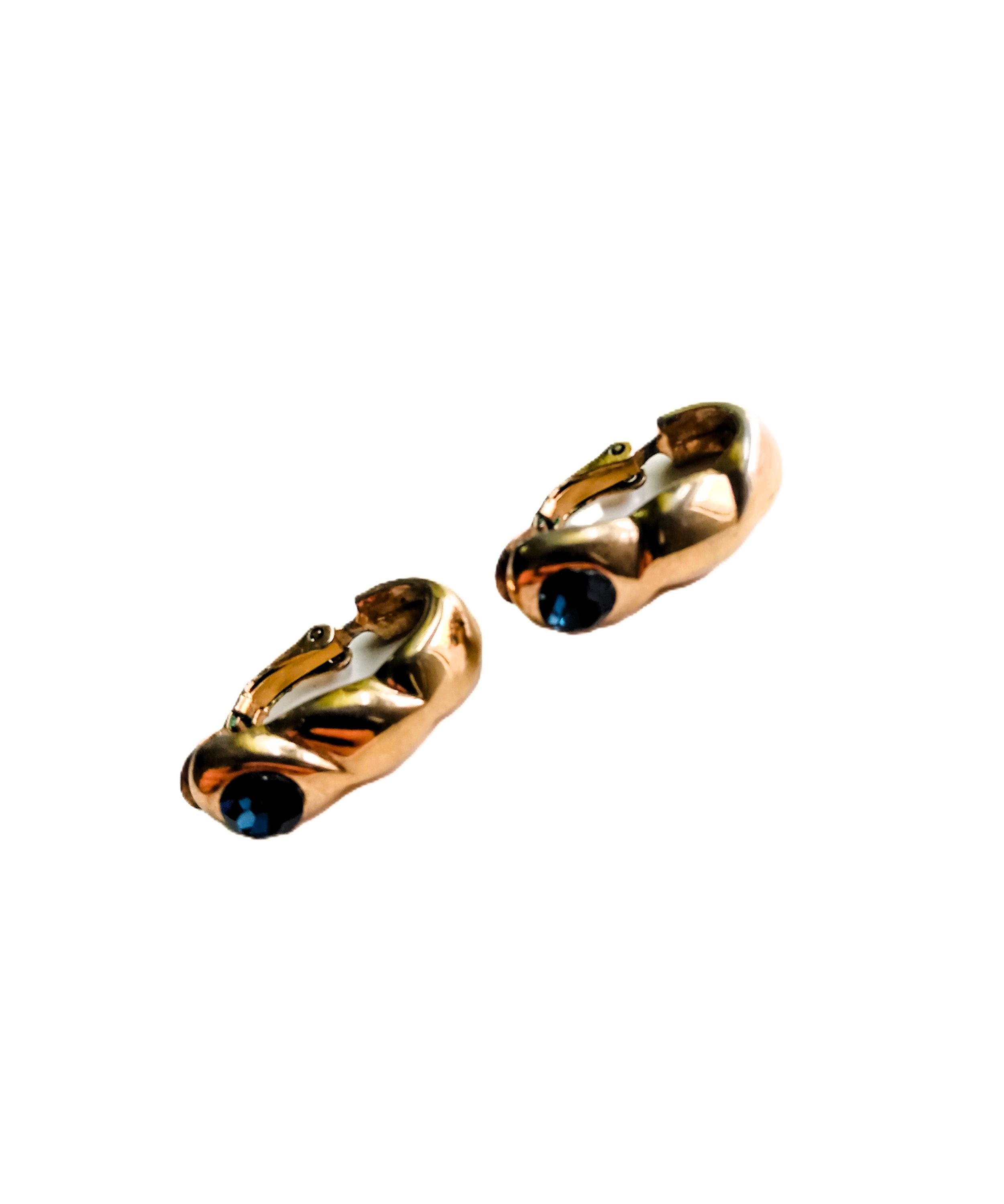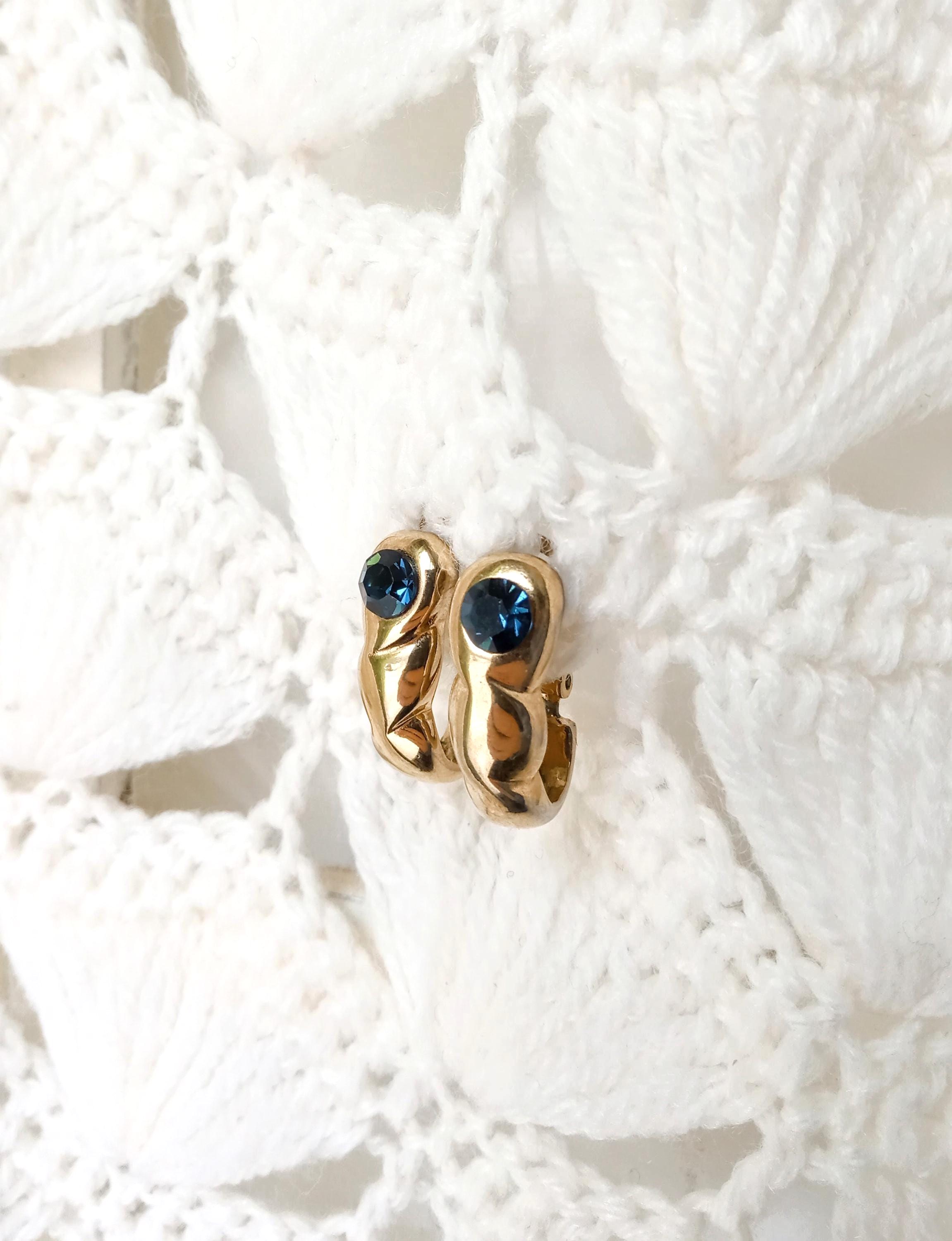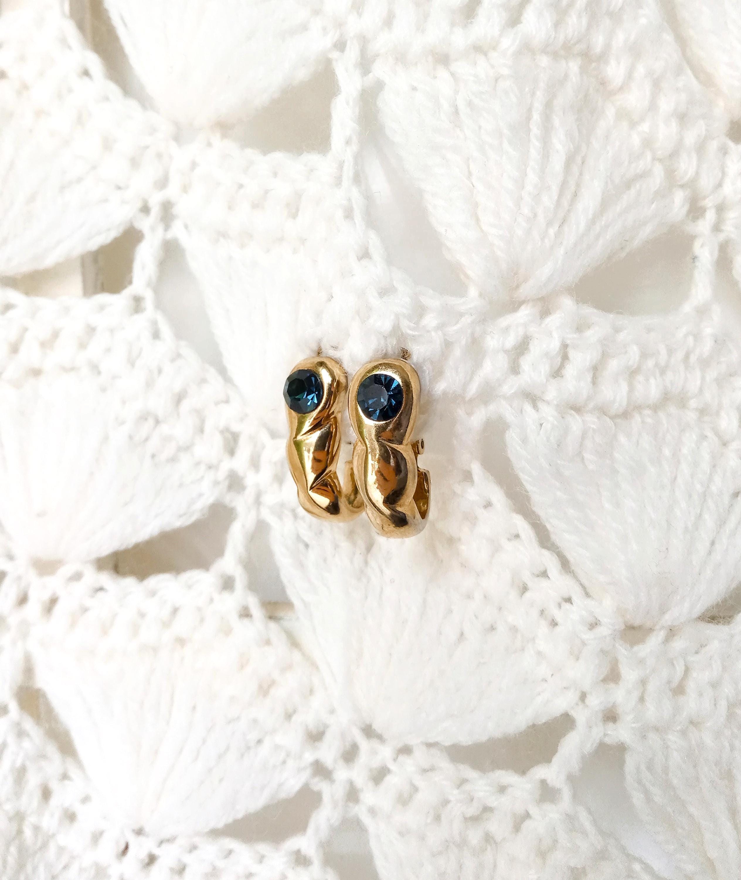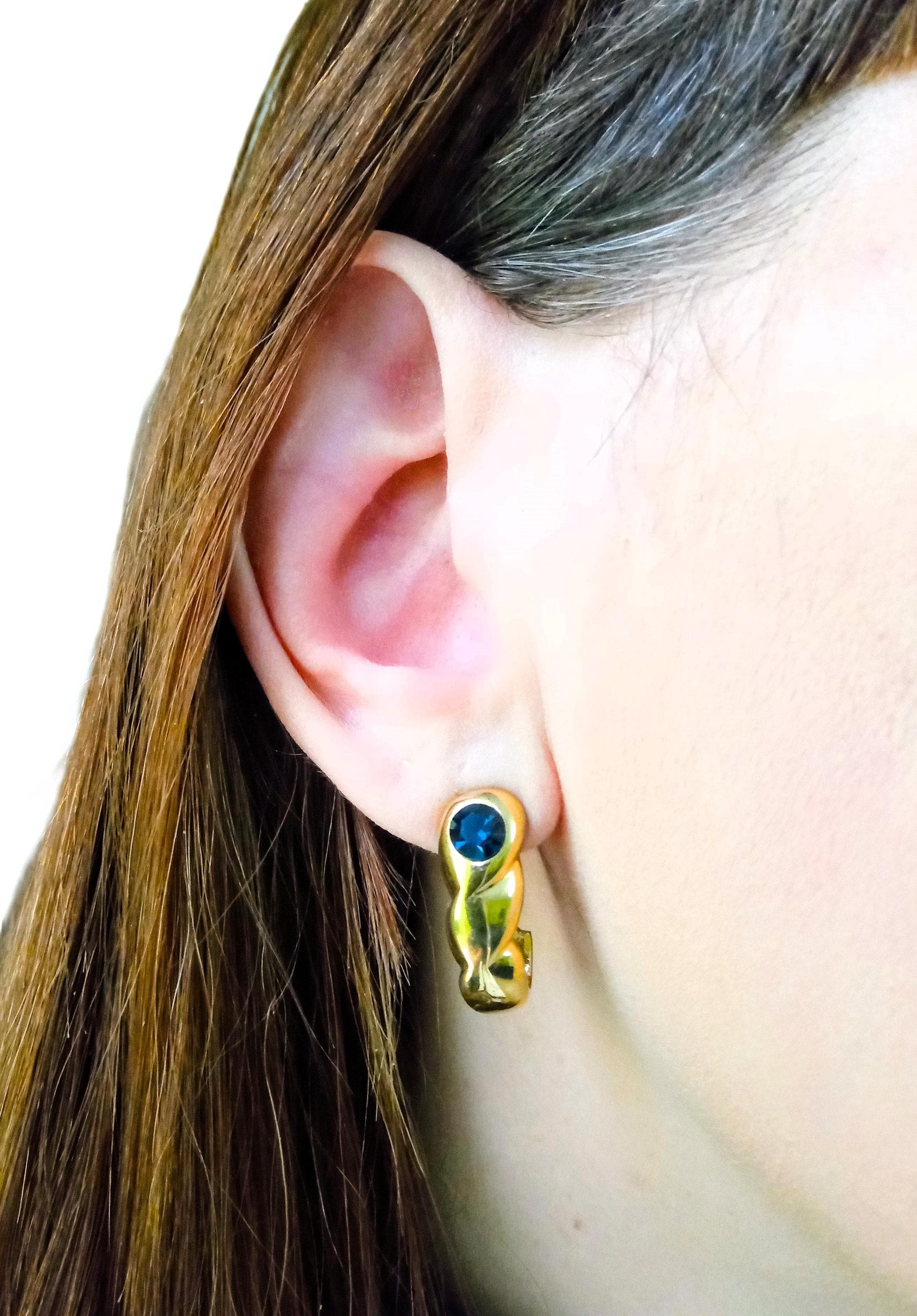 Ces magnifiques boucles d'oreilles clips des années 80 affichent un design torsadé doré très "couture", agrémenté d'une pierre centrale d'un bleu profond (style saphir) qui capture magnifiquement la lumière.