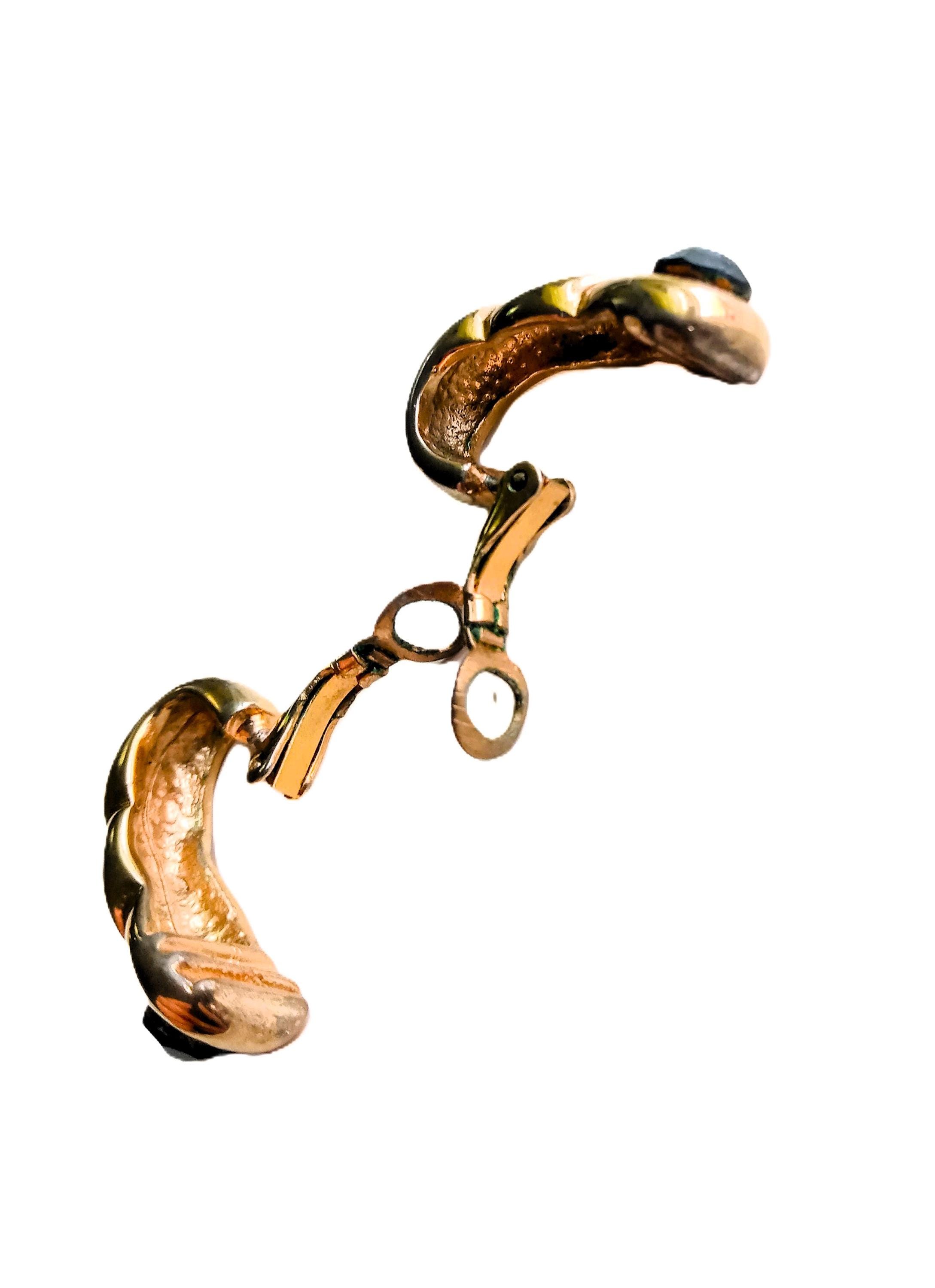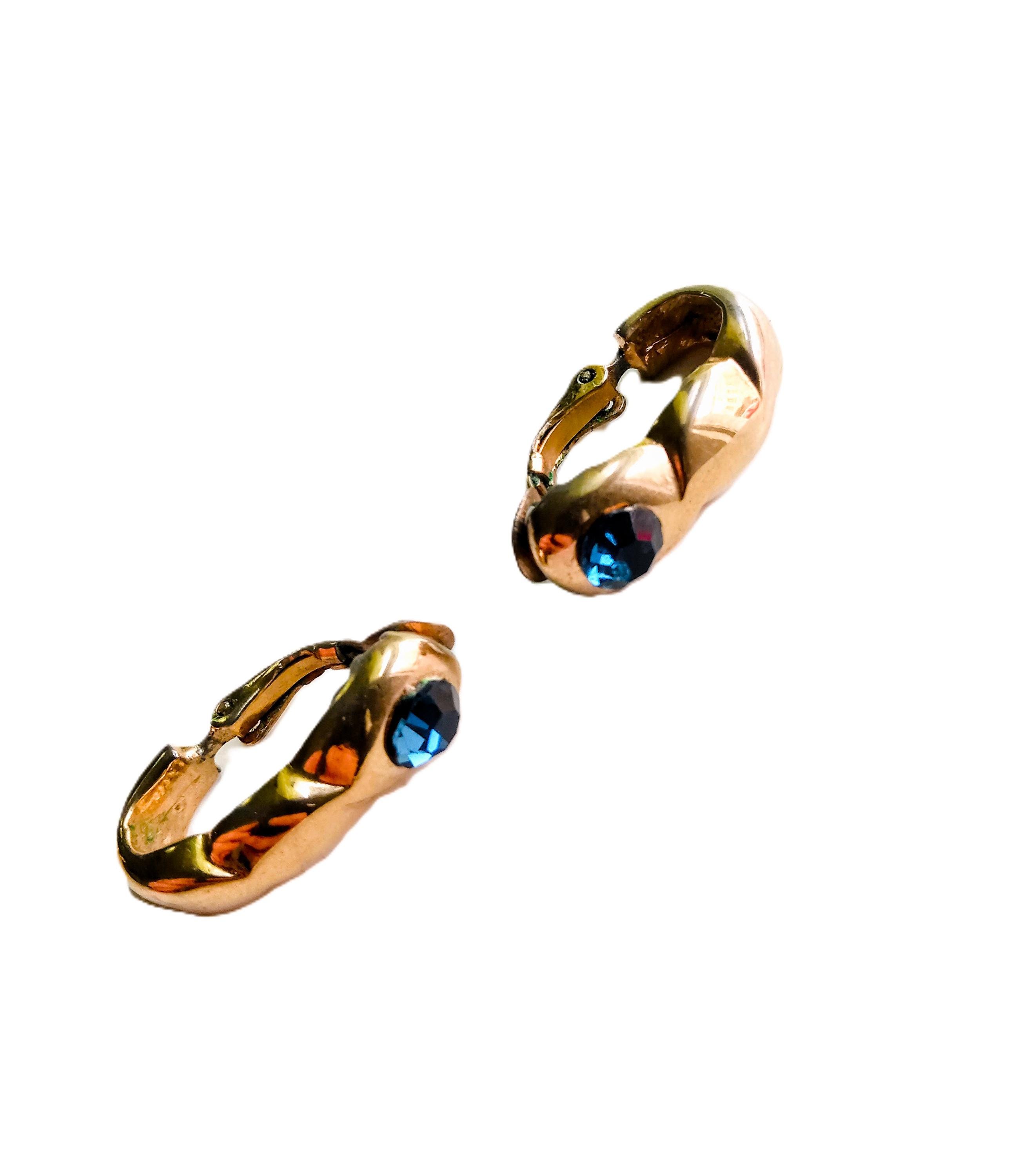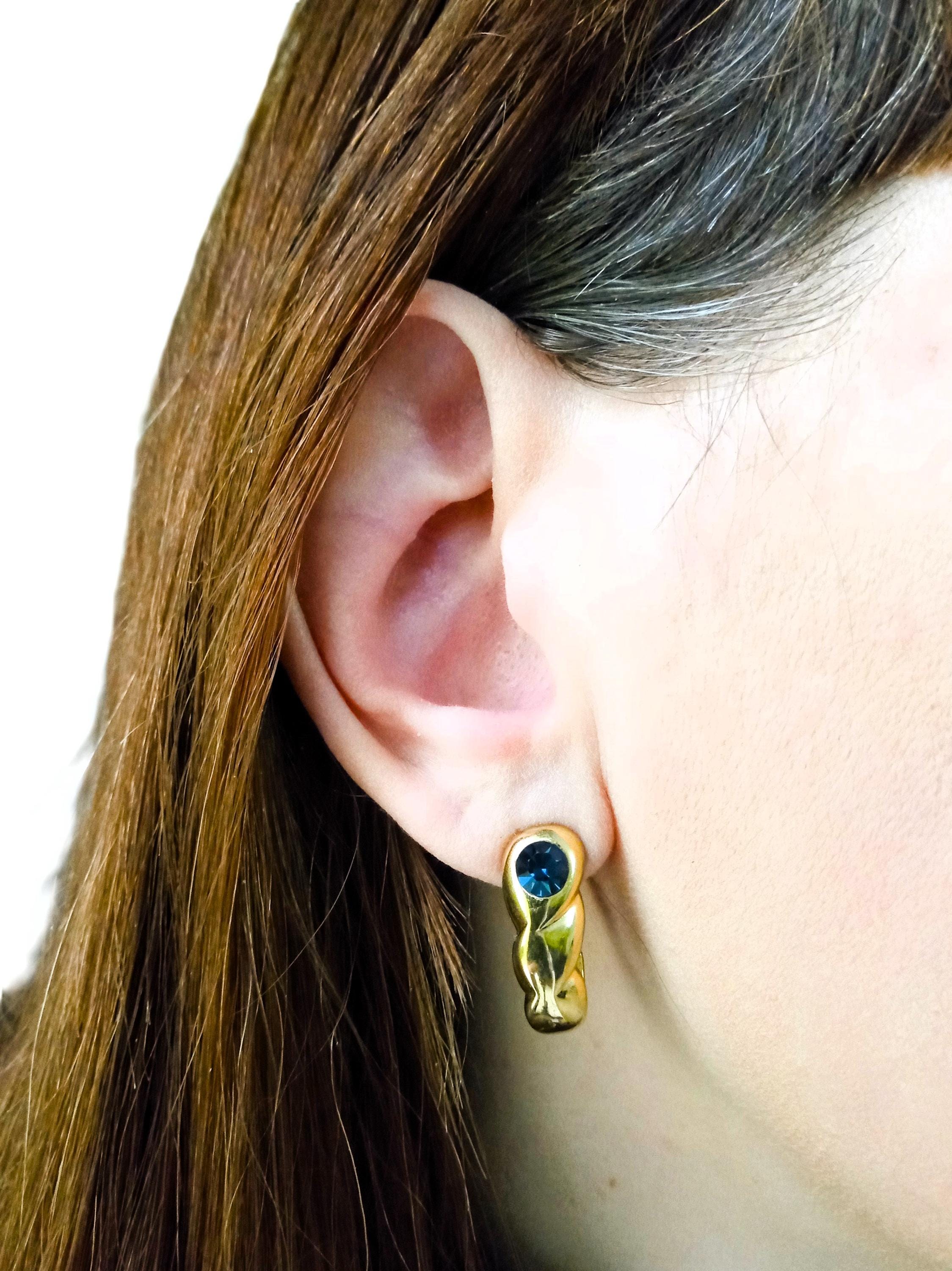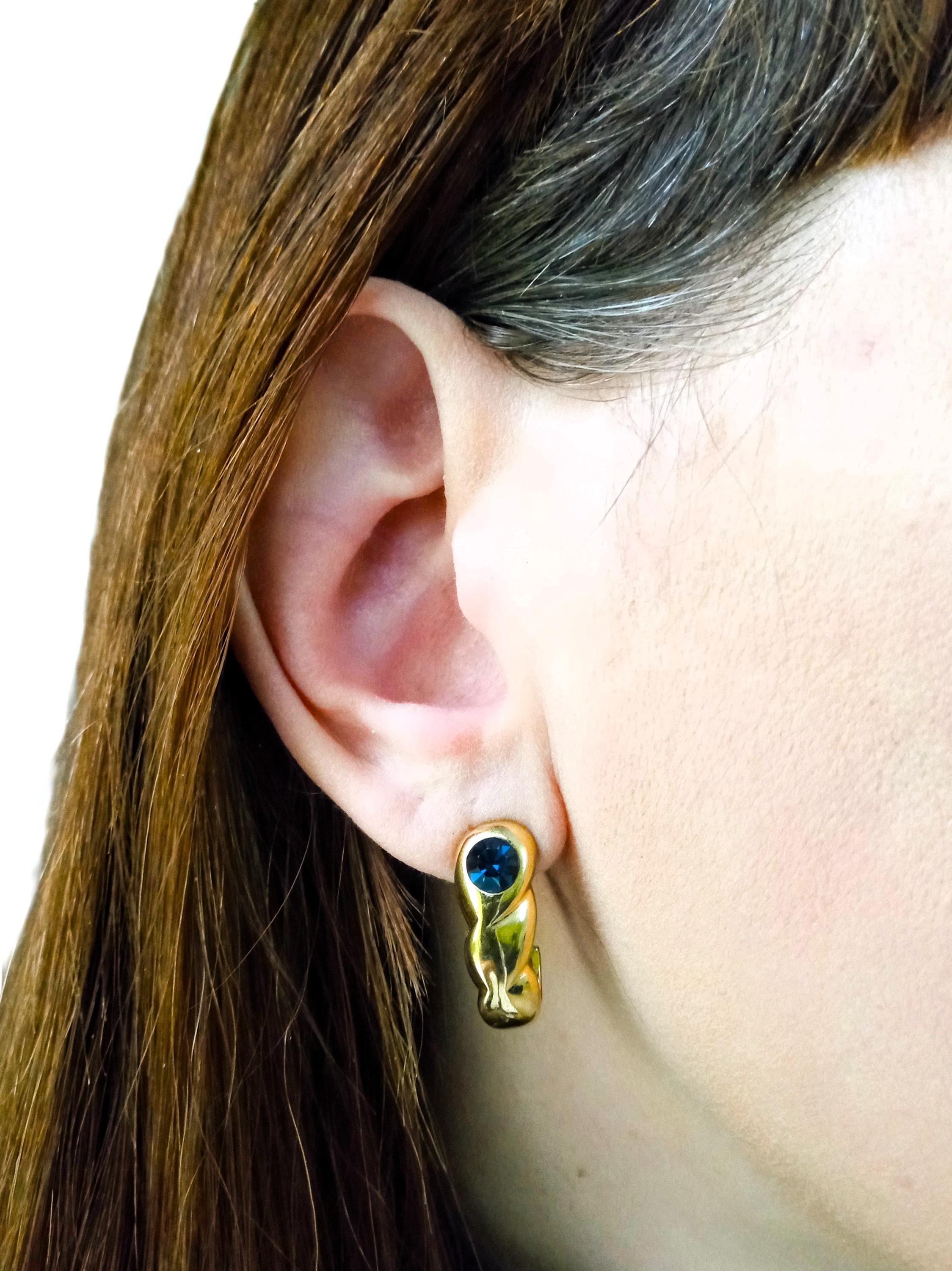 Ces magnifiques boucles d'oreilles clips des années 80 affichent un design torsadé doré très "couture", agrémenté d'une pierre centrale d'un bleu profond (style saphir) qui capture magnifiquement la lumière.