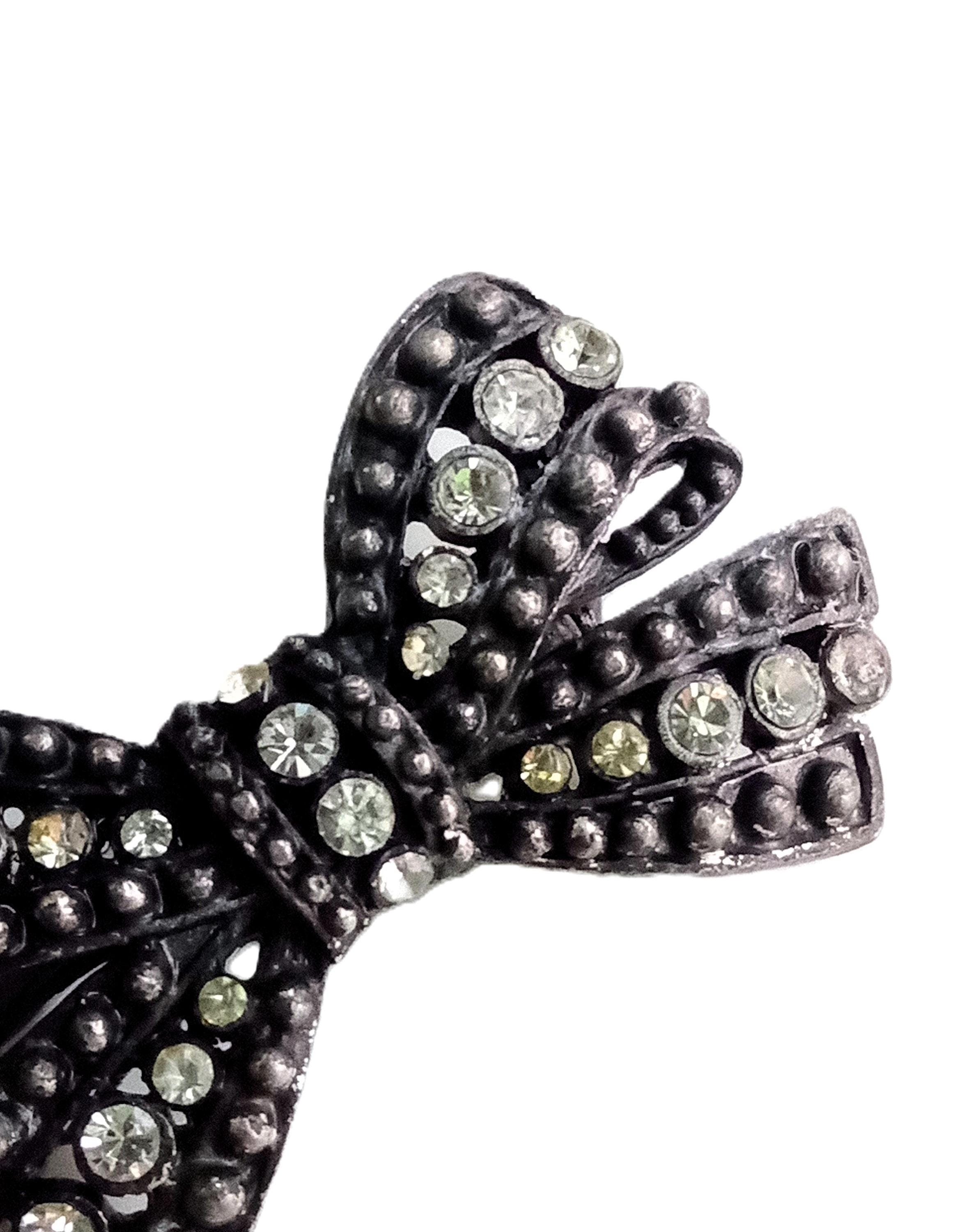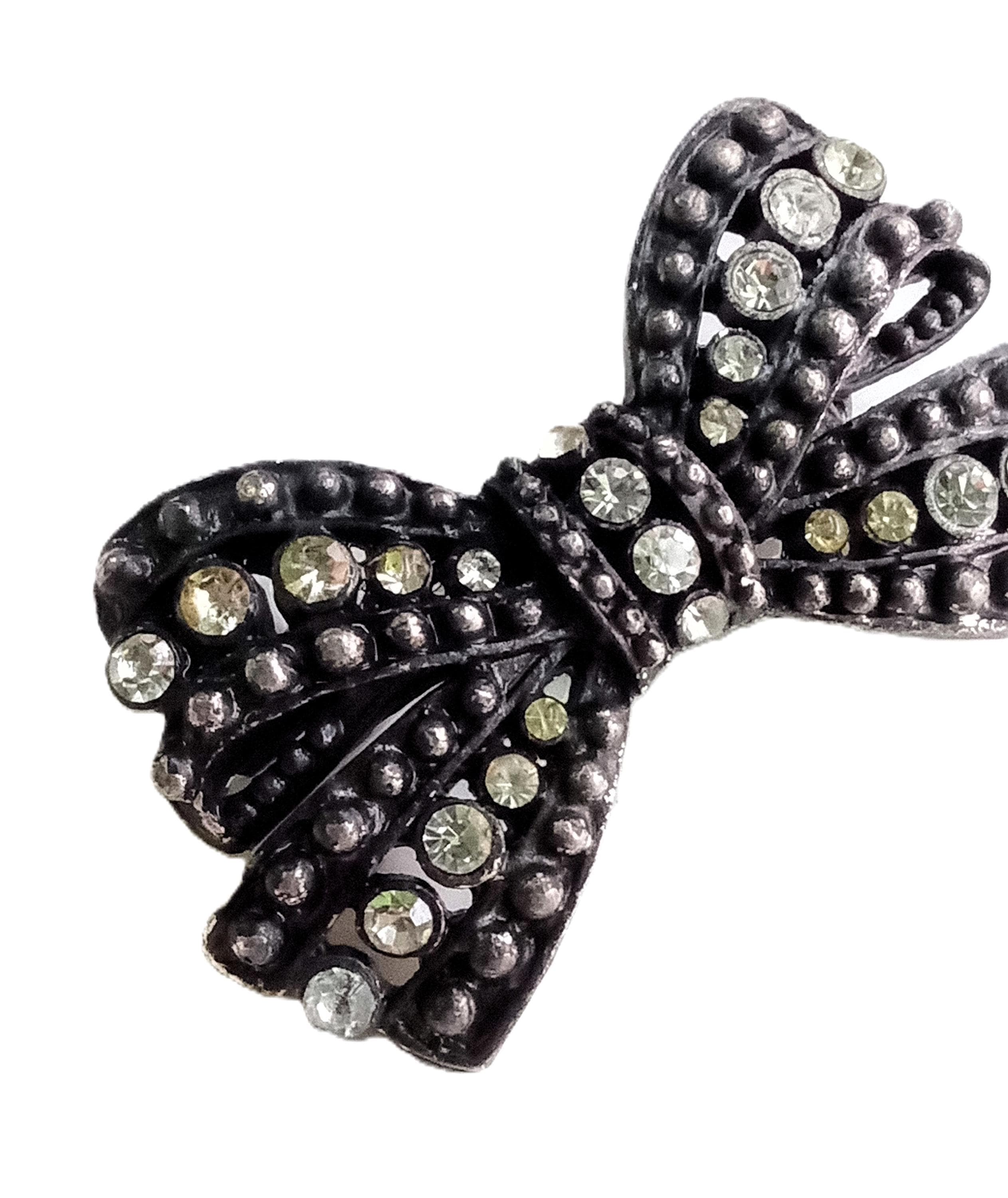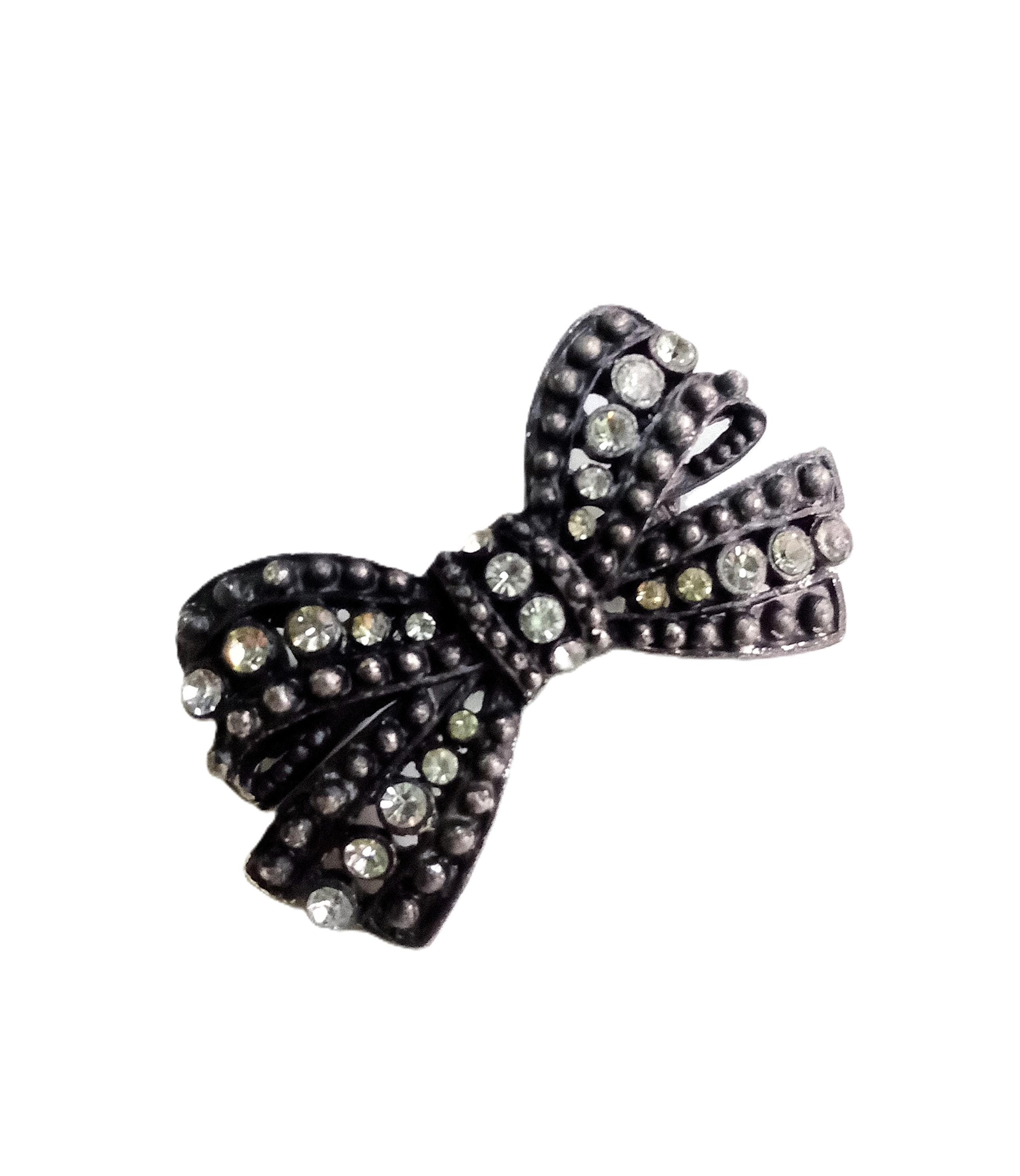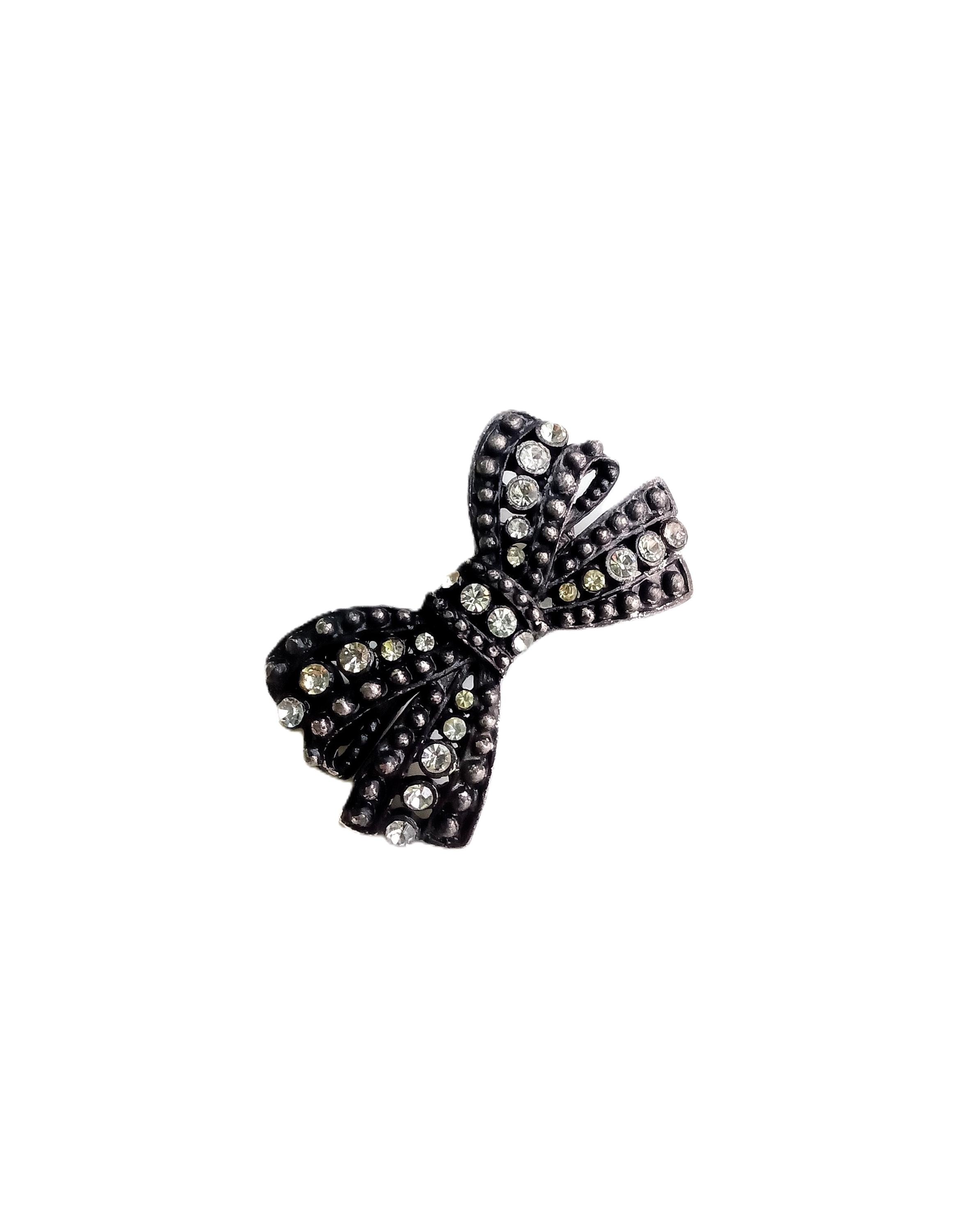 Bring a touch of retro femininity to your wardrobe with this delightful bow brooch. This classic piece from the 40s and 50s is often associated with the "Sentimental" or "War-time" style, as the bow symbolized bonds and remembrance. It captures the essence of vintage elegance with its beaded metalwork and shimmering crystals.